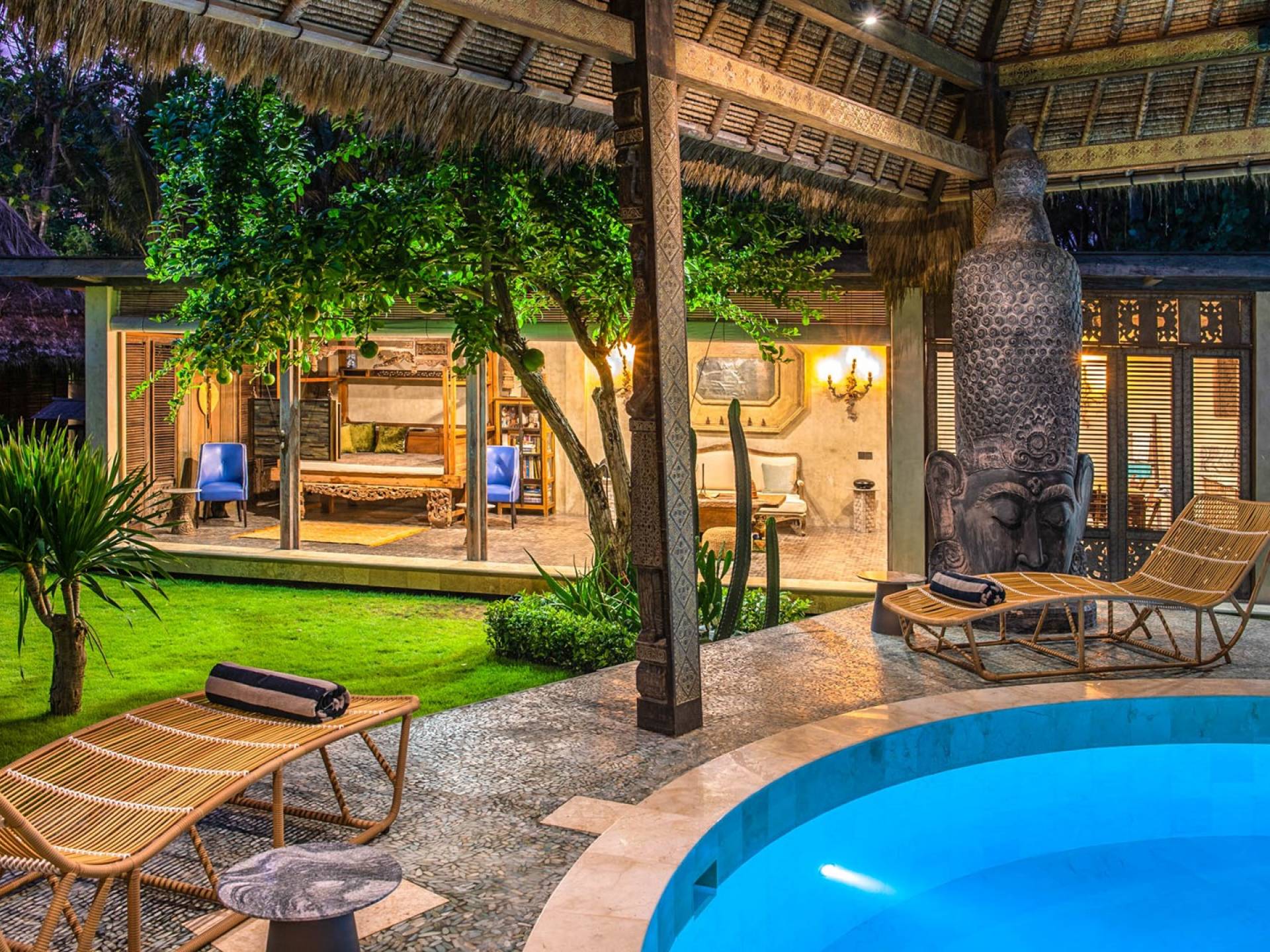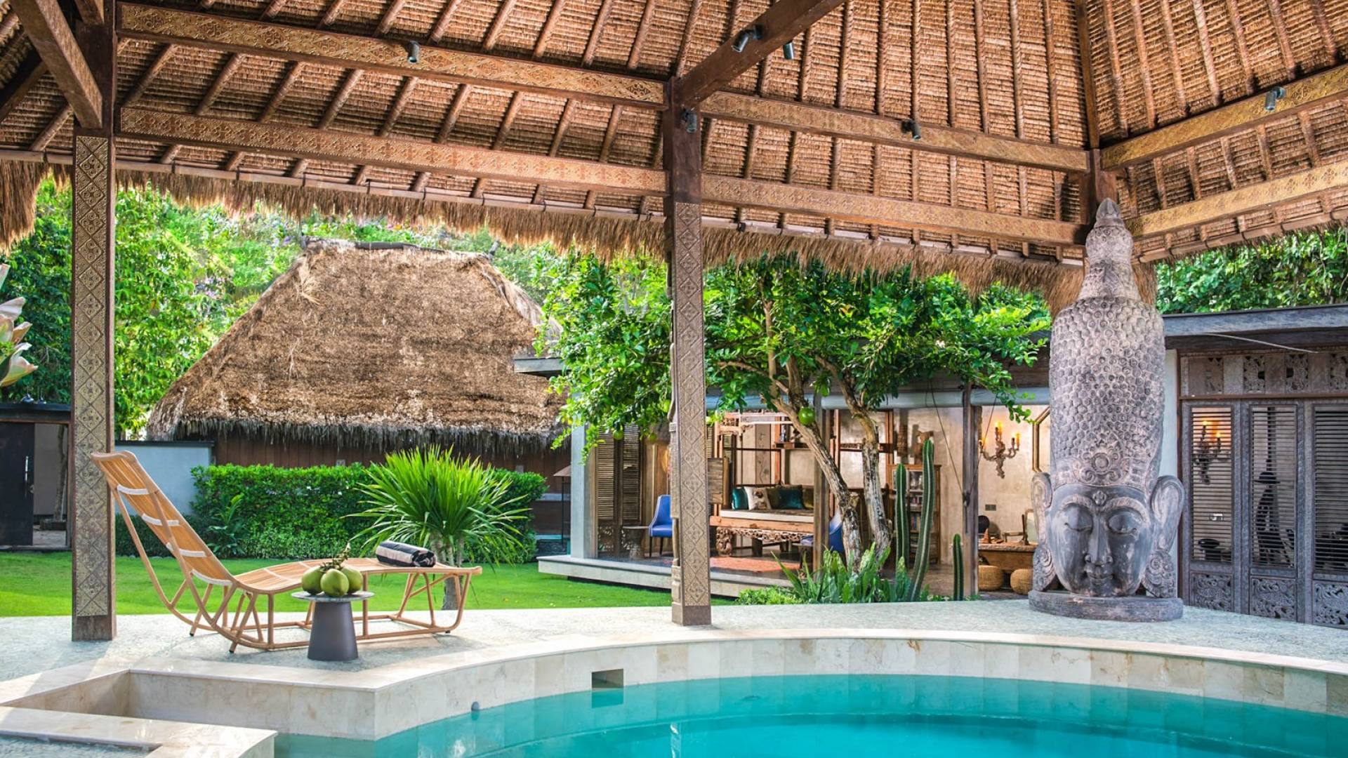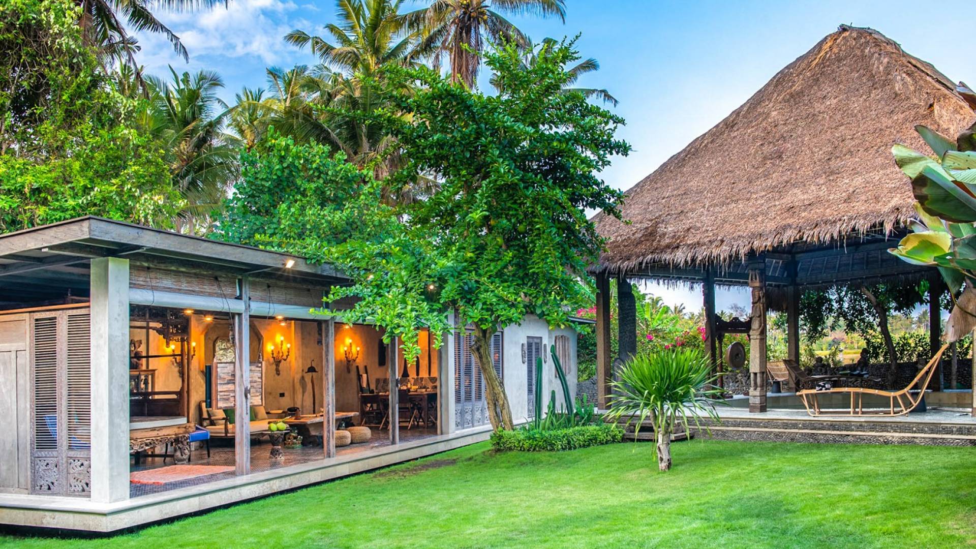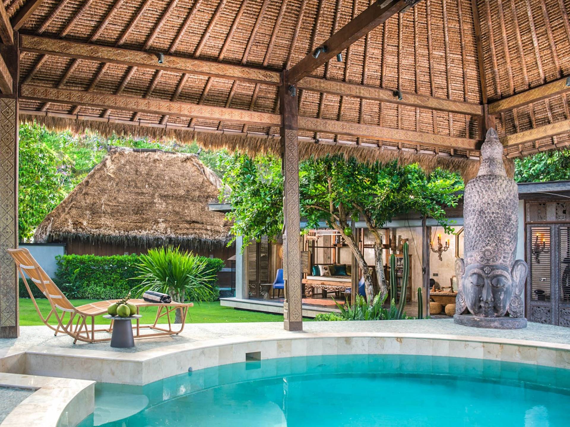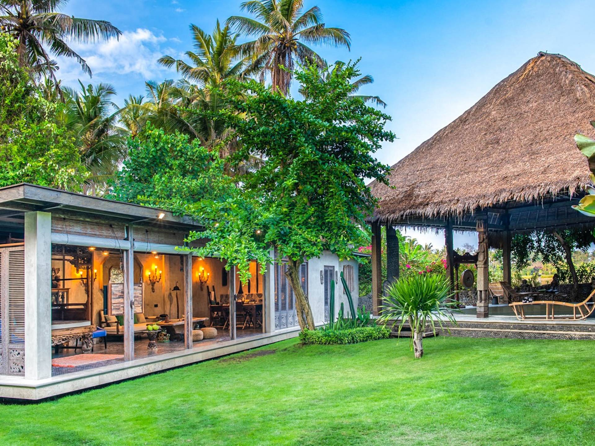 La villa cuenta con artefactos únicos de todo el planeta: meticulosos tallados en madera de Timor y Bali, lámparas de cobre y bronce de Marruecos y muebles antiguos de Java y China. Su jardín privado está lleno de árboles frutales, lo que brinda una sensación verdaderamente tropical. La piscina está techada para mayor privacidad durante los tratamientos de spa tradicionales y las prácticas curativas. La propiedad está rodeada de interminables campos de arroz, verde esmeralda por la mañana, naranja o violeta al atardecer