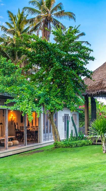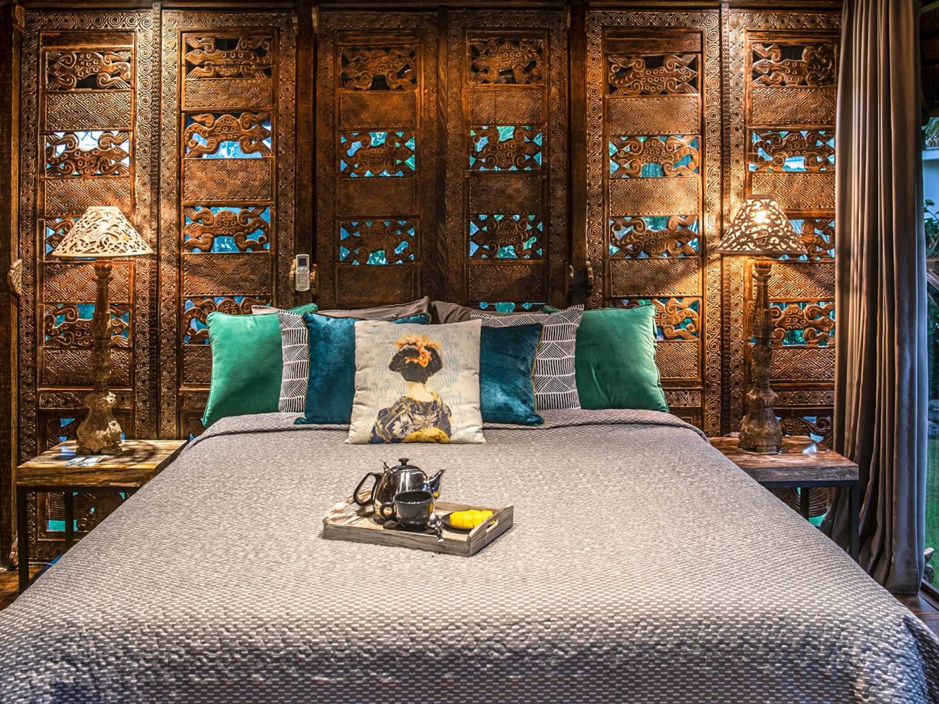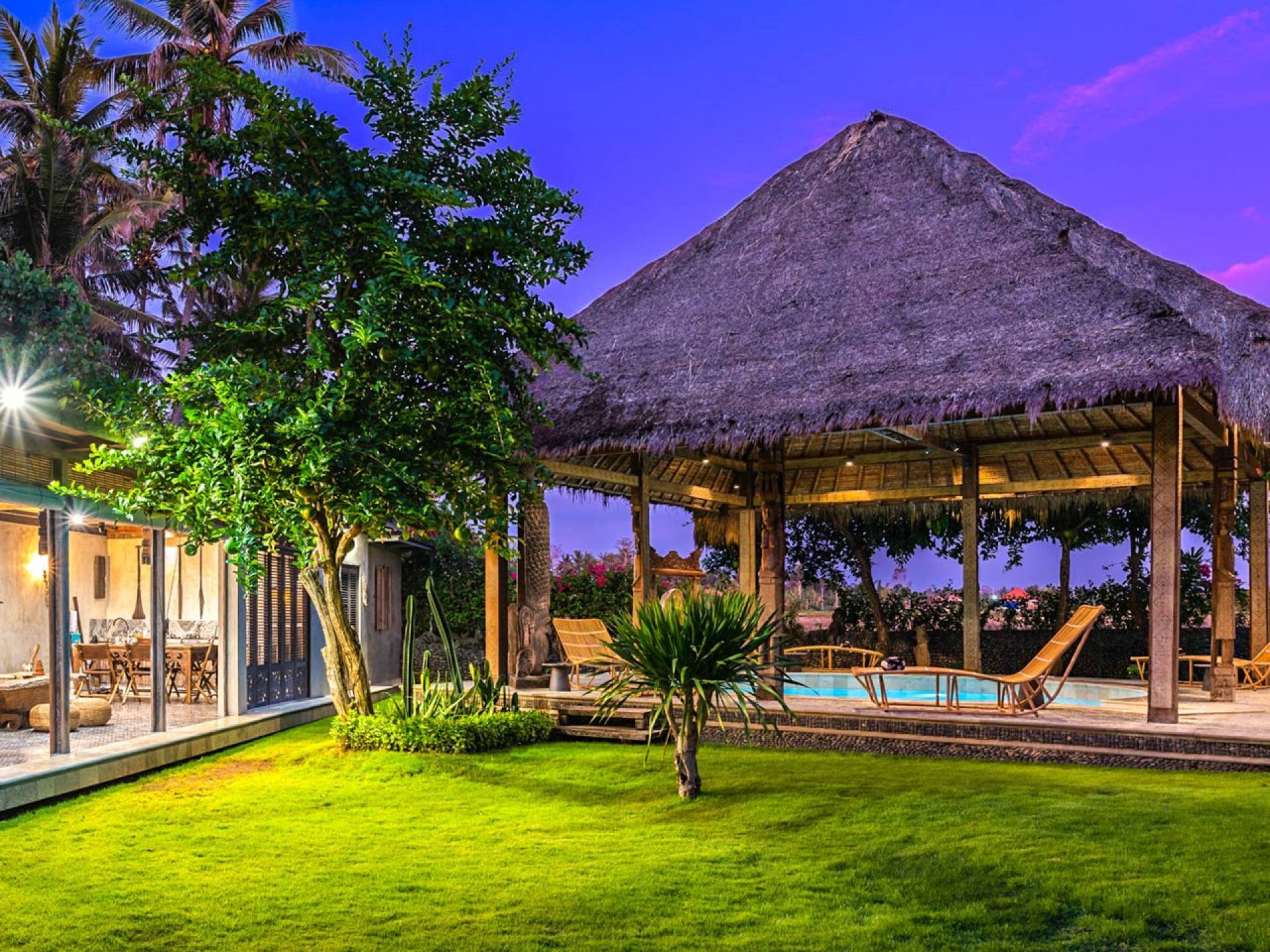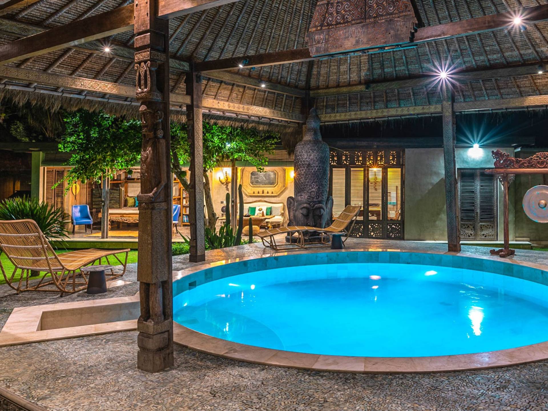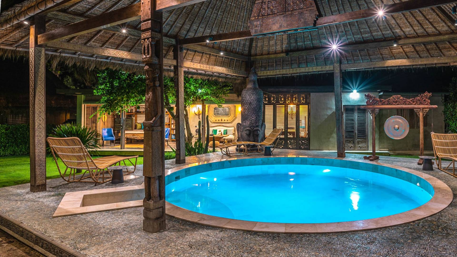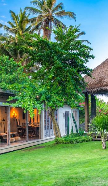 La villa cuenta con artefactos únicos de todo el planeta: meticulosos tallados en madera de Timor y Bali, lámparas de cobre y bronce de Marruecos y muebles antiguos de Java y China. Su jardín privado está lleno de árboles frutales, lo que brinda una sensación verdaderamente tropical. La piscina está techada para mayor privacidad durante los tratamientos de spa tradicionales y las prácticas curativas. La propiedad está rodeada de interminables campos de arroz, verde esmeralda por la mañana, naranja o violeta al atardecer