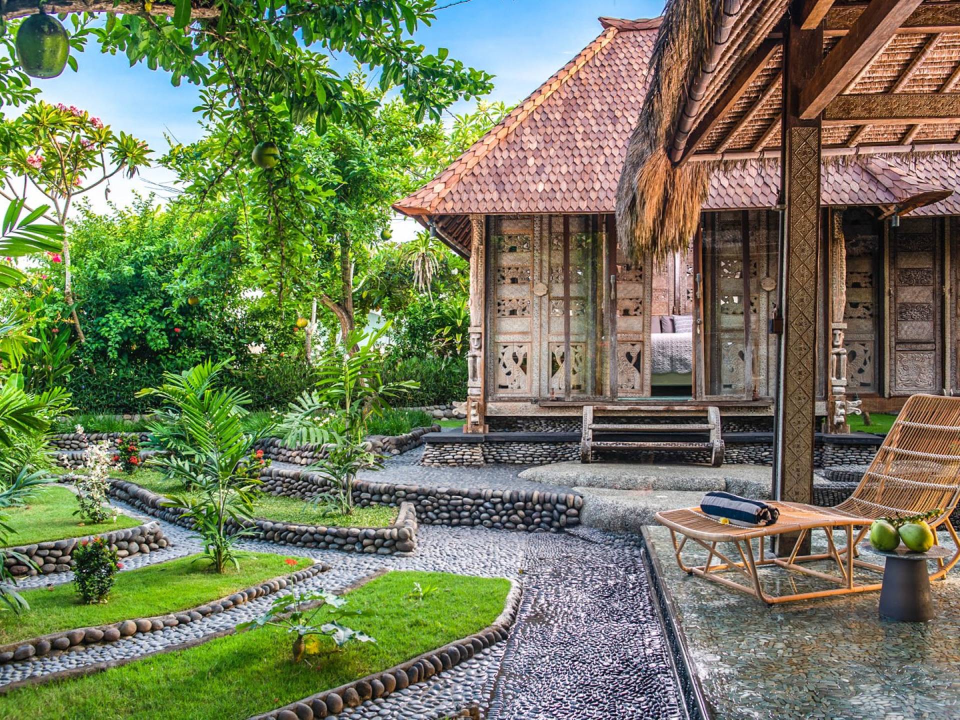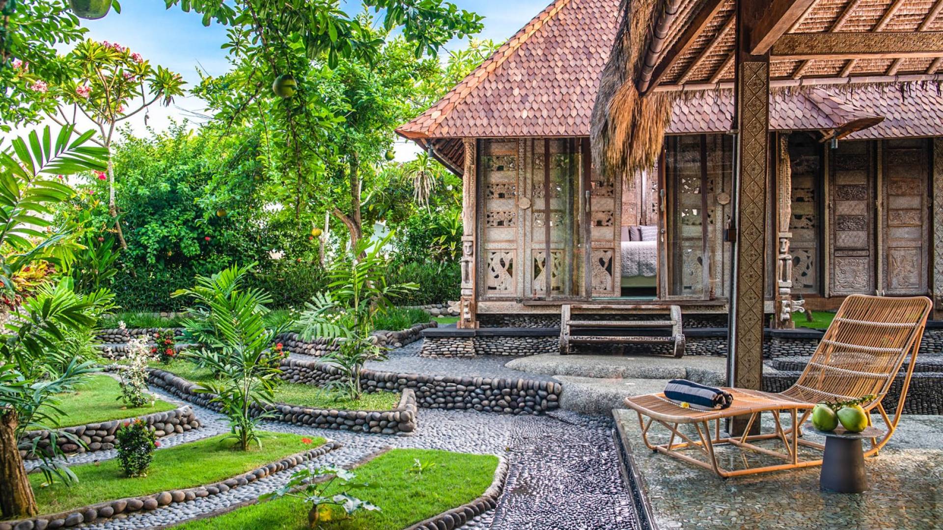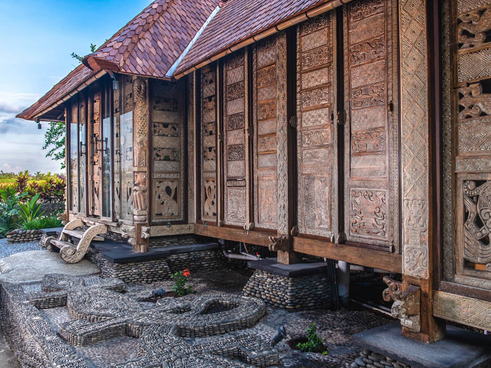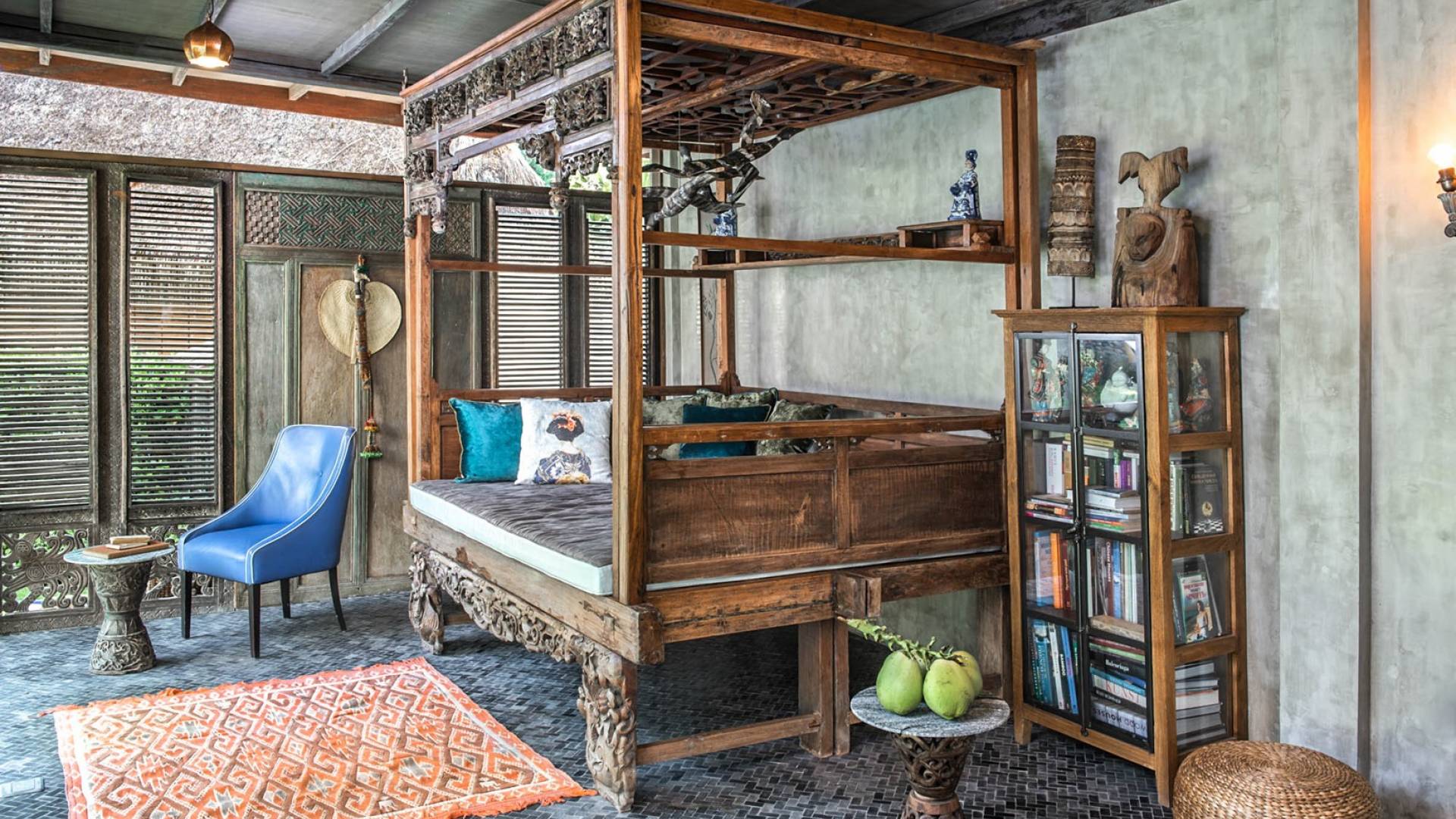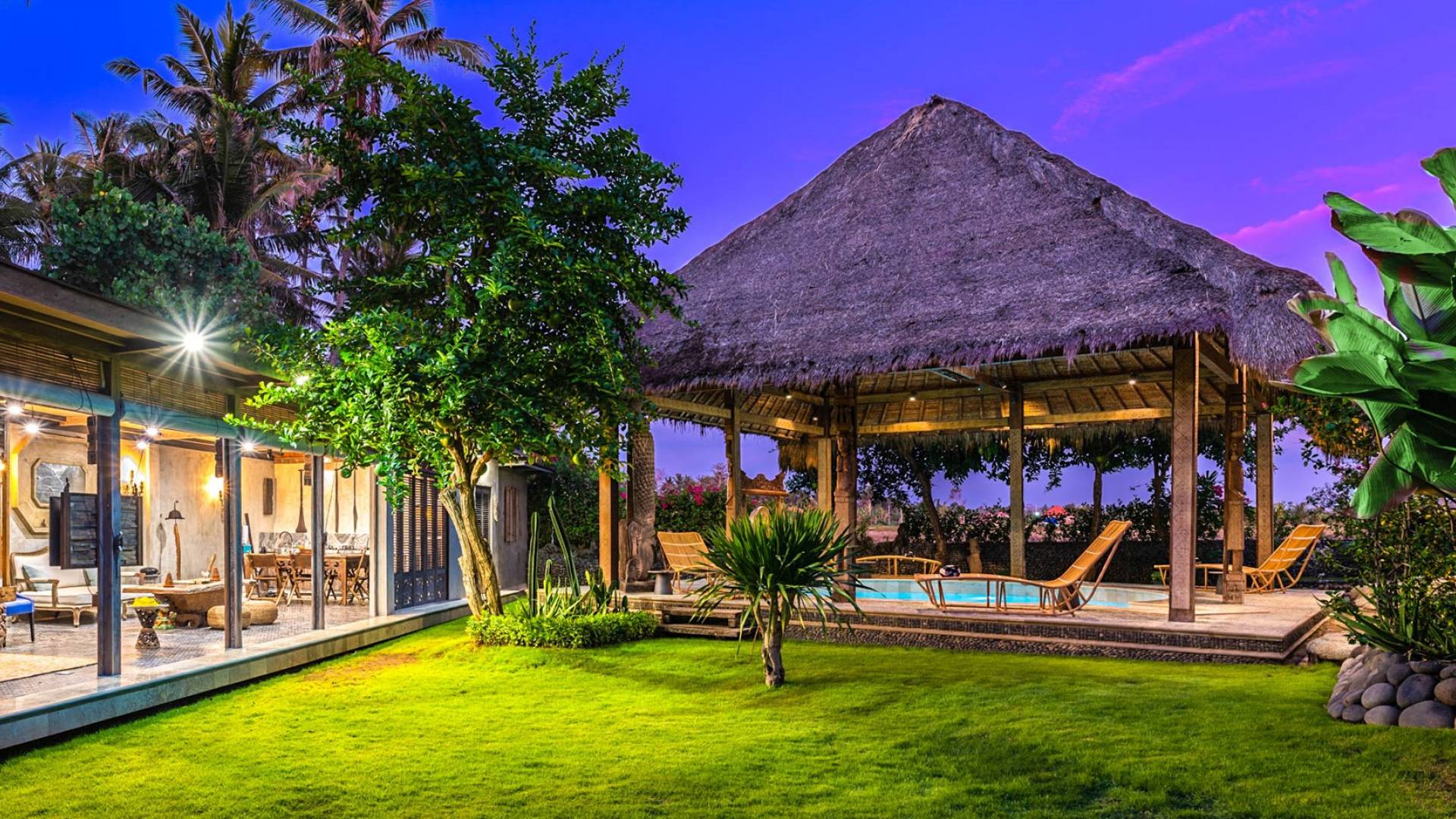 La villa cuenta con artefactos únicos de todo el planeta: meticulosos tallados en madera de Timor y Bali, lámparas de cobre y bronce de Marruecos y muebles antiguos de Java y China. Su jardín privado está lleno de árboles frutales, lo que brinda una sensación verdaderamente tropical. La piscina está techada para mayor privacidad durante los tratamientos de spa tradicionales y las prácticas curativas. La propiedad está rodeada de interminables campos de arroz, verde esmeralda por la mañana, naranja o violeta al atardecer