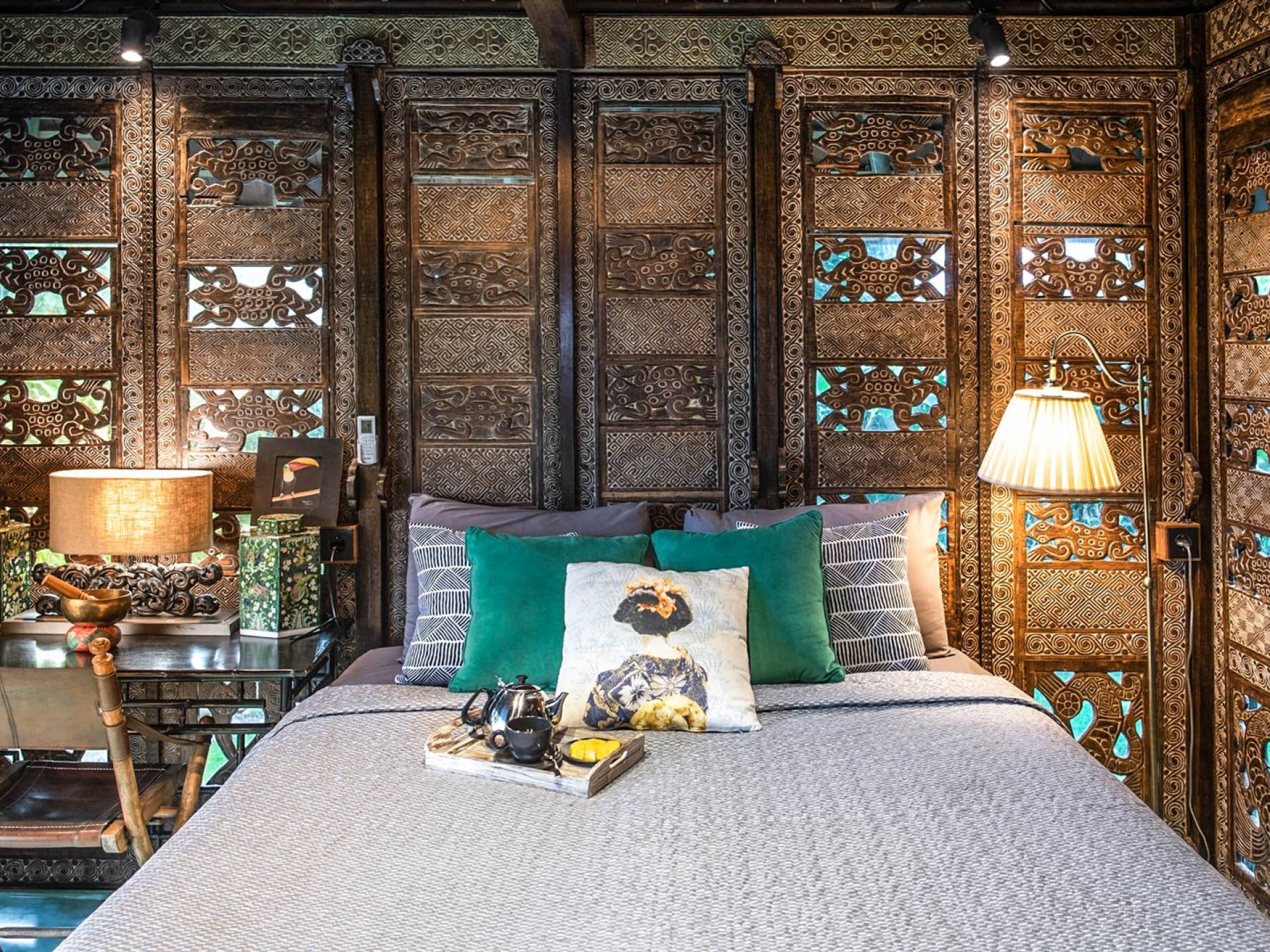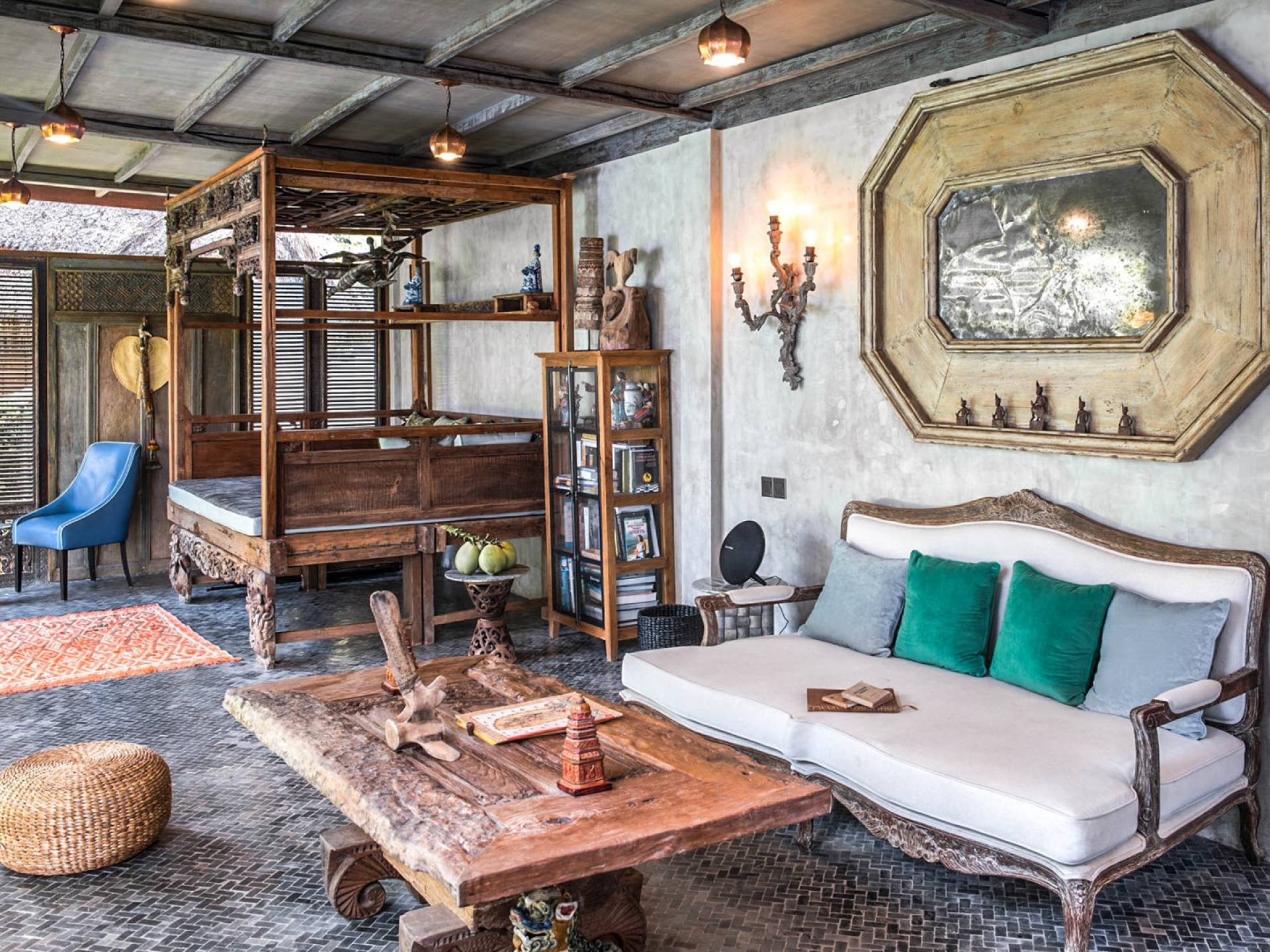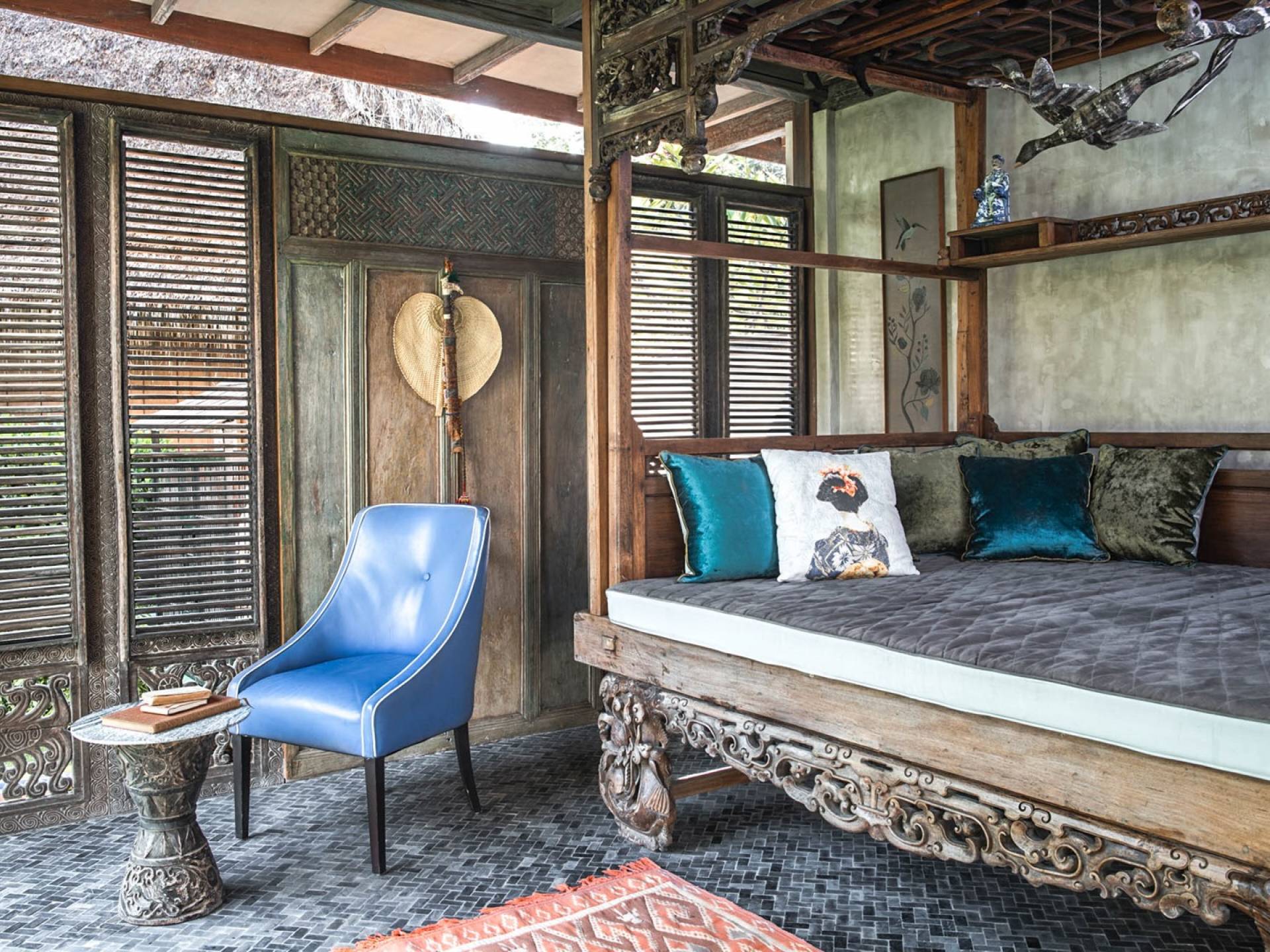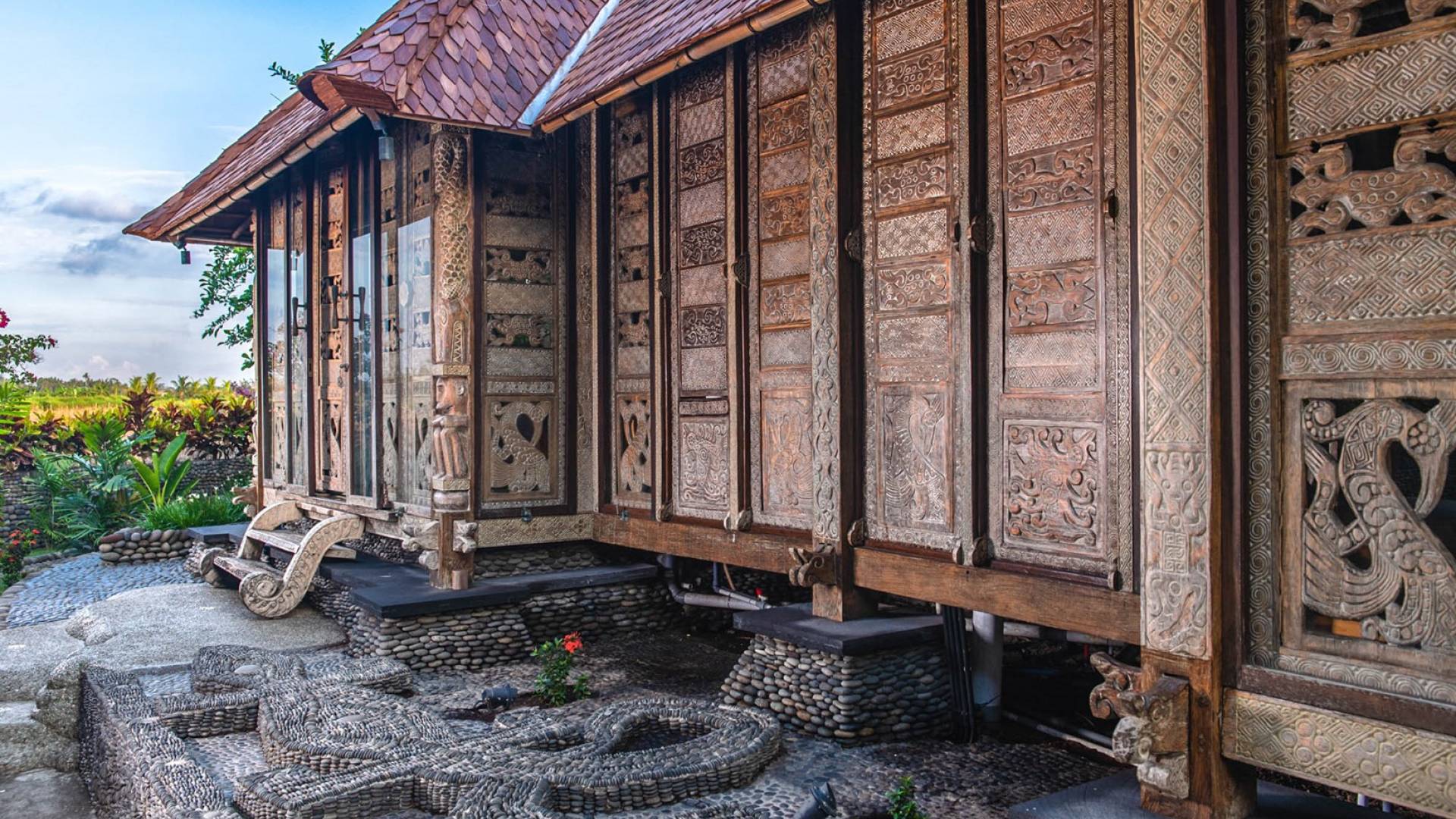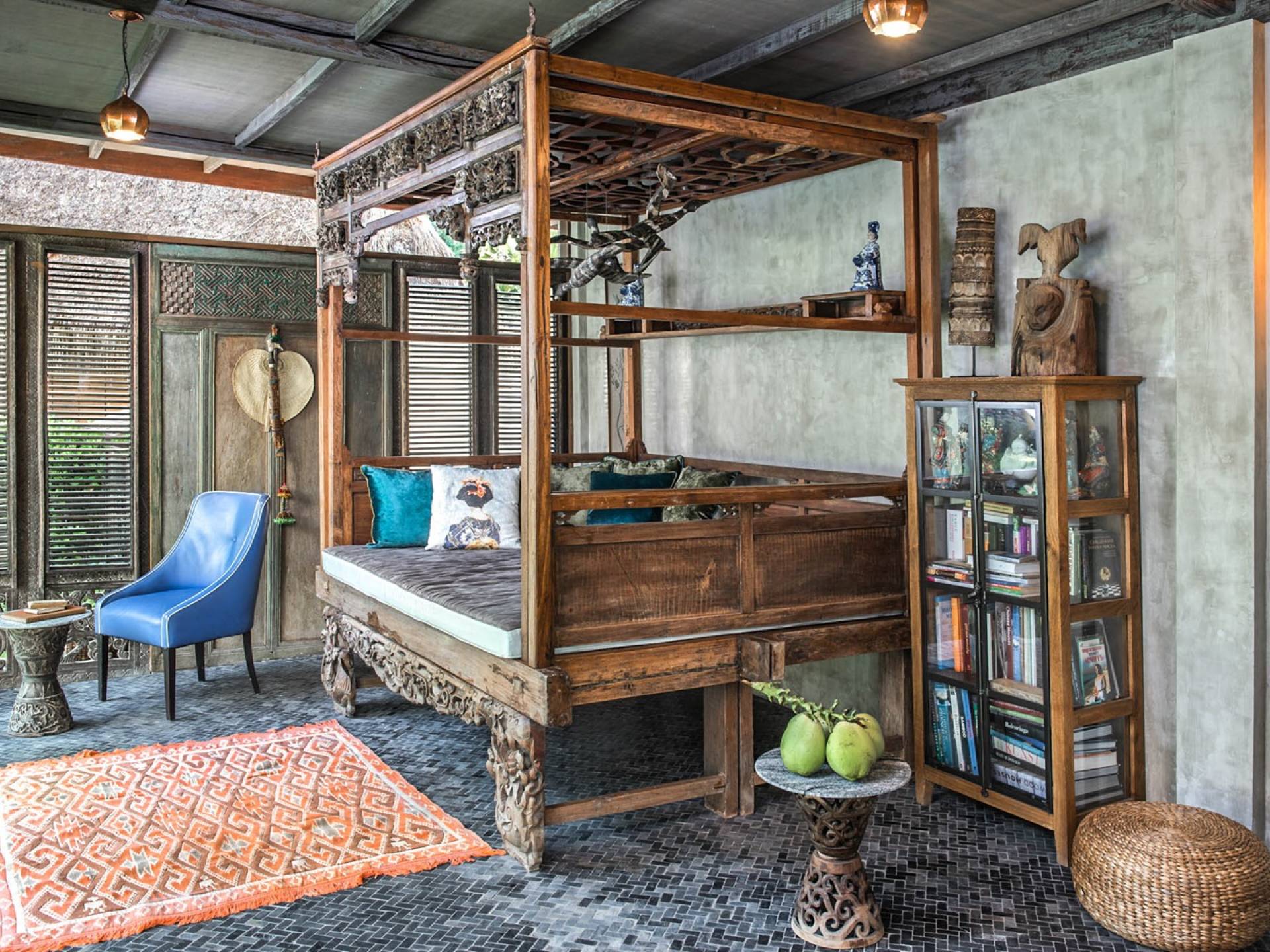 La villa cuenta con artefactos únicos de todo el planeta: meticulosos tallados en madera de Timor y Bali, lámparas de cobre y bronce de Marruecos y muebles antiguos de Java y China. Su jardín privado está lleno de árboles frutales, lo que brinda una sensación verdaderamente tropical. La piscina está techada para mayor privacidad durante los tratamientos de spa tradicionales y las prácticas curativas. La propiedad está rodeada de interminables campos de arroz, verde esmeralda por la mañana, naranja o violeta al atardecer