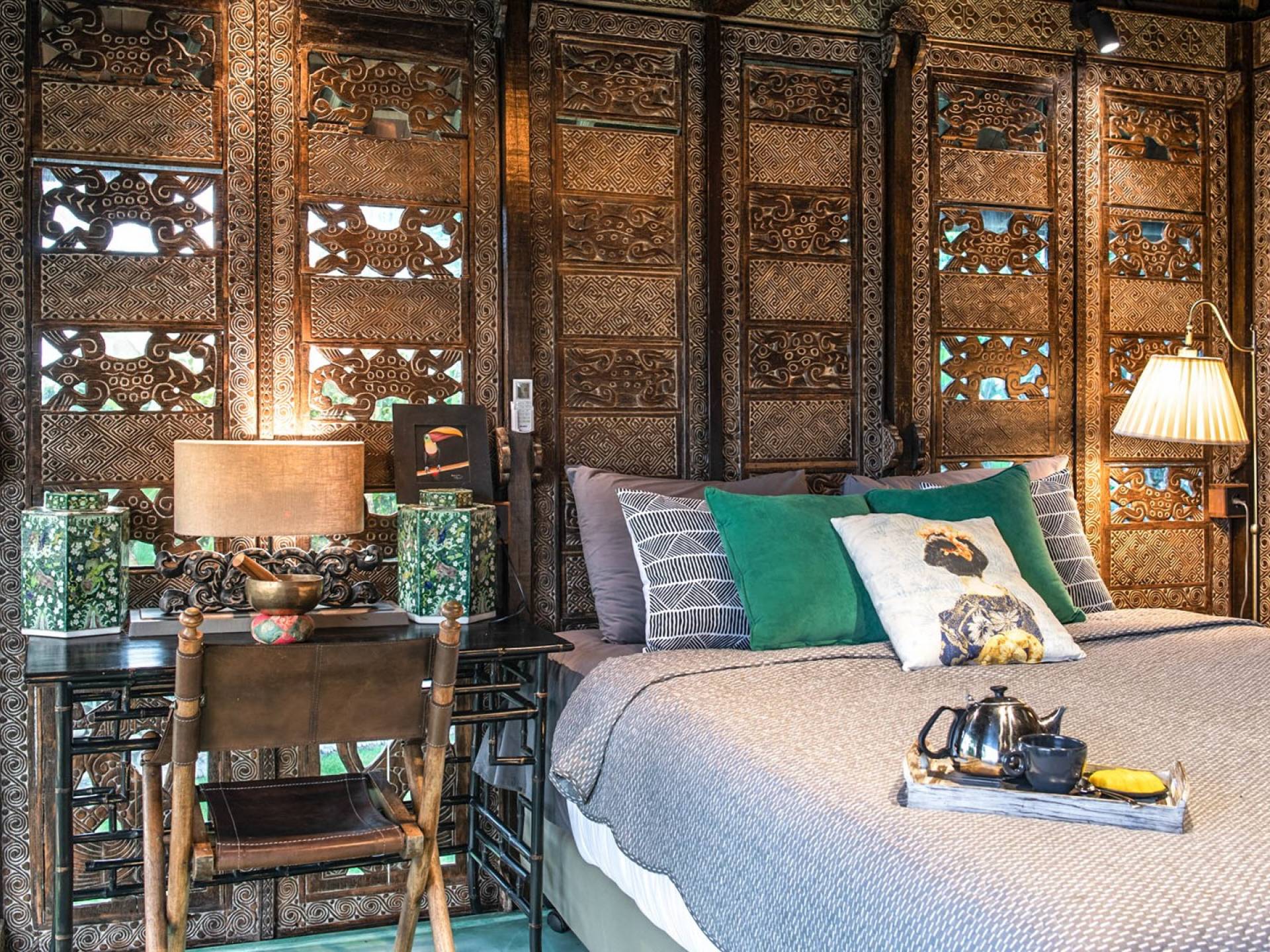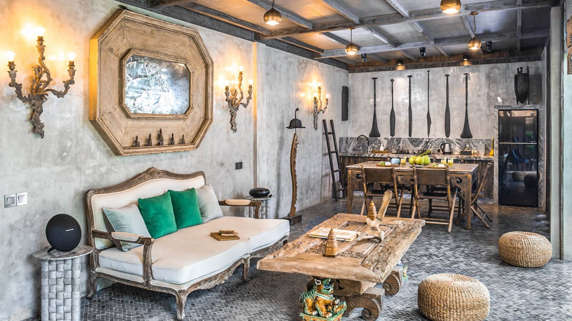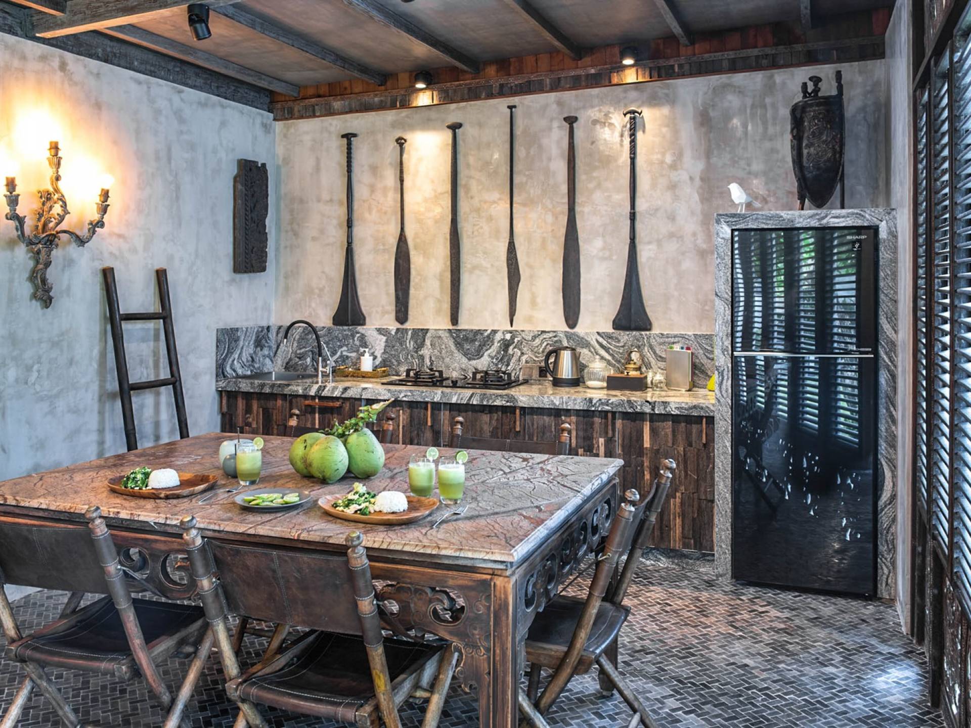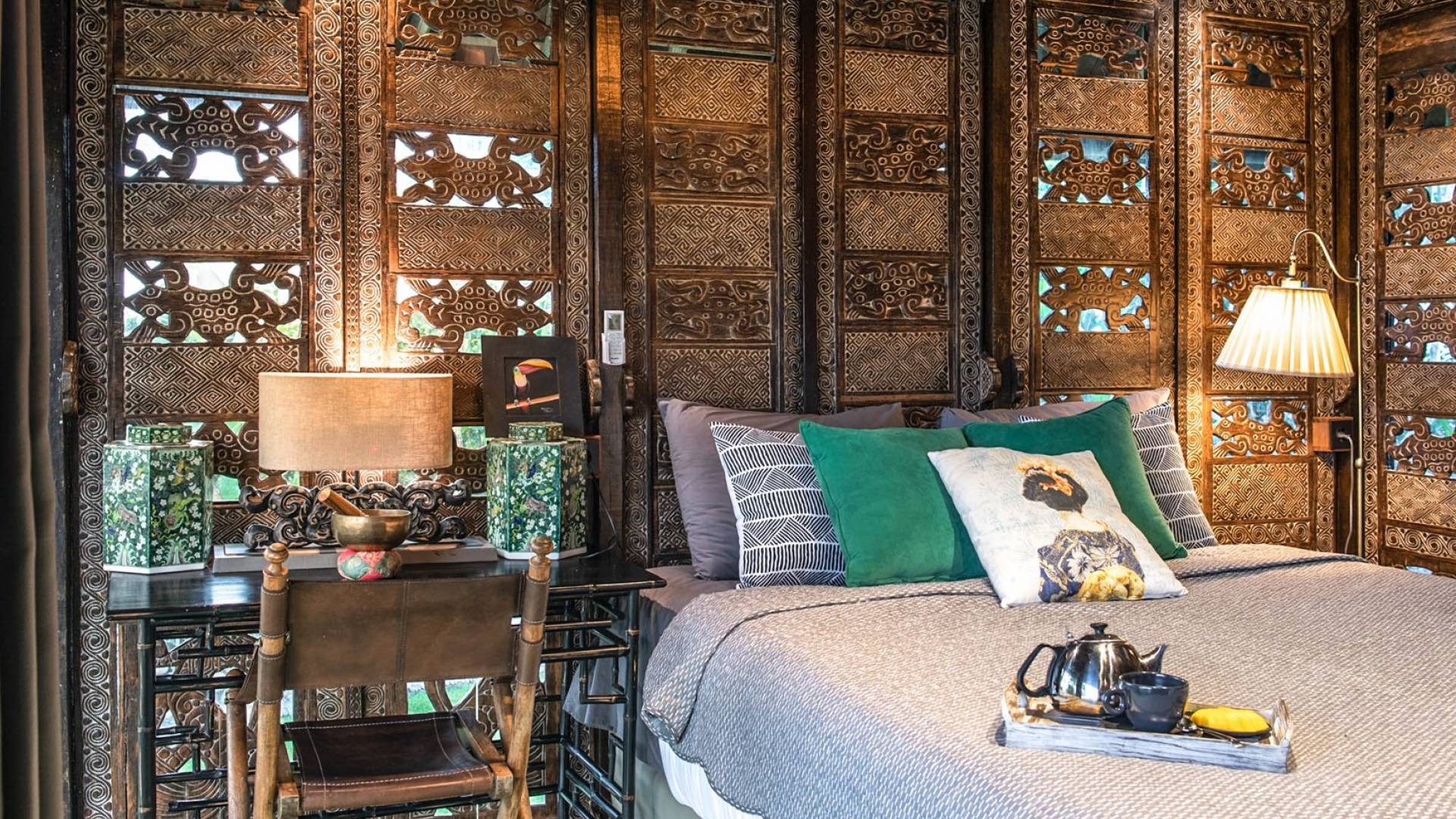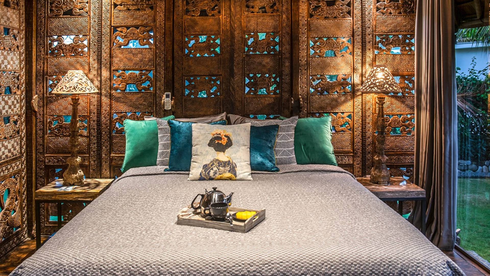 La villa cuenta con artefactos únicos de todo el planeta: meticulosos tallados en madera de Timor y Bali, lámparas de cobre y bronce de Marruecos y muebles antiguos de Java y China. Su jardín privado está lleno de árboles frutales, lo que brinda una sensación verdaderamente tropical. La piscina está techada para mayor privacidad durante los tratamientos de spa tradicionales y las prácticas curativas. La propiedad está rodeada de interminables campos de arroz, verde esmeralda por la mañana, naranja o violeta al atardecer