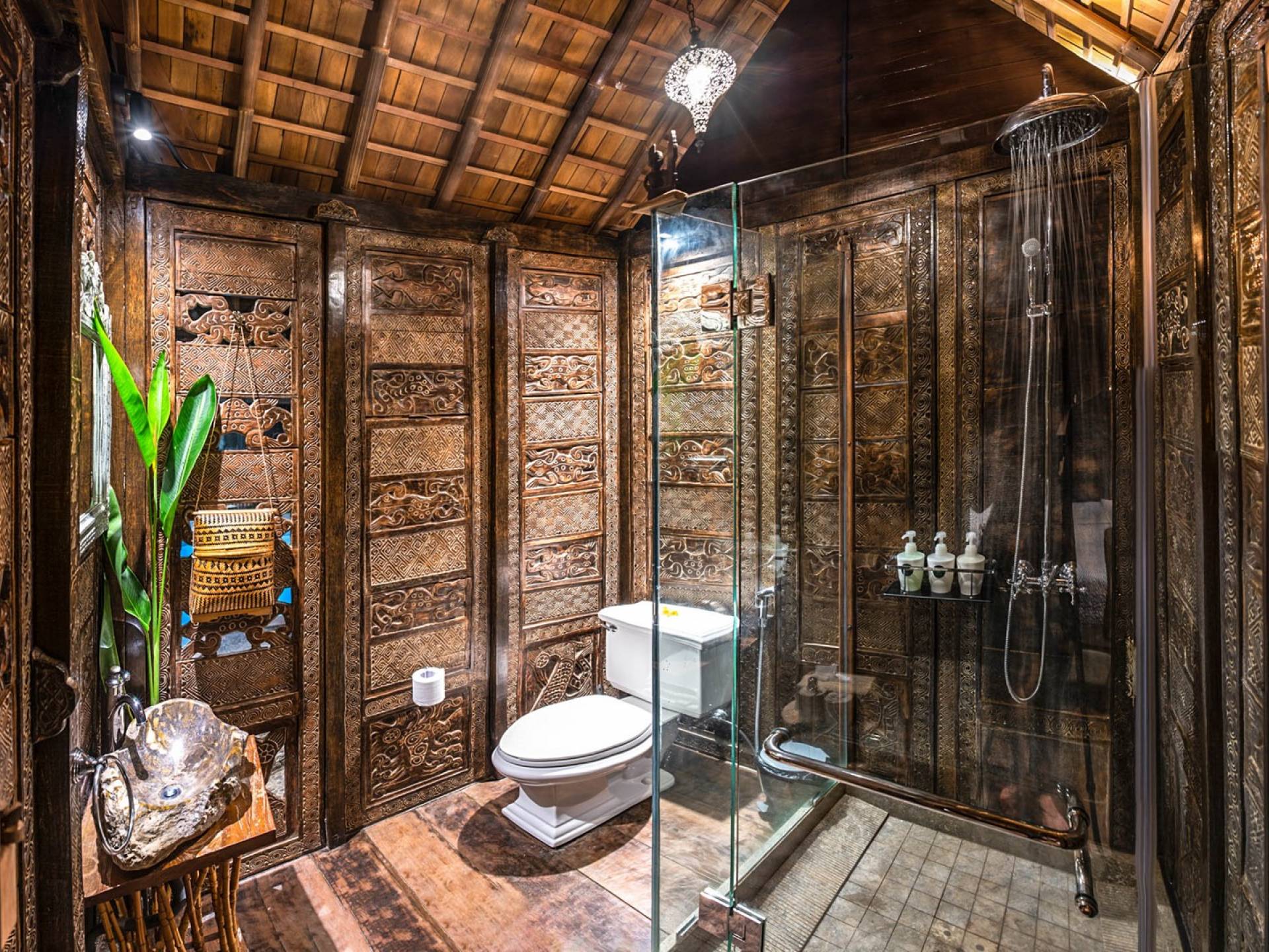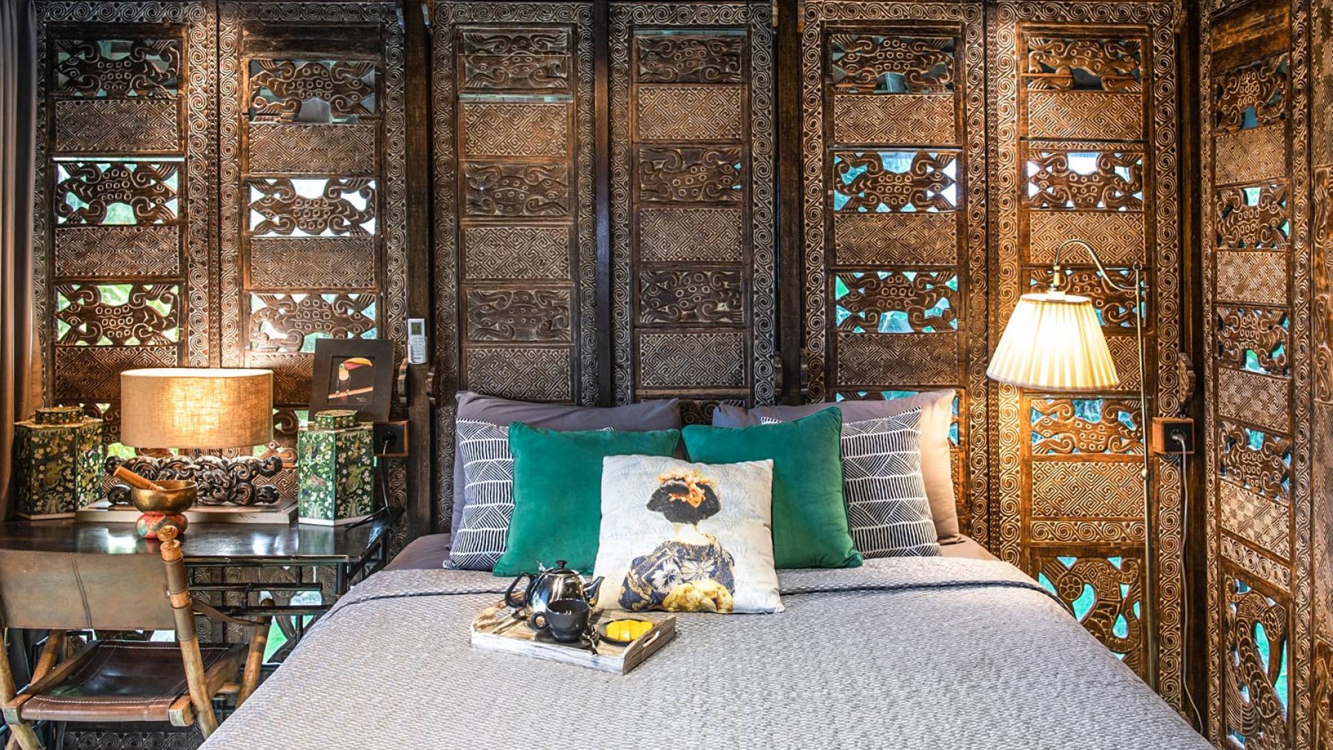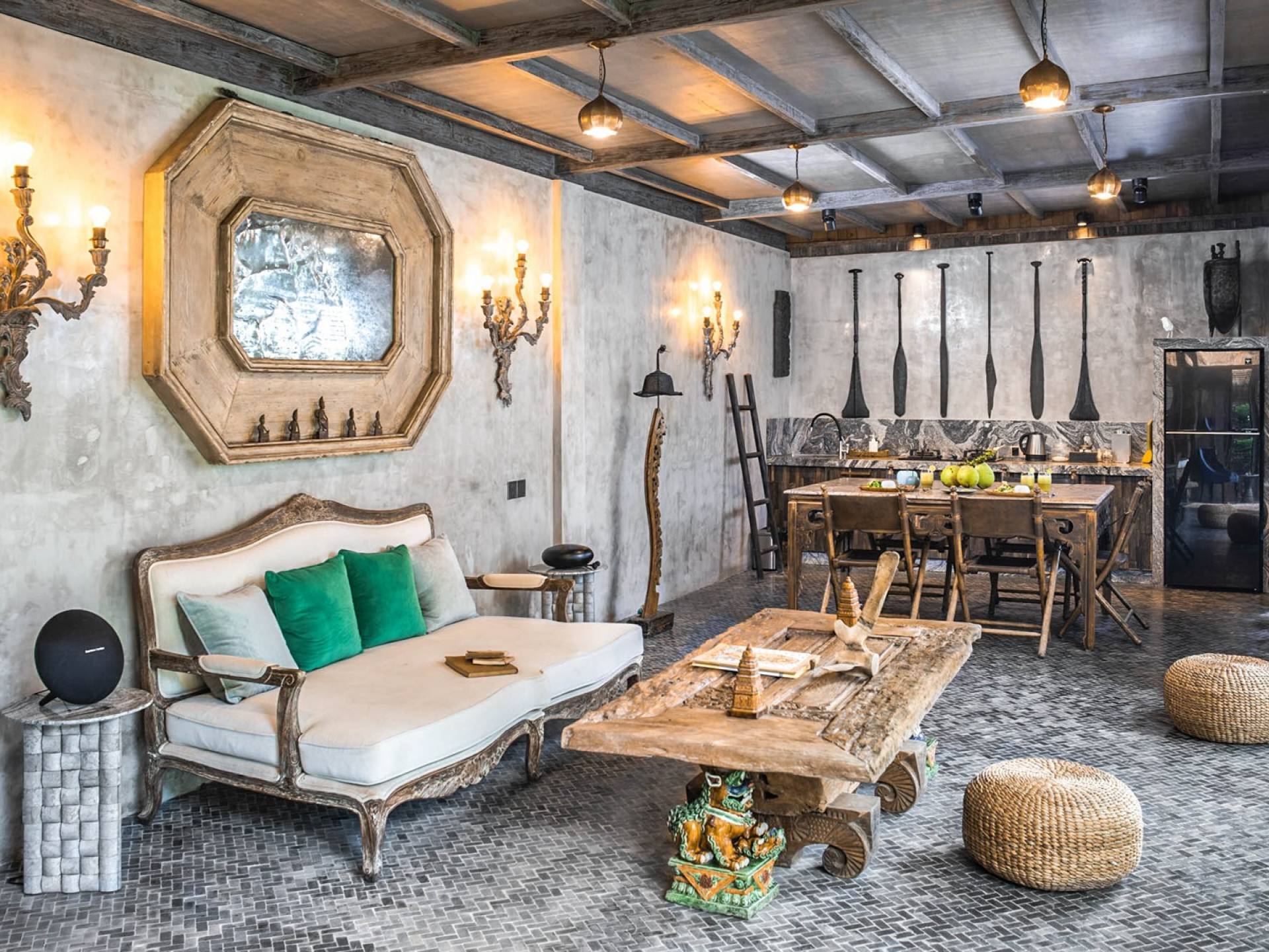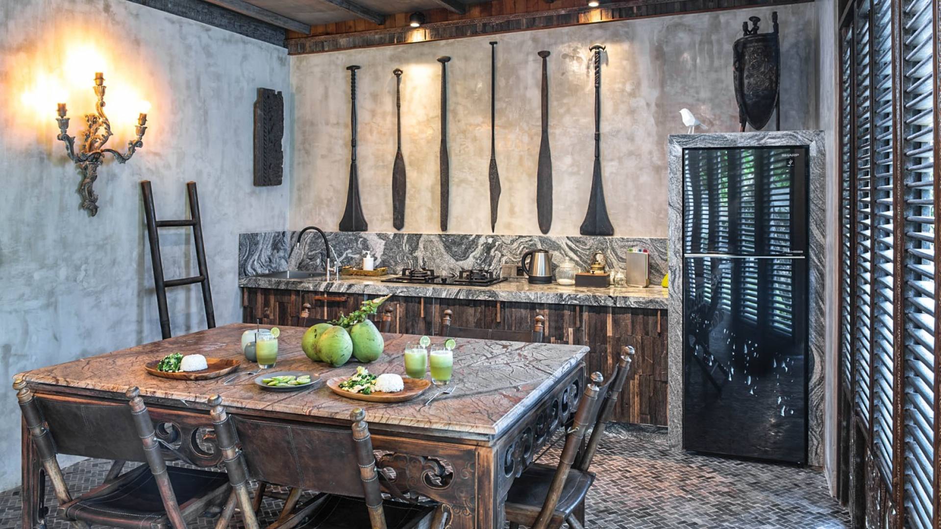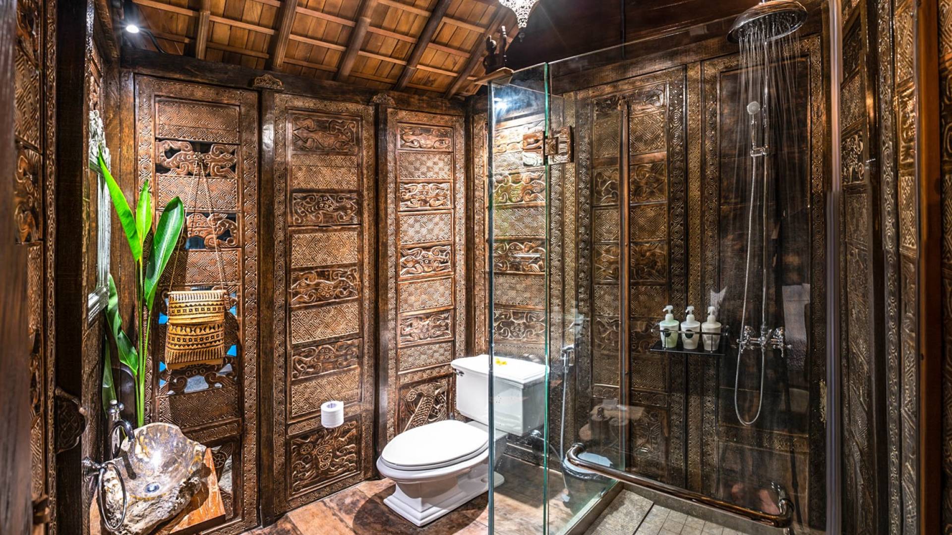 La villa cuenta con artefactos únicos de todo el planeta: meticulosos tallados en madera de Timor y Bali, lámparas de cobre y bronce de Marruecos y muebles antiguos de Java y China. Su jardín privado está lleno de árboles frutales, lo que brinda una sensación verdaderamente tropical. La piscina está techada para mayor privacidad durante los tratamientos de spa tradicionales y las prácticas curativas. La propiedad está rodeada de interminables campos de arroz, verde esmeralda por la mañana, naranja o violeta al atardecer