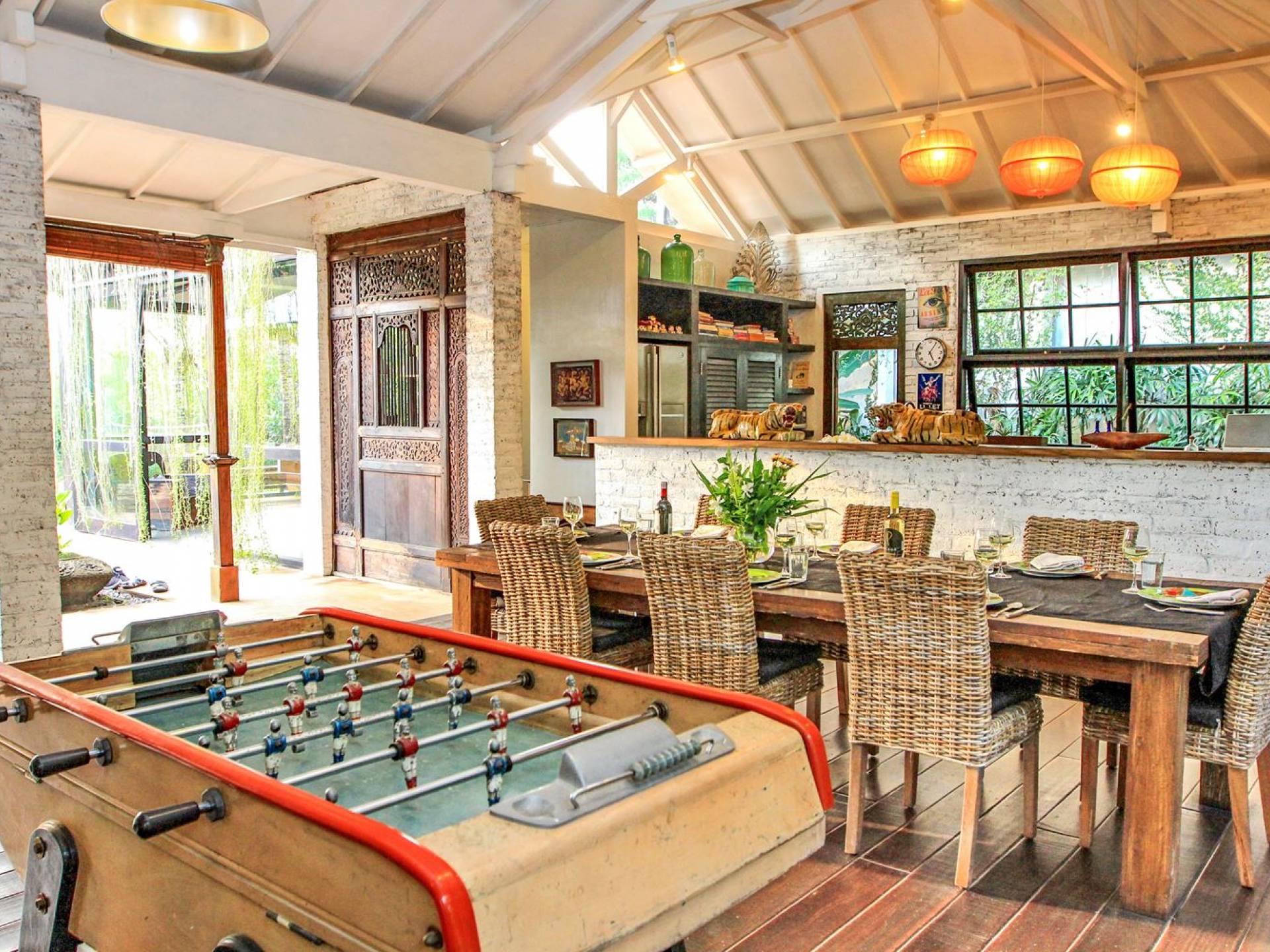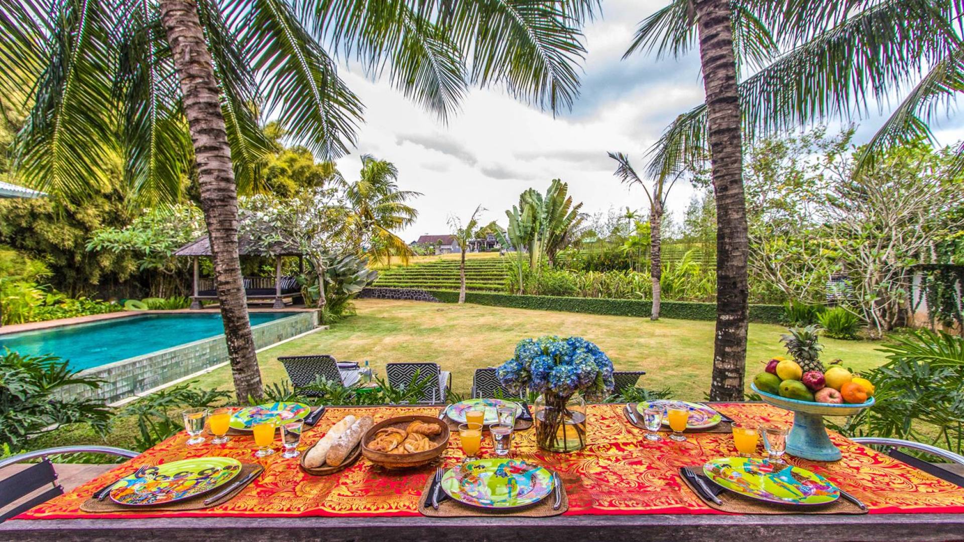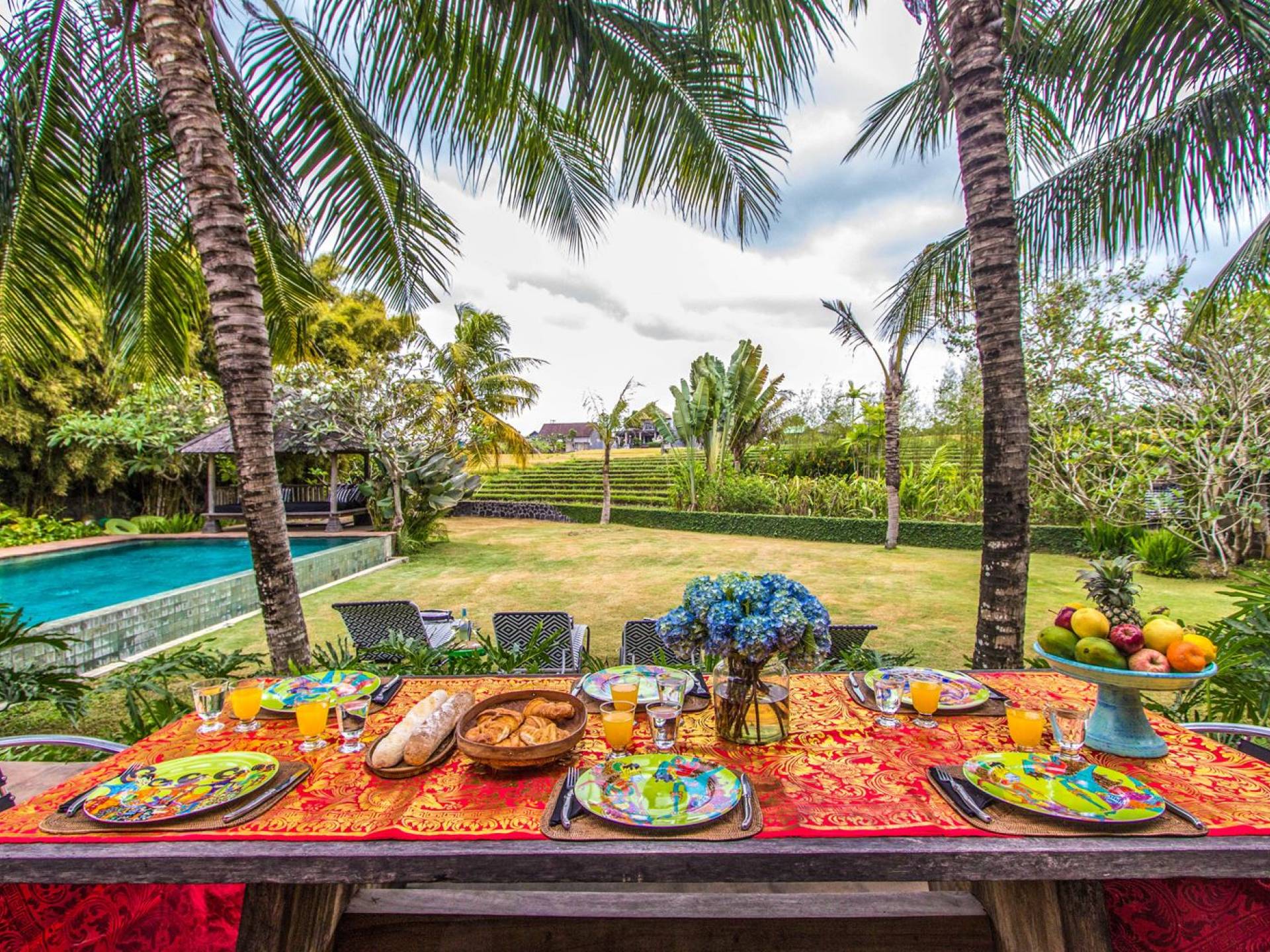 La villa también tiene una zona de barbacoa, con una gran mesa en la terraza exterior, así como una terraza privada en el piso de arriba, ideal para tomar una copa al atardecer o hacer yoga temprano en la mañana; en realidad, es extremadamente tranquilo e invita a la meditación. La puesta de sol frente a la villa, sobre los campos de arroz y es una hora bastante mágica para experimentar.
