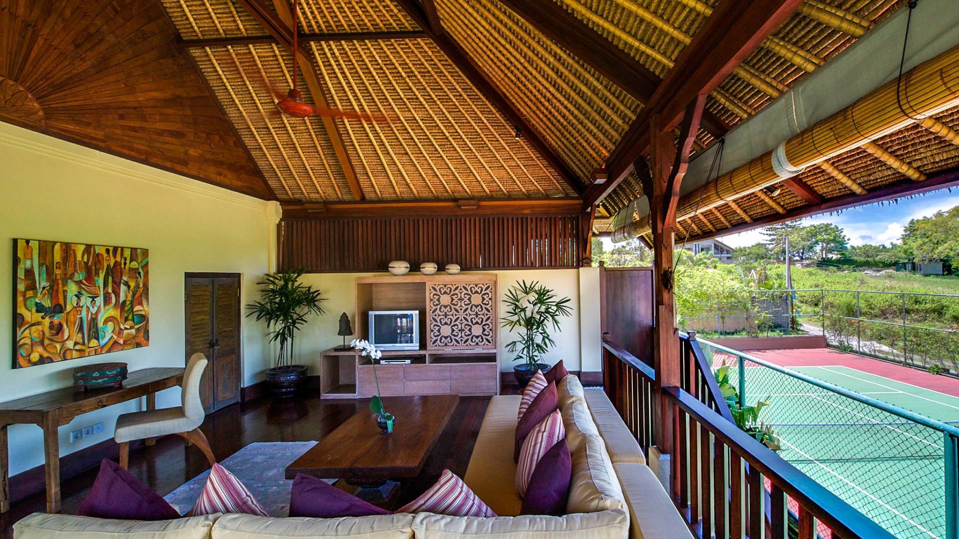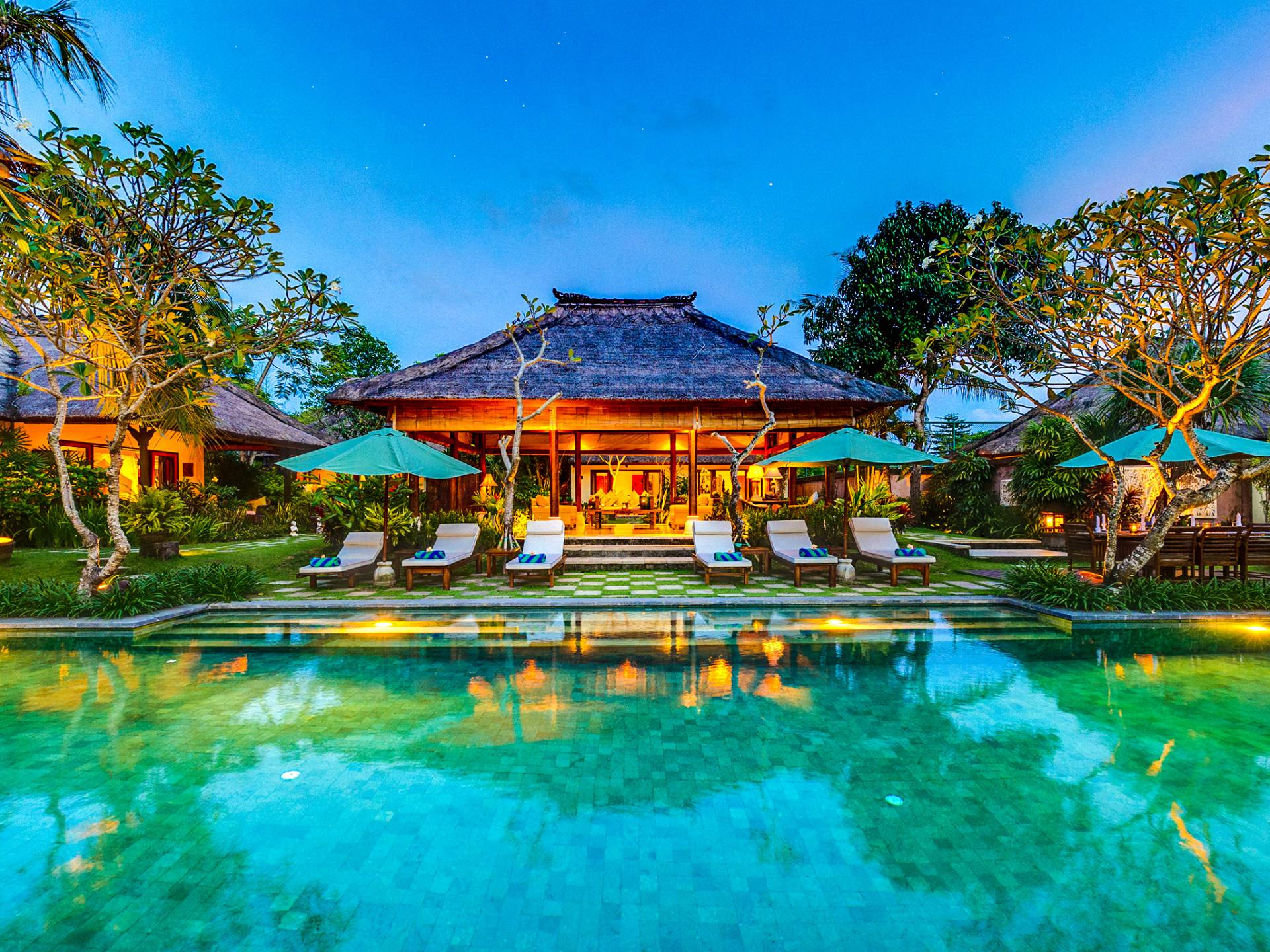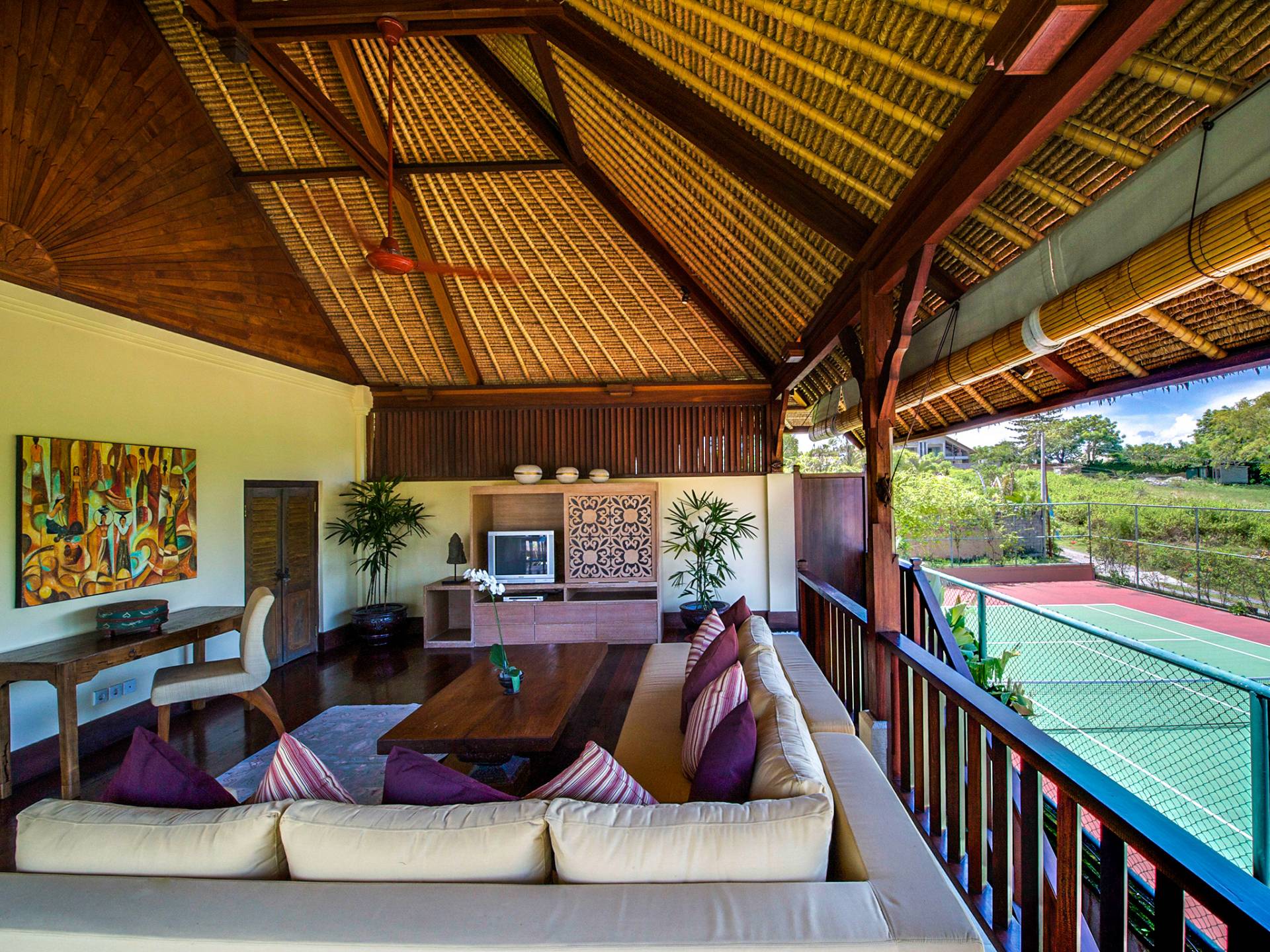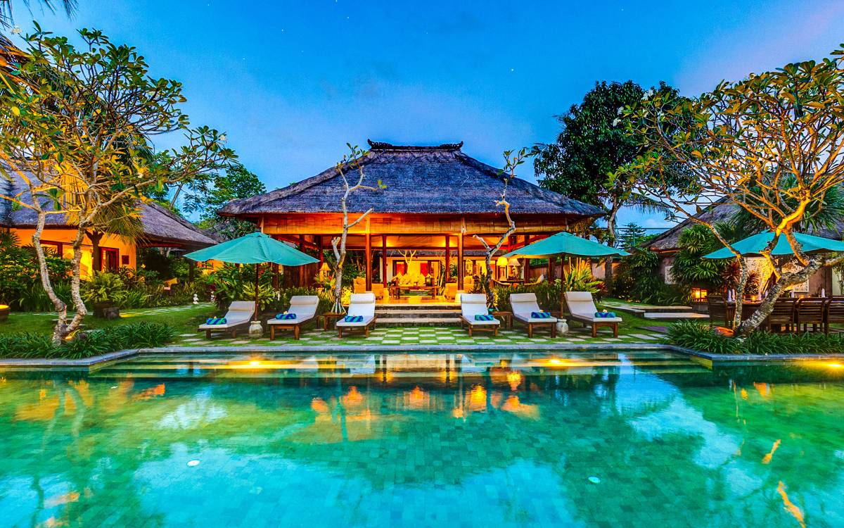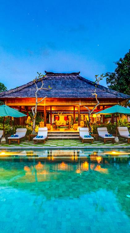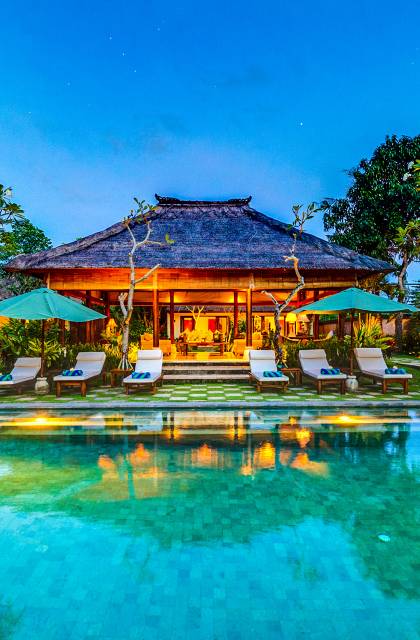 Serena, espaciosa y acogedora, Villa Surya Damai se deleita en su jardín tropical maduro en el tranquilo pueblo de Umalas, al suroeste de Bali. Cinco cómodas suites con románticos baños en el jardín tienen capacidad para 14 huéspedes, mientras que los senderos serpenteantes conducen a un pabellón de estar de lados abiertos y un elegante comedor. Una piscina de 18 metros, una cancha de tenis y una sala de televisión brindan entretenimiento y diversión. Un suave paseo más allá de los pabellones con techo de paja de esta magnífica villa con personal lo llevará a la playa de Batubelig, mientras que las tiendas, restaurantes y la sofisticada vida nocturna de Seminyak están a poca distancia en automóvil, y el automóvil y el conductor de Surya Damai están a su disposición.
