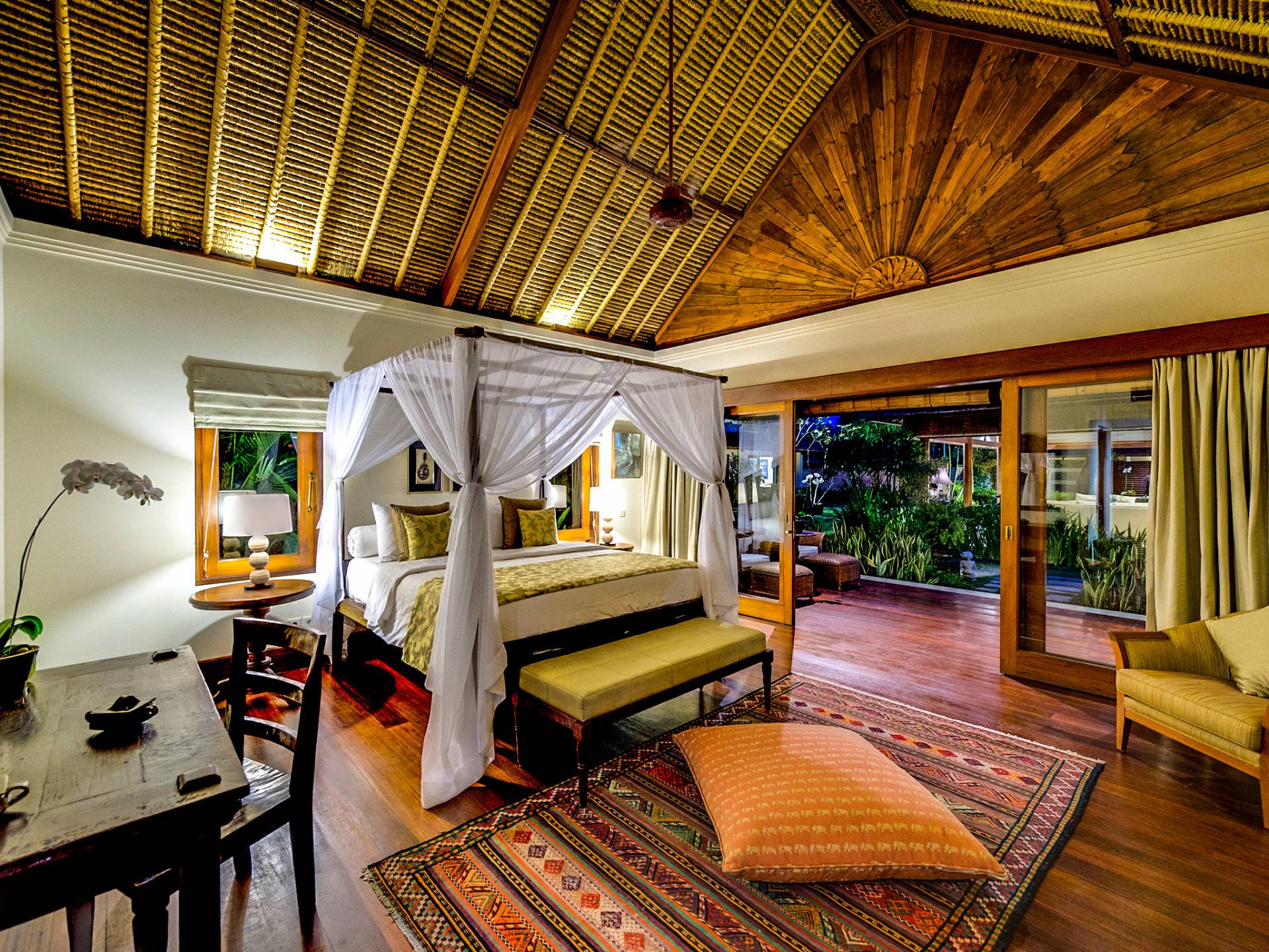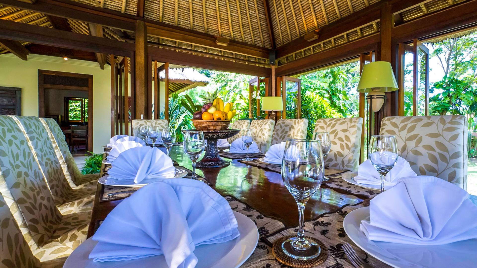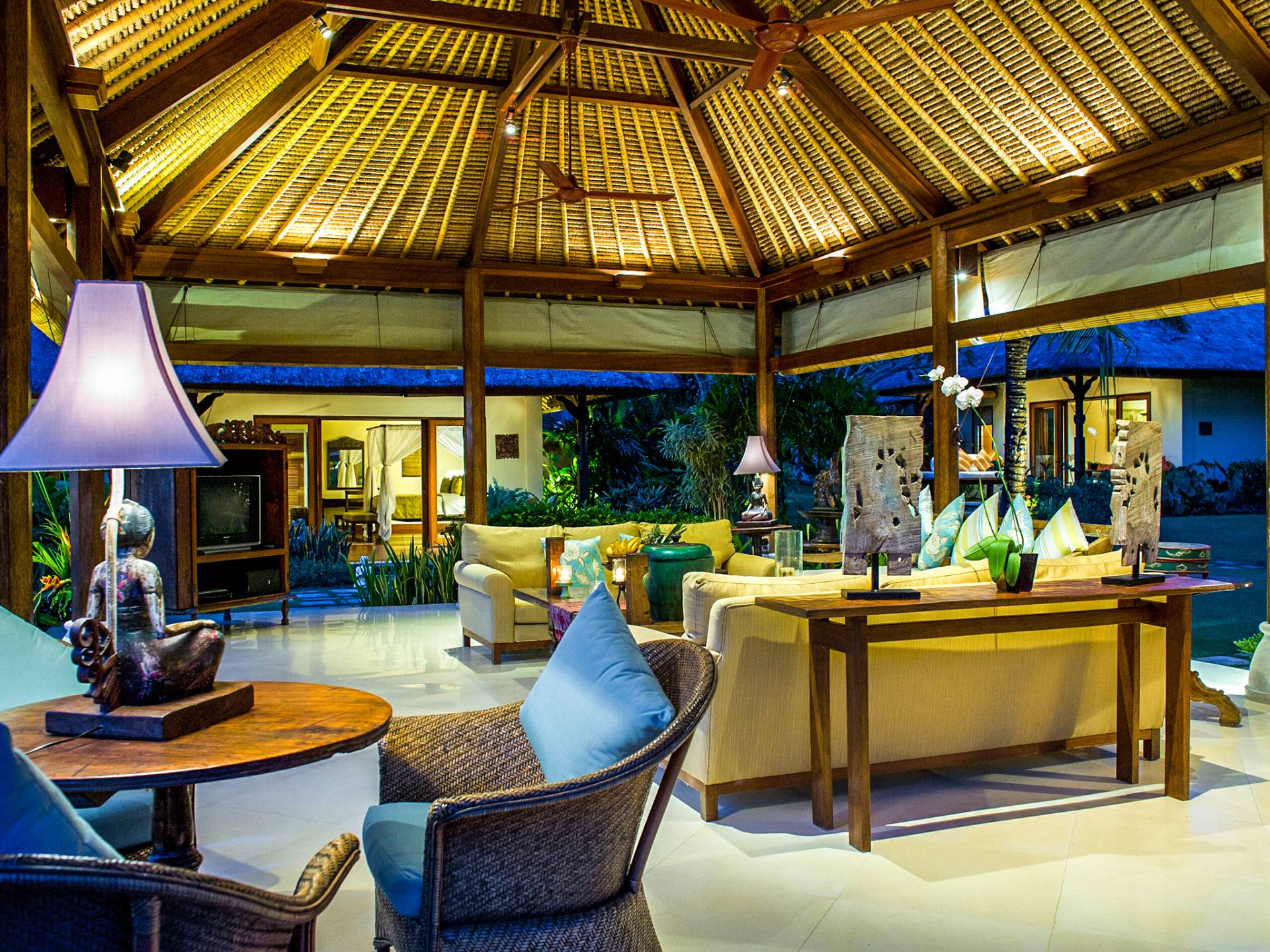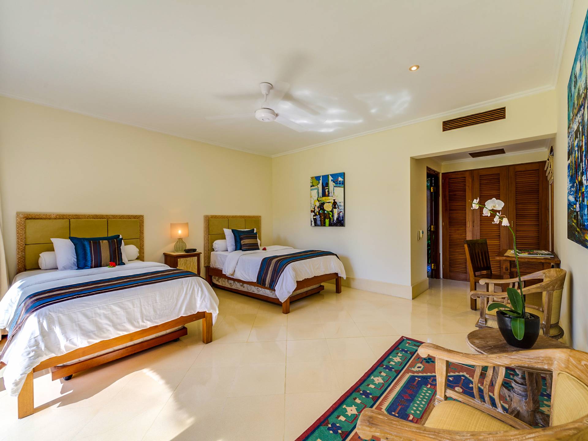 Serena, espaciosa y acogedora, Villa Surya Damai se deleita en su jardín tropical maduro en el tranquilo pueblo de Umalas, al suroeste de Bali. Cinco cómodas suites con románticos baños en el jardín tienen capacidad para 14 huéspedes, mientras que los senderos serpenteantes conducen a un pabellón de estar de lados abiertos y un elegante comedor. Una piscina de 18 metros, una cancha de tenis y una sala de televisión brindan entretenimiento y diversión. Un suave paseo más allá de los pabellones con techo de paja de esta magnífica villa con personal lo llevará a la playa de Batubelig, mientras que las tiendas, restaurantes y la sofisticada vida nocturna de Seminyak están a poca distancia en automóvil, y el automóvil y el conductor de Surya Damai están a su disposición.