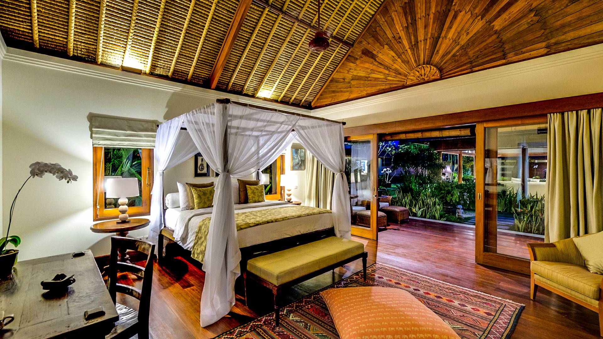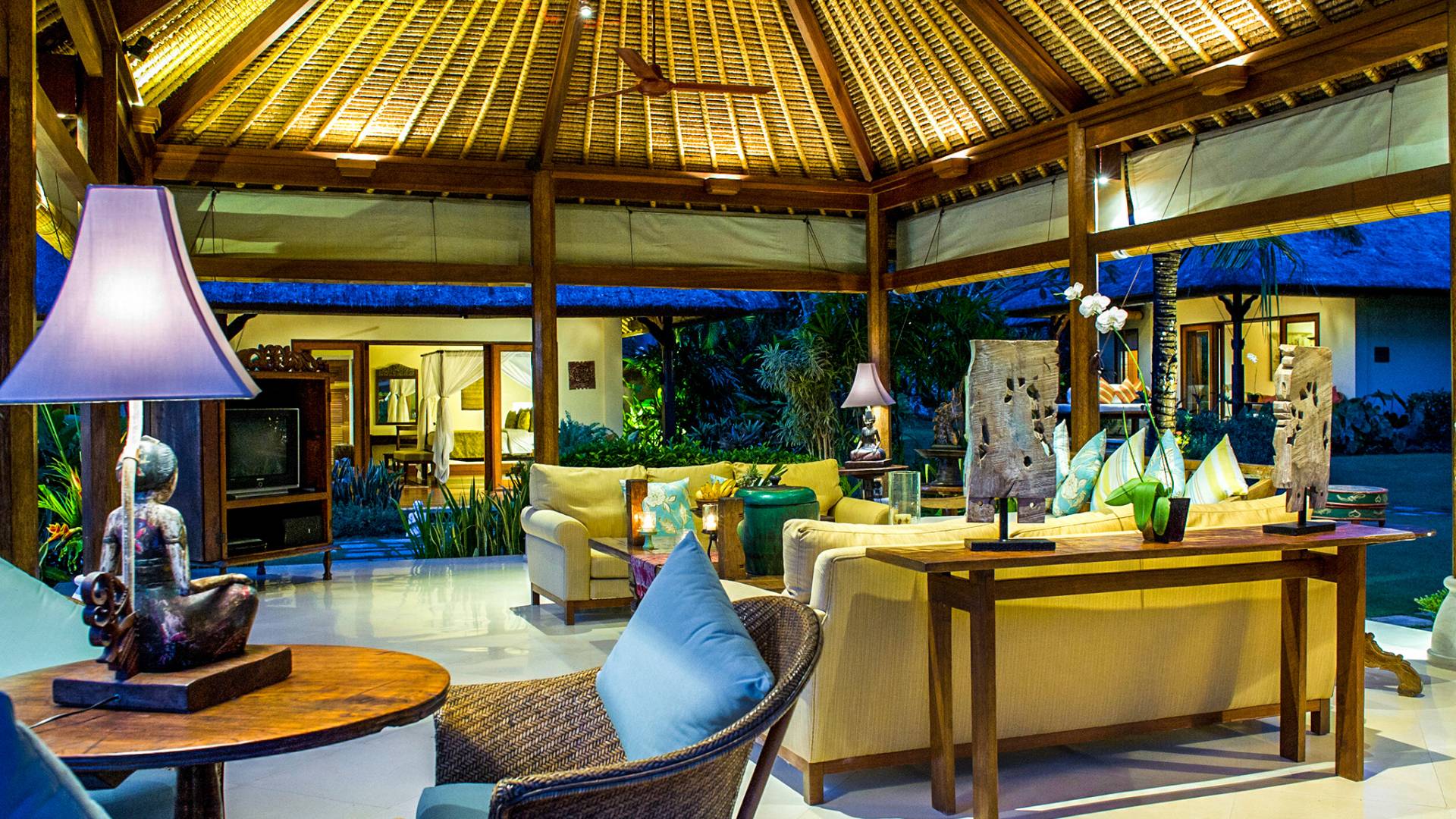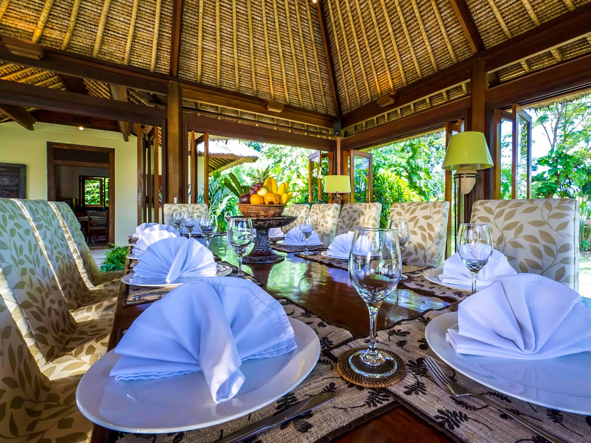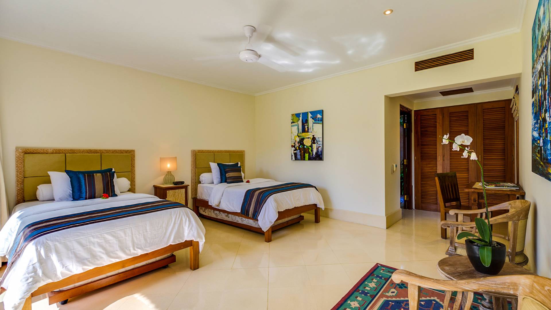 Serena, espaciosa y acogedora, Villa Surya Damai se deleita en su jardín tropical maduro en el tranquilo pueblo de Umalas, al suroeste de Bali. Cinco cómodas suites con románticos baños en el jardín tienen capacidad para 14 huéspedes, mientras que los senderos serpenteantes conducen a un pabellón de estar de lados abiertos y un elegante comedor. Una piscina de 18 metros, una cancha de tenis y una sala de televisión brindan entretenimiento y diversión. Un suave paseo más allá de los pabellones con techo de paja de esta magnífica villa con personal lo llevará a la playa de Batubelig, mientras que las tiendas, restaurantes y la sofisticada vida nocturna de Seminyak están a poca distancia en automóvil, y el automóvil y el conductor de Surya Damai están a su disposición.