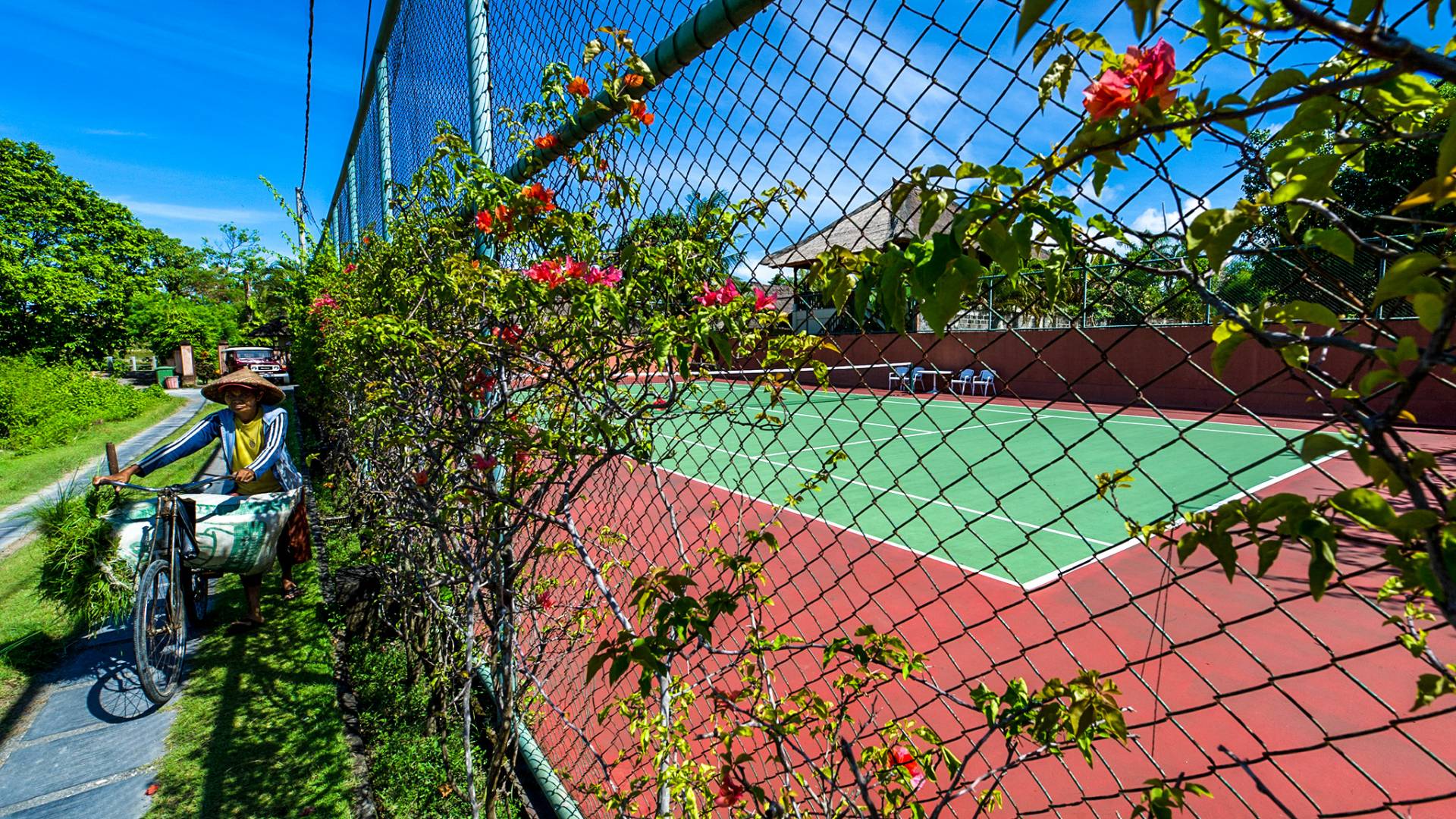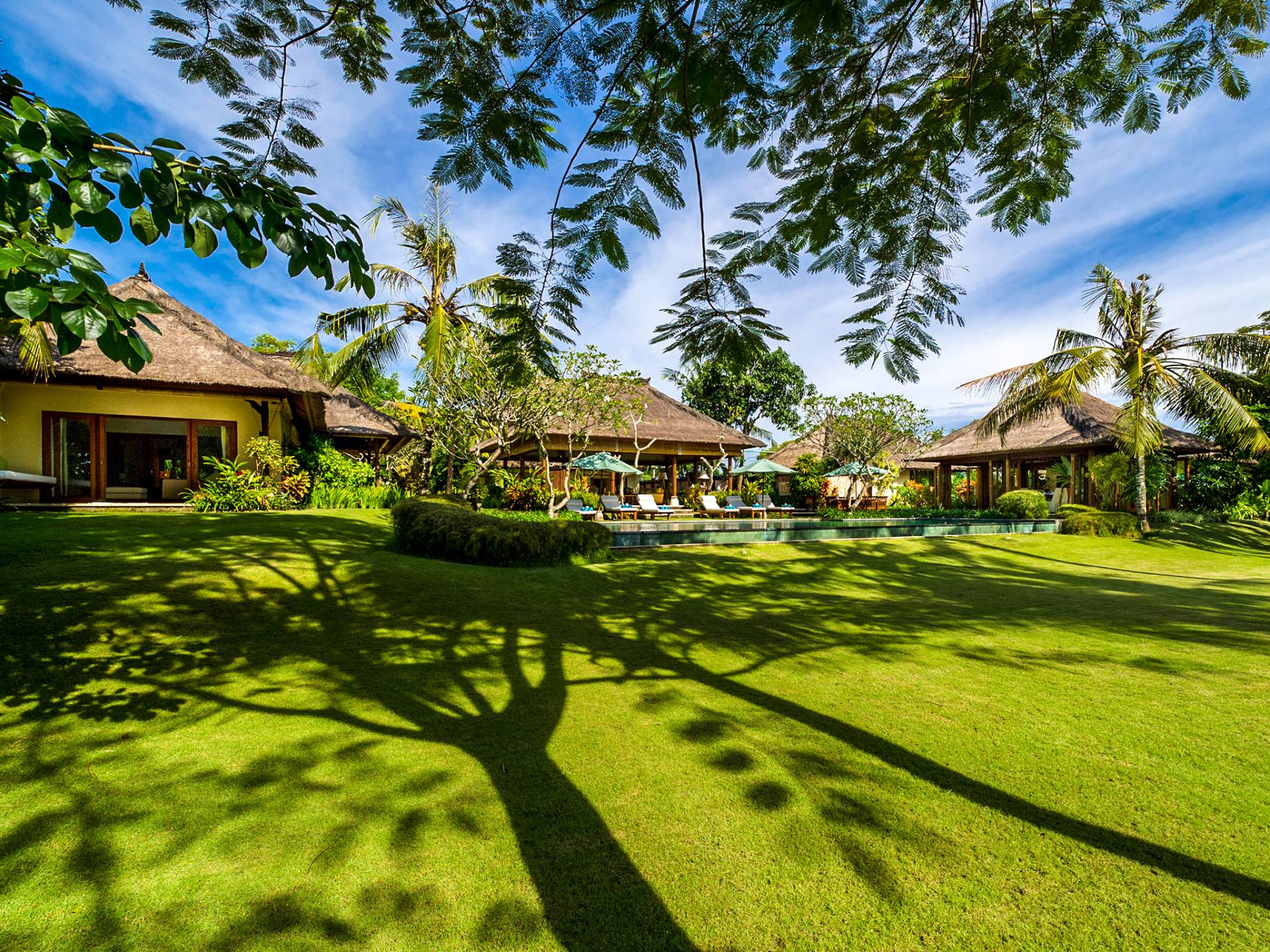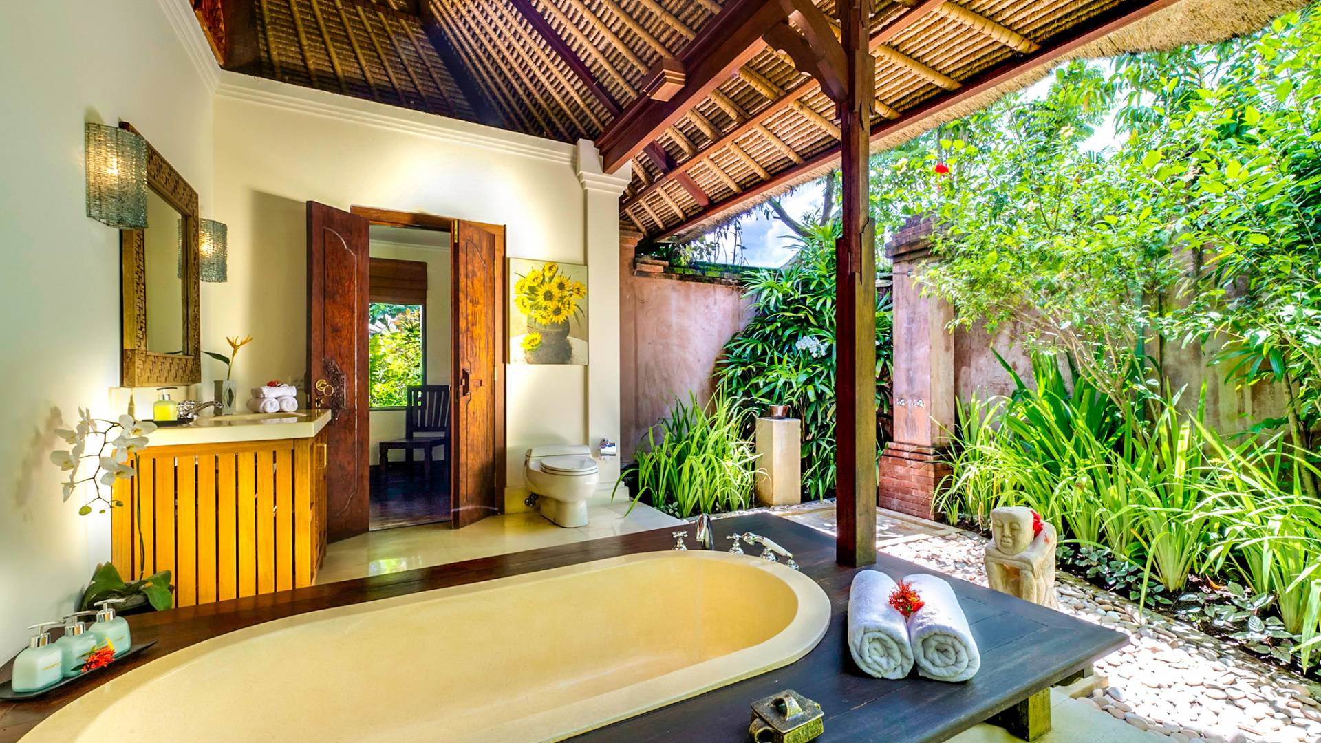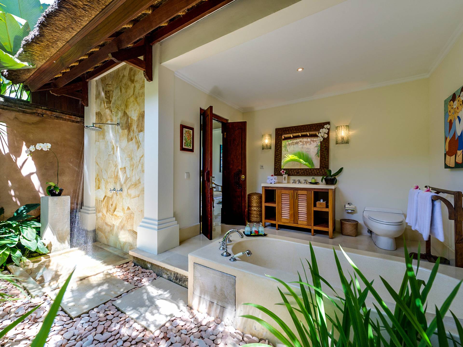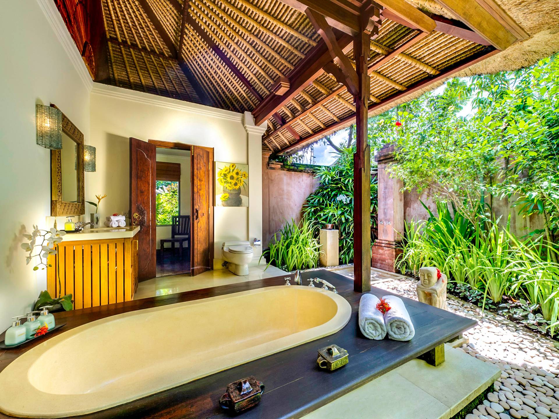 La villa se encuentra en un camino estrecho que atraviesa un pequeño puente y disecciona los campos de arroz. Al lado de la villa, inmediatamente afuera de las puertas de entrada de madera, hay un campo de vacas pastando. Un agradable paseo de unos 20 minutos a través de comunidades agrícolas y campos de arroz le llevará a la playa más cercana, Batubelig. Ideal para surfear, esta playa de arena negra, como muchas a lo largo de la costa suroeste, tiene fuertes corrientes, por lo que no es recomendable para nadadores novatos. Para las aguas patrulladas por las olas y las comodidades junto a la playa más desarrolladas, diríjase hacia el sur hasta la playa de Legian, a siete kilómetros de distancia.
