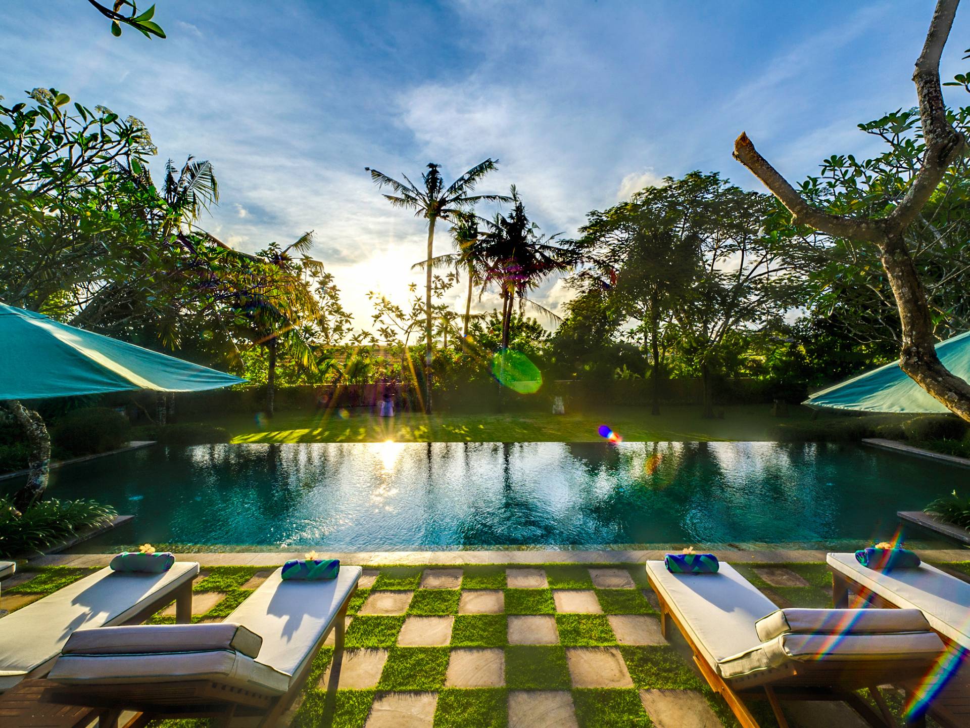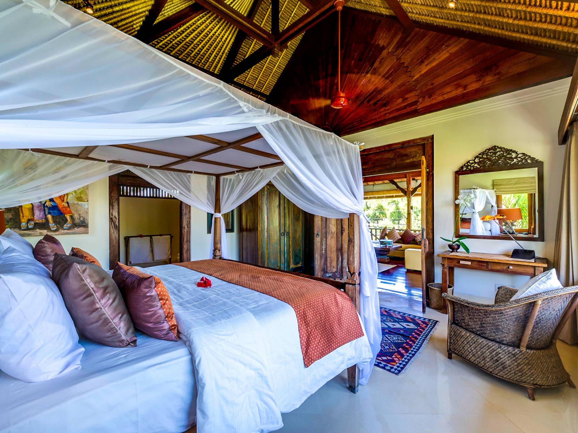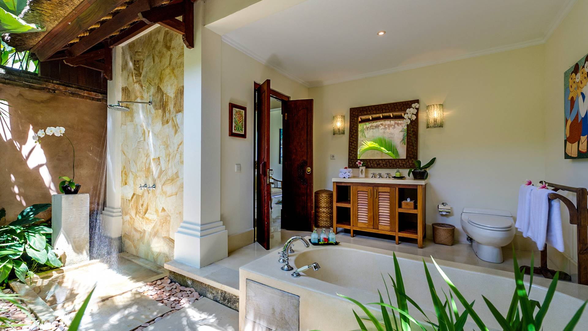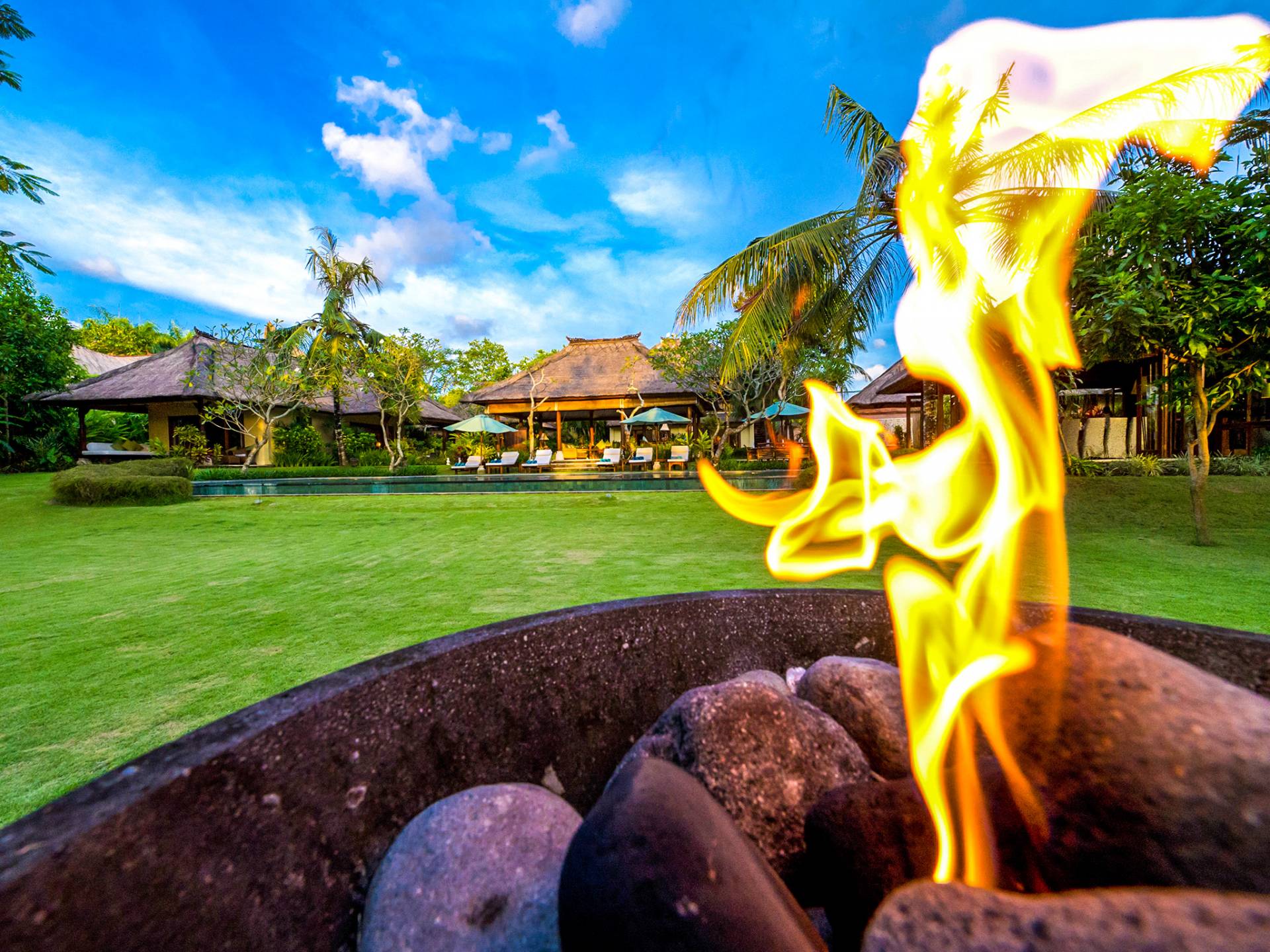 La villa se encuentra en un camino estrecho que atraviesa un pequeño puente y disecciona los campos de arroz. Al lado de la villa, inmediatamente afuera de las puertas de entrada de madera, hay un campo de vacas pastando. Un agradable paseo de unos 20 minutos a través de comunidades agrícolas y campos de arroz le llevará a la playa más cercana, Batubelig. Ideal para surfear, esta playa de arena negra, como muchas a lo largo de la costa suroeste, tiene fuertes corrientes, por lo que no es recomendable para nadadores novatos. Para las aguas patrulladas por las olas y las comodidades junto a la playa más desarrolladas, diríjase hacia el sur hasta la playa de Legian, a siete kilómetros de distancia.