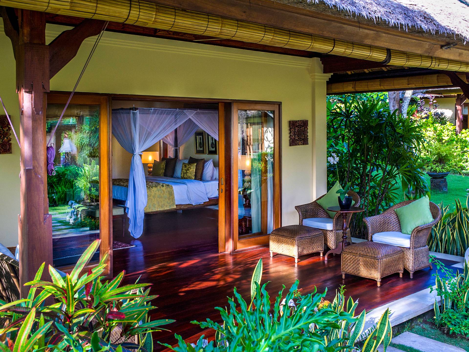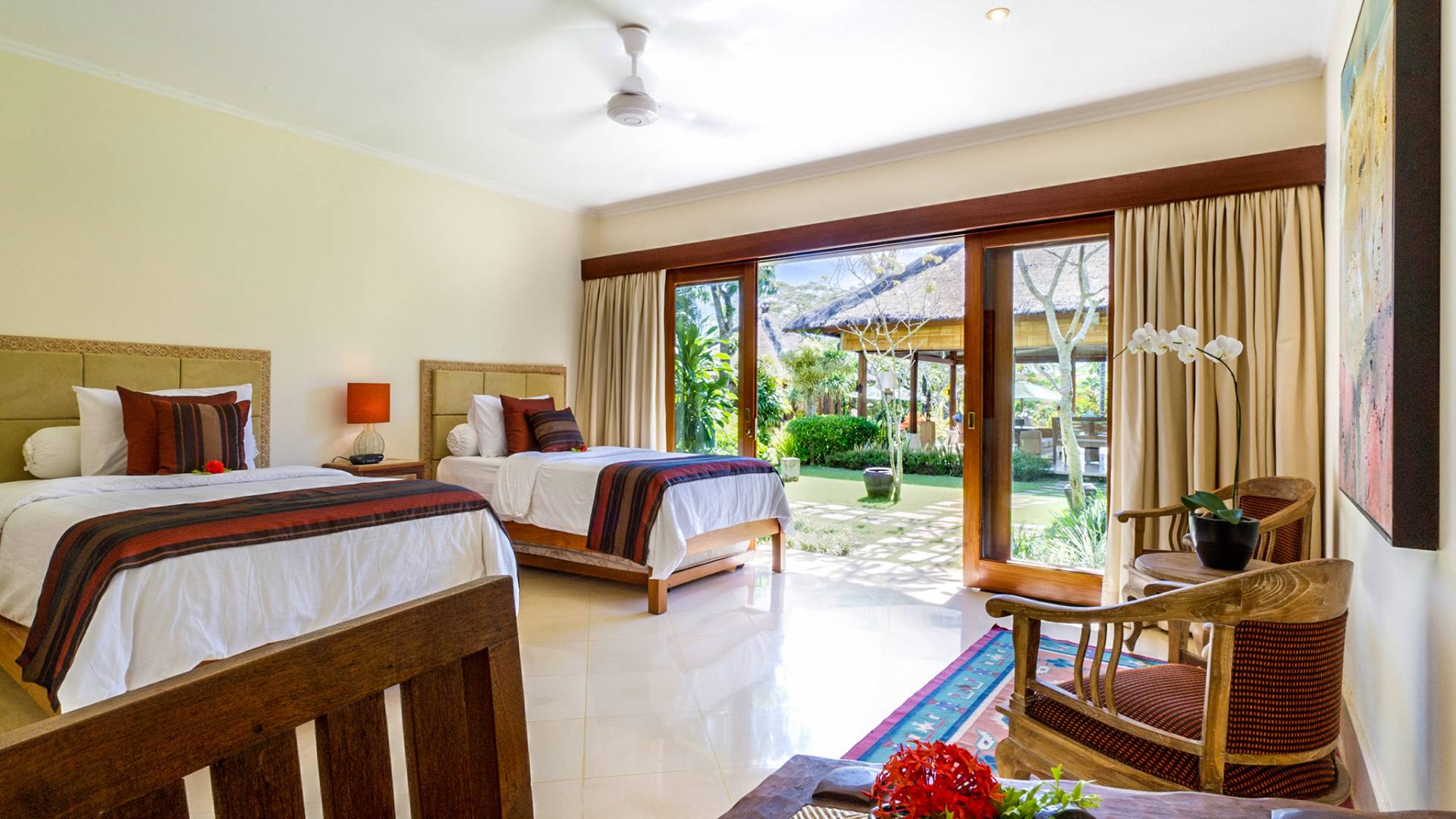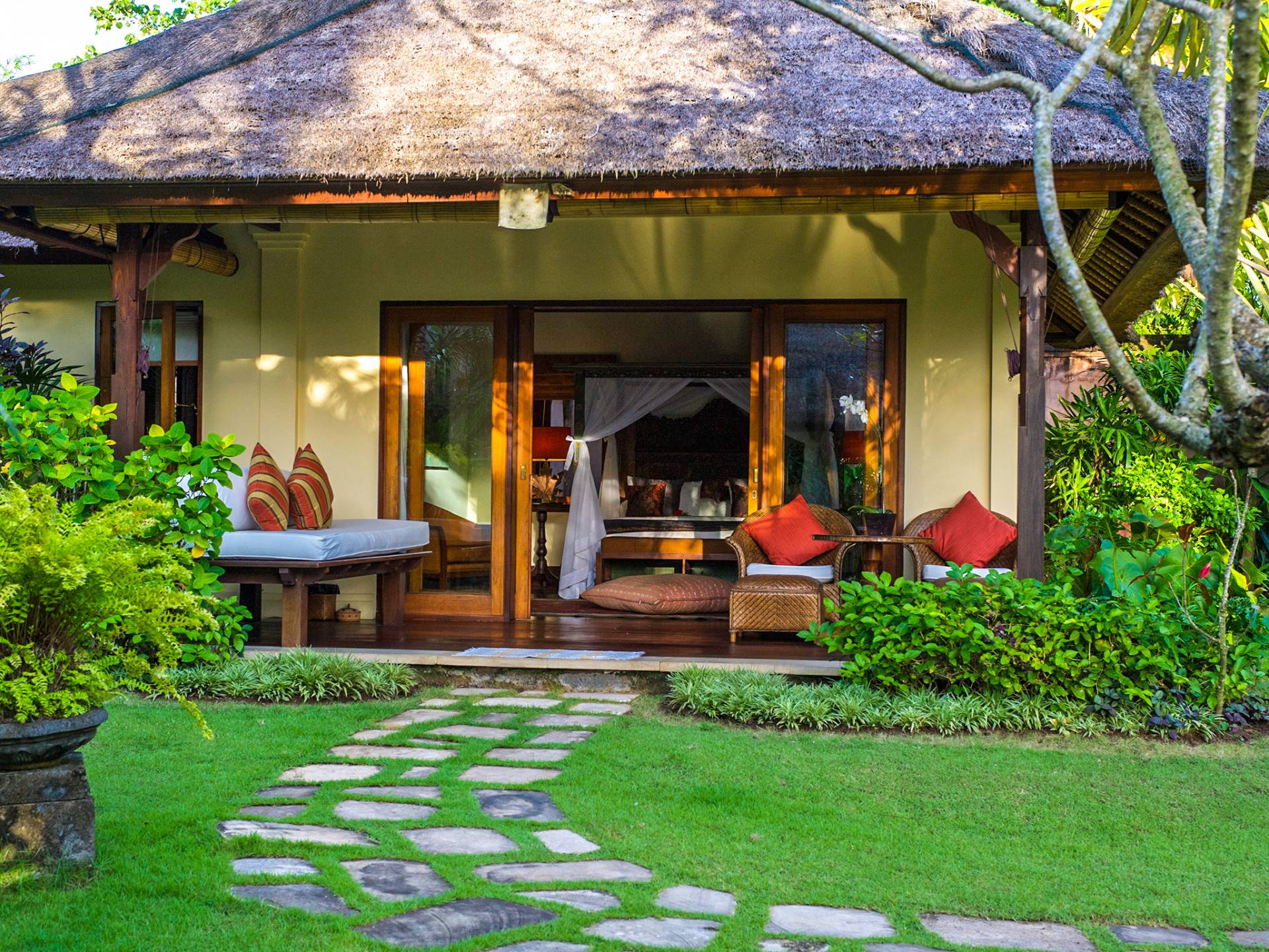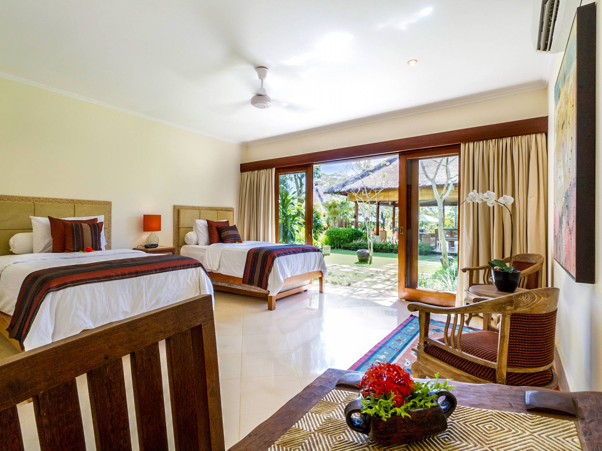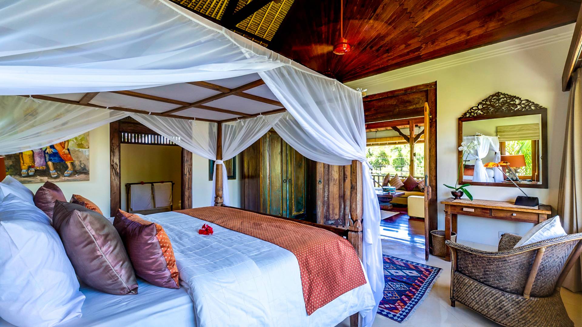La villa se encuentra en un camino estrecho que atraviesa un pequeño puente y disecciona los campos de arroz. Al lado de la villa, inmediatamente afuera de las puertas de entrada de madera, hay un campo de vacas pastando. Un agradable paseo de unos 20 minutos a través de comunidades agrícolas y campos de arroz le llevará a la playa más cercana, Batubelig. Ideal para surfear, esta playa de arena negra, como muchas a lo largo de la costa suroeste, tiene fuertes corrientes, por lo que no es recomendable para nadadores novatos. Para las aguas patrulladas por las olas y las comodidades junto a la playa más desarrolladas, diríjase hacia el sur hasta la playa de Legian, a siete kilómetros de distancia.