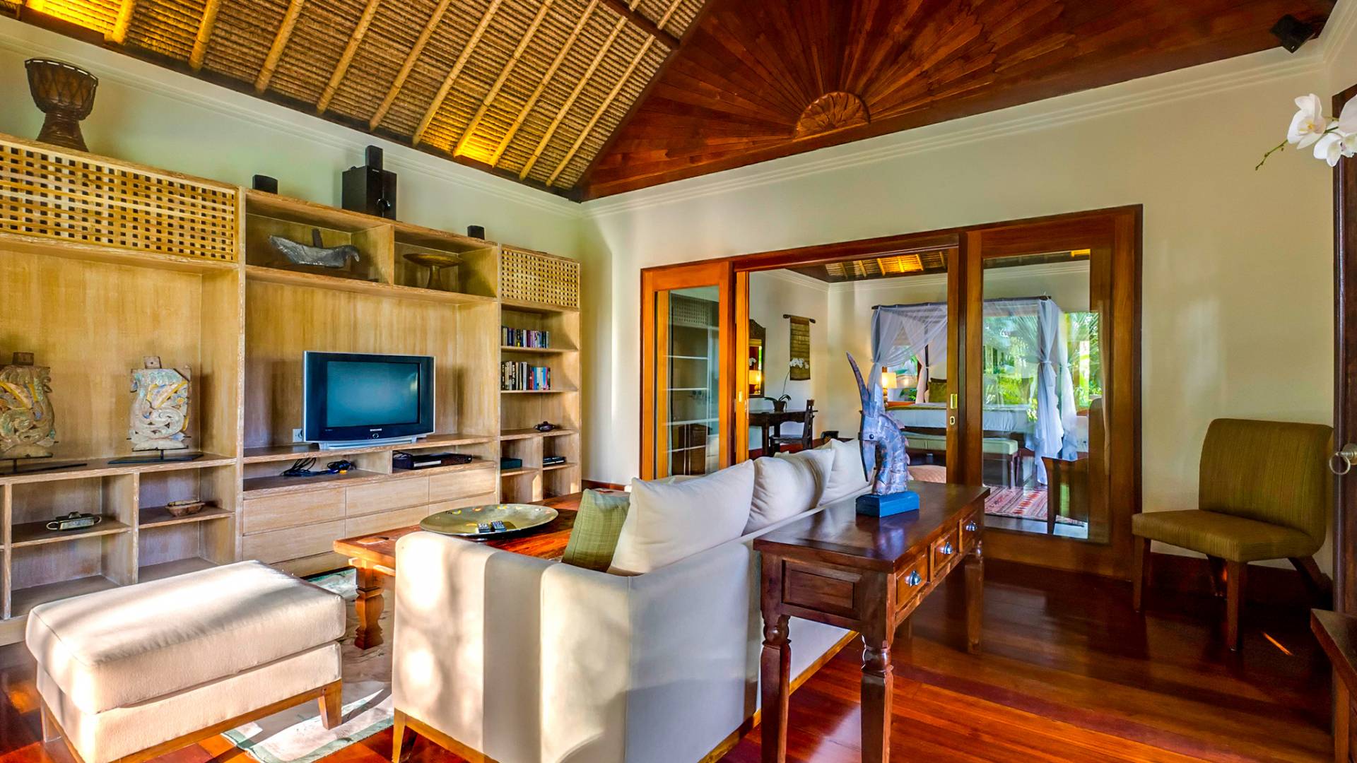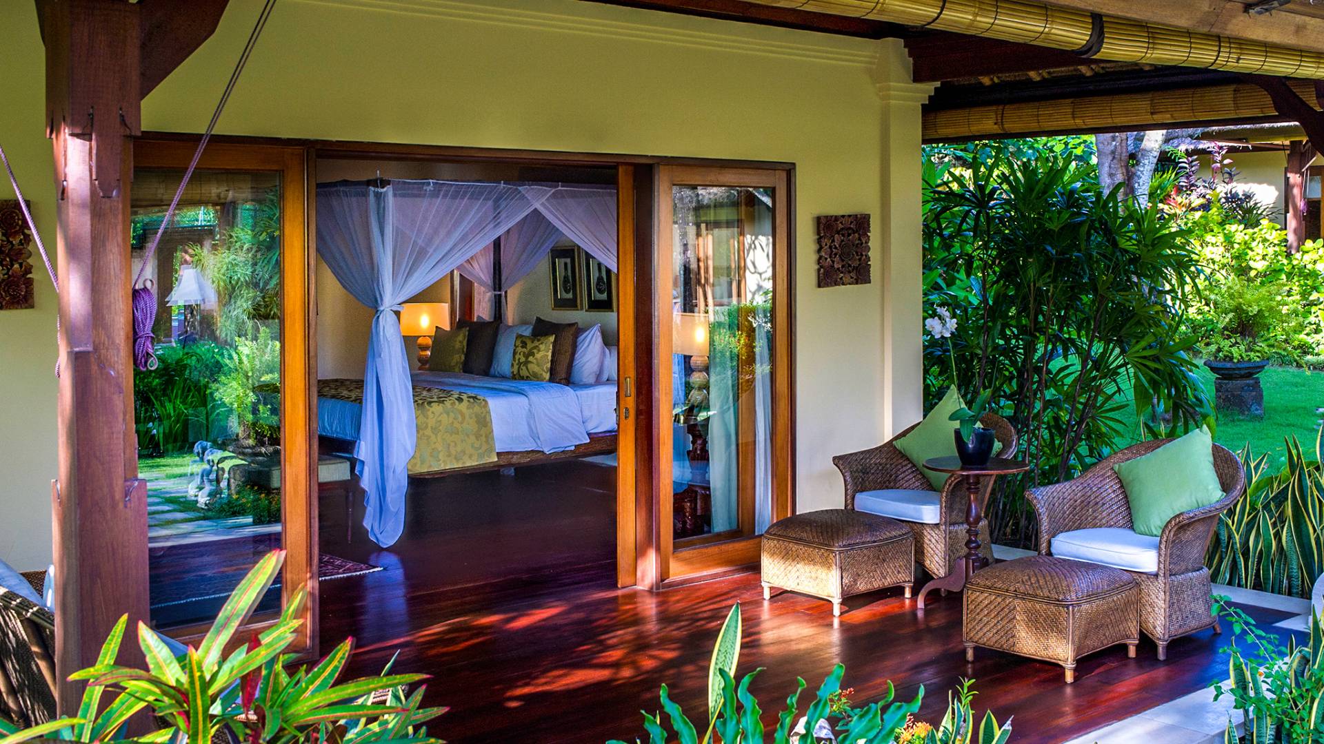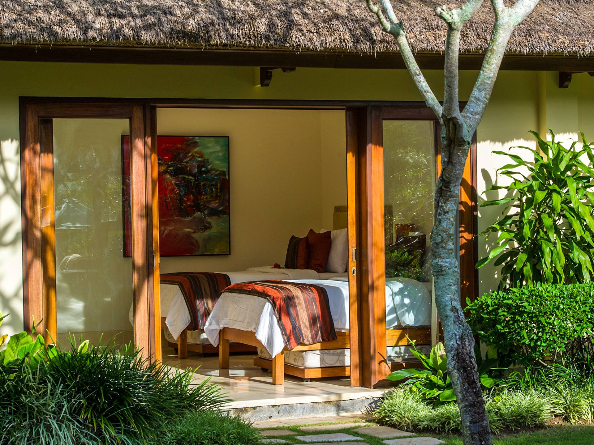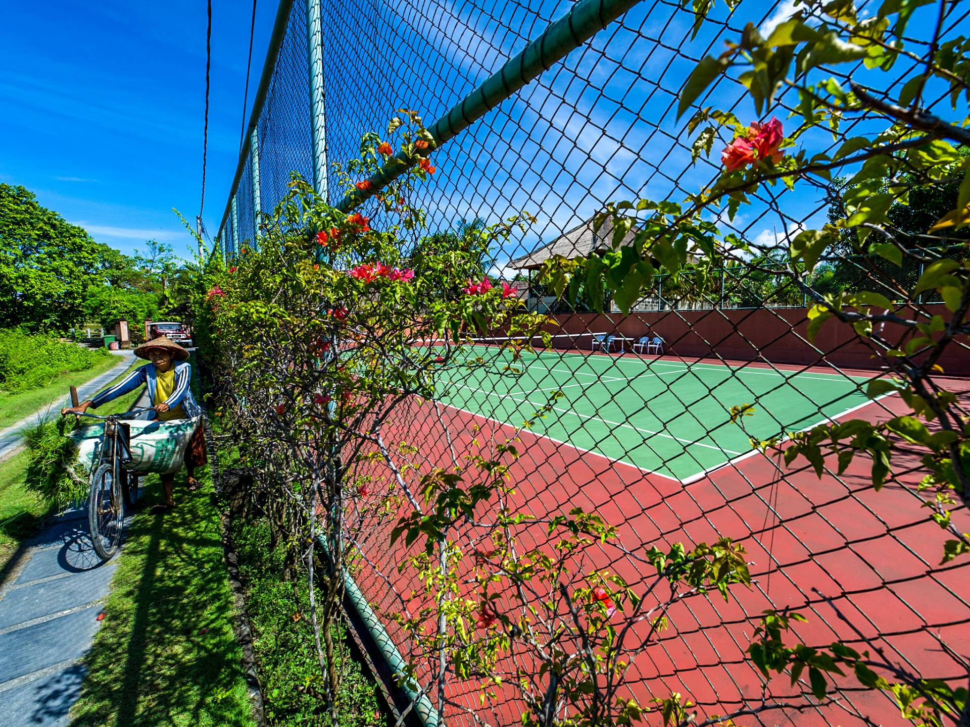 La villa se encuentra en un camino estrecho que atraviesa un pequeño puente y disecciona los campos de arroz. Al lado de la villa, inmediatamente afuera de las puertas de entrada de madera, hay un campo de vacas pastando. Un agradable paseo de unos 20 minutos a través de comunidades agrícolas y campos de arroz le llevará a la playa más cercana, Batubelig. Ideal para surfear, esta playa de arena negra, como muchas a lo largo de la costa suroeste, tiene fuertes corrientes, por lo que no es recomendable para nadadores novatos. Para las aguas patrulladas por las olas y las comodidades junto a la playa más desarrolladas, diríjase hacia el sur hasta la playa de Legian, a siete kilómetros de distancia.