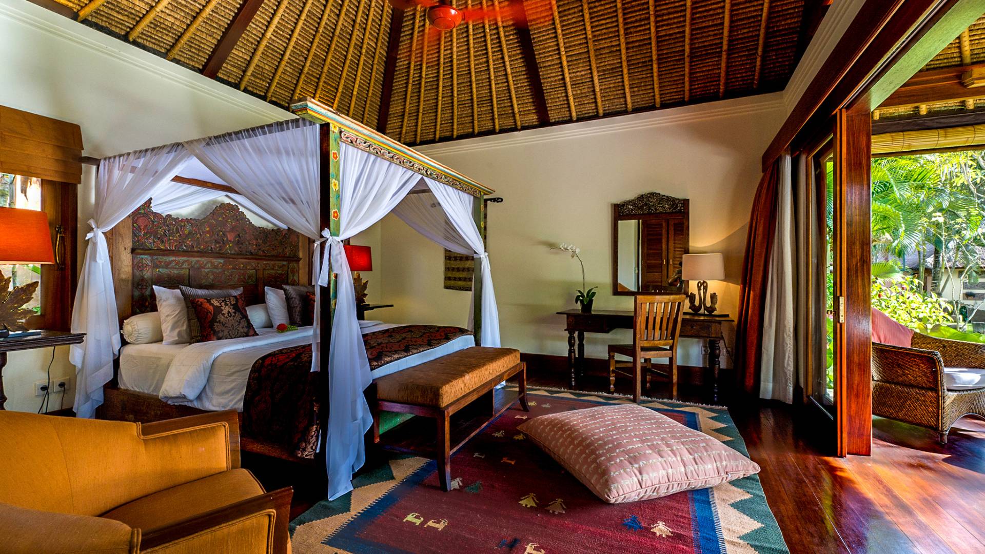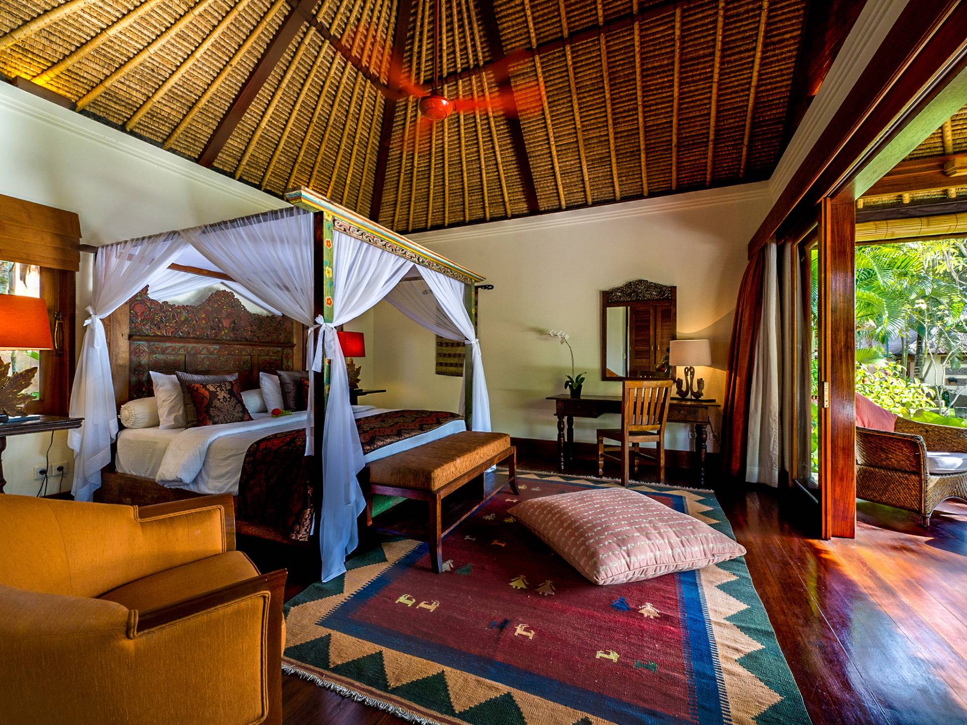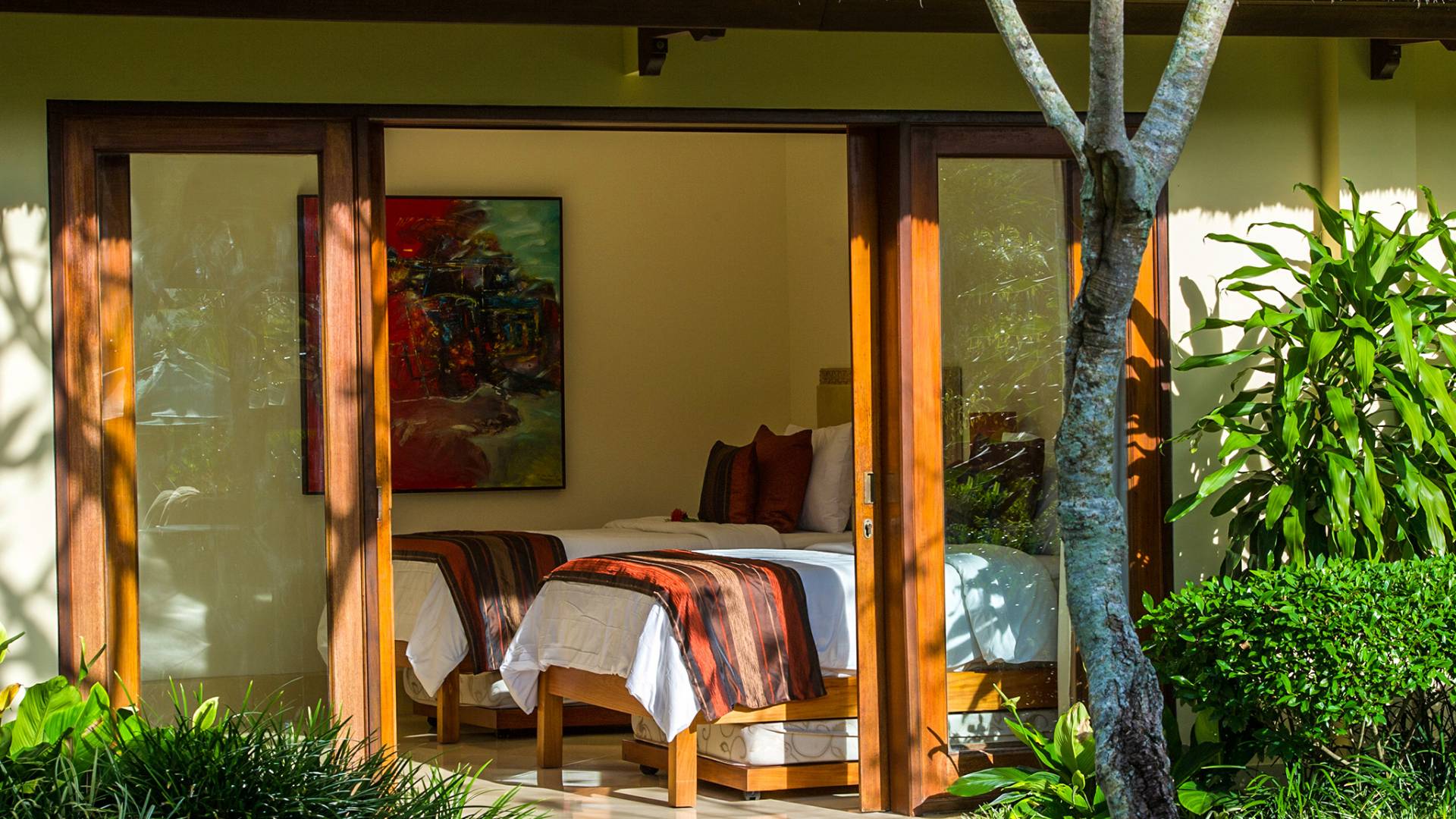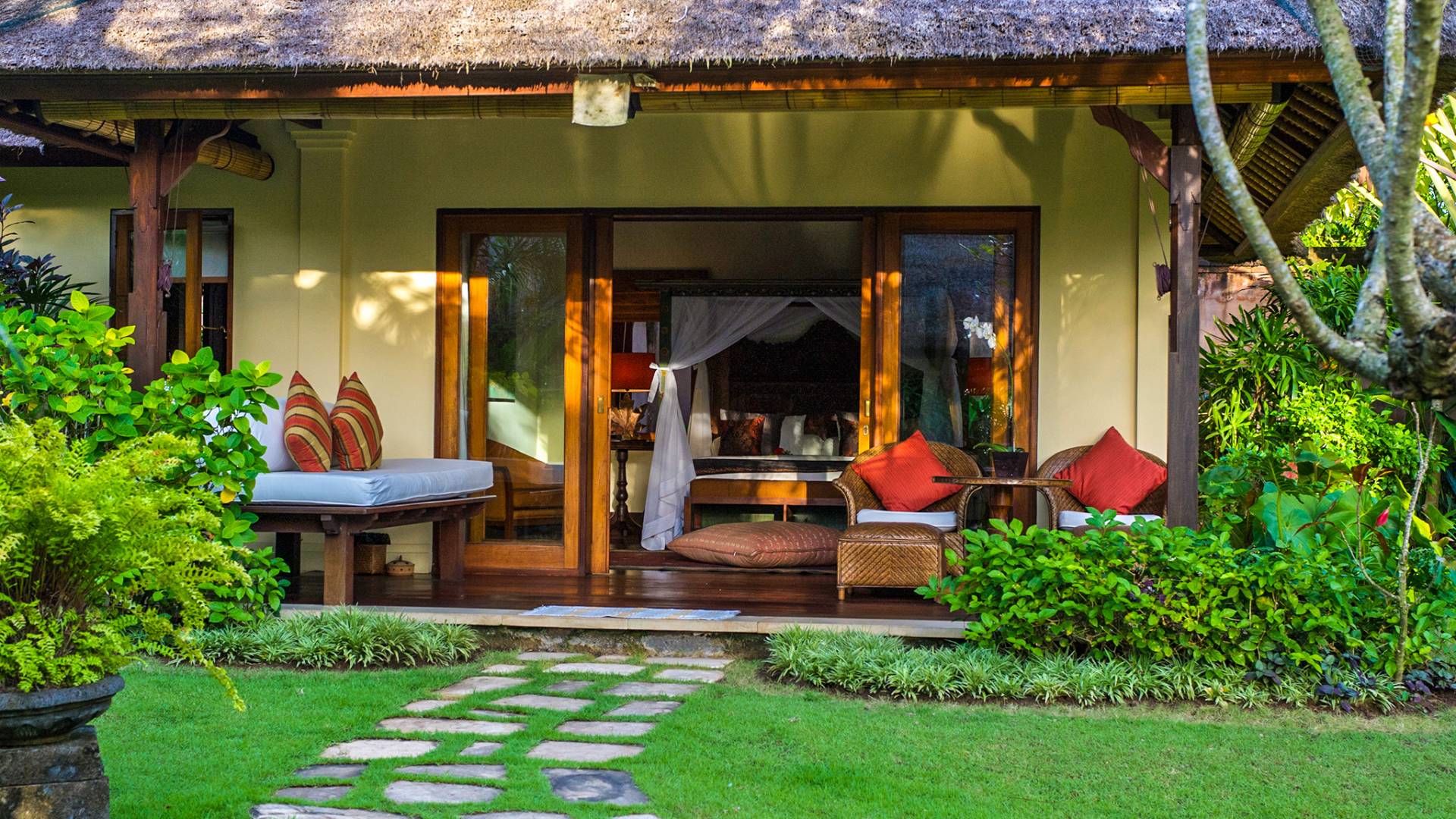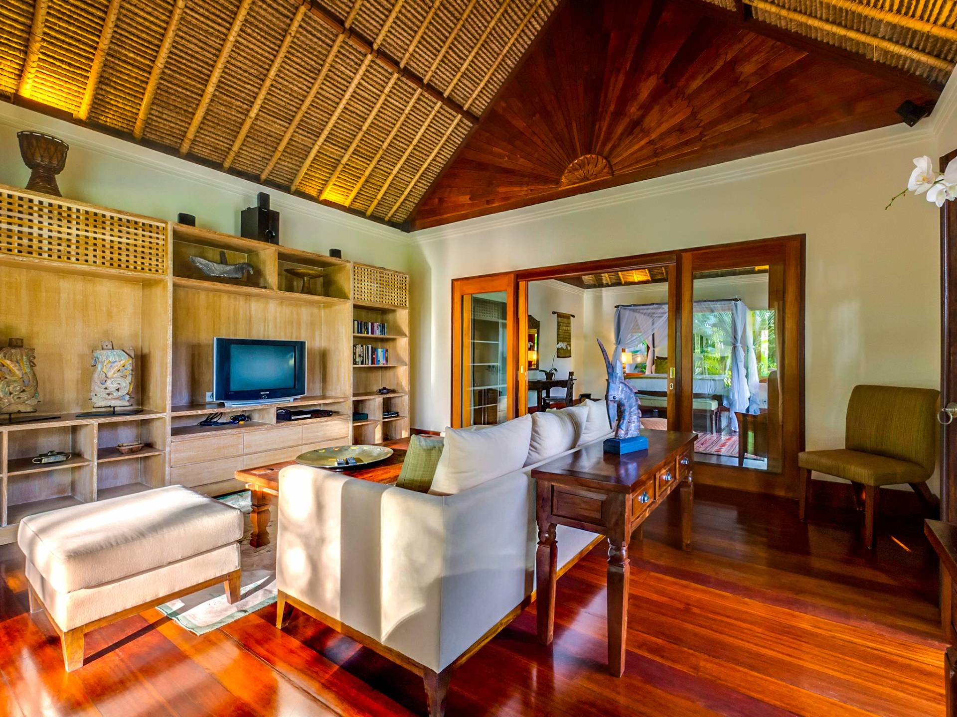 La villa se encuentra en un camino estrecho que atraviesa un pequeño puente y disecciona los campos de arroz. Al lado de la villa, inmediatamente afuera de las puertas de entrada de madera, hay un campo de vacas pastando. Un agradable paseo de unos 20 minutos a través de comunidades agrícolas y campos de arroz le llevará a la playa más cercana, Batubelig. Ideal para surfear, esta playa de arena negra, como muchas a lo largo de la costa suroeste, tiene fuertes corrientes, por lo que no es recomendable para nadadores novatos. Para las aguas patrulladas por las olas y las comodidades junto a la playa más desarrolladas, diríjase hacia el sur hasta la playa de Legian, a siete kilómetros de distancia.
