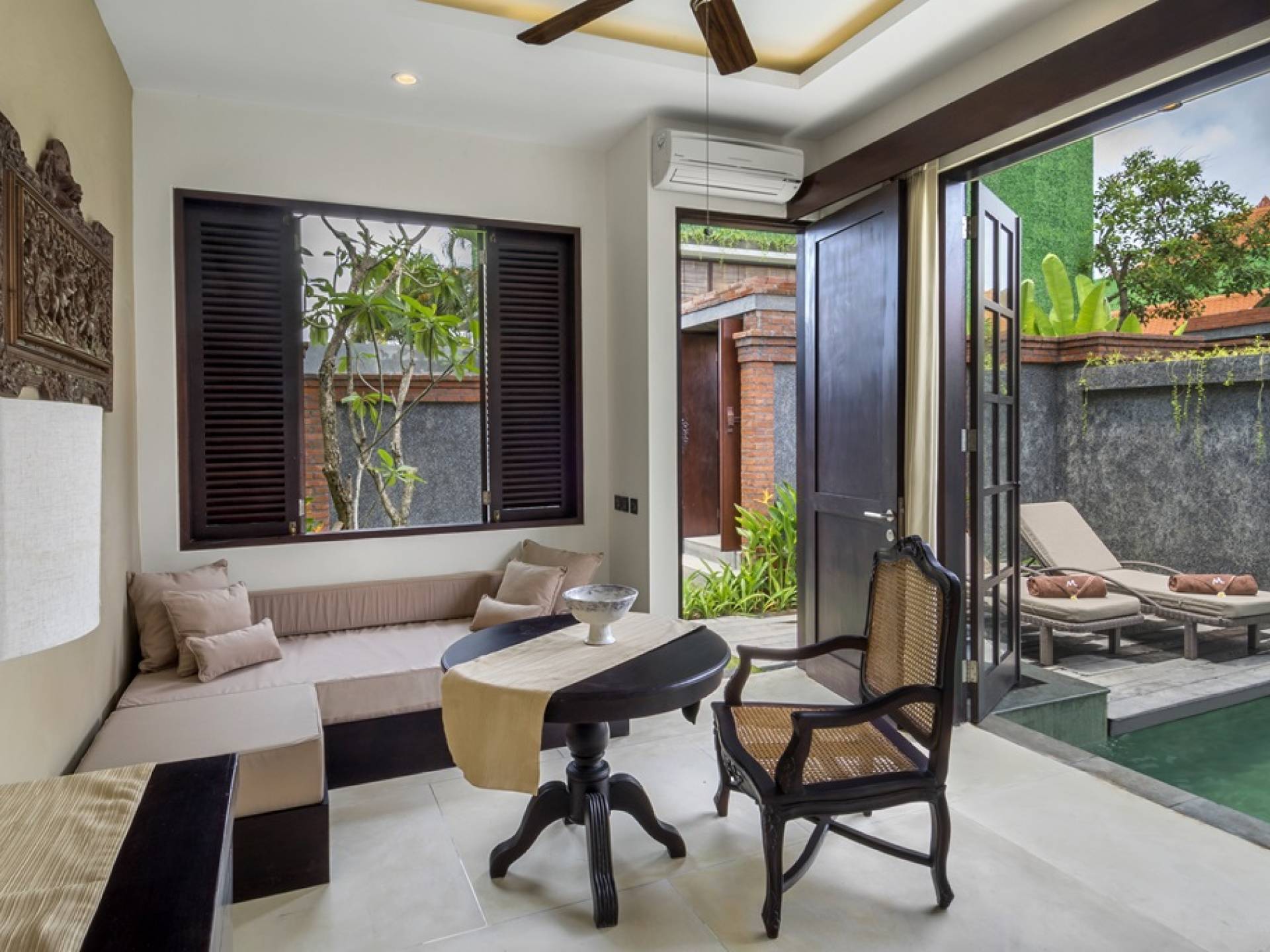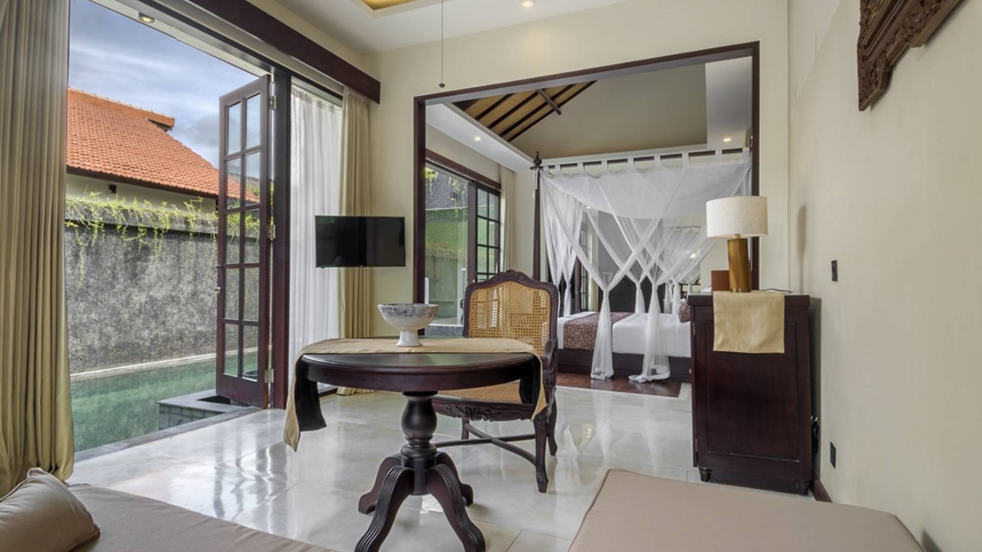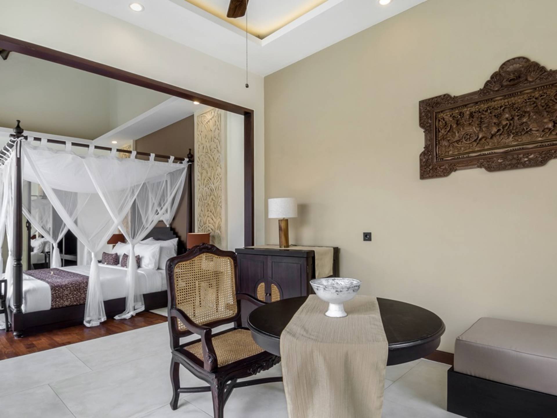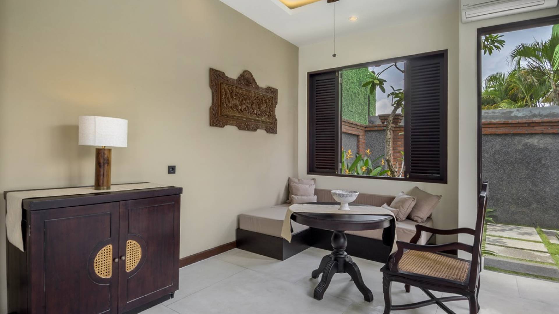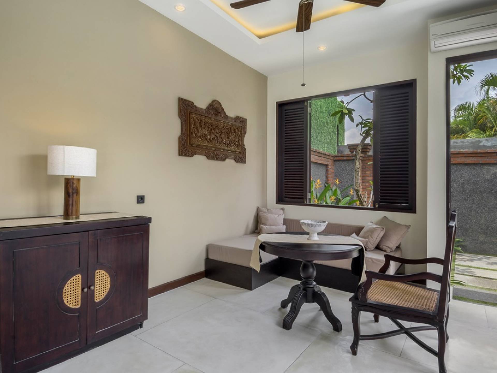 También puede deslizar para abrir las puertas de vidrio de cuerpo entero y sumergirse directamente en la piscina si lo desea, abrazando el estilo de vida tropical. La sala de estar está regida por hermosas maderas oscuras, luz solar natural y una obra de arte tallada en madera enmarcada en la pared. Hay un sofá en forma de L escondido en cojines de color moca donde puede sentirse cómodo leyendo un libro, disfrutando de la vista a la piscina o viendo su serie favorita en el televisor de pantalla plana montado en la pared. Hay una mesa de comedor circular de madera oscura y un cómodo sillón para sentarse y tomar un café por la mañana.