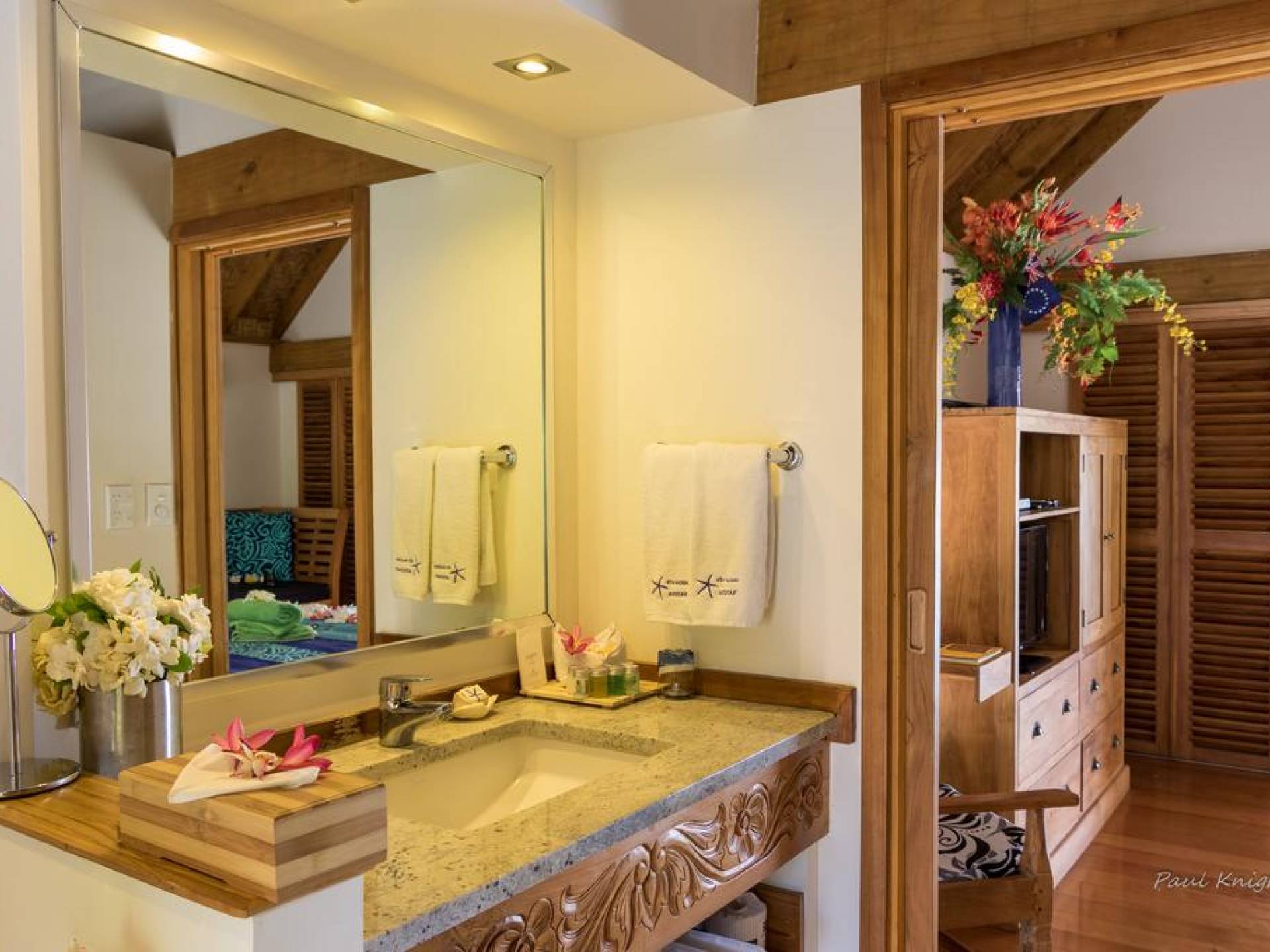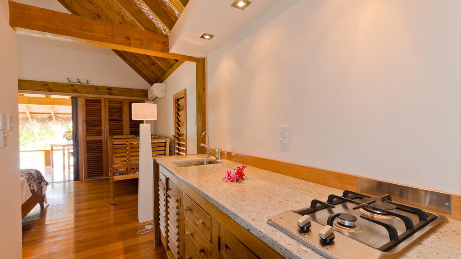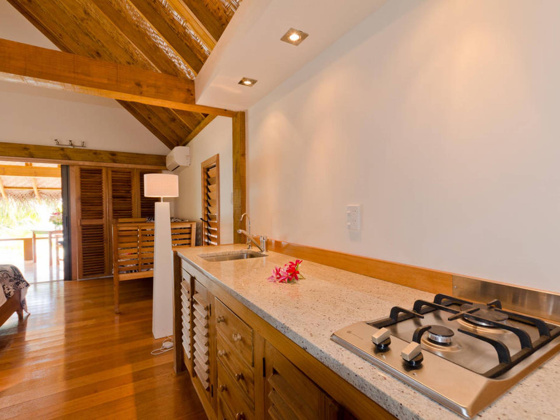 Hay una cocina completa con anafe y fregadero, nevera con congelador y agua potable filtrada. Para aquellos huéspedes que deseen un horno y / o microondas, estos están disponibles en el Pool Bar. El baño cuenta con ducha a ras de suelo con cabezal de ducha de efecto lluvia y modernos accesorios de cerámica. Fuera de la parte trasera del baño, hay un patio amurallado que tiene una cómoda ducha al aire libre para complementar la ducha interna. Hay muchas pequeñas características reflexivas sobre Etu Moana y una de ellas es la provisión de un tendedero al aire libre y perchas en el patio, que es ideal para secar durante la noche la ropa lavada / bañadores y toallas de playa.