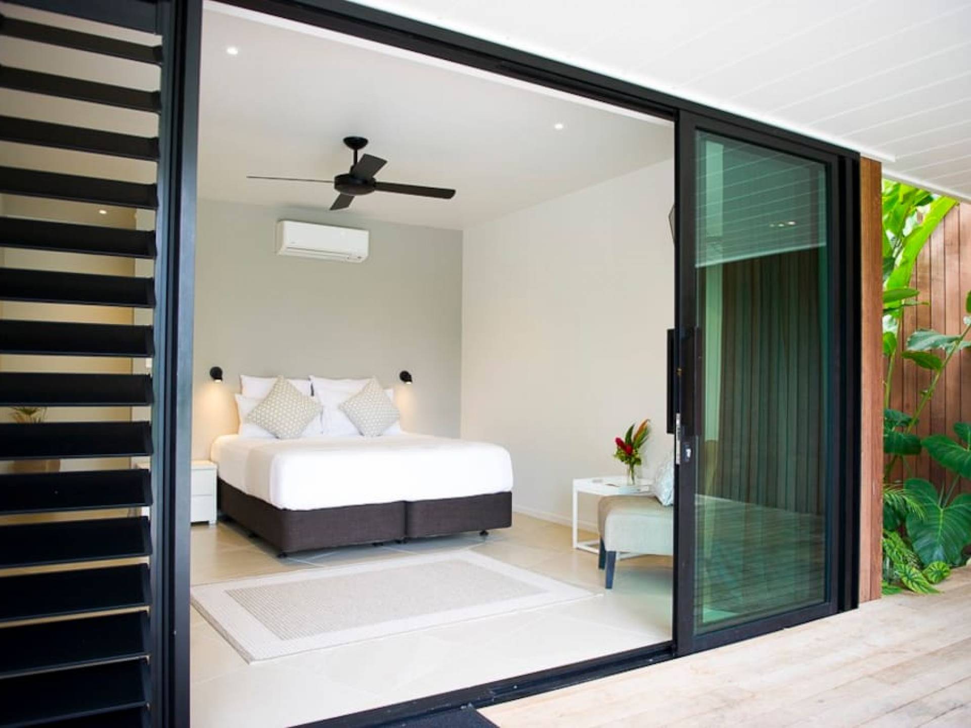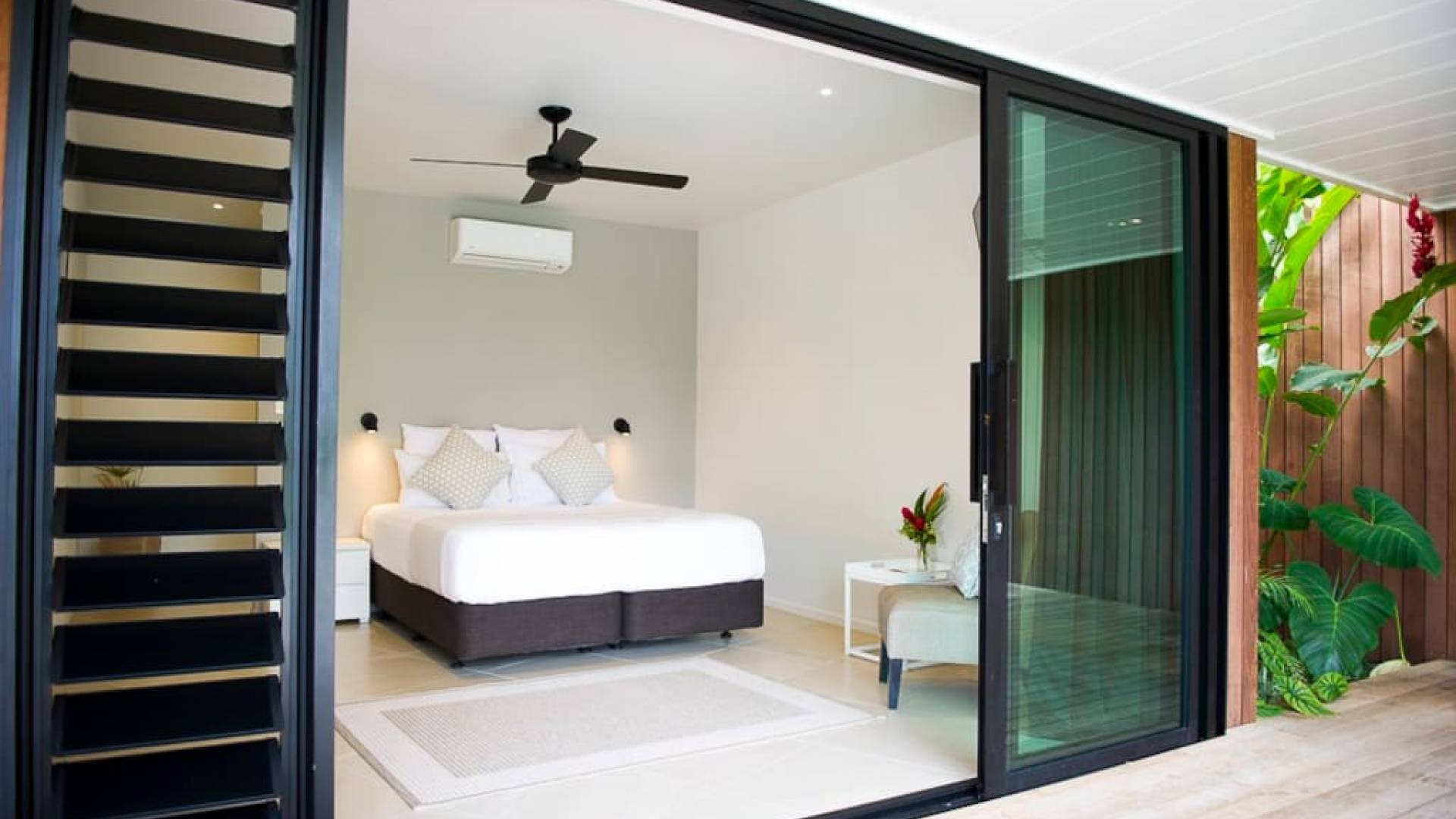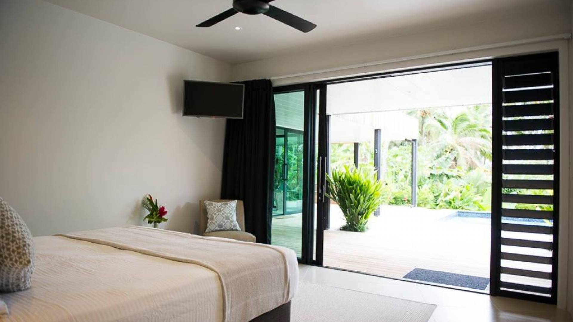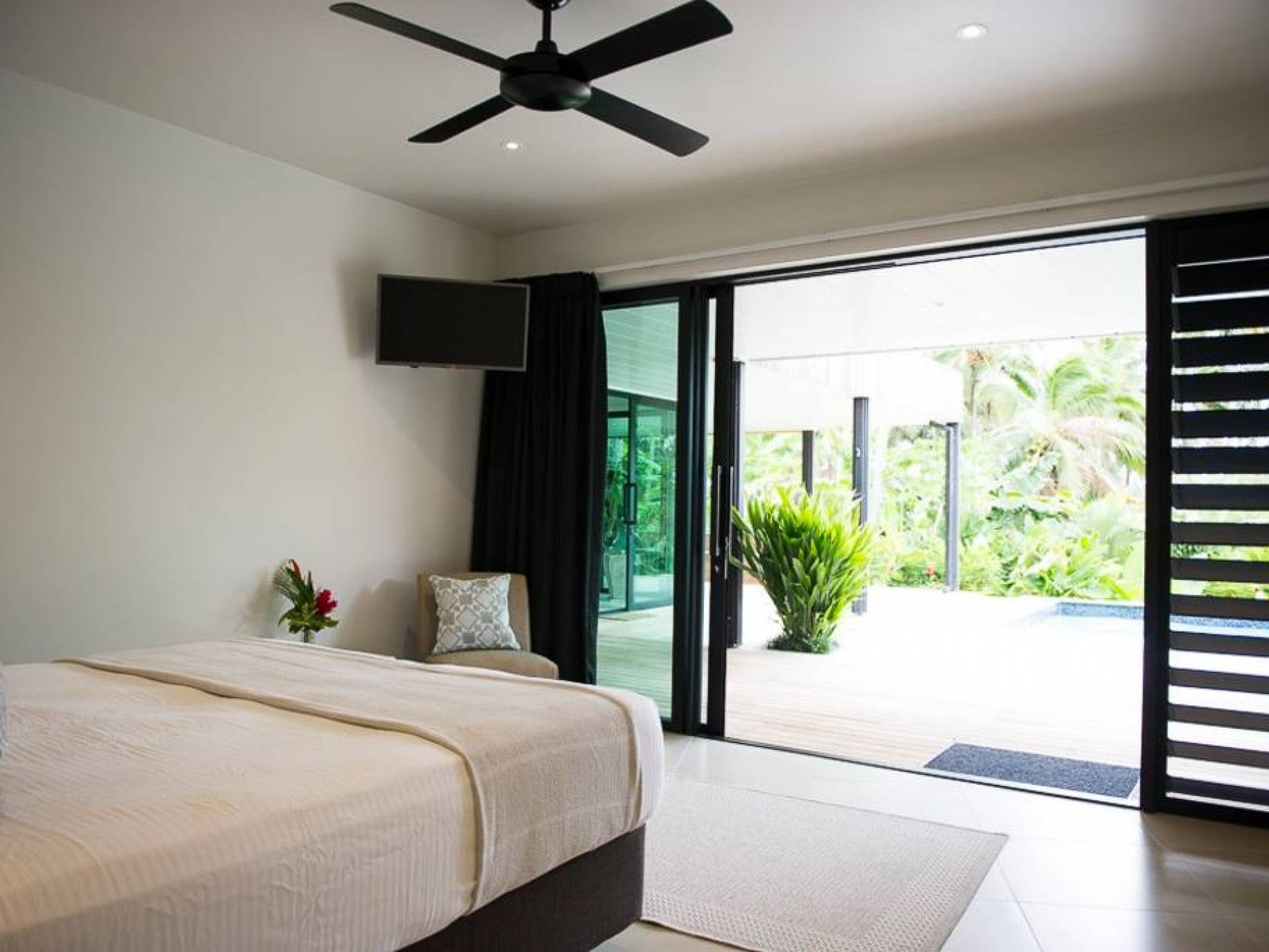 Hay 3 habitaciones bien equipadas con aire acondicionado, todas con acceso privado al patio que linda con la piscina y el jardín, lo que permite que cada pareja entre y salga cuando quiera sin entrar en la sala principal de la villa. . Cada habitación tiene una cama king-size, TV, vestidor y amplios cuartos de baño completos con ducha tipo lluvia.