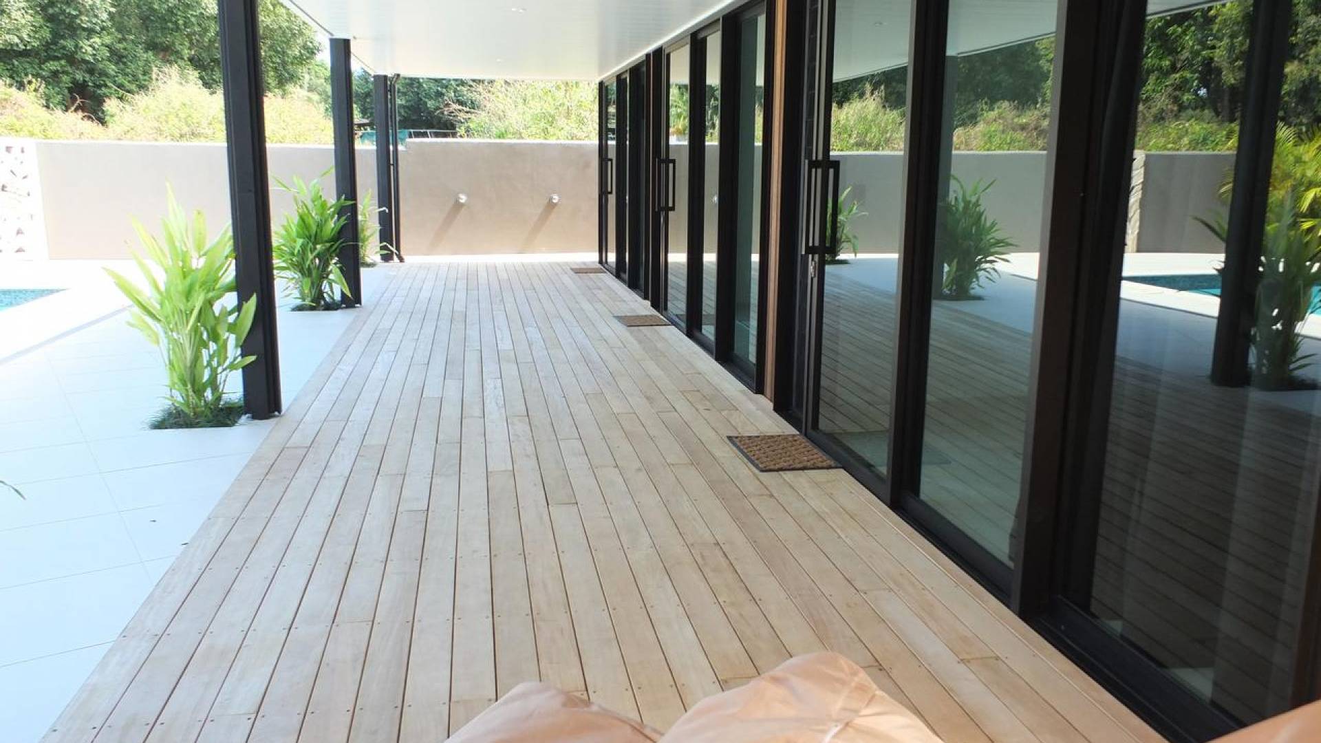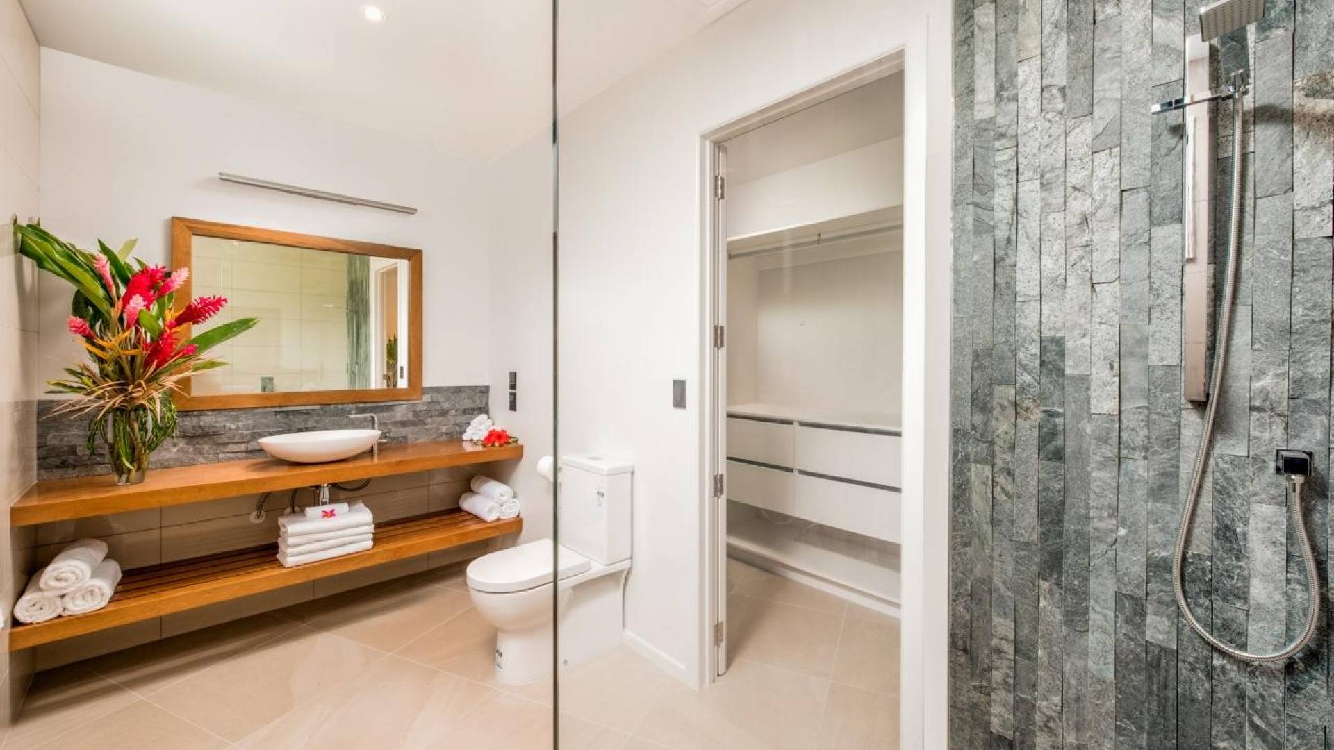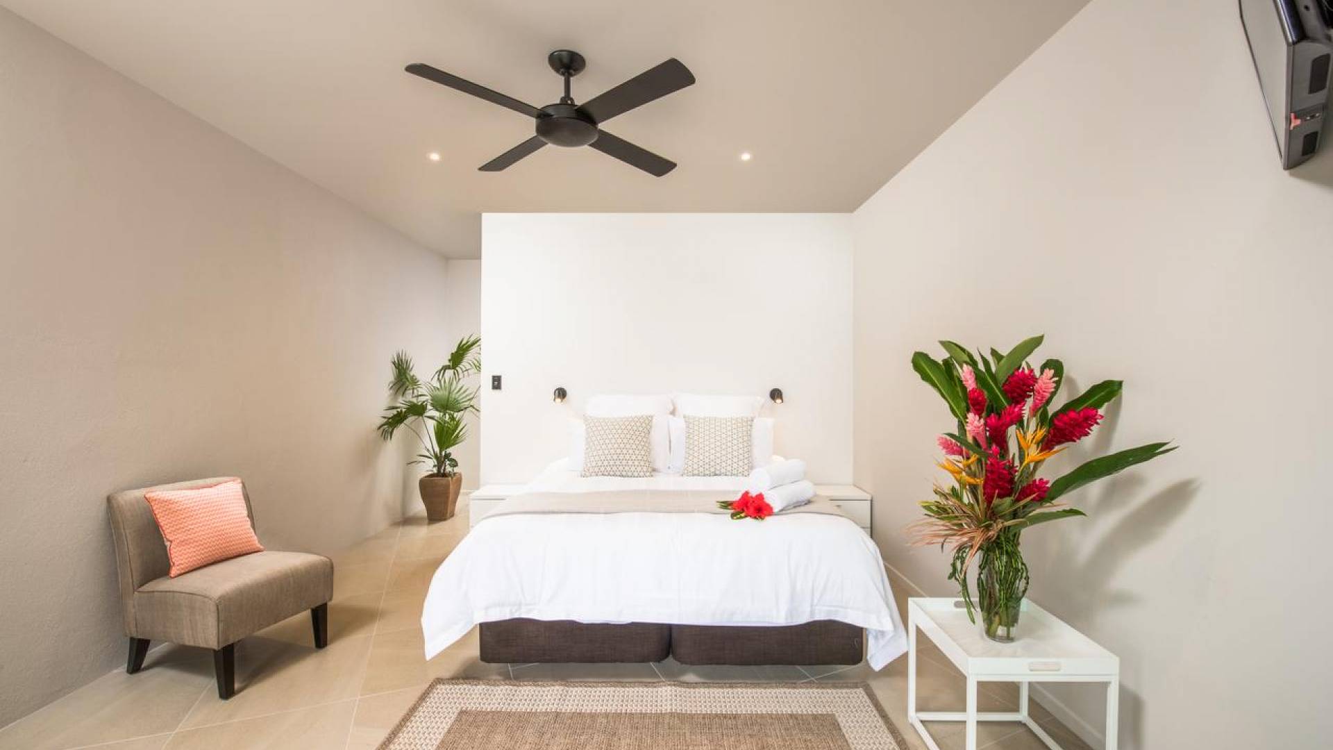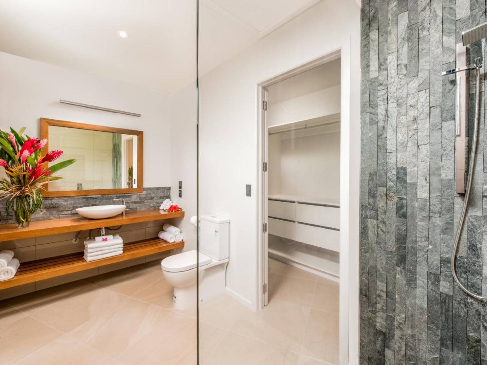 Hay 3 habitaciones bien equipadas con aire acondicionado, todas con acceso privado al patio que linda con la piscina y el jardín, lo que permite que cada pareja entre y salga cuando quiera sin entrar en la sala principal de la villa. . Cada habitación tiene una cama king-size, TV, vestidor y amplios cuartos de baño completos con ducha tipo lluvia.