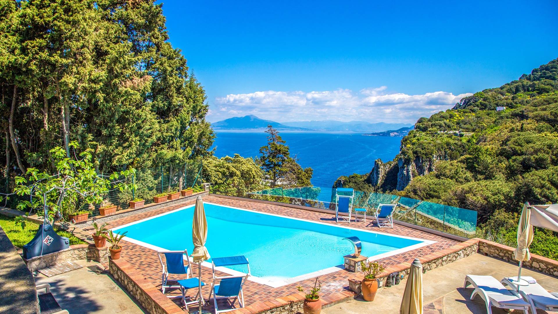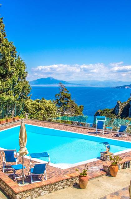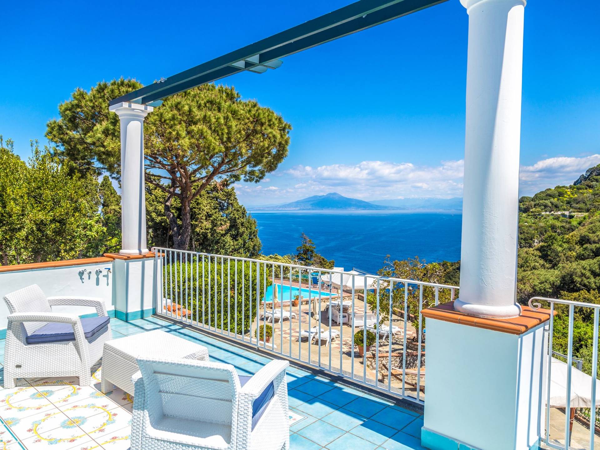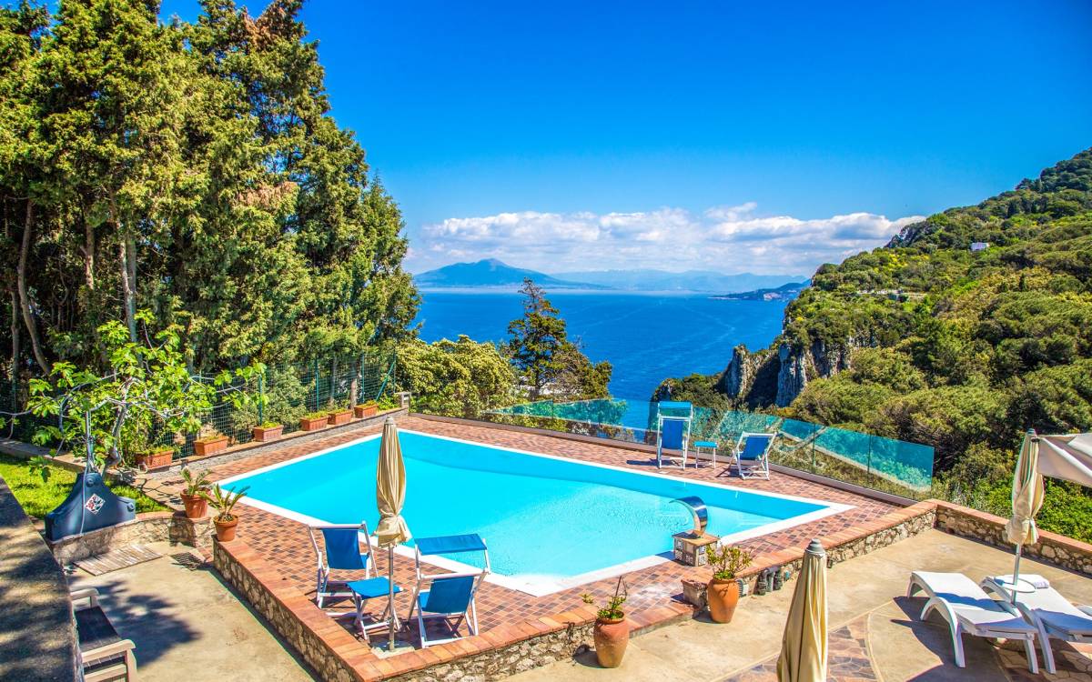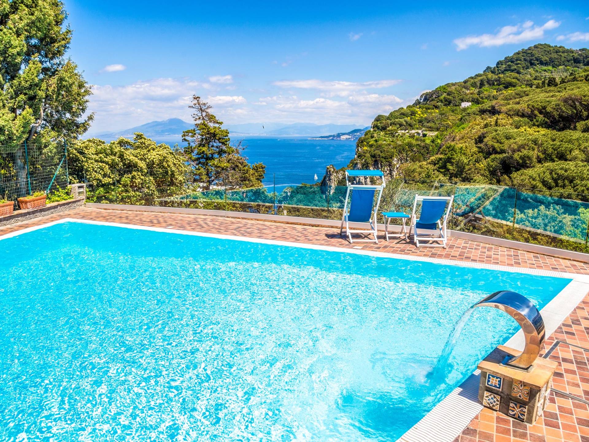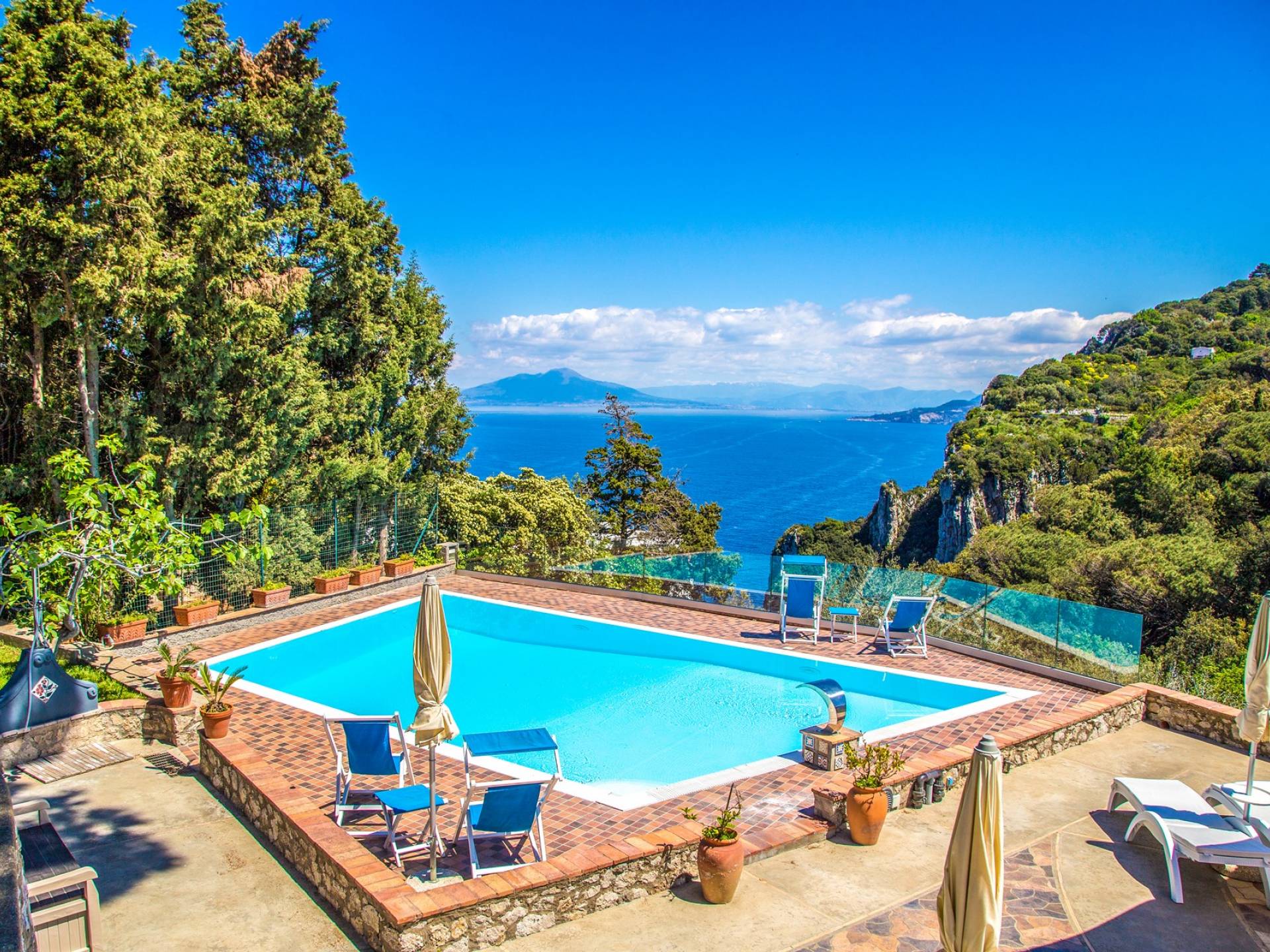 En una terraza de terracota, hay una piscina exterior desde donde se pueden divisar el Vesubio y el Golfo de Nápoles, un solárium y un jacuzzi exterior de 4 plazas. Escondida, pero muy cerca del centro de la ciudad, esta finca ofrece cinco habitaciones decoradas con un estilo elegante con paredes, telas contemporáneas y varios muebles a medida de artesanos italianos locales. La propiedad incluye 2.500 metros cuadrados de jardines privados. El interior de la propiedad mide 400 metros cuadrados y tiene capacidad para un total de 10 adultos y 4 amigos o empleados adicionales en sofás cama. Se usa mejor para 10 personas, en total. El diseño de la vivienda, abordado con la investigación en el contexto histórico, da como resultado un estilo clásico con baldosas cerámicas. Residencia de finales del siglo XIX en estilo mediterráneo clásico recientemente restaurada, la villa ha conservado su característica arquitectura caprese agregando las comodidades que ofrece la tecnología moderna, como la piscina infinita con vista al mar, la sauna y el jacuzzi, así como una colección de arte. y libros de ficción. Moderno pero muy cómodo, este es un refugio contemporáneo lleno de luz y un ambiente acogedor.