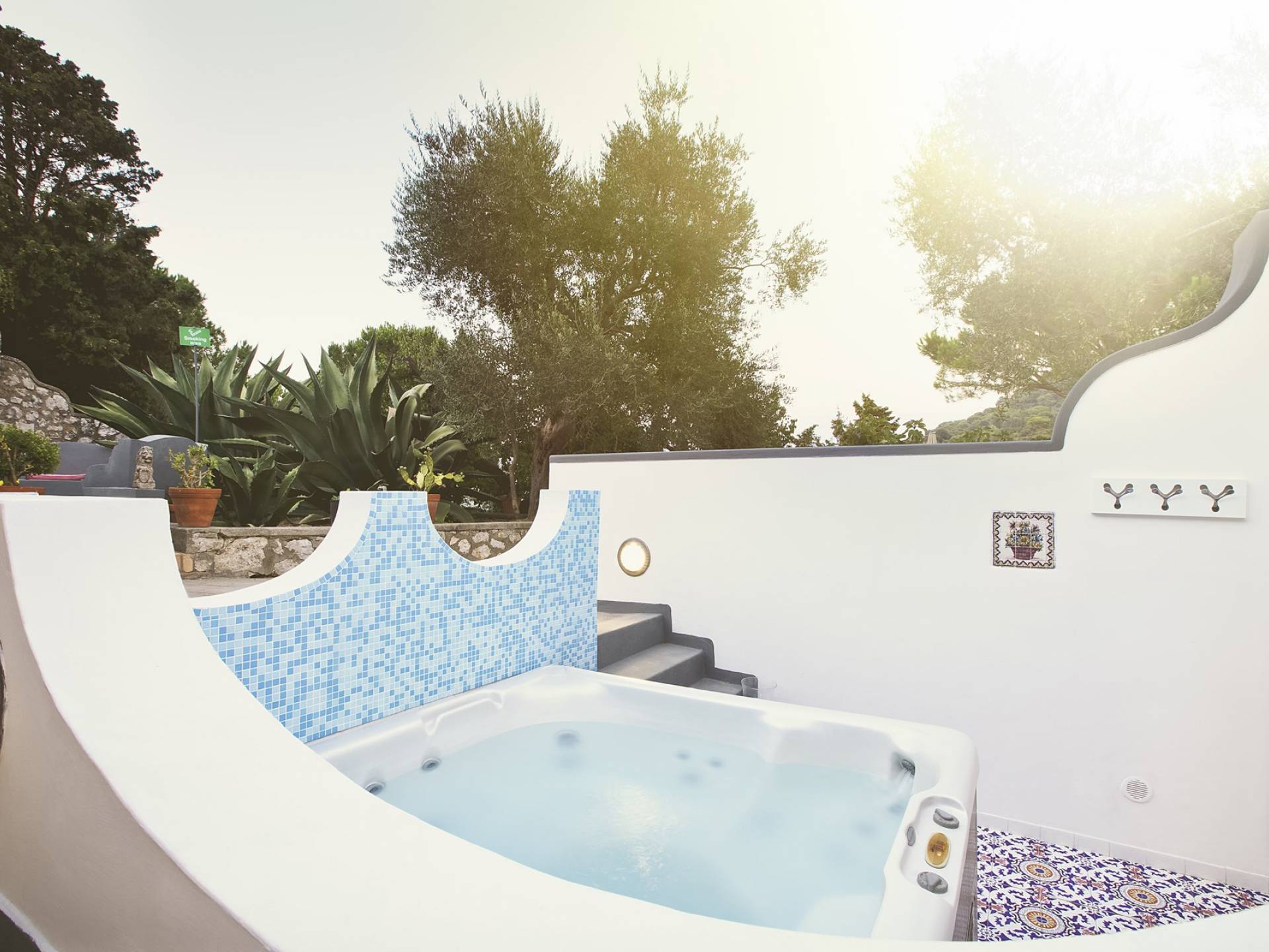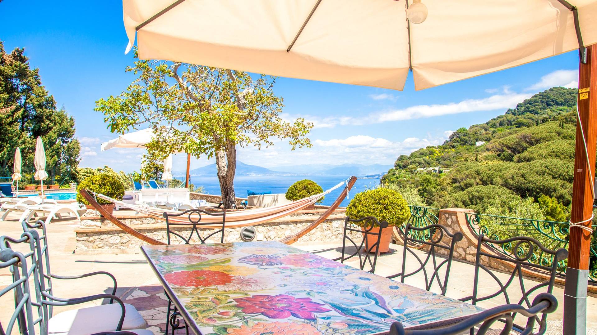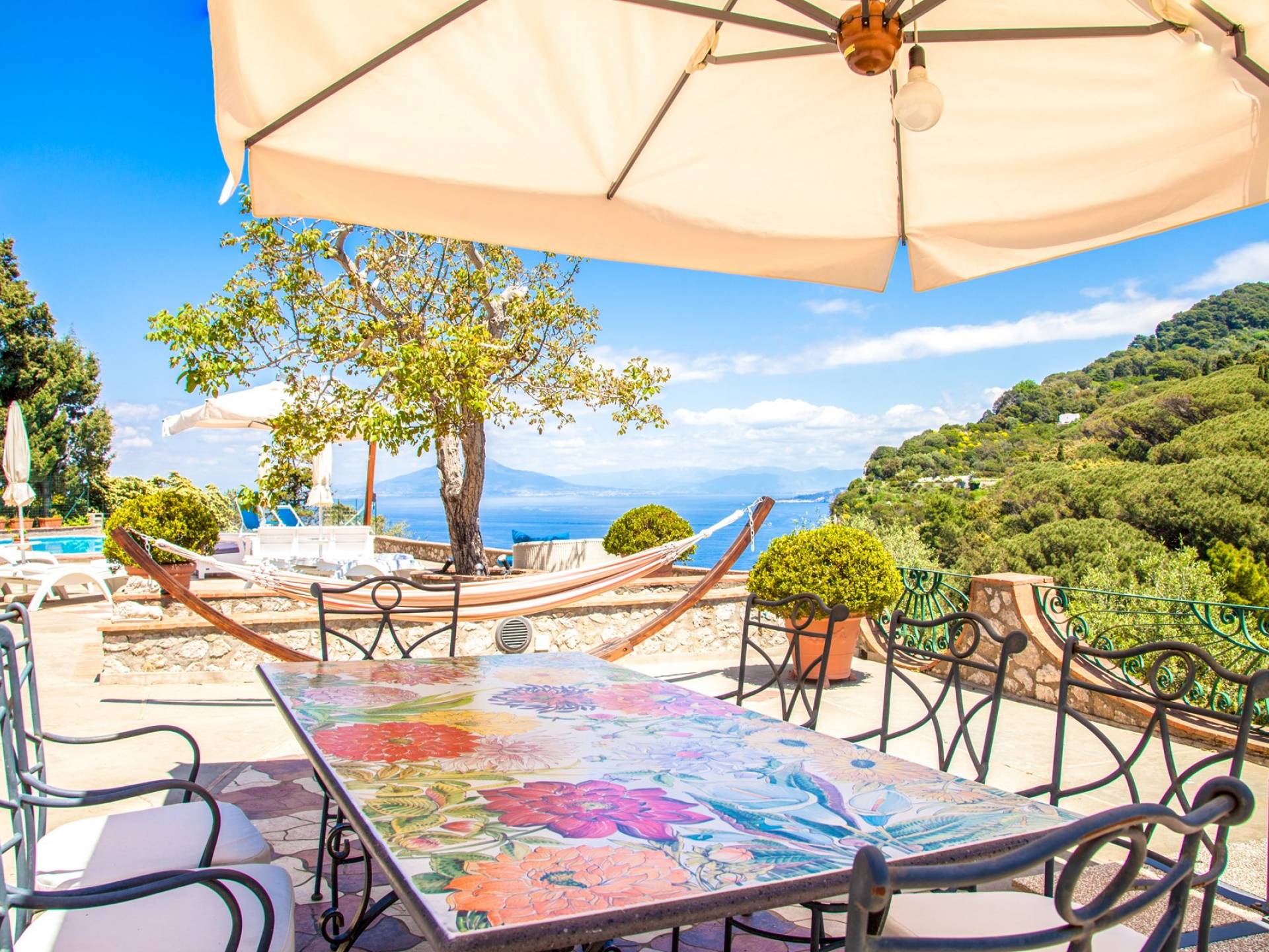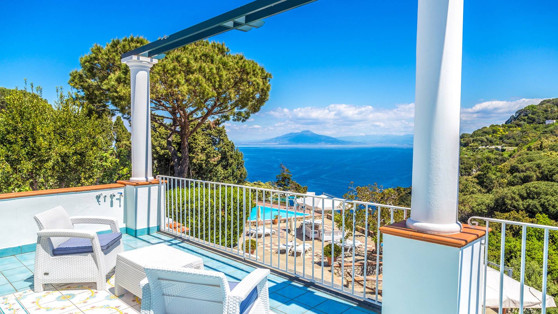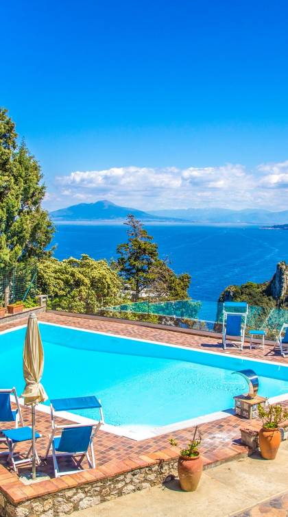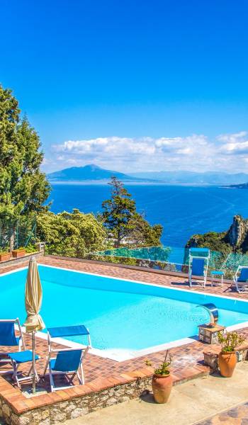En una terraza de terracota, hay una piscina exterior desde donde se pueden divisar el Vesubio y el Golfo de Nápoles, un solárium y un jacuzzi exterior de 4 plazas. Escondida, pero muy cerca del centro de la ciudad, esta finca ofrece cinco habitaciones decoradas con un estilo elegante con paredes, telas contemporáneas y varios muebles a medida de artesanos italianos locales. La propiedad incluye 2.500 metros cuadrados de jardines privados. El interior de la propiedad mide 400 metros cuadrados y tiene capacidad para un total de 10 adultos y 4 amigos o empleados adicionales en sofás cama. Se usa mejor para 10 personas, en total. El diseño de la vivienda, abordado con la investigación en el contexto histórico, da como resultado un estilo clásico con baldosas cerámicas. Residencia de finales del siglo XIX en estilo mediterráneo clásico recientemente restaurada, la villa ha conservado su característica arquitectura caprese agregando las comodidades que ofrece la tecnología moderna, como la piscina infinita con vista al mar, la sauna y el jacuzzi, así como una colección de arte. y libros de ficción. Moderno pero muy cómodo, este es un refugio contemporáneo lleno de luz y un ambiente acogedor.