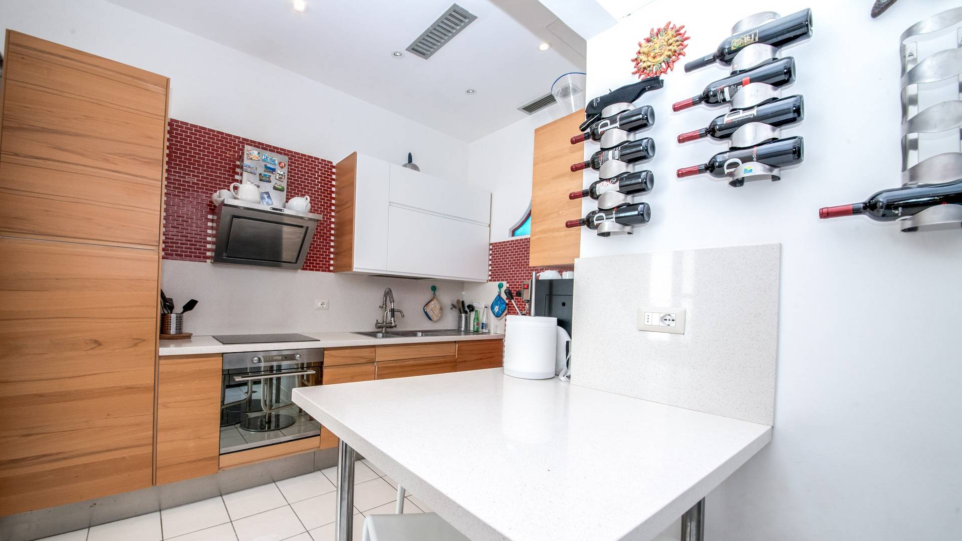 Los interiores incluyen una amplia sala de estar, un comedor con maravillosas vistas al mar, una sauna finlandesa con ducha y una cocina. La cocina bien equipada cuenta con quemadores de inducción, un horno de microondas, una cafetera expreso, dos refrigeradores grandes, uno con una máquina de hielo integrada. La cocina dispone de una mesita que sirve para preparaciones o aperitivos, además de participar en cocinas a medida. También está disponible un pequeño lavavajillas para vasos.
