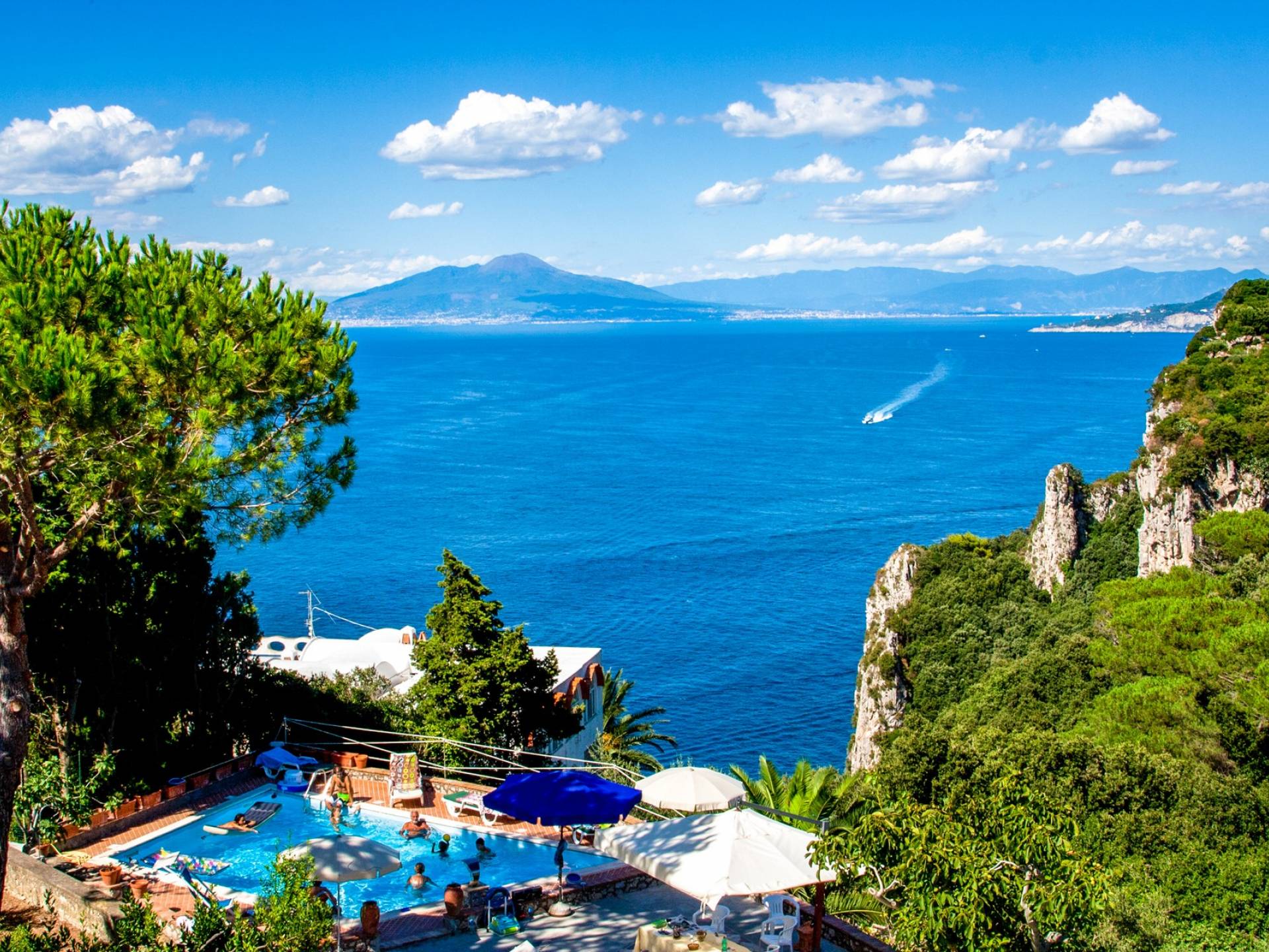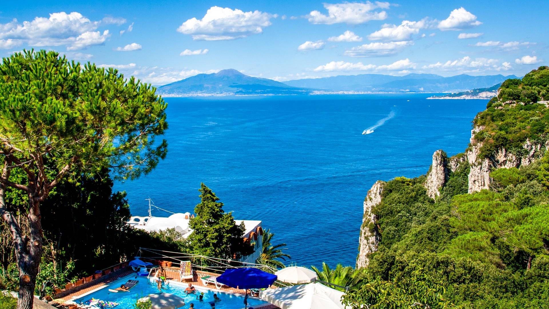 La isla de Capri se encuentra frente a la península de Sorrentina, en el lado sur del golfo de Nápoles en la región de Campania en Italia. Ha sido un balneario favorito desde la época de la República Romana. Capri es uno de los lugares más glamorosos y cosmopolitas de Europa con hermosos puntos de referencia como el Belvedere de Tragara, un alto paseo panorámico bordeado de villas, los riscos de piedra caliza llamados pilas de mar que se proyectan sobre el mar, a saber, los Faraglioni, la pintoresca ciudad de Anacapri, la famosa Gruta Azul y las ruinas de las villas romanas imperiales.