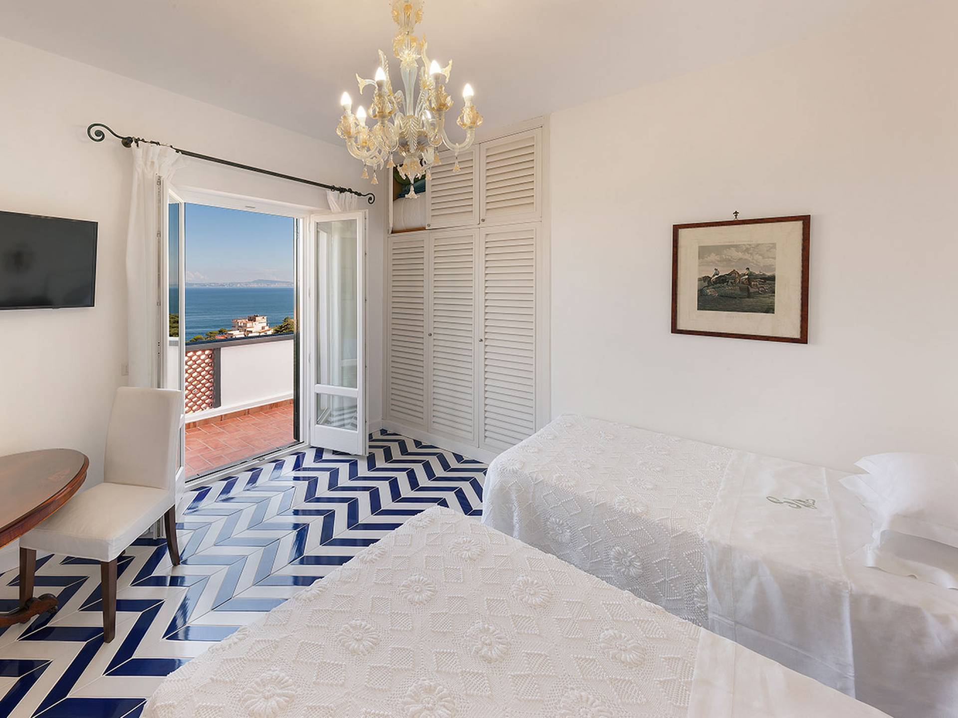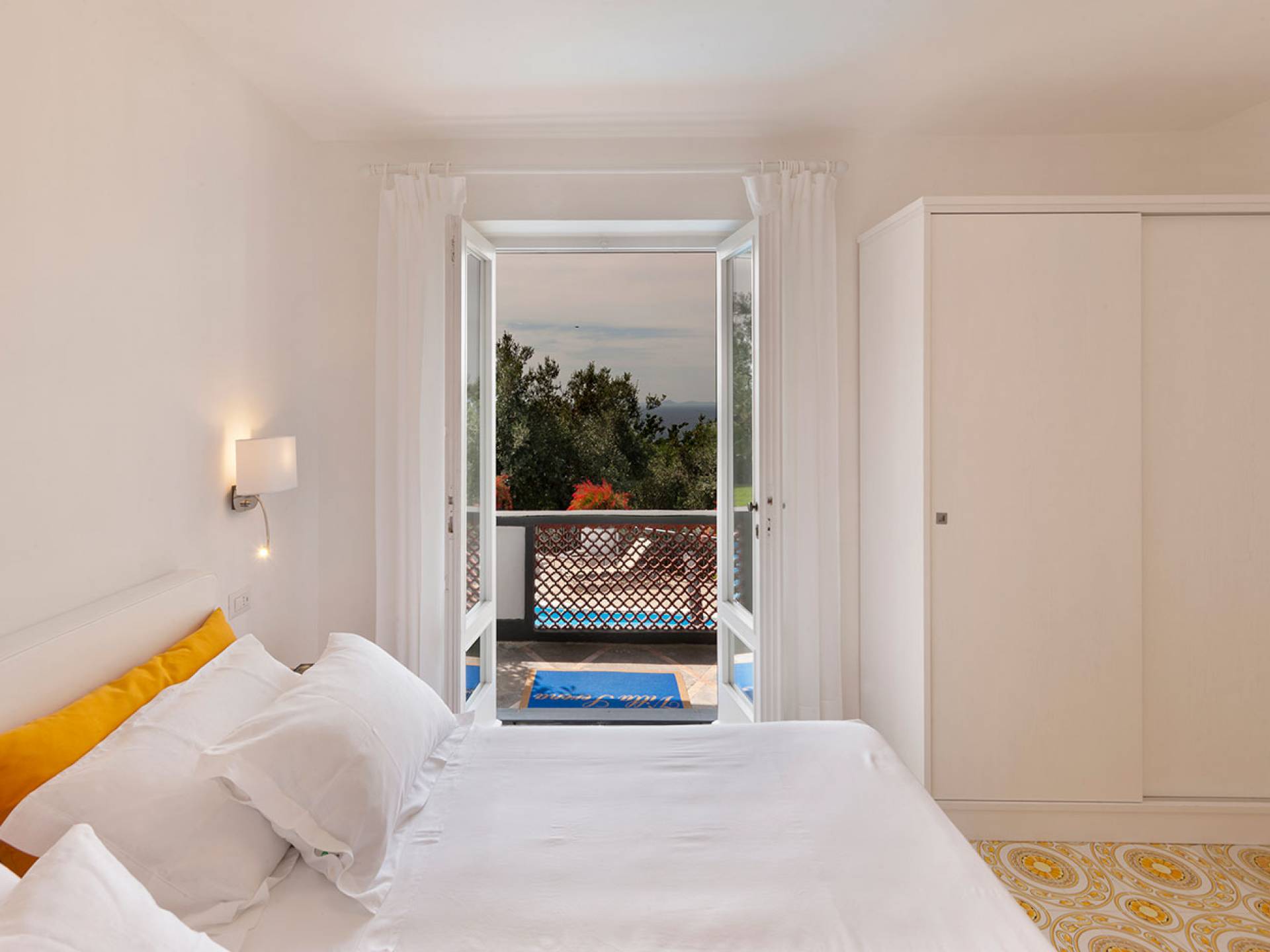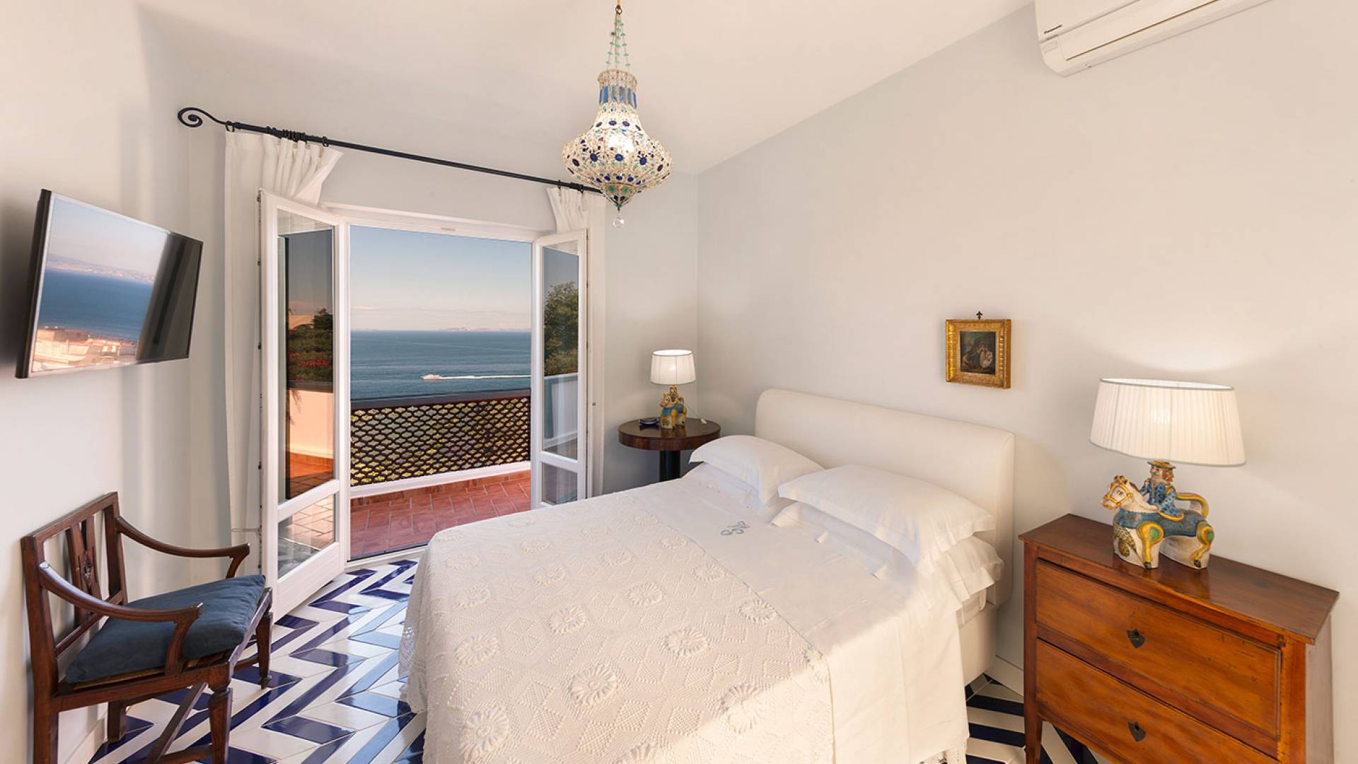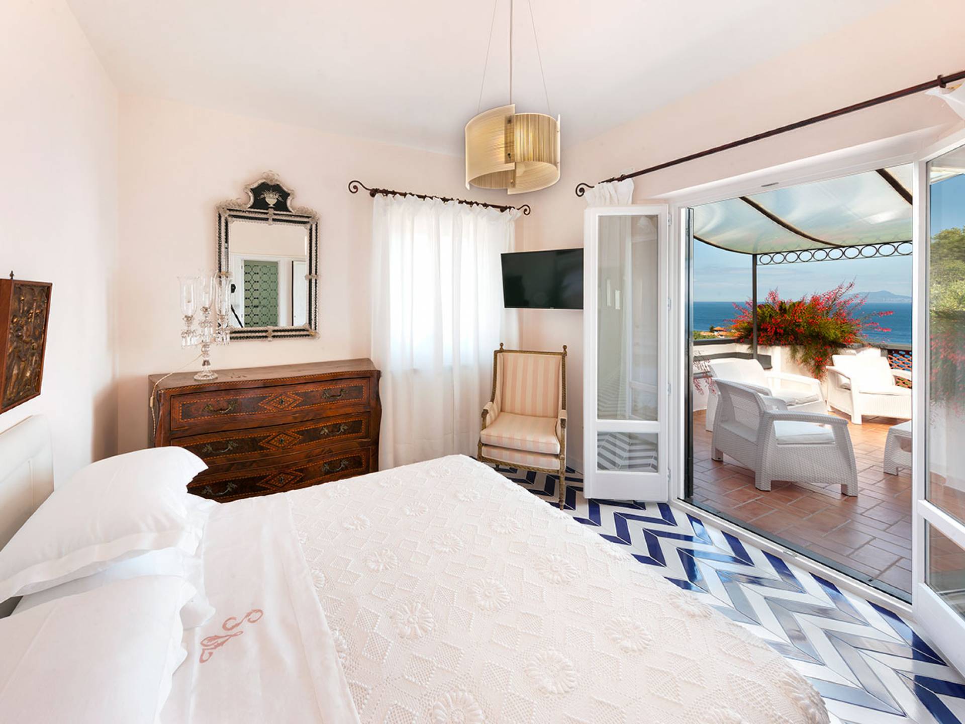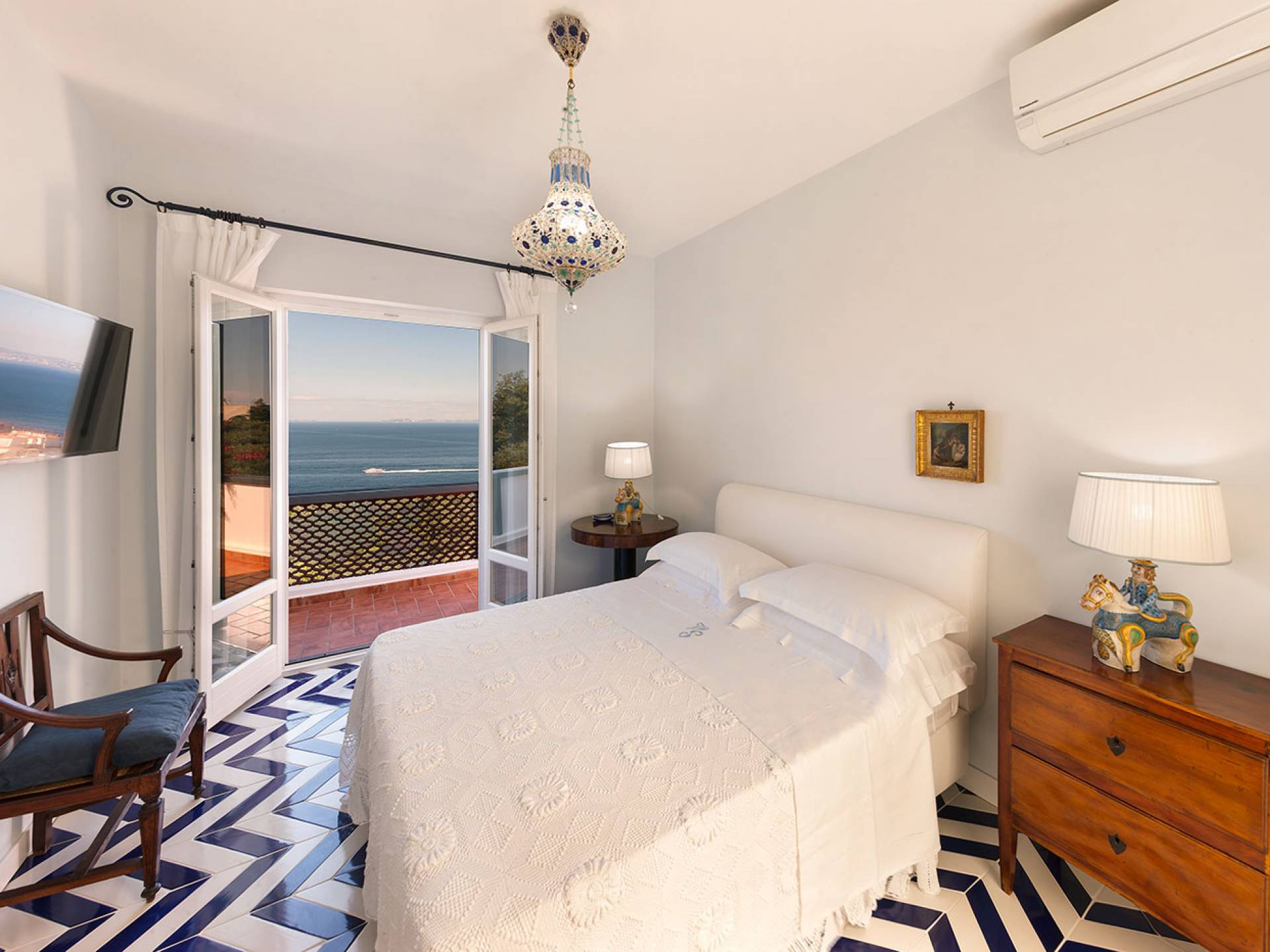 El segundo dormitorio también se encuentra en el último piso y tiene una cama doble (160 cm / 62 pulgadas, más ancha que una cama tamaño queen), baño privado y terraza. El tercer dormitorio también está en el piso superior, con dos camas dobles (120 cm / 47 pulgadas) y una terraza con vista al mar. Esta habitación no tiene baño privado, pero se encuentra en el pasillo. En la planta baja se encuentra el cuarto dormitorio, con una cama doble (160 cm / 62 pulgadas, más ancha que una cama queen), baño privado y terraza. El quinto dormitorio también se encuentra en la planta baja y tiene una cama doble (160 cm / 62 pulgadas, más ancha que una cama tamaño queen), baño privado y terraza. La ciudad de Sorrento está a solo 2 kilómetros de la Villa y a poca distancia de restaurantes, tiendas y la parada de autobús SITA para la costa de Amalfi.