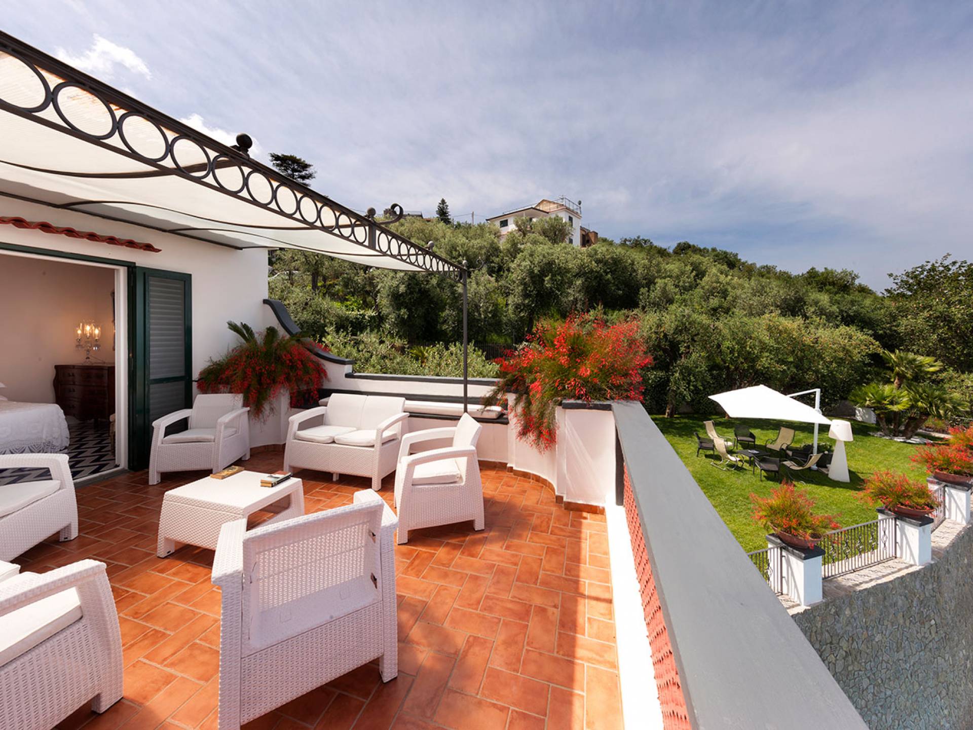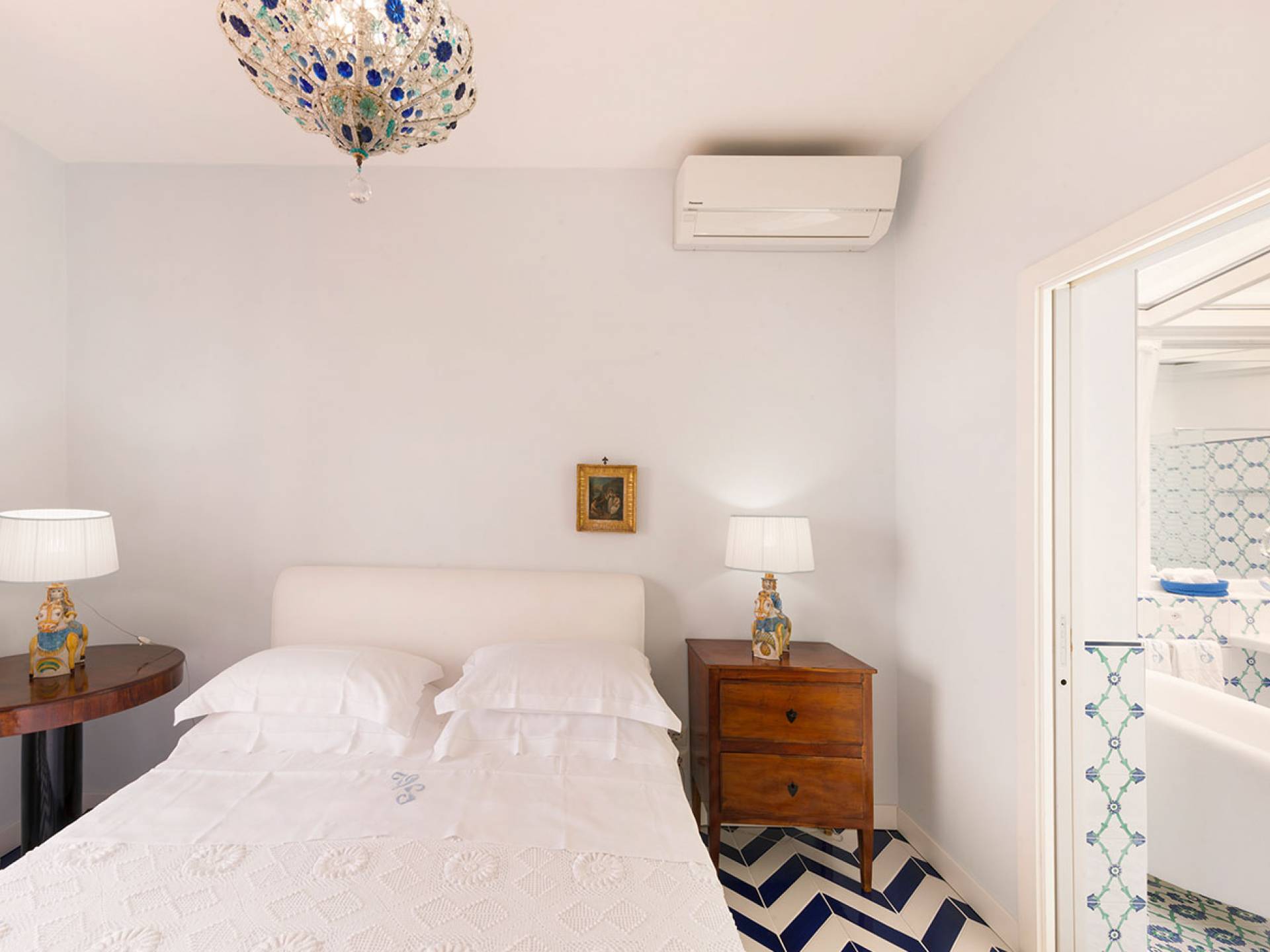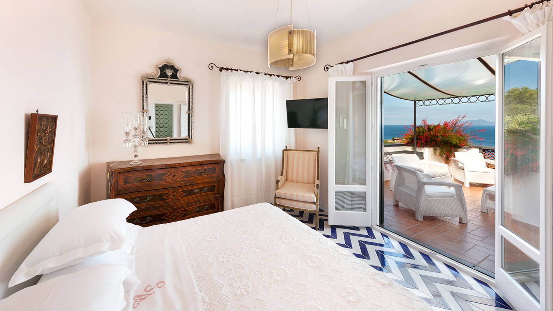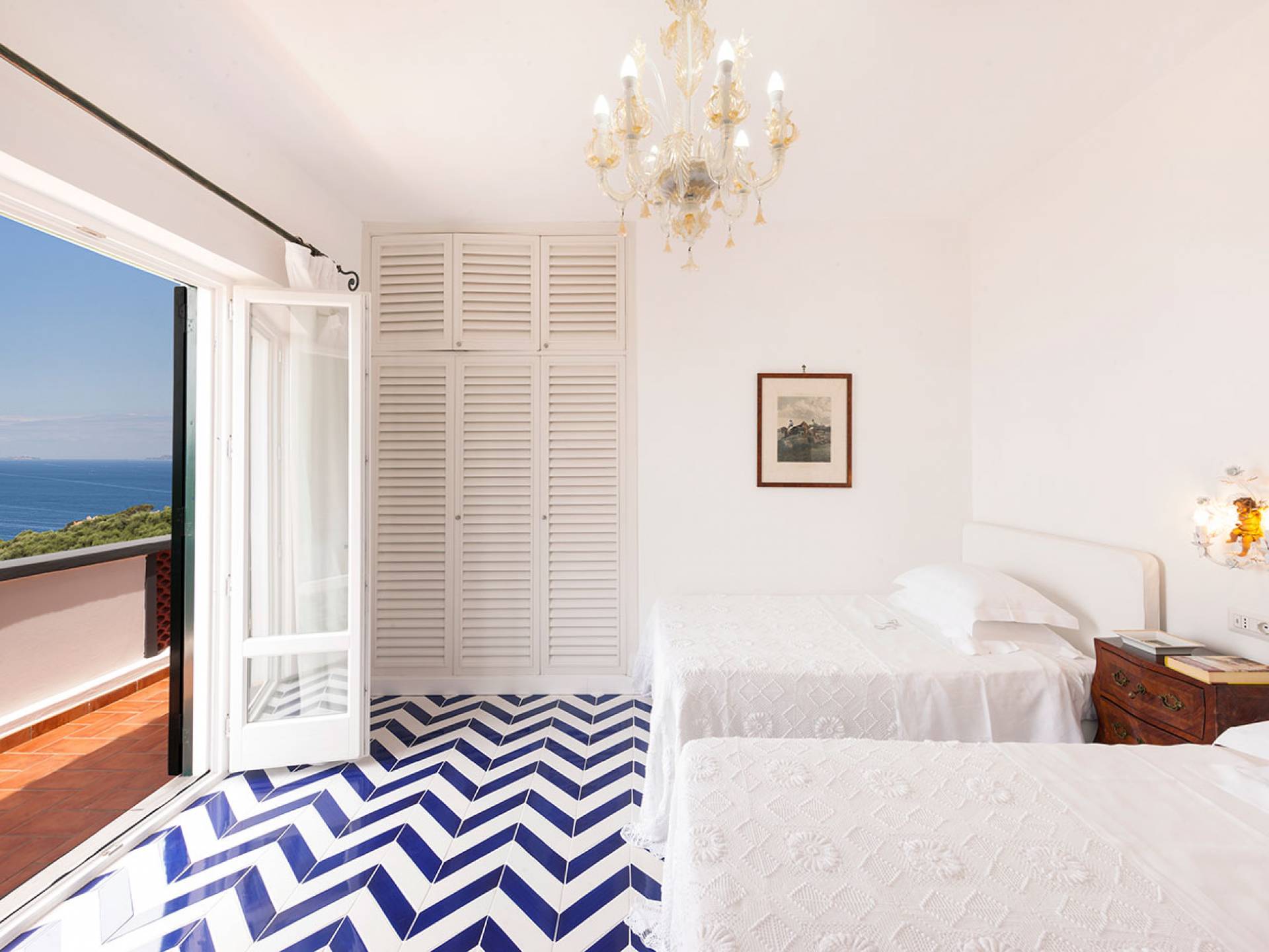 El segundo dormitorio también se encuentra en el último piso y tiene una cama doble (160 cm / 62 pulgadas, más ancha que una cama tamaño queen), baño privado y terraza. El tercer dormitorio también está en el piso superior, con dos camas dobles (120 cm / 47 pulgadas) y una terraza con vista al mar. Esta habitación no tiene baño privado, pero se encuentra en el pasillo. En la planta baja se encuentra el cuarto dormitorio, con una cama doble (160 cm / 62 pulgadas, más ancha que una cama queen), baño privado y terraza. El quinto dormitorio también se encuentra en la planta baja y tiene una cama doble (160 cm / 62 pulgadas, más ancha que una cama tamaño queen), baño privado y terraza. La ciudad de Sorrento está a solo 2 kilómetros de la Villa y a poca distancia de restaurantes, tiendas y la parada de autobús SITA para la costa de Amalfi.
