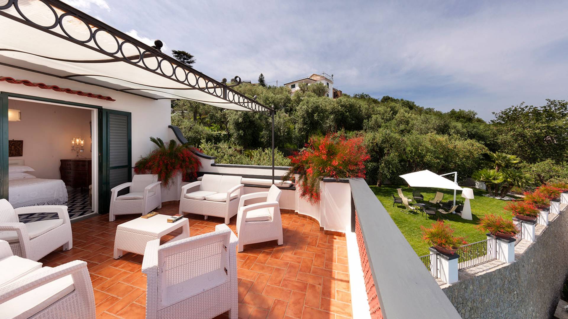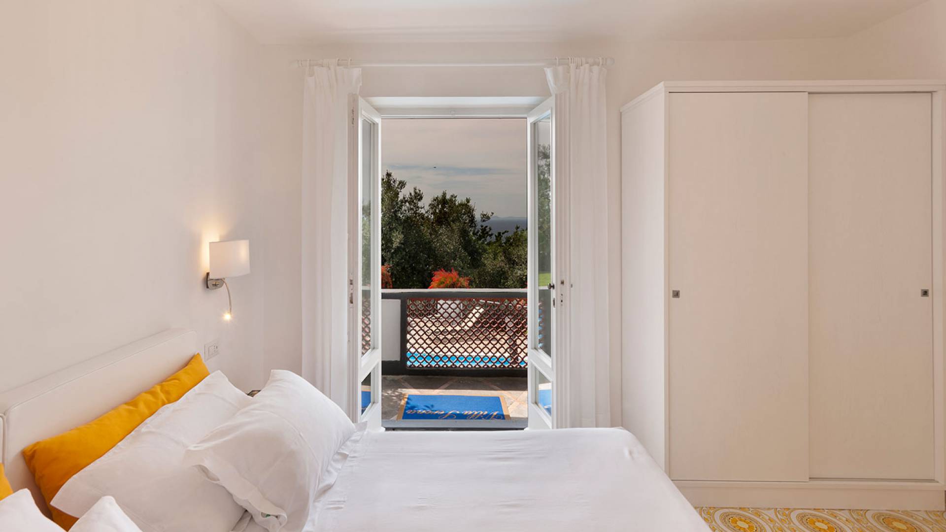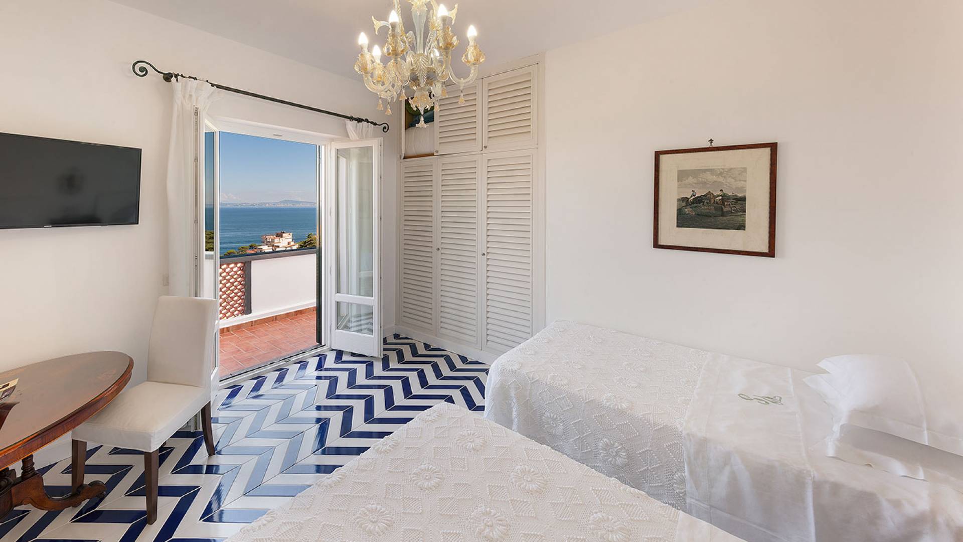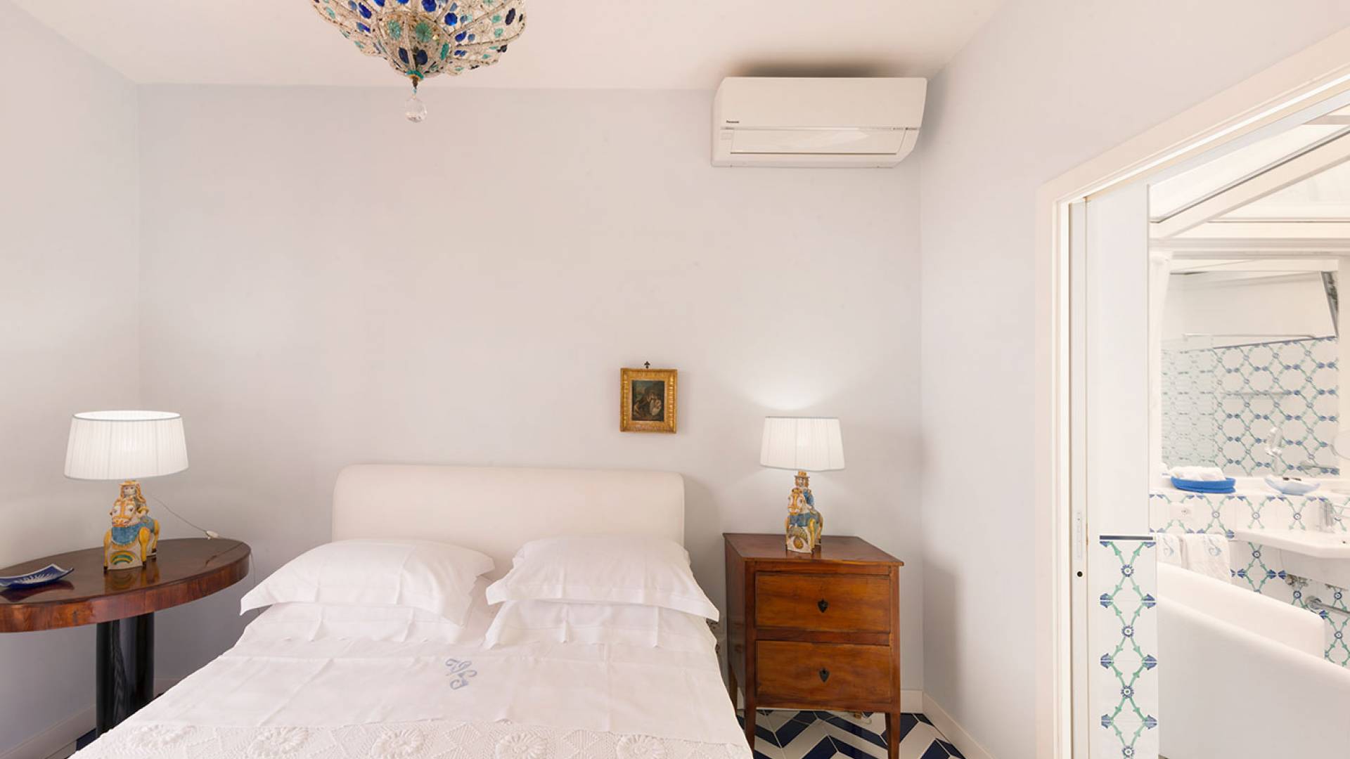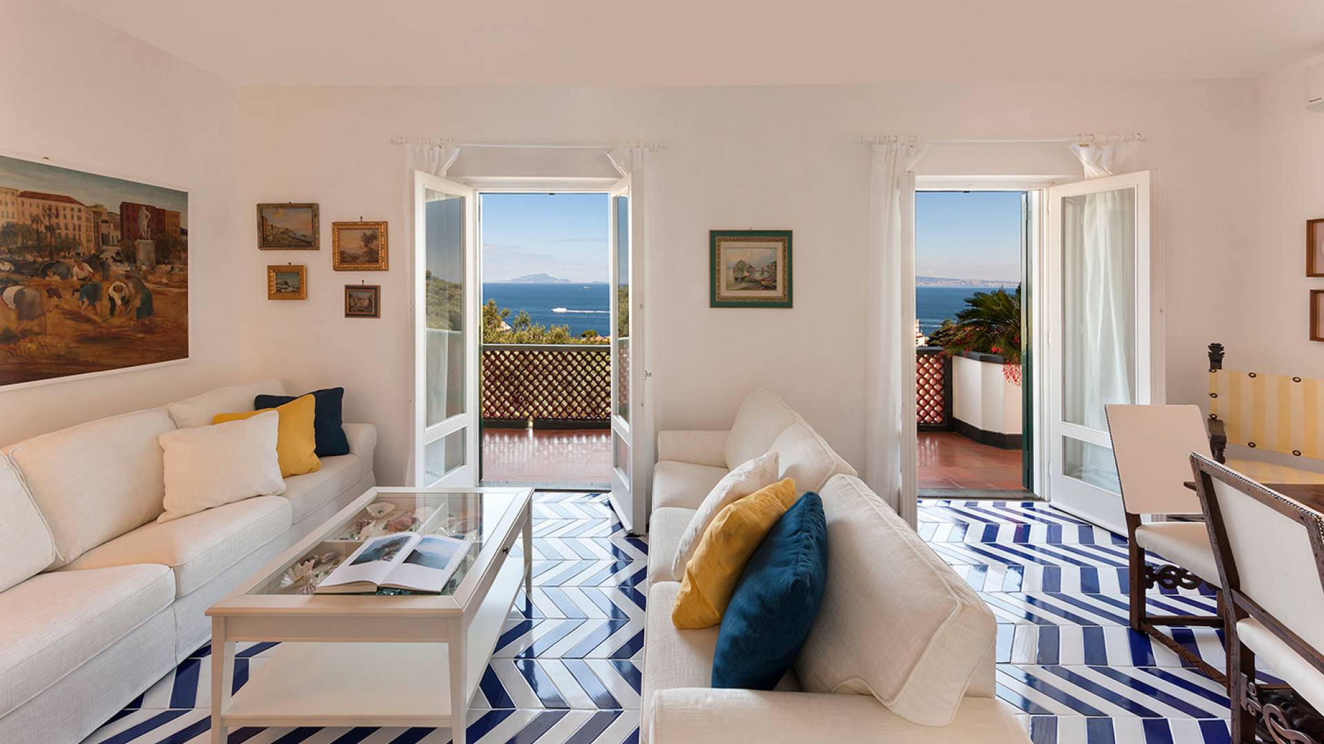 El segundo dormitorio también se encuentra en el último piso y tiene una cama doble (160 cm / 62 pulgadas, más ancha que una cama tamaño queen), baño privado y terraza. El tercer dormitorio también está en el piso superior, con dos camas dobles (120 cm / 47 pulgadas) y una terraza con vista al mar. Esta habitación no tiene baño privado, pero se encuentra en el pasillo. En la planta baja se encuentra el cuarto dormitorio, con una cama doble (160 cm / 62 pulgadas, más ancha que una cama queen), baño privado y terraza. El quinto dormitorio también se encuentra en la planta baja y tiene una cama doble (160 cm / 62 pulgadas, más ancha que una cama tamaño queen), baño privado y terraza. La ciudad de Sorrento está a solo 2 kilómetros de la Villa y a poca distancia de restaurantes, tiendas y la parada de autobús SITA para la costa de Amalfi.