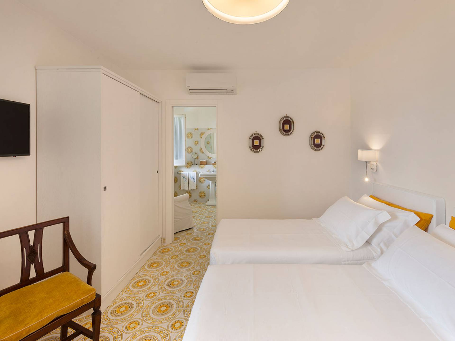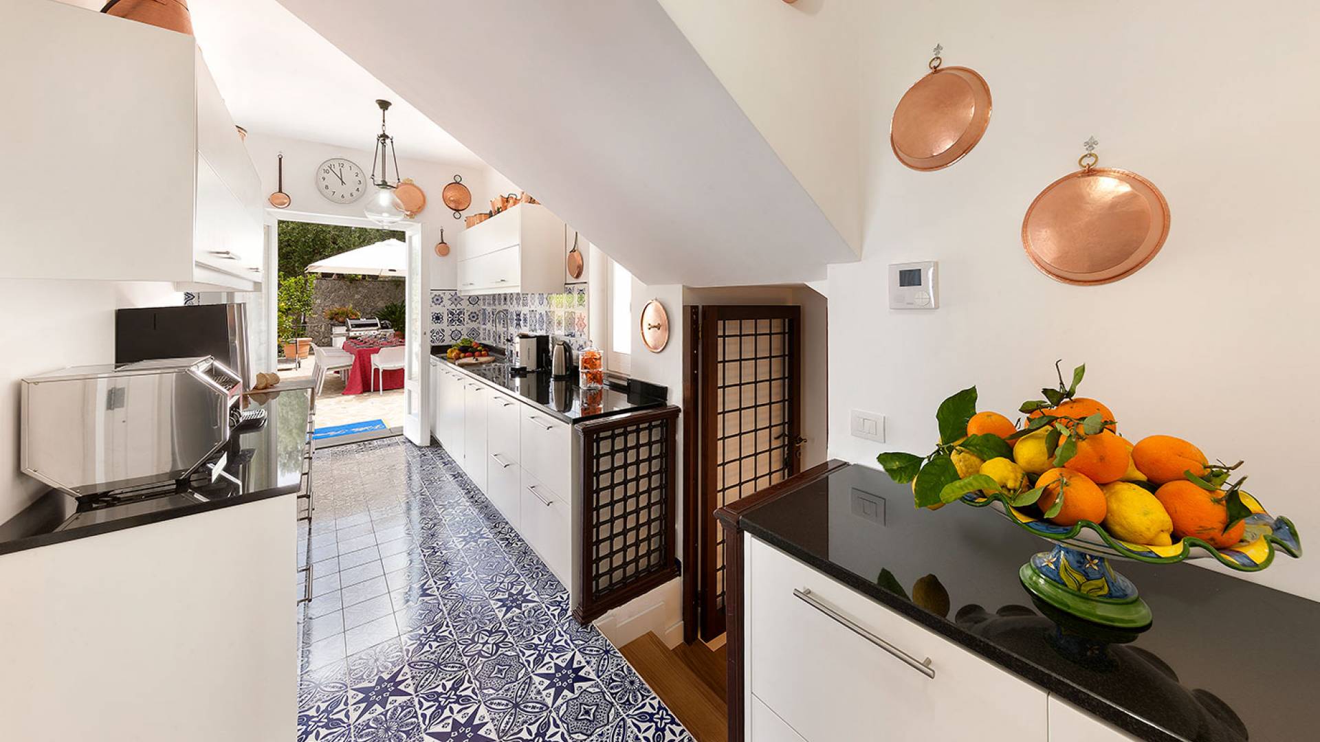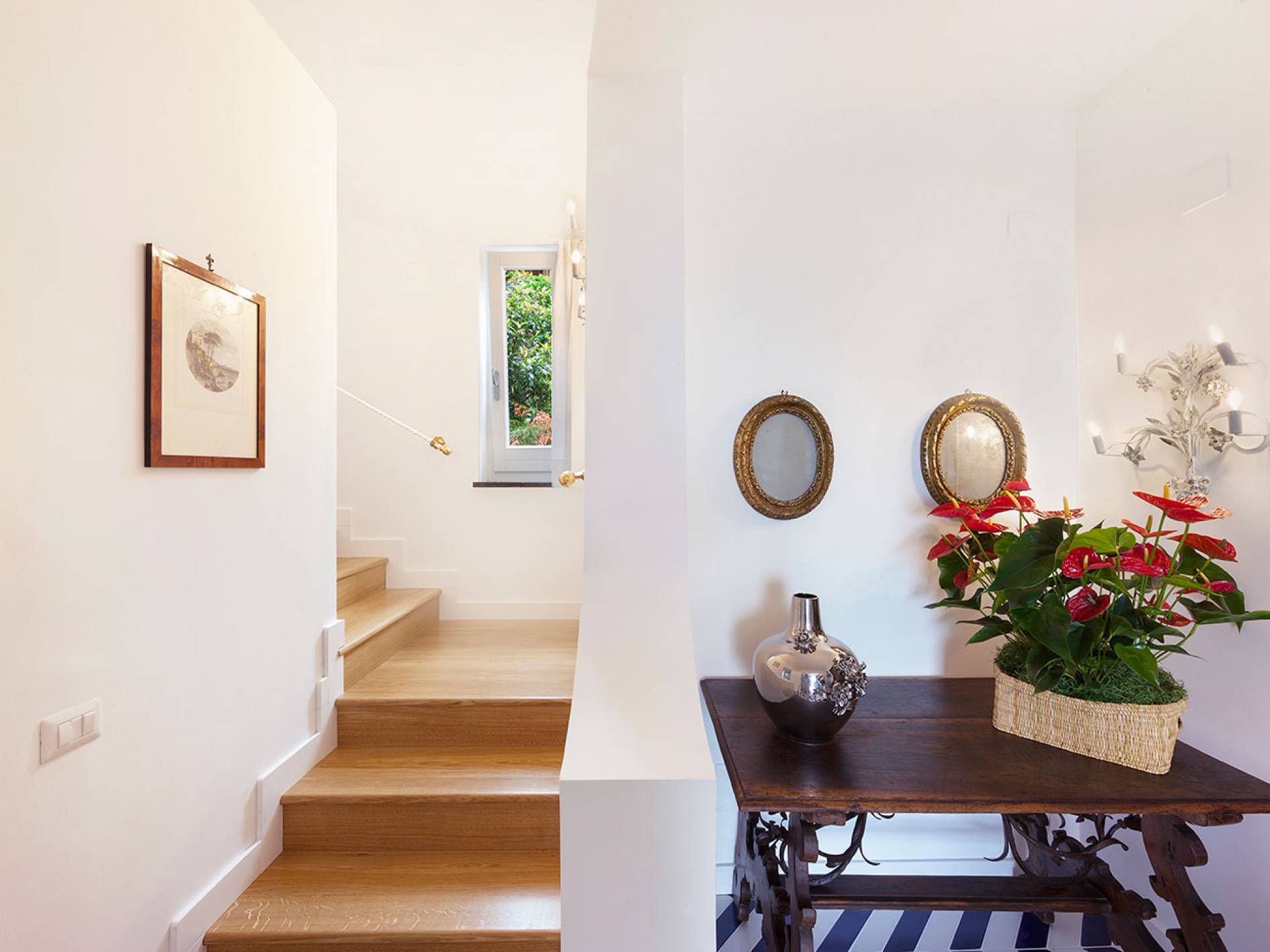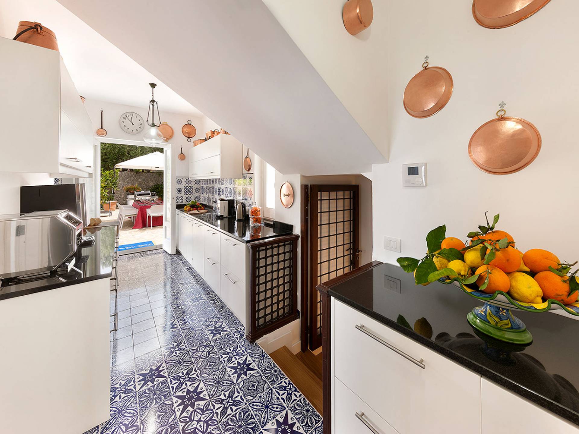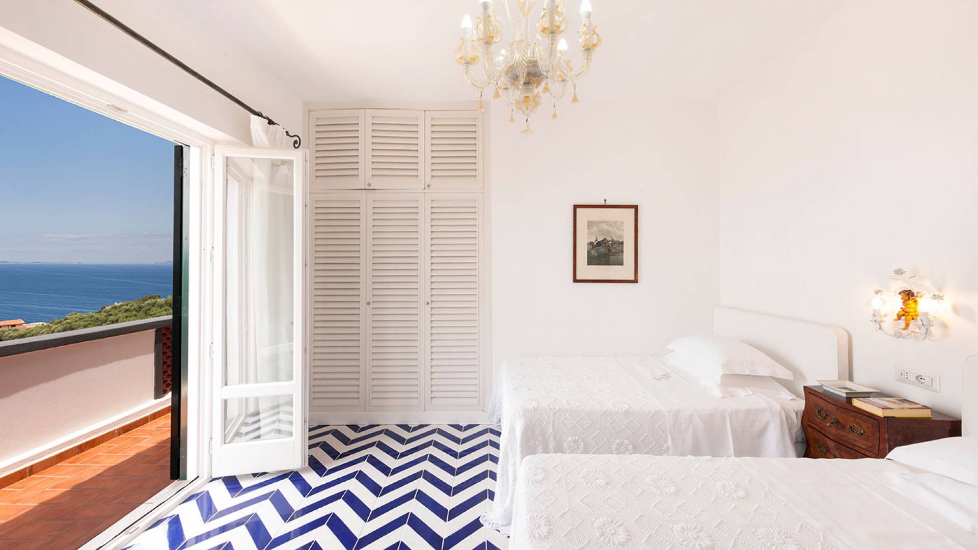 El segundo dormitorio también se encuentra en el último piso y tiene una cama doble (160 cm / 62 pulgadas, más ancha que una cama tamaño queen), baño privado y terraza. El tercer dormitorio también está en el piso superior, con dos camas dobles (120 cm / 47 pulgadas) y una terraza con vista al mar. Esta habitación no tiene baño privado, pero se encuentra en el pasillo. En la planta baja se encuentra el cuarto dormitorio, con una cama doble (160 cm / 62 pulgadas, más ancha que una cama queen), baño privado y terraza. El quinto dormitorio también se encuentra en la planta baja y tiene una cama doble (160 cm / 62 pulgadas, más ancha que una cama tamaño queen), baño privado y terraza. La ciudad de Sorrento está a solo 2 kilómetros de la Villa y a poca distancia de restaurantes, tiendas y la parada de autobús SITA para la costa de Amalfi.