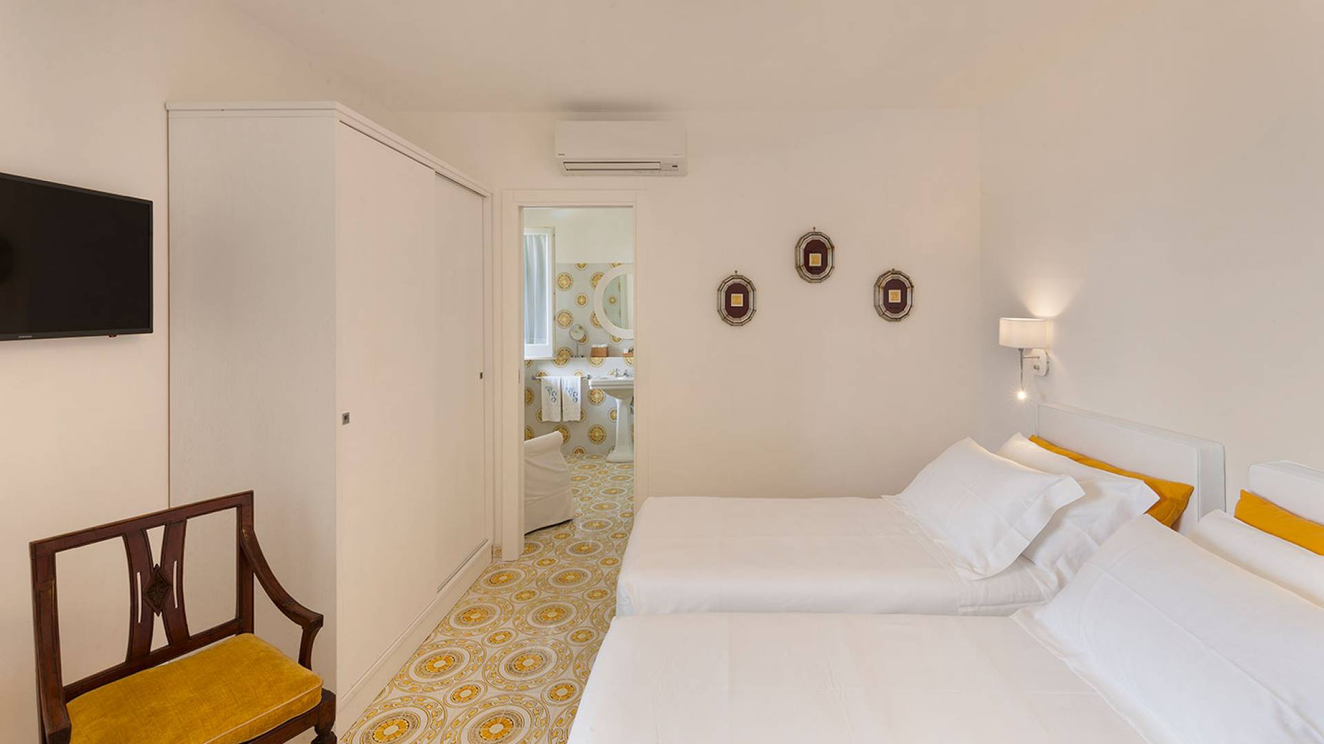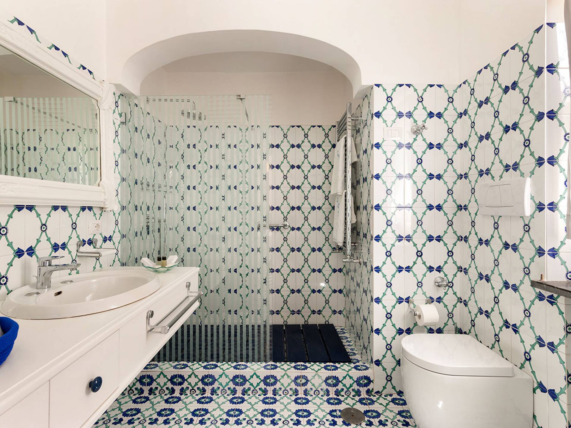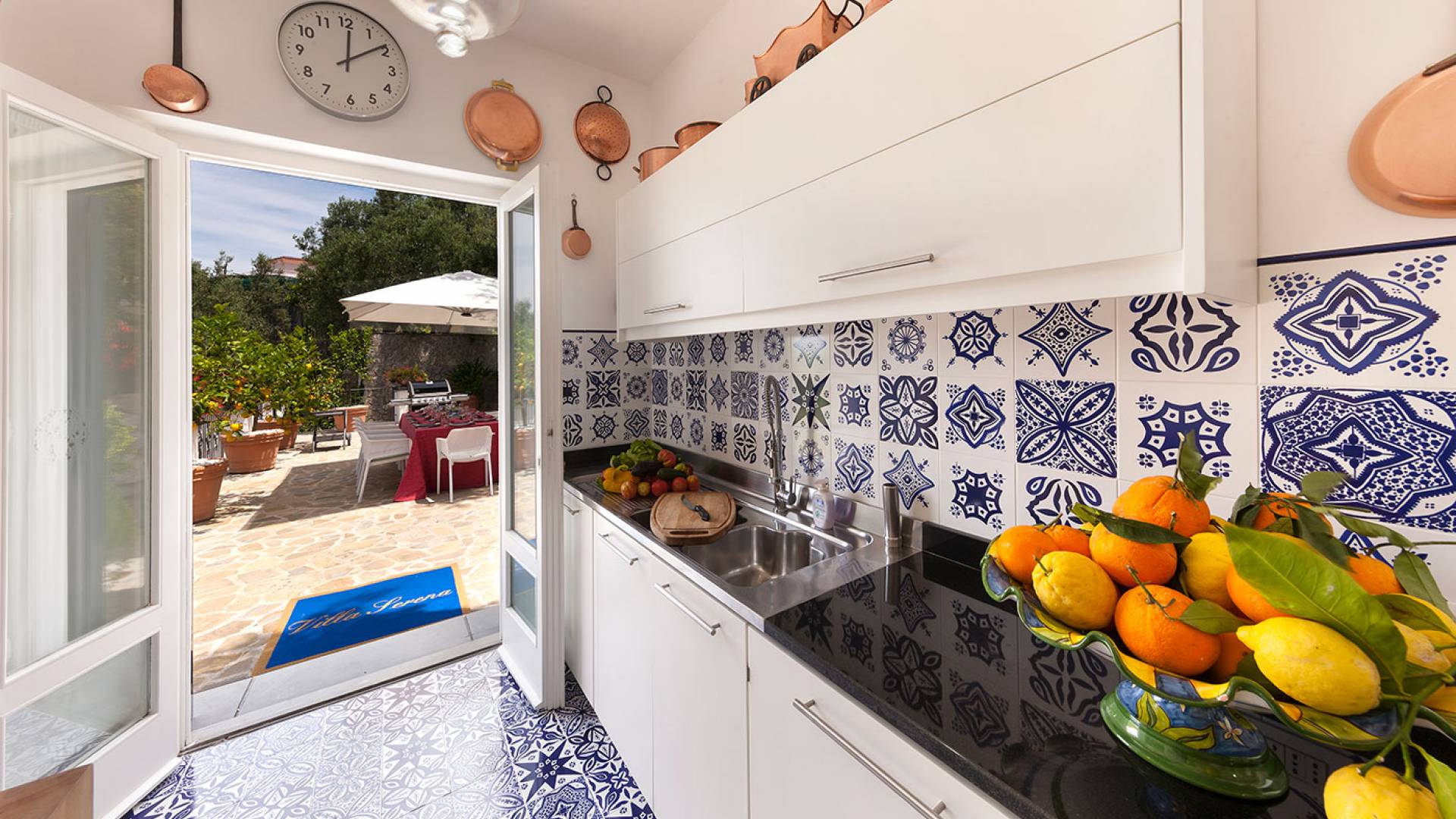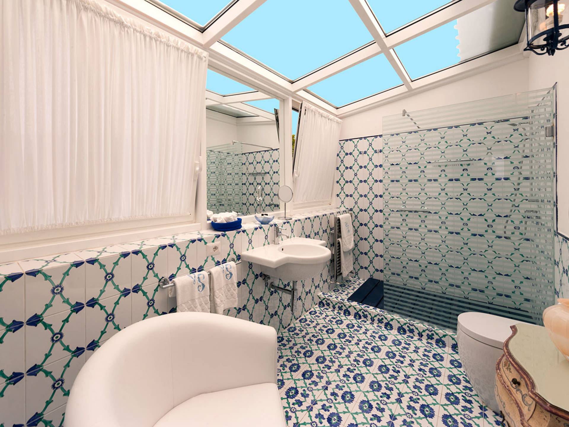 El segundo dormitorio también se encuentra en el último piso y tiene una cama doble (160 cm / 62 pulgadas, más ancha que una cama tamaño queen), baño privado y terraza. El tercer dormitorio también está en el piso superior, con dos camas dobles (120 cm / 47 pulgadas) y una terraza con vista al mar. Esta habitación no tiene baño privado, pero se encuentra en el pasillo. En la planta baja se encuentra el cuarto dormitorio, con una cama doble (160 cm / 62 pulgadas, más ancha que una cama queen), baño privado y terraza. El quinto dormitorio también se encuentra en la planta baja y tiene una cama doble (160 cm / 62 pulgadas, más ancha que una cama tamaño queen), baño privado y terraza. La ciudad de Sorrento está a solo 2 kilómetros de la Villa y a poca distancia de restaurantes, tiendas y la parada de autobús SITA para la costa de Amalfi.