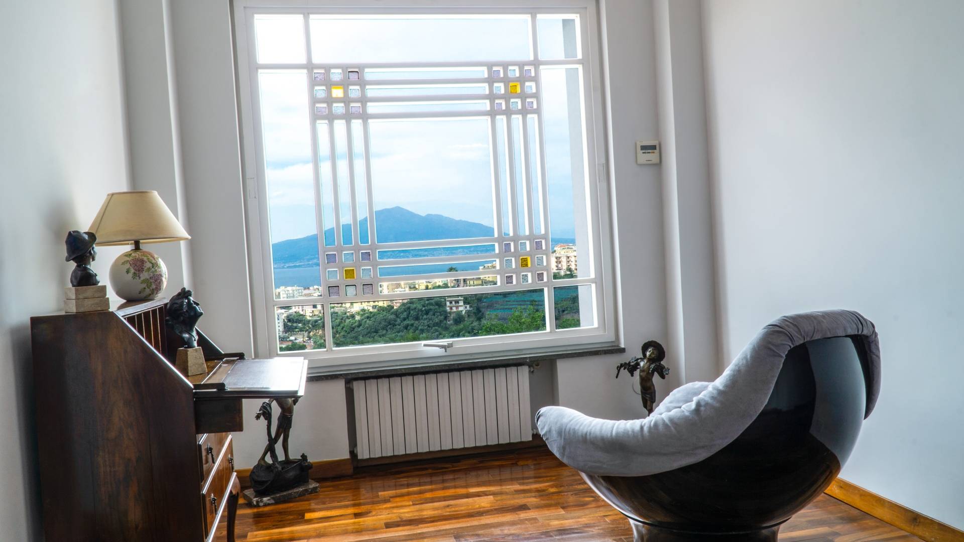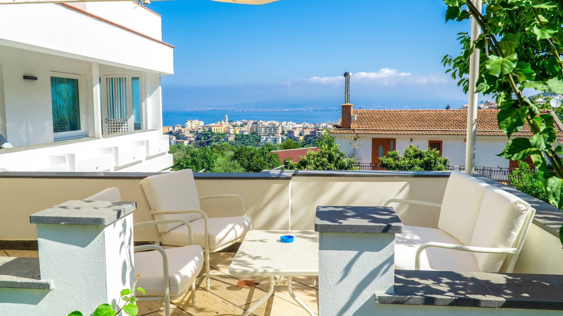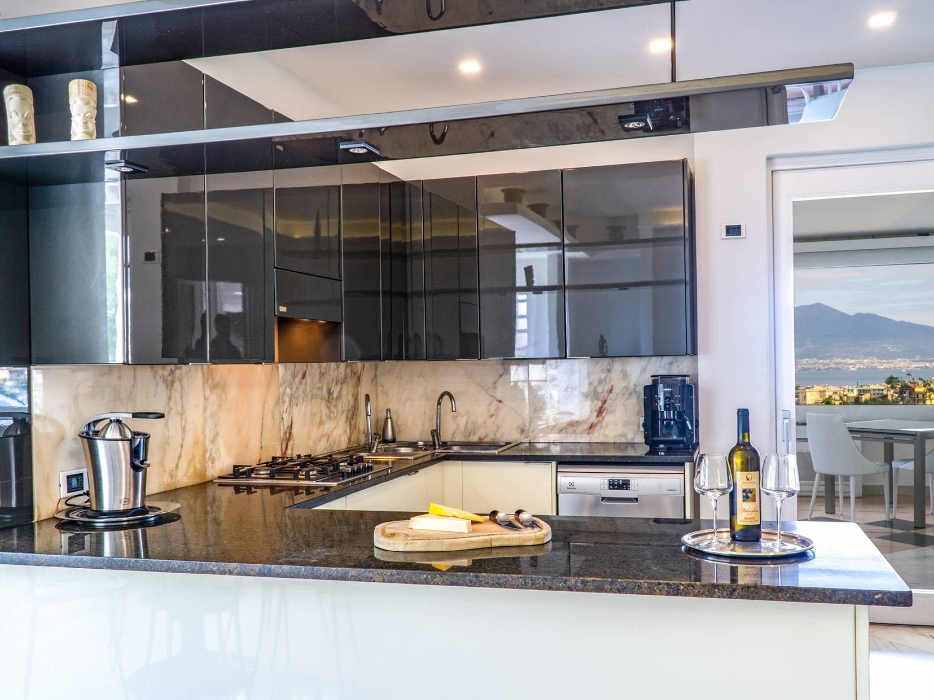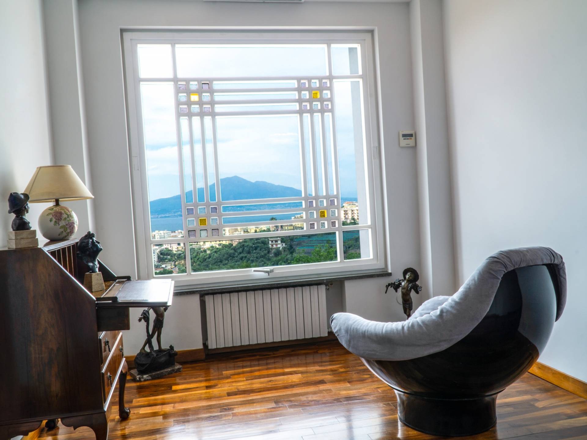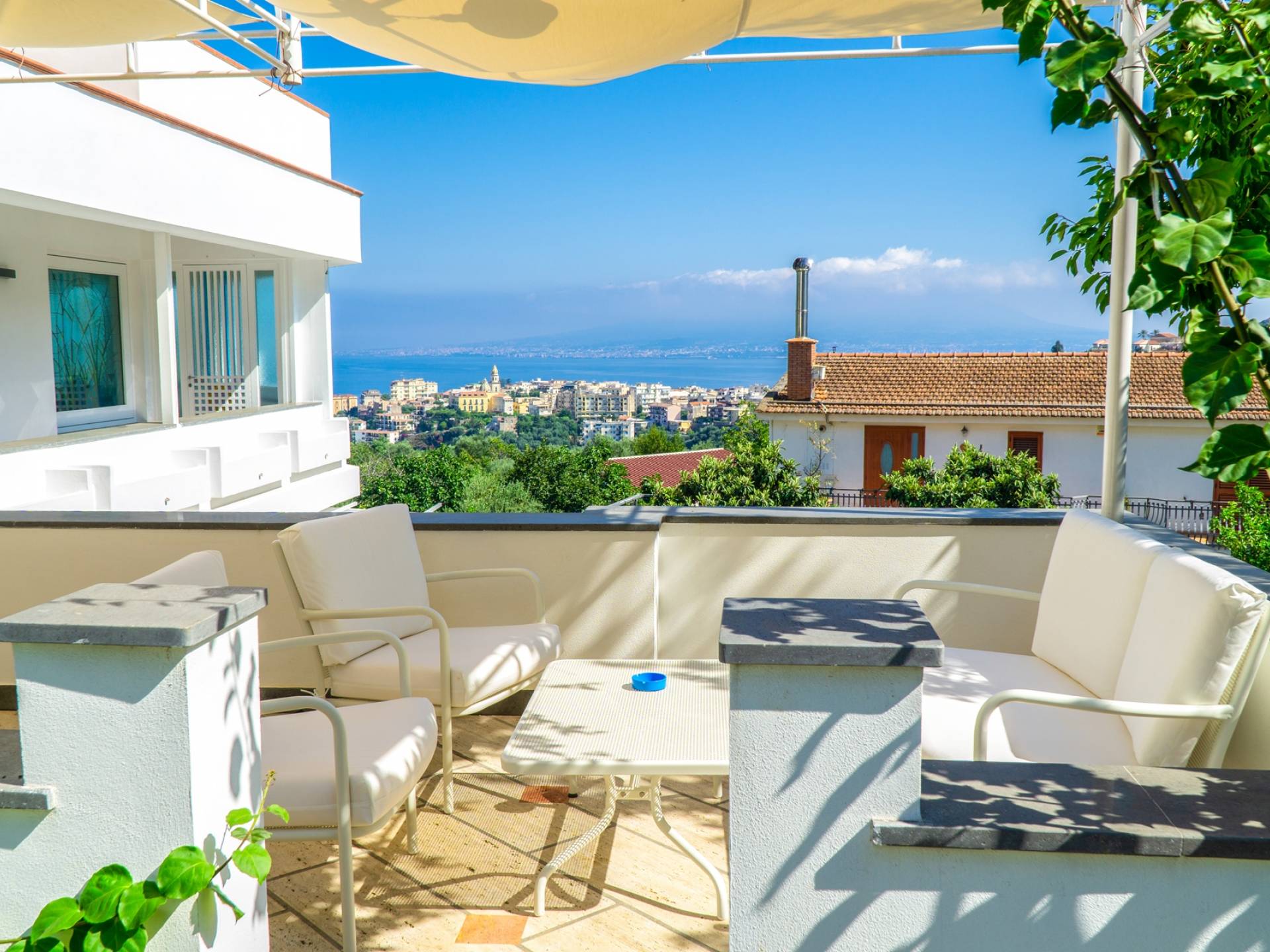 El encantador mobiliario se complementa con antiguos jarrones etruscos y pinturas originales. La sala de estar conduce a la terraza, que se asemeja a la proa de un barco, donde puede sentarse y mirar el mar. Desde aquí admirarás la grandeza del Vesubio y te perderás en los colores del Golfo de Nápoles.