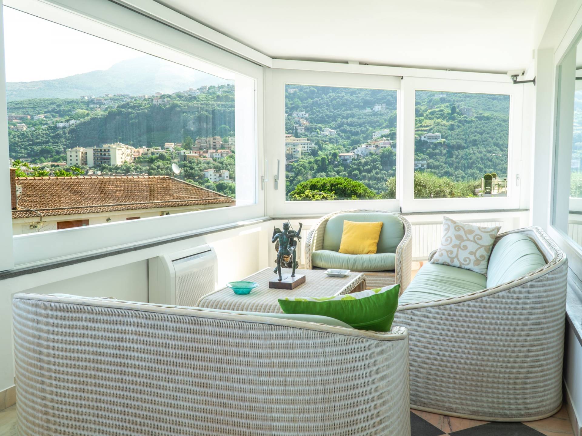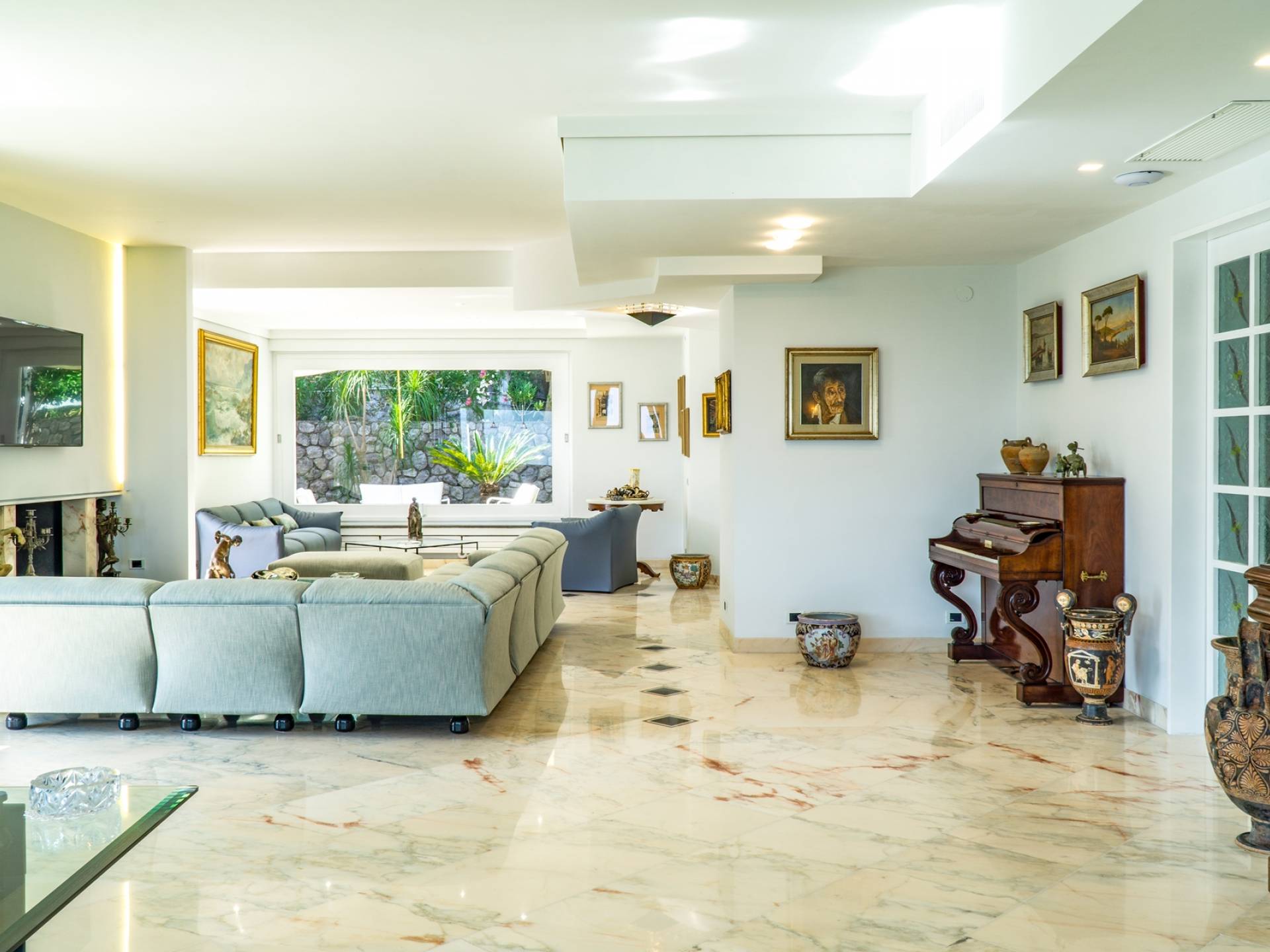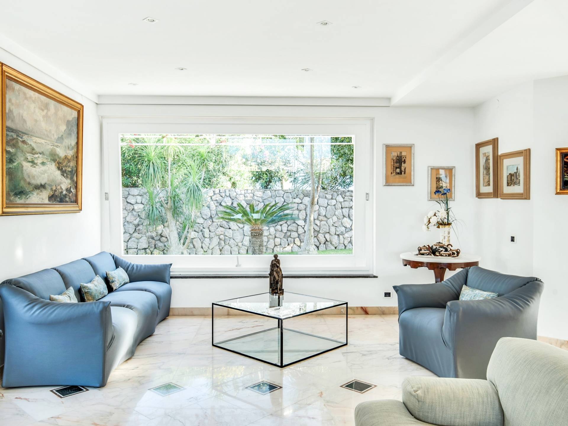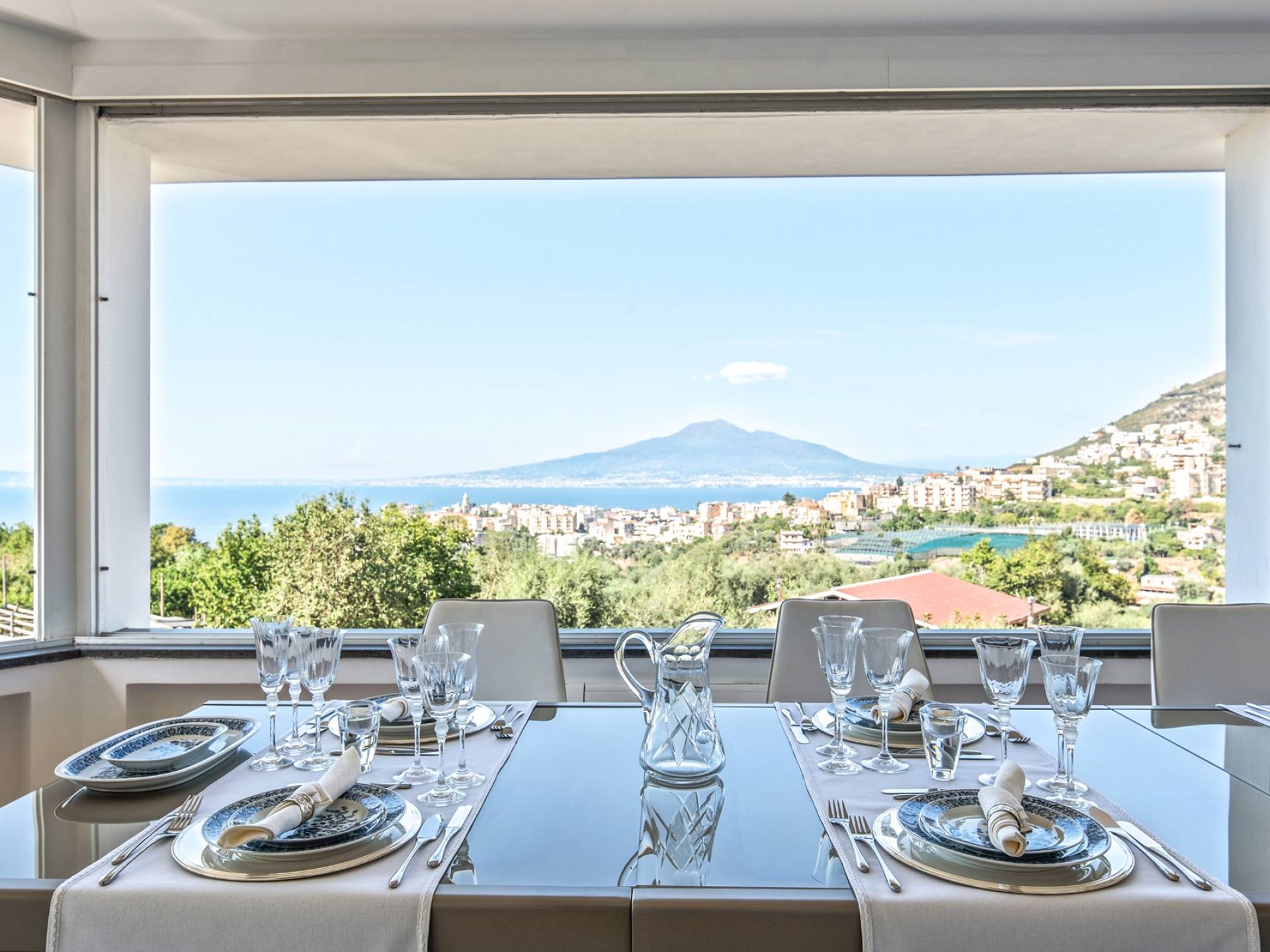 El encantador mobiliario se complementa con antiguos jarrones etruscos y pinturas originales. La sala de estar conduce a la terraza, que se asemeja a la proa de un barco, donde puede sentarse y mirar el mar. Desde aquí admirarás la grandeza del Vesubio y te perderás en los colores del Golfo de Nápoles.