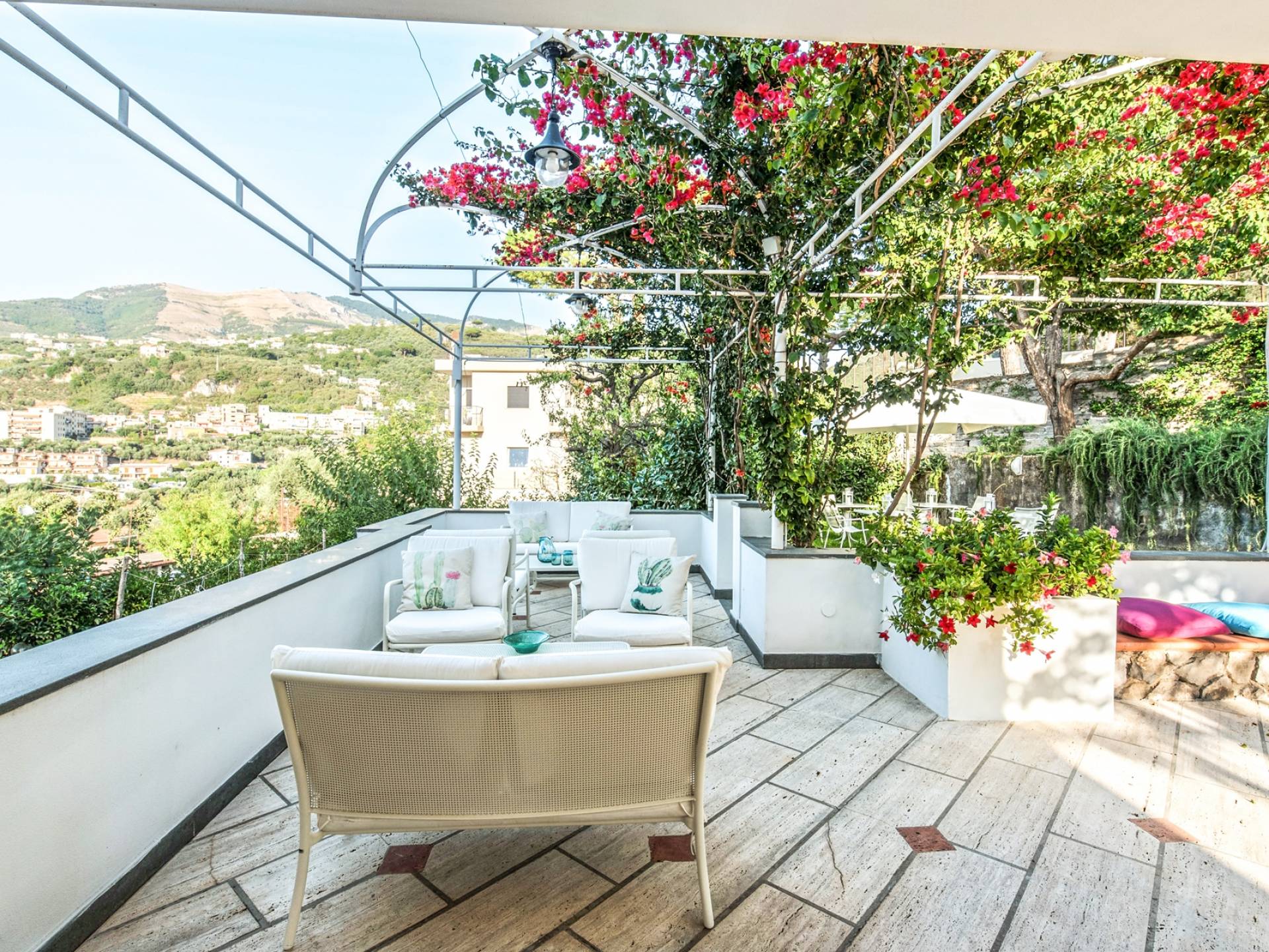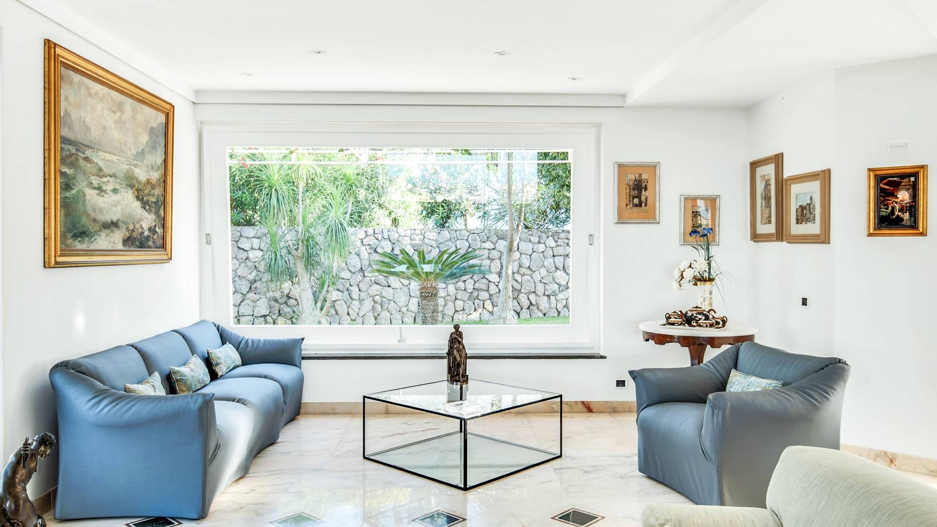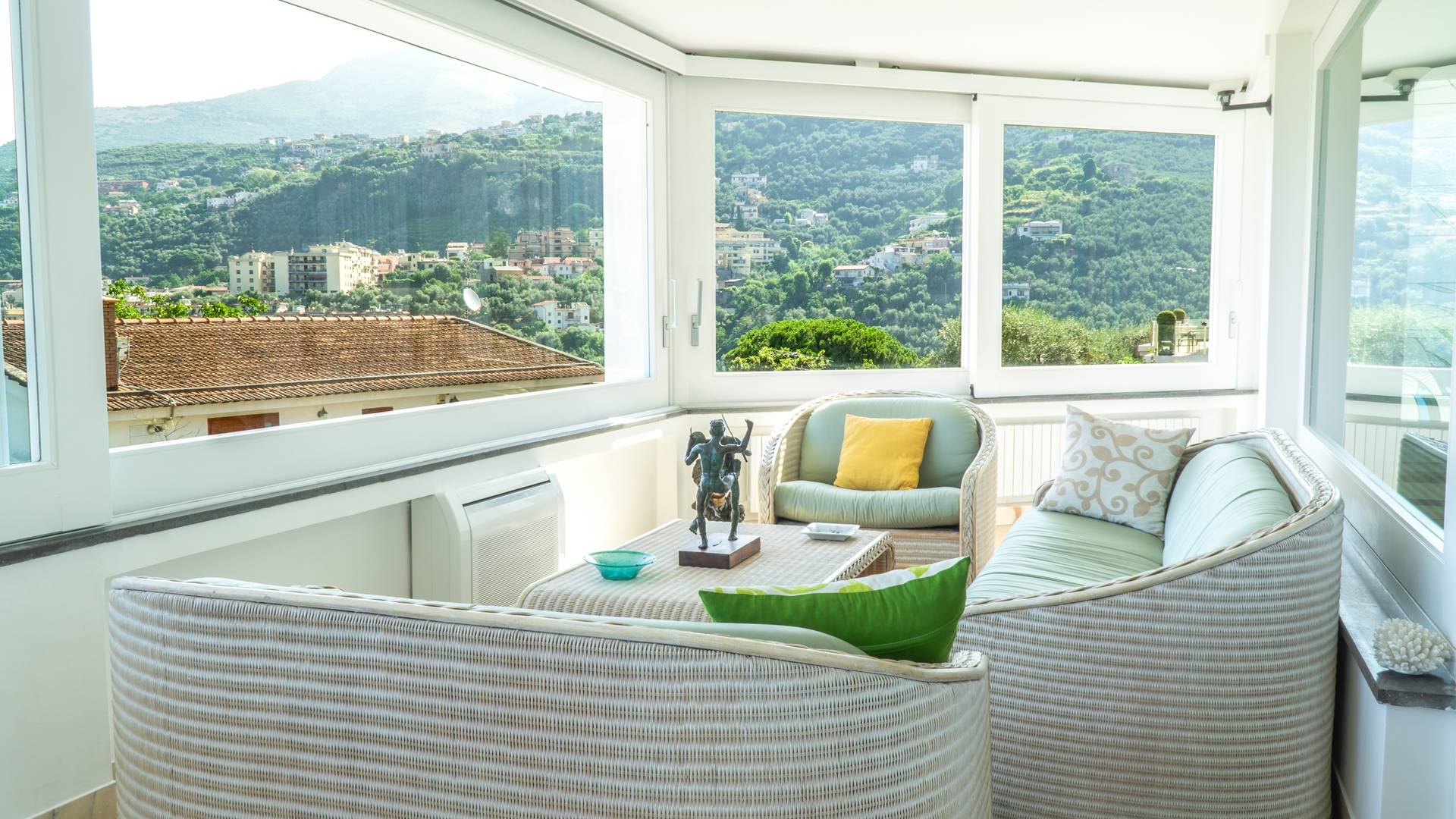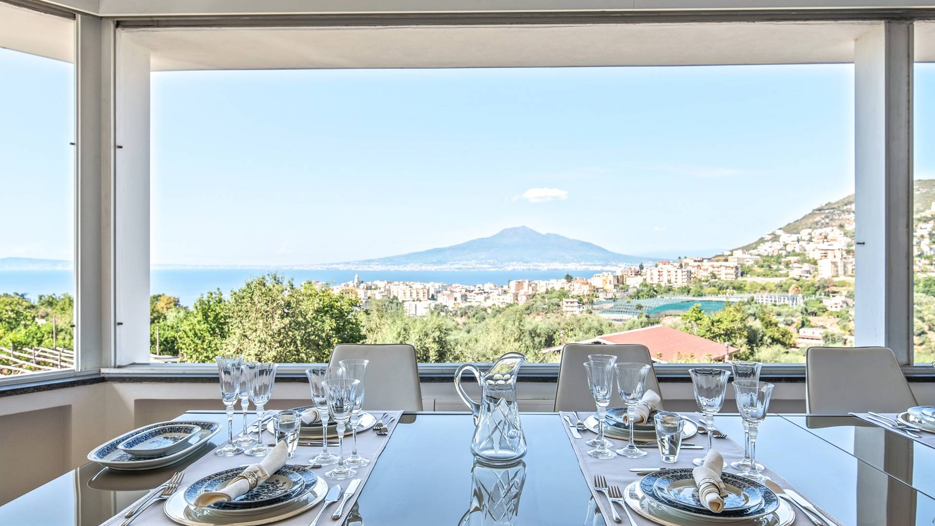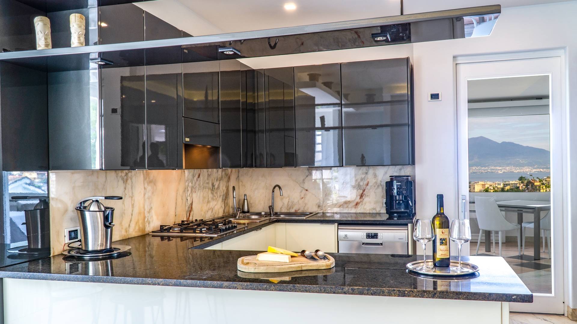 El encantador mobiliario se complementa con antiguos jarrones etruscos y pinturas originales. La sala de estar conduce a la terraza, que se asemeja a la proa de un barco, donde puede sentarse y mirar el mar. Desde aquí admirarás la grandeza del Vesubio y te perderás en los colores del Golfo de Nápoles.