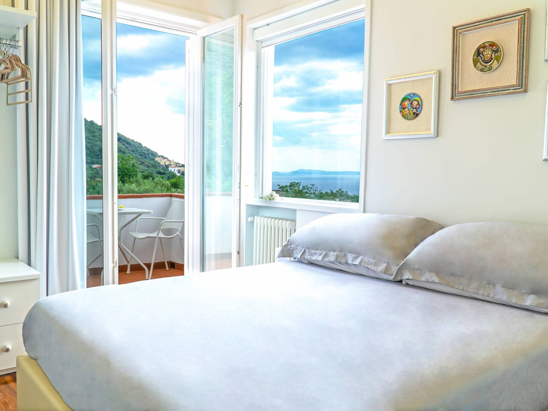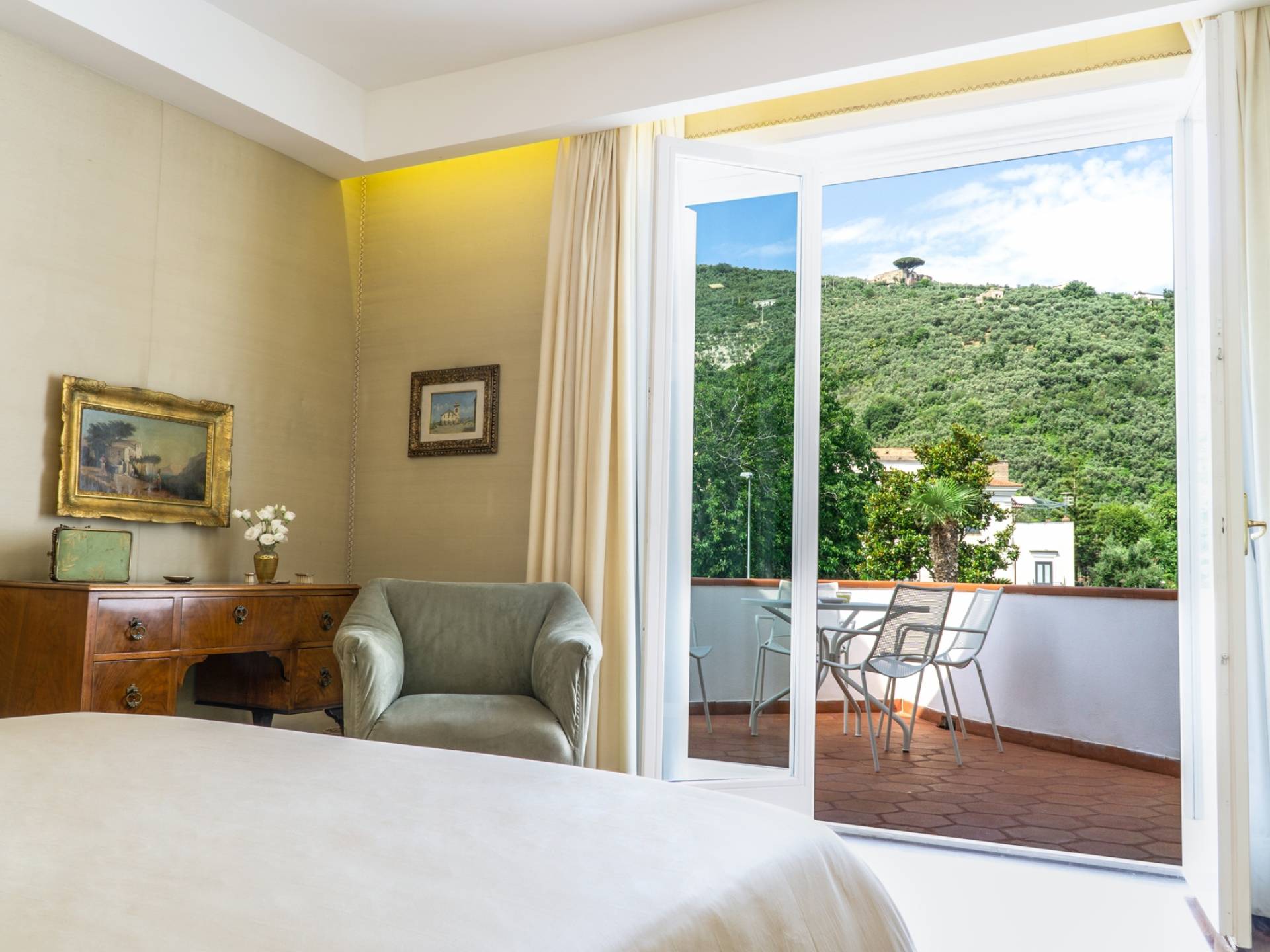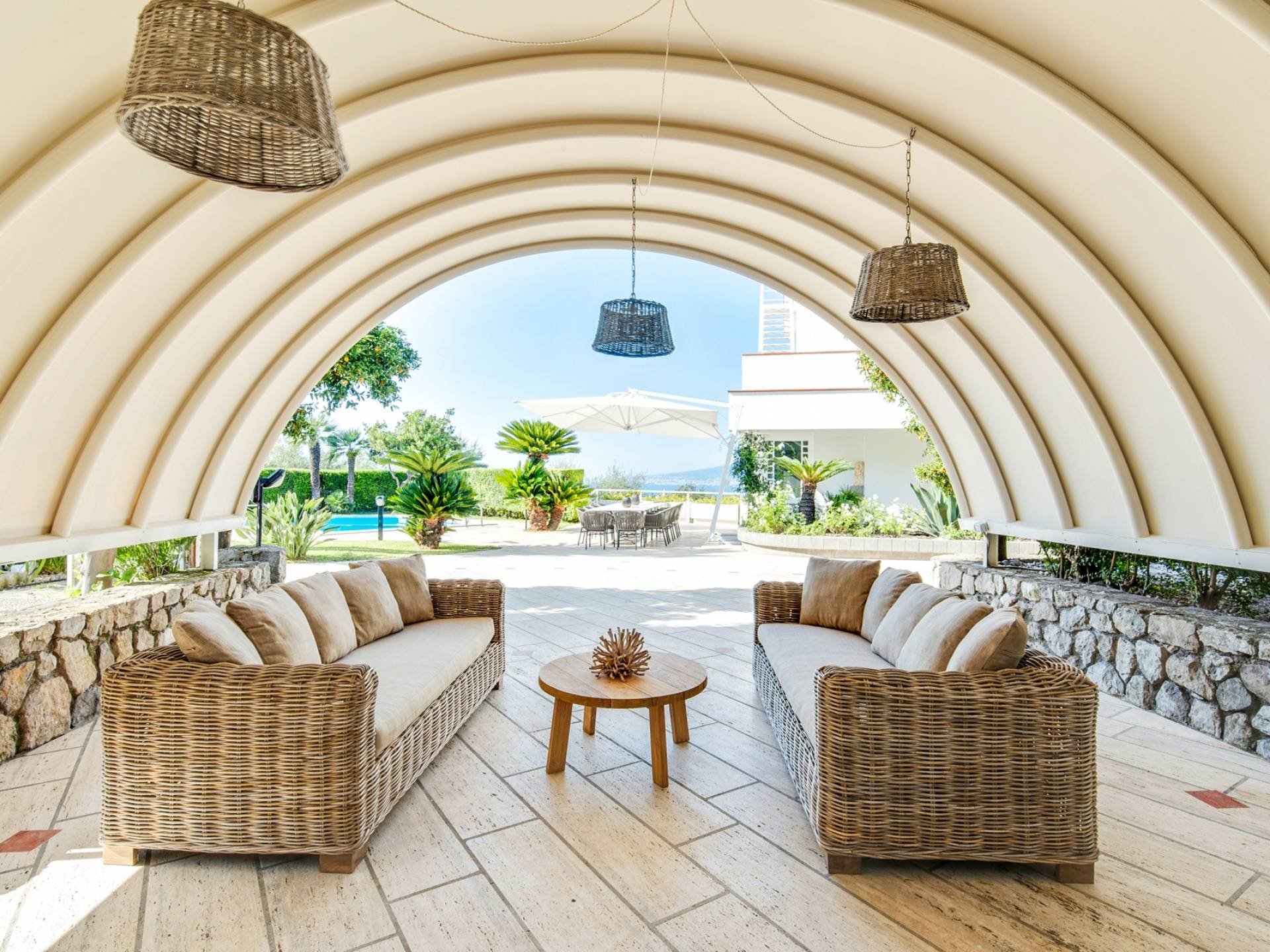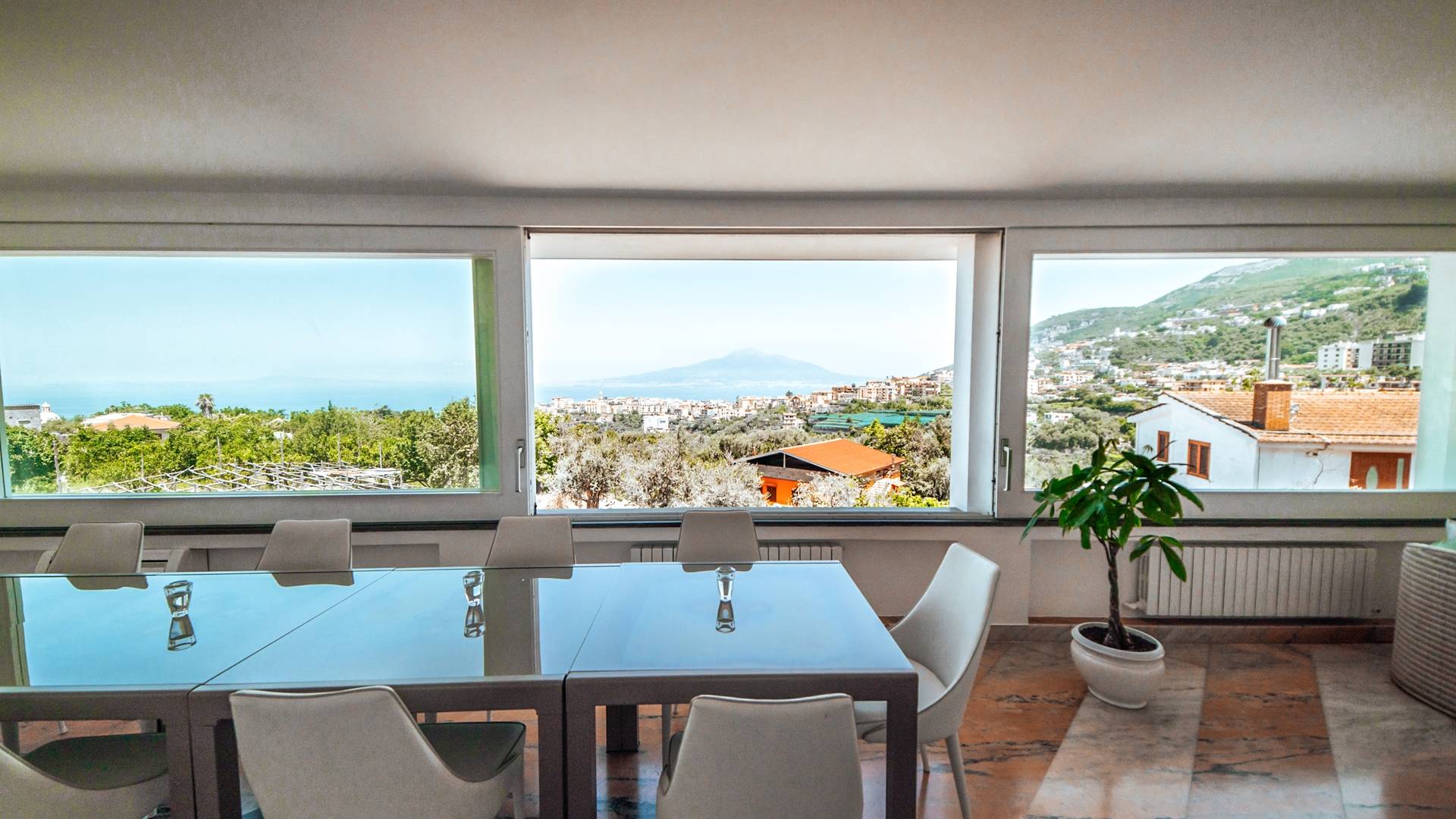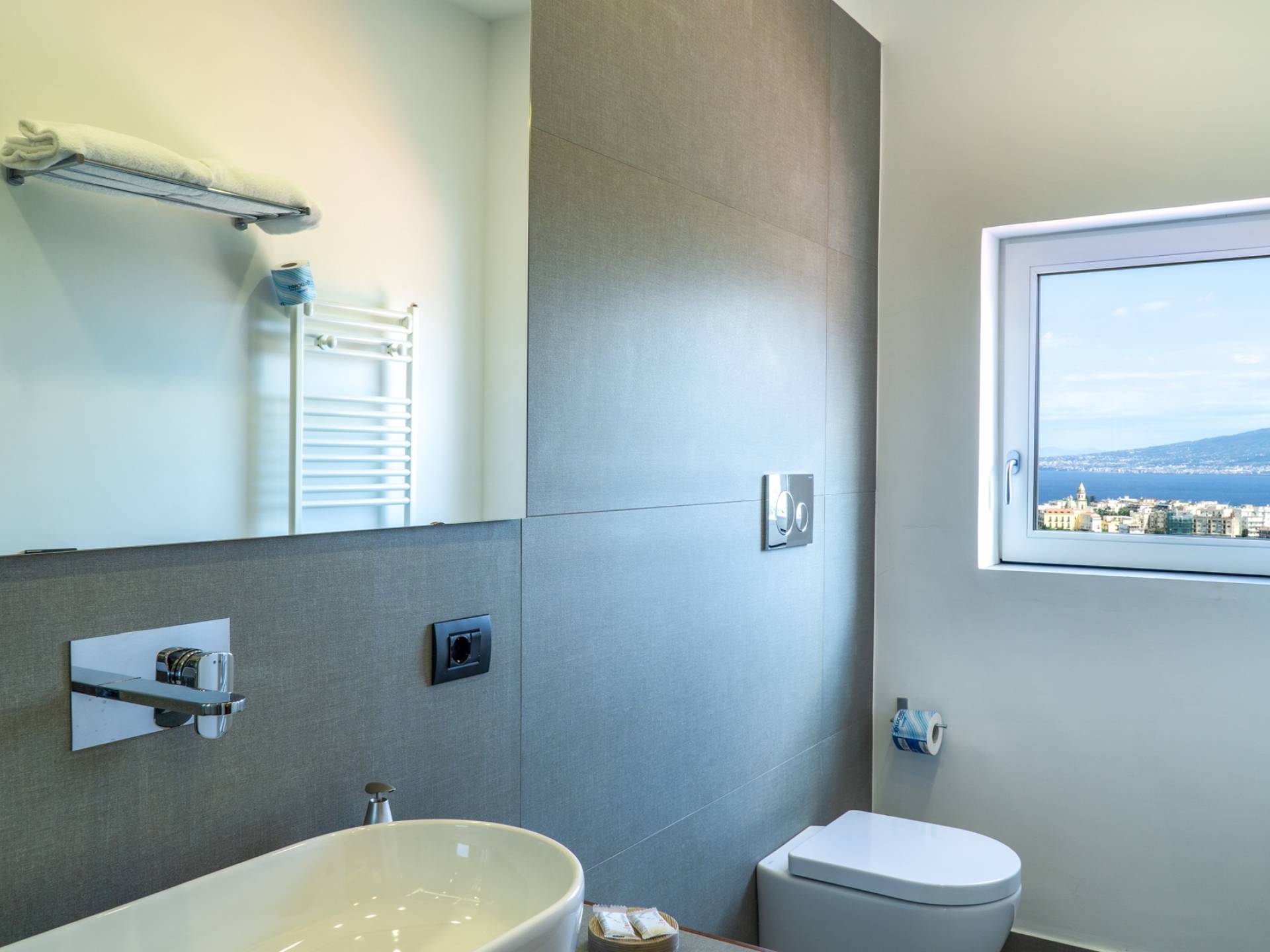 El encantador mobiliario se complementa con antiguos jarrones etruscos y pinturas originales. La sala de estar conduce a la terraza, que se asemeja a la proa de un barco, donde puede sentarse y mirar el mar. Desde aquí admirarás la grandeza del Vesubio y te perderás en los colores del Golfo de Nápoles.