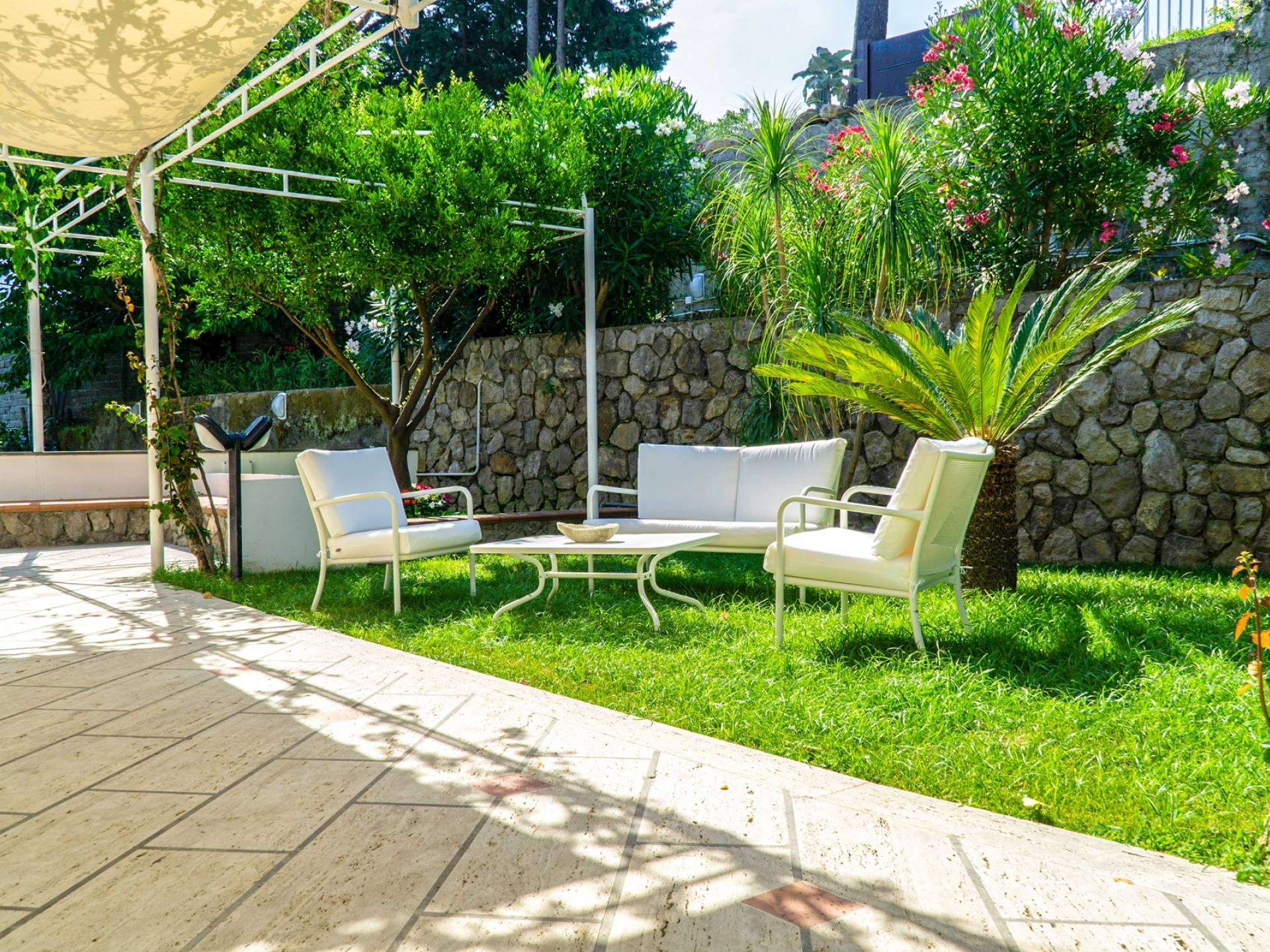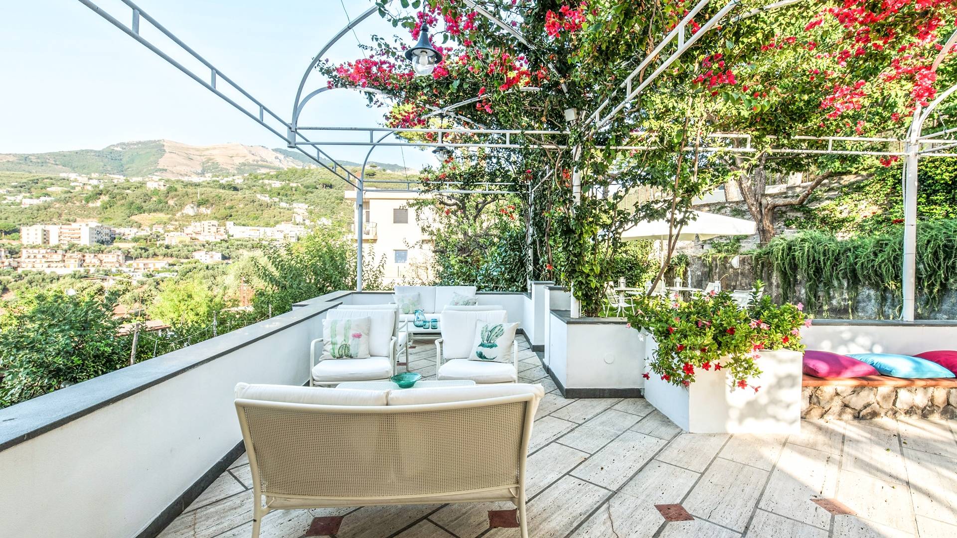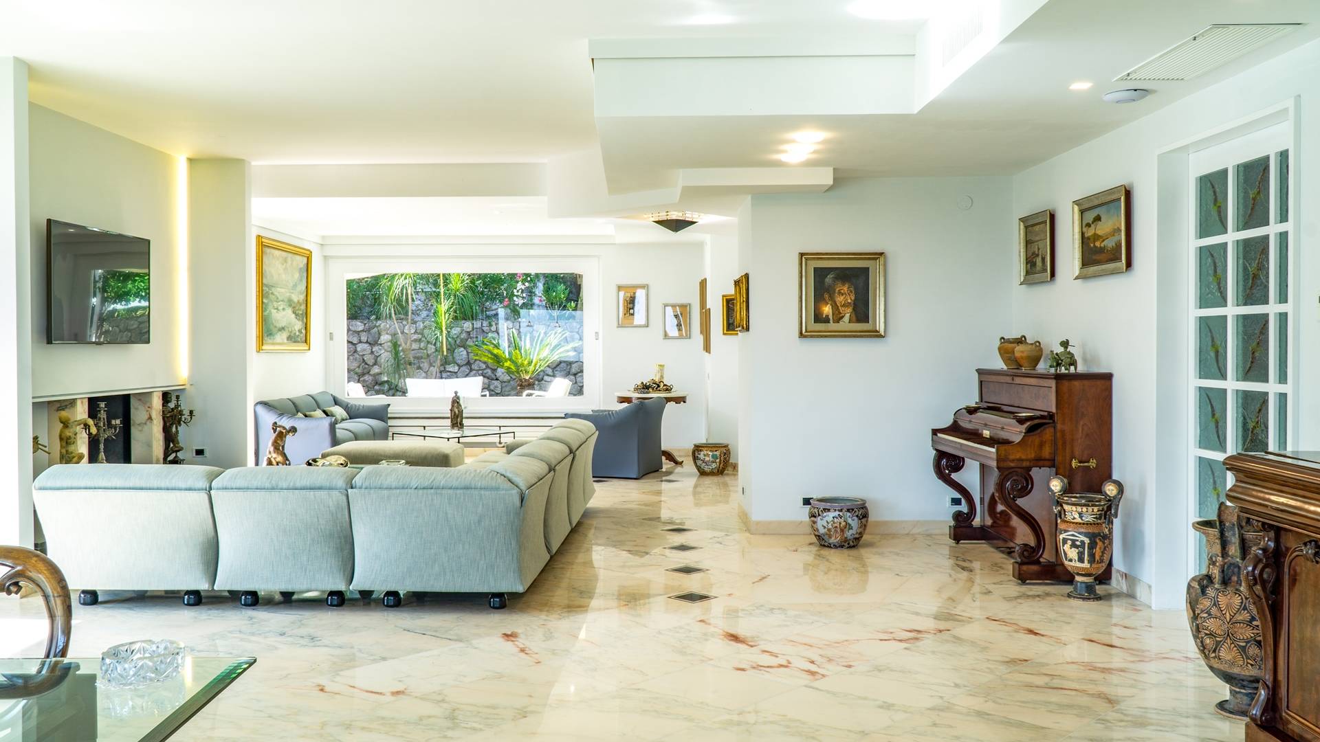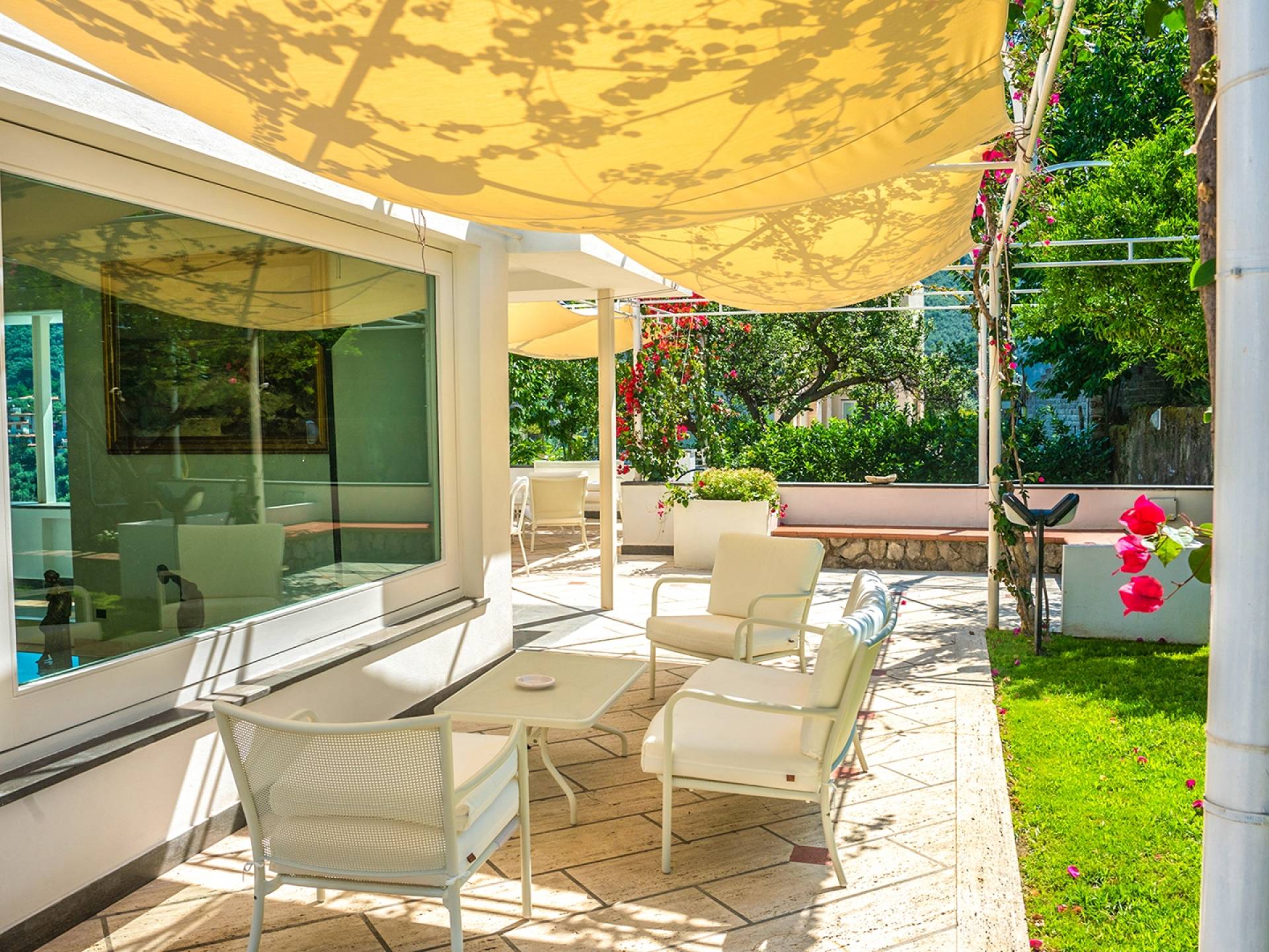 El encantador mobiliario se complementa con antiguos jarrones etruscos y pinturas originales. La sala de estar conduce a la terraza, que se asemeja a la proa de un barco, donde puede sentarse y mirar el mar. Desde aquí admirarás la grandeza del Vesubio y te perderás en los colores del Golfo de Nápoles.