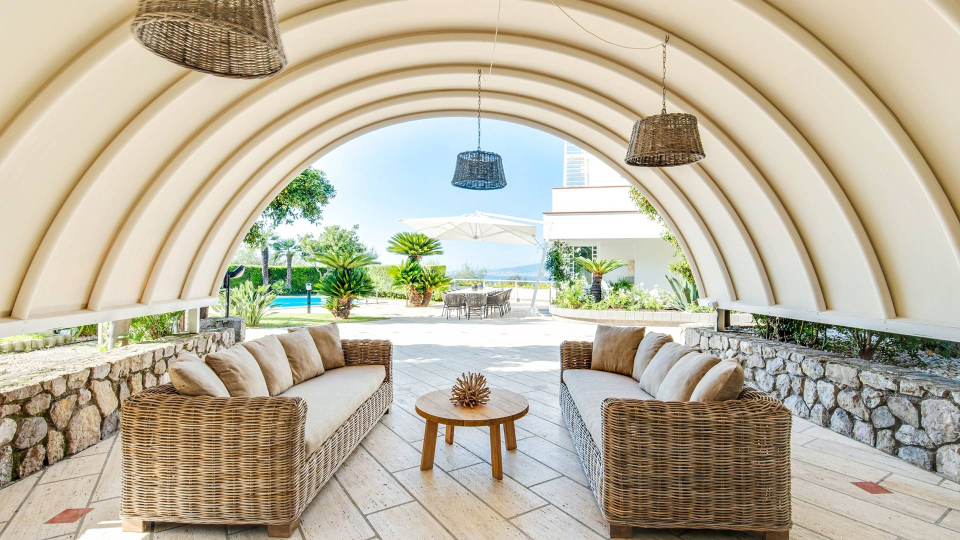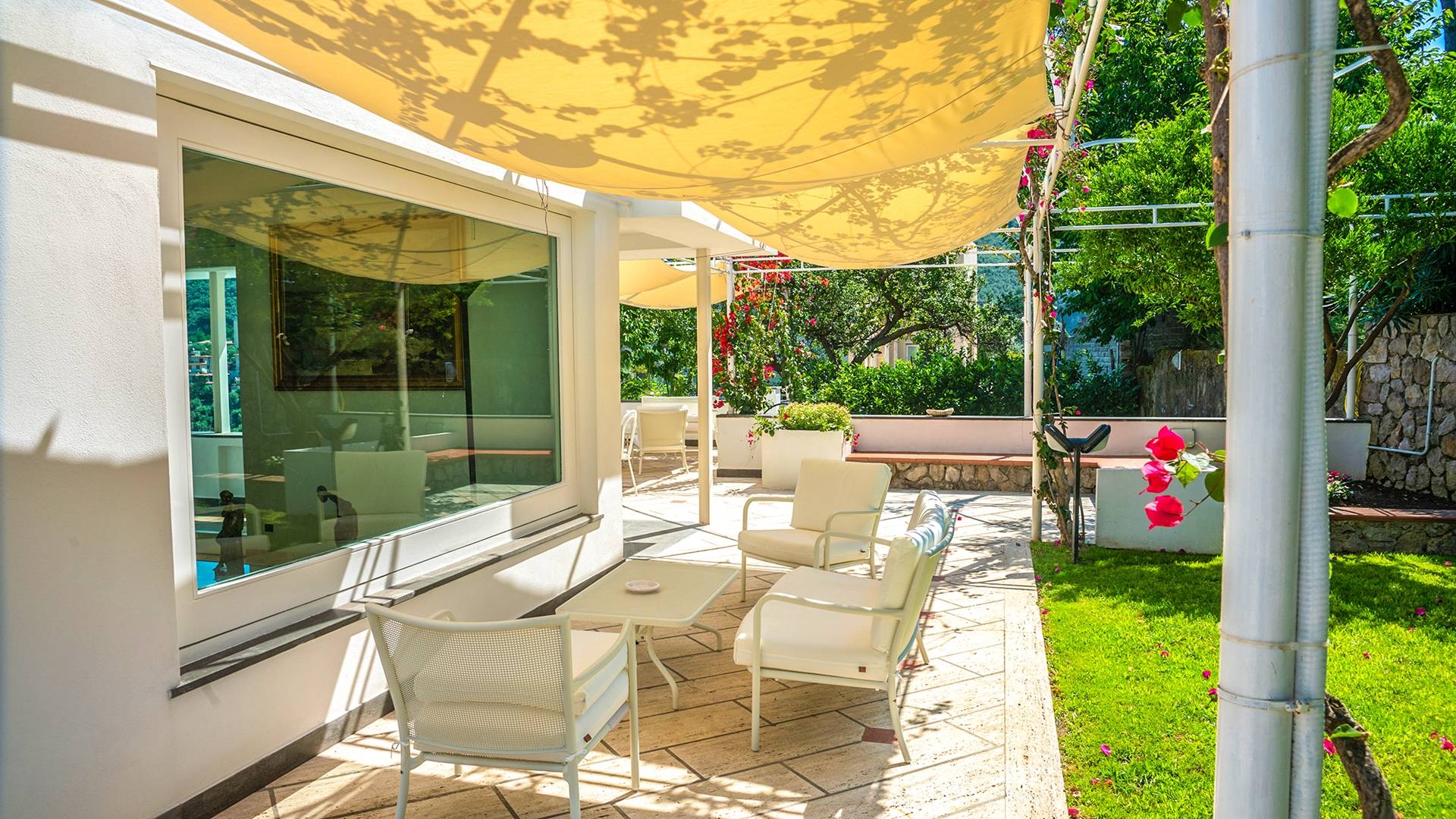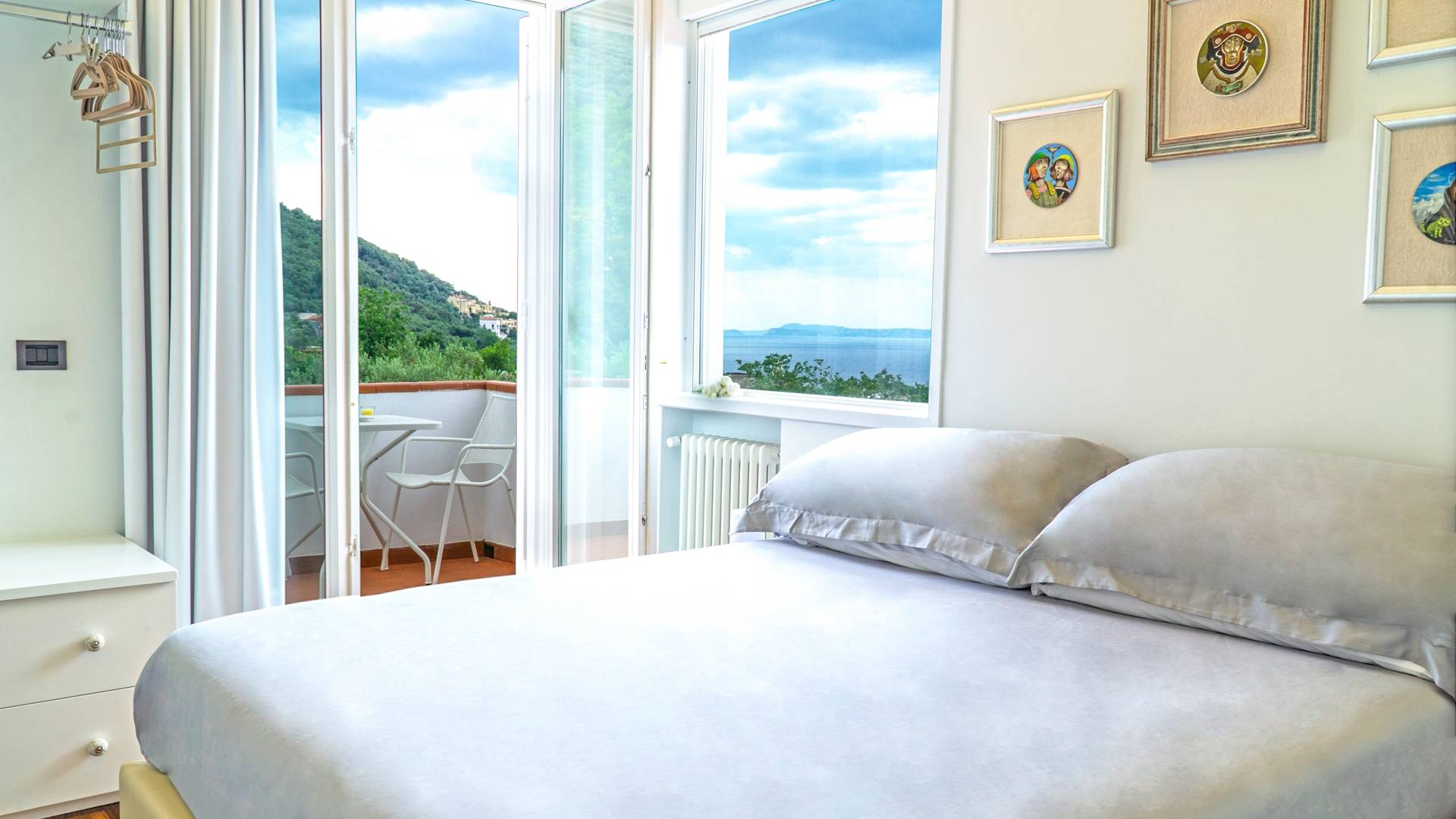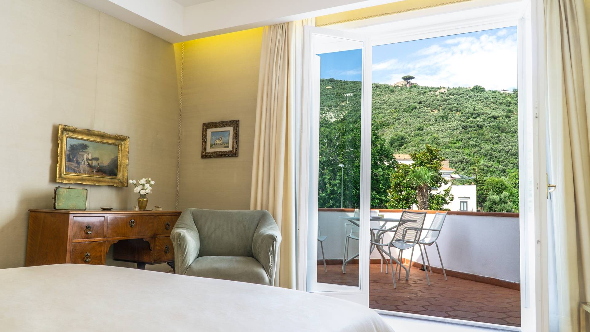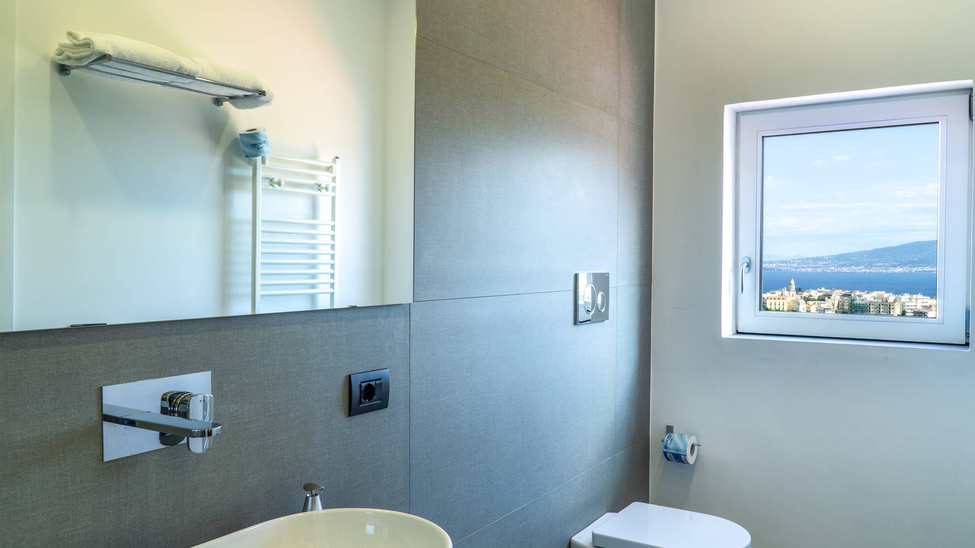 El encantador mobiliario se complementa con antiguos jarrones etruscos y pinturas originales. La sala de estar conduce a la terraza, que se asemeja a la proa de un barco, donde puede sentarse y mirar el mar. Desde aquí admirarás la grandeza del Vesubio y te perderás en los colores del Golfo de Nápoles.