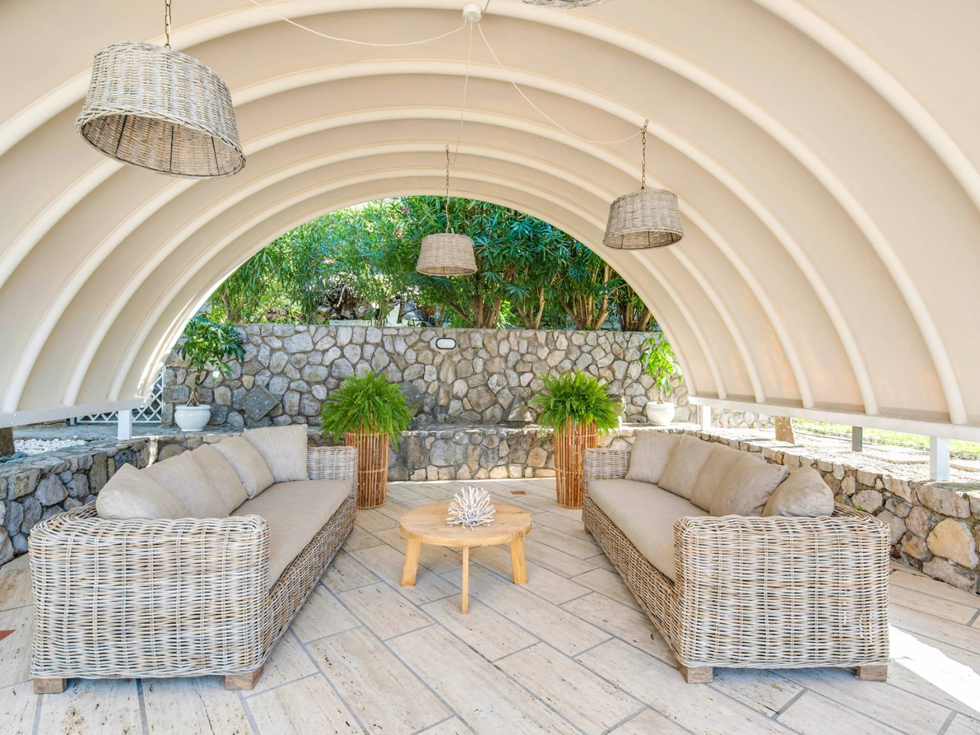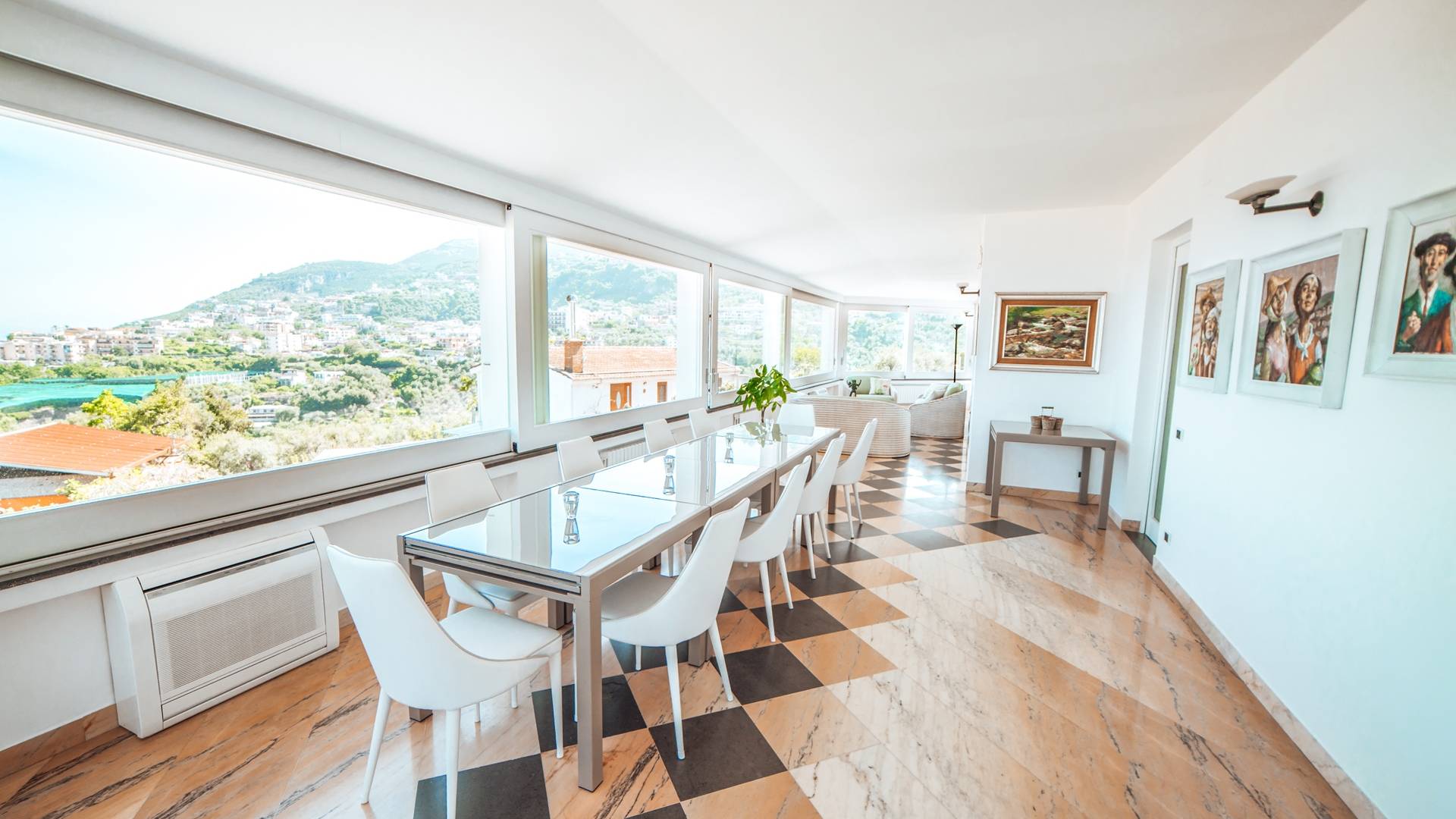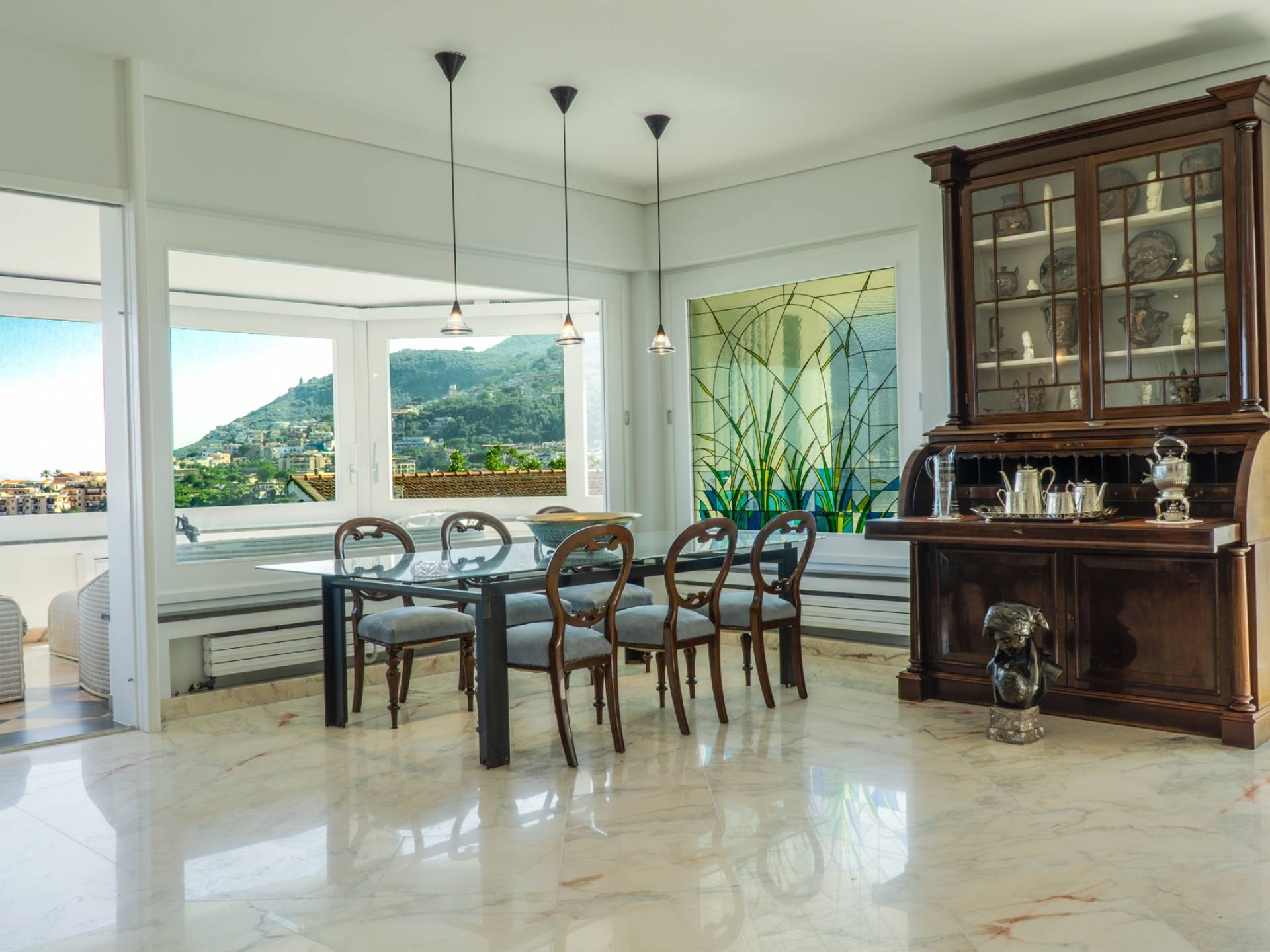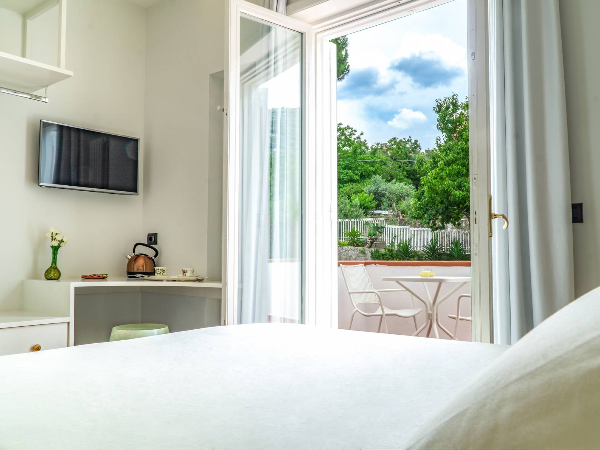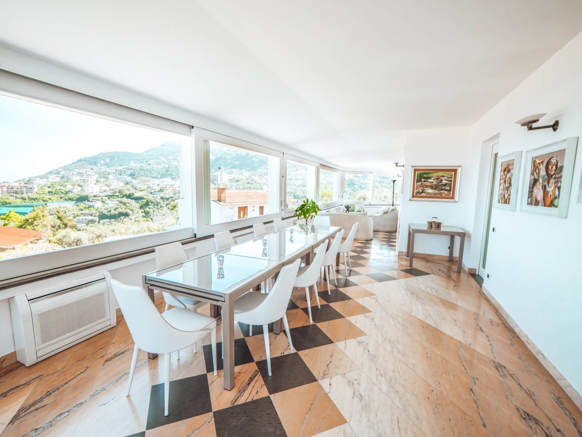 El encantador mobiliario se complementa con antiguos jarrones etruscos y pinturas originales. La sala de estar conduce a la terraza, que se asemeja a la proa de un barco, donde puede sentarse y mirar el mar. Desde aquí admirarás la grandeza del Vesubio y te perderás en los colores del Golfo de Nápoles.