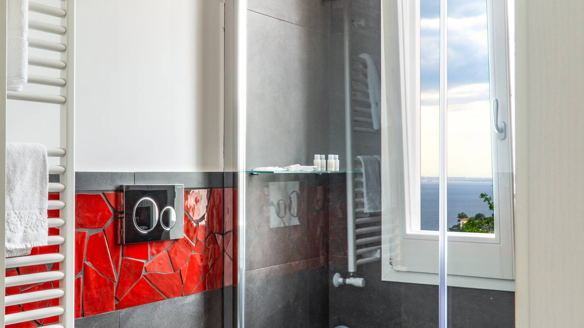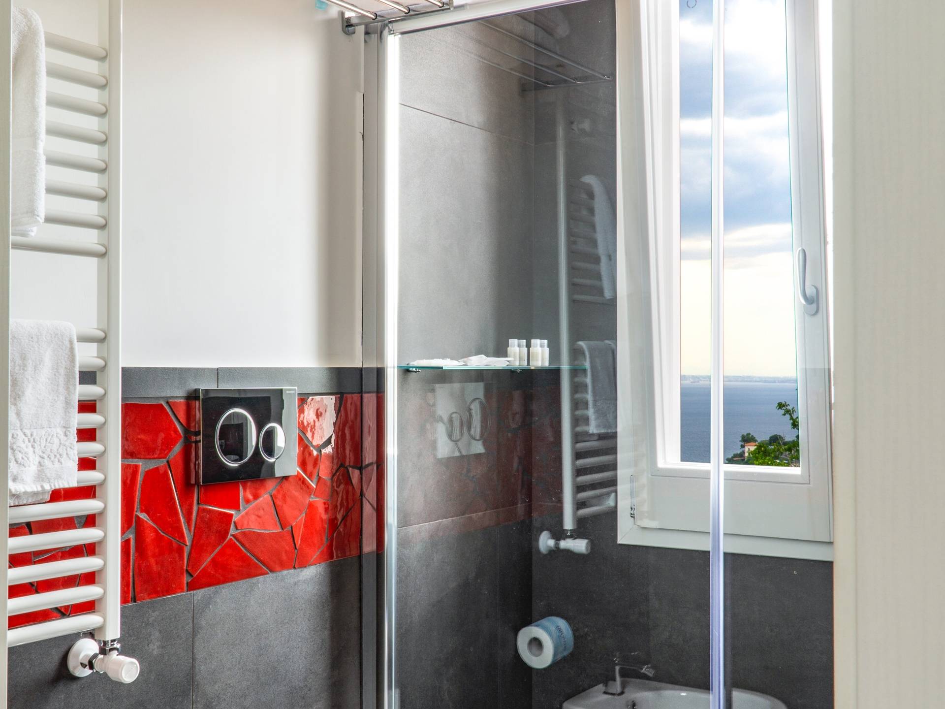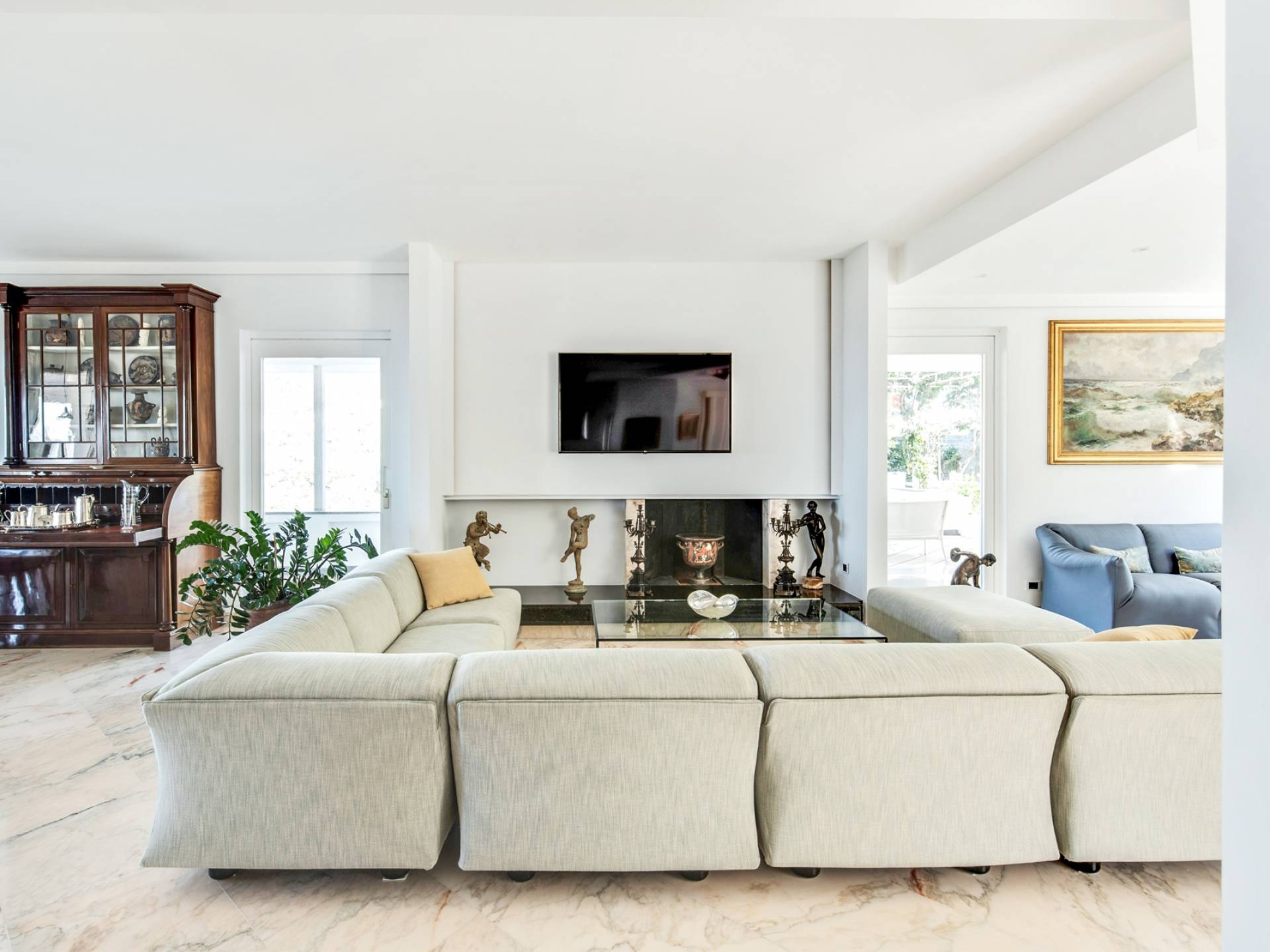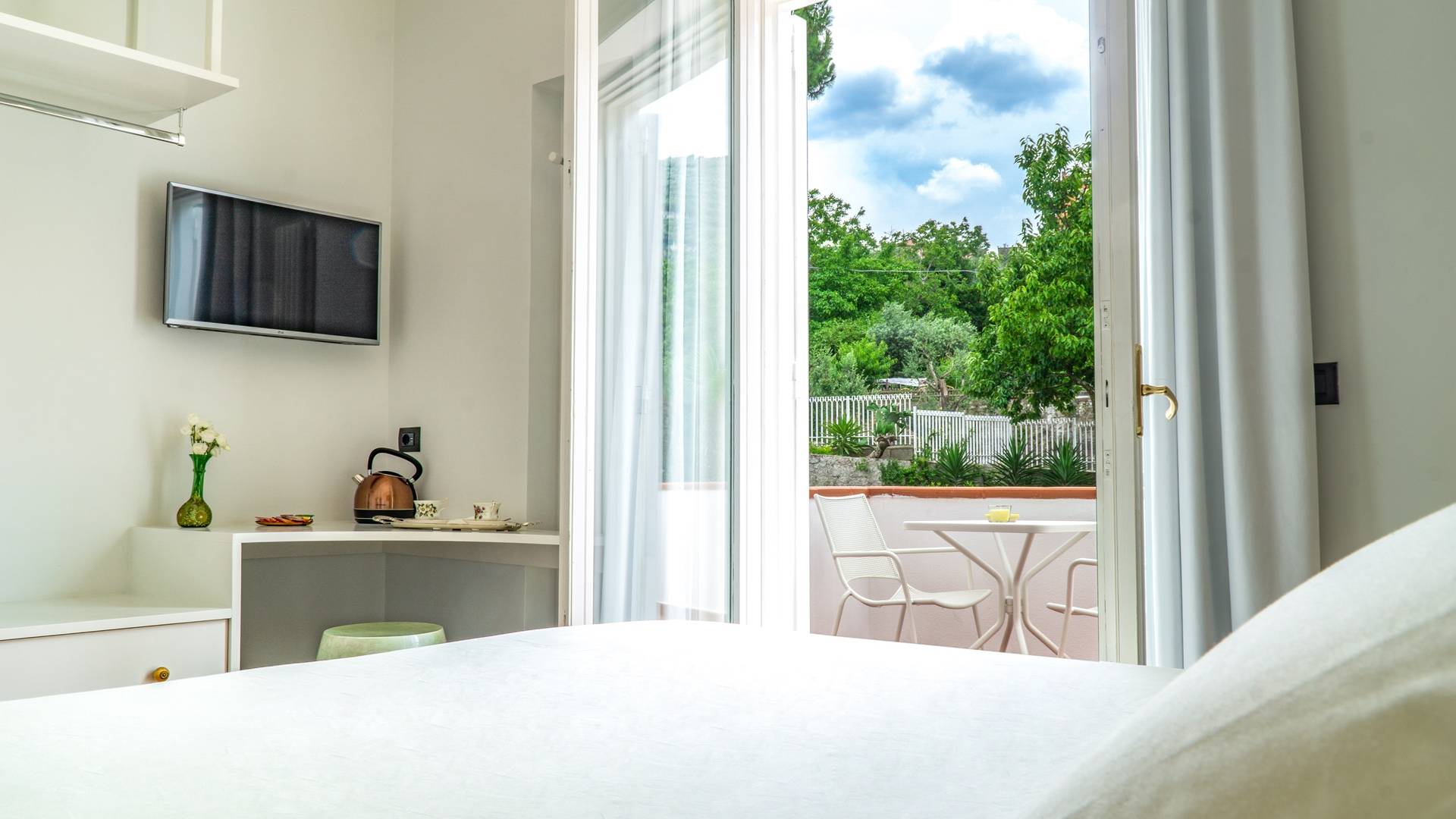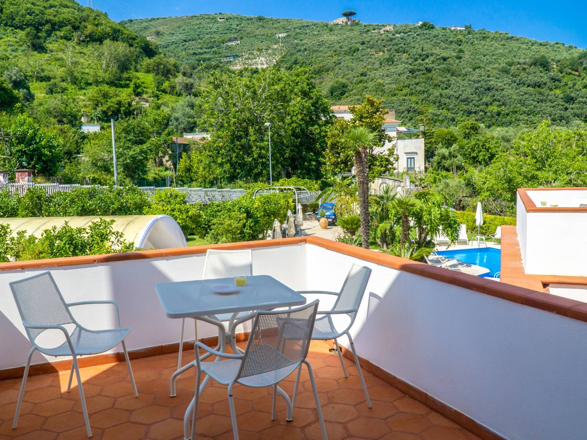 El encantador mobiliario se complementa con antiguos jarrones etruscos y pinturas originales. La sala de estar conduce a la terraza, que se asemeja a la proa de un barco, donde puede sentarse y mirar el mar. Desde aquí admirarás la grandeza del Vesubio y te perderás en los colores del Golfo de Nápoles.