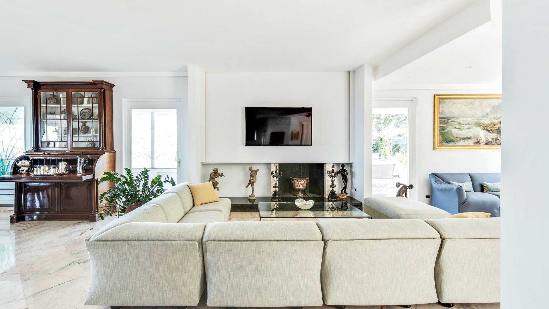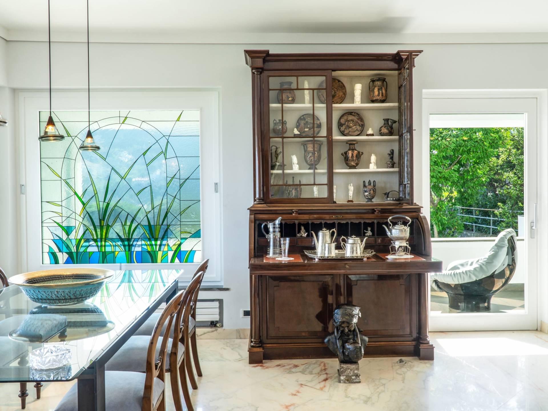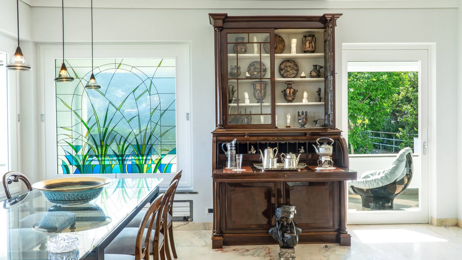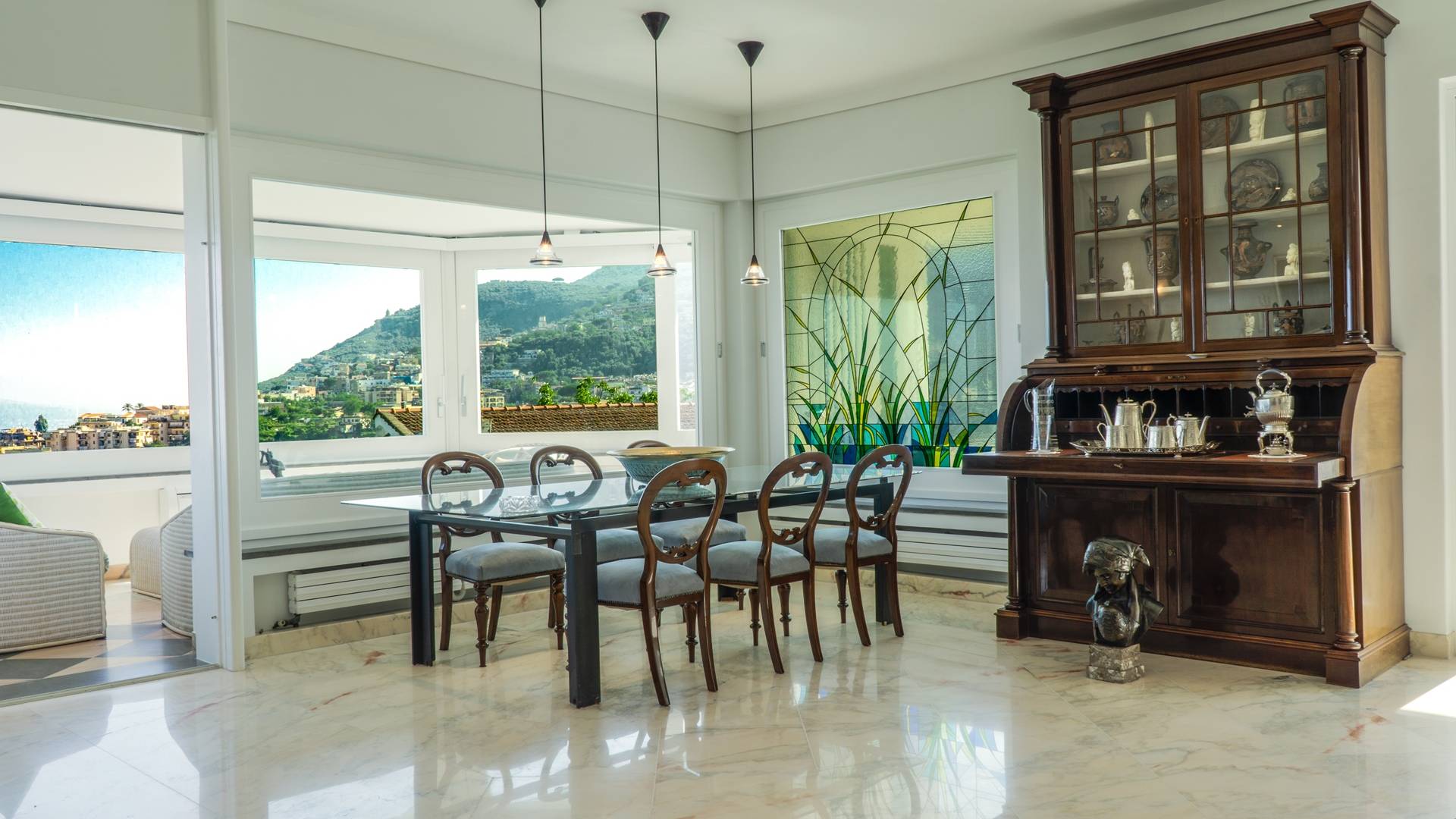 El encantador mobiliario se complementa con antiguos jarrones etruscos y pinturas originales. La sala de estar conduce a la terraza, que se asemeja a la proa de un barco, donde puede sentarse y mirar el mar. Desde aquí admirarás la grandeza del Vesubio y te perderás en los colores del Golfo de Nápoles.