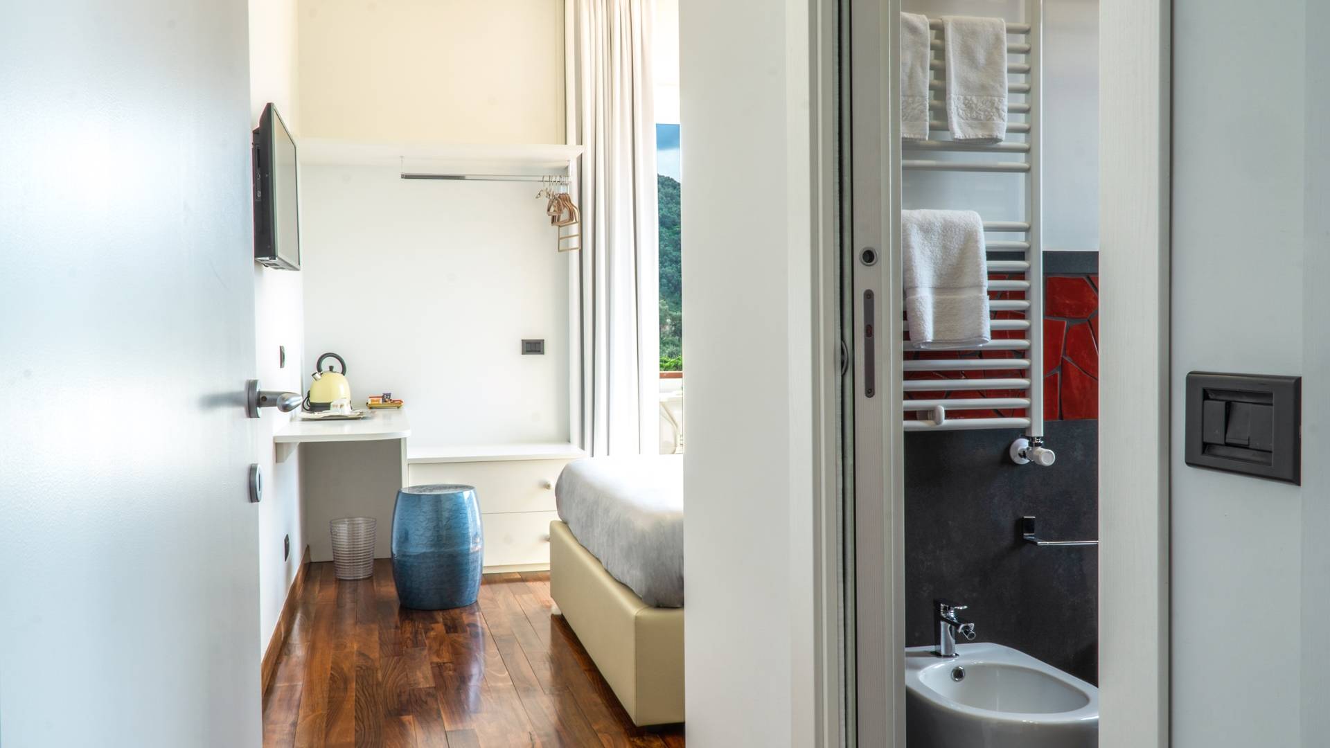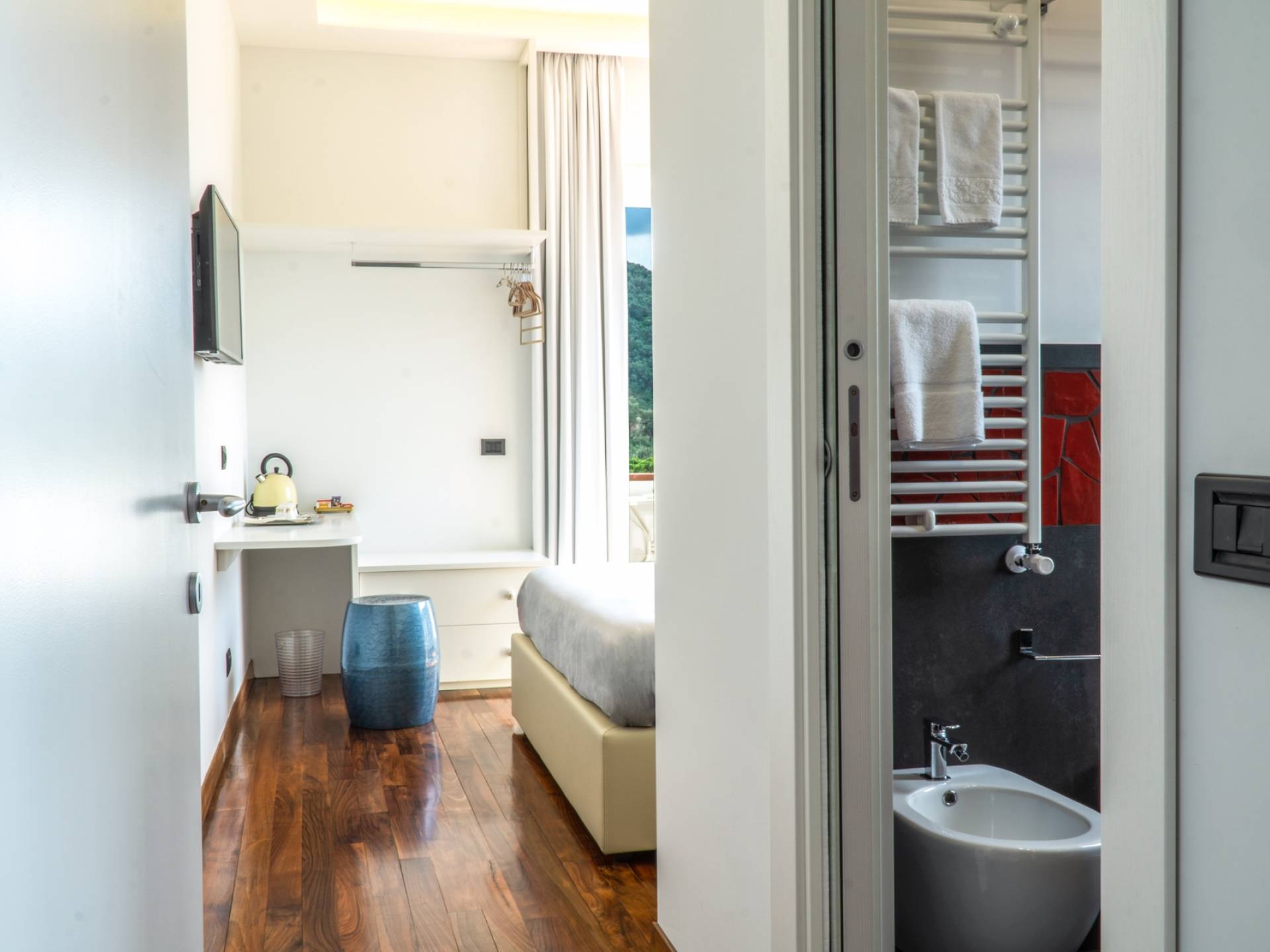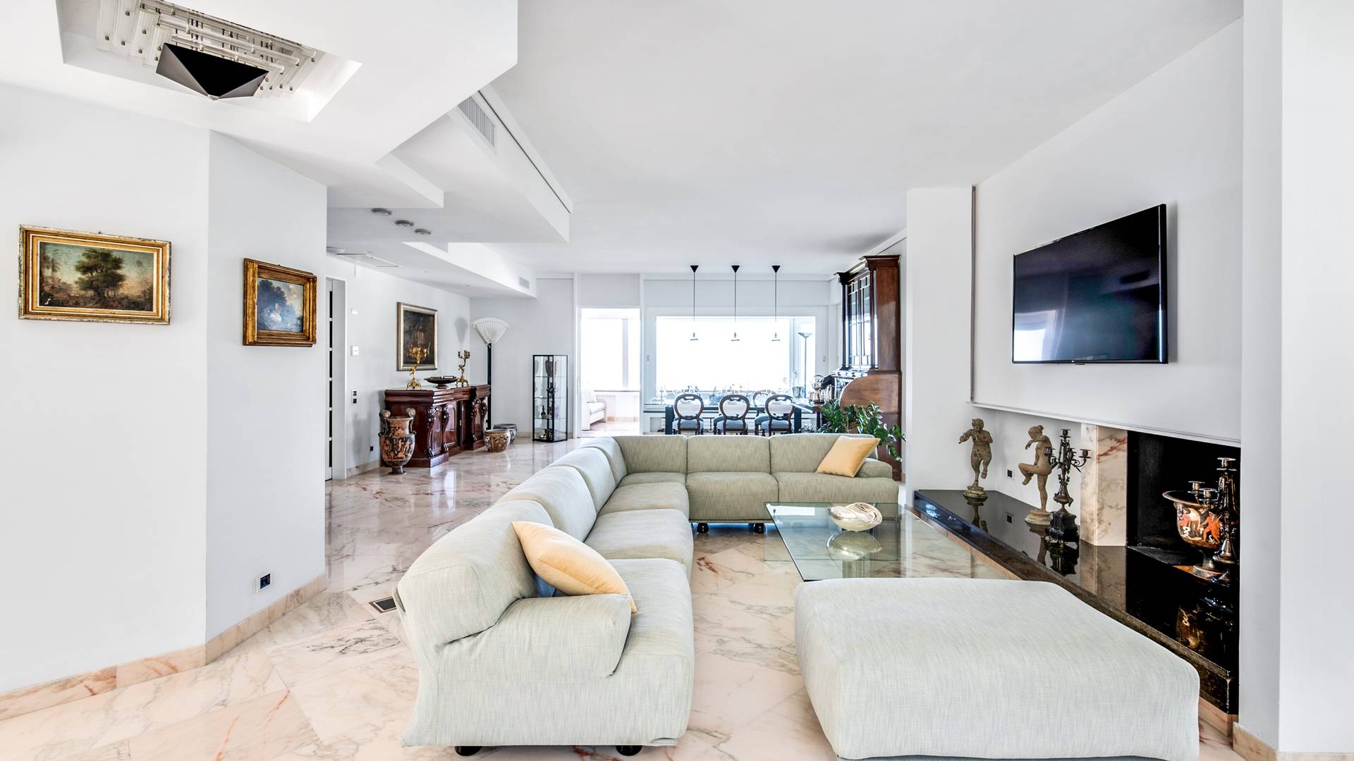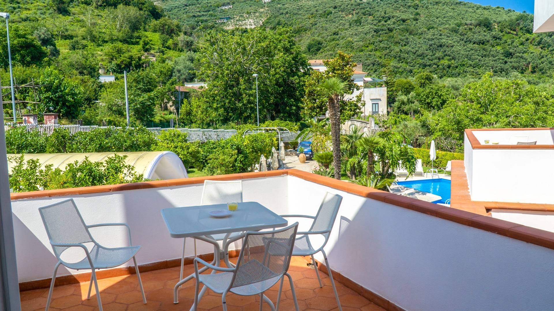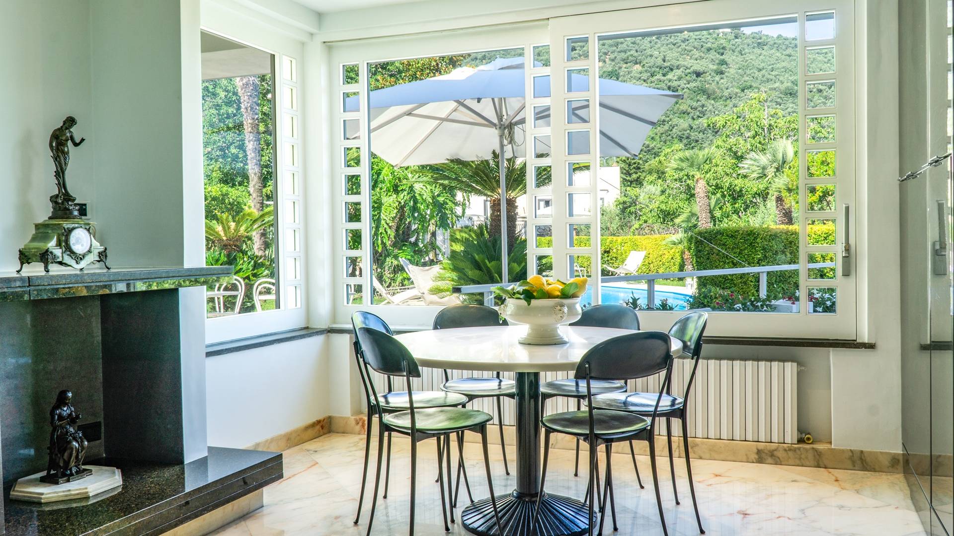 El encantador mobiliario se complementa con antiguos jarrones etruscos y pinturas originales. La sala de estar conduce a la terraza, que se asemeja a la proa de un barco, donde puede sentarse y mirar el mar. Desde aquí admirarás la grandeza del Vesubio y te perderás en los colores del Golfo de Nápoles.