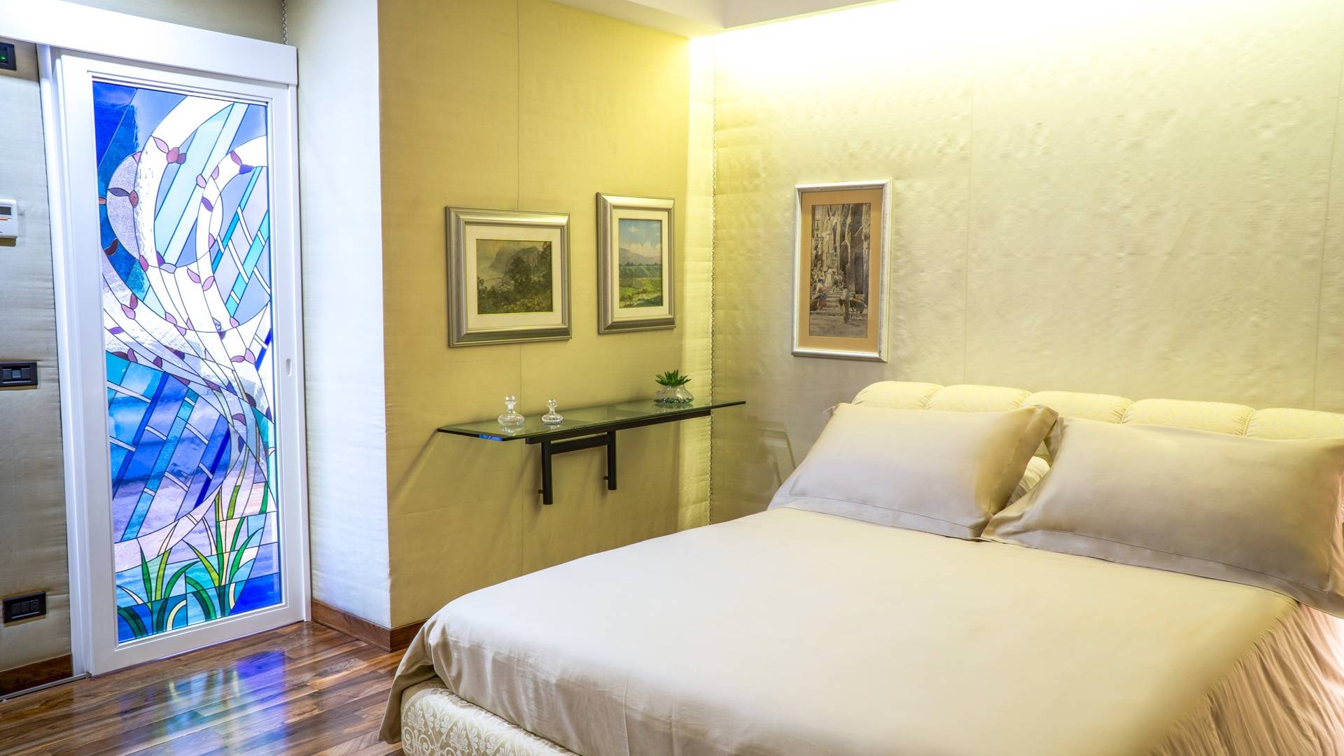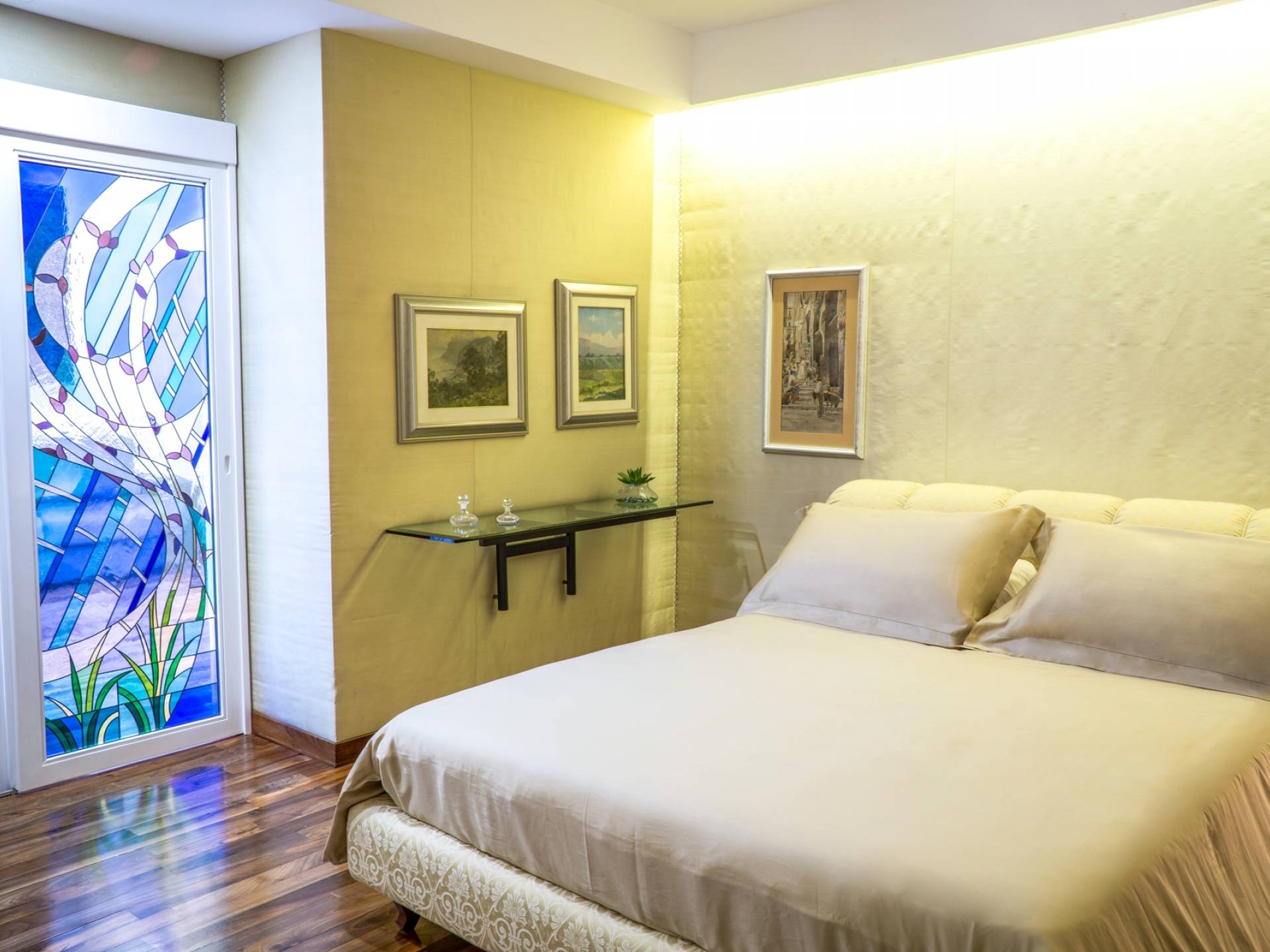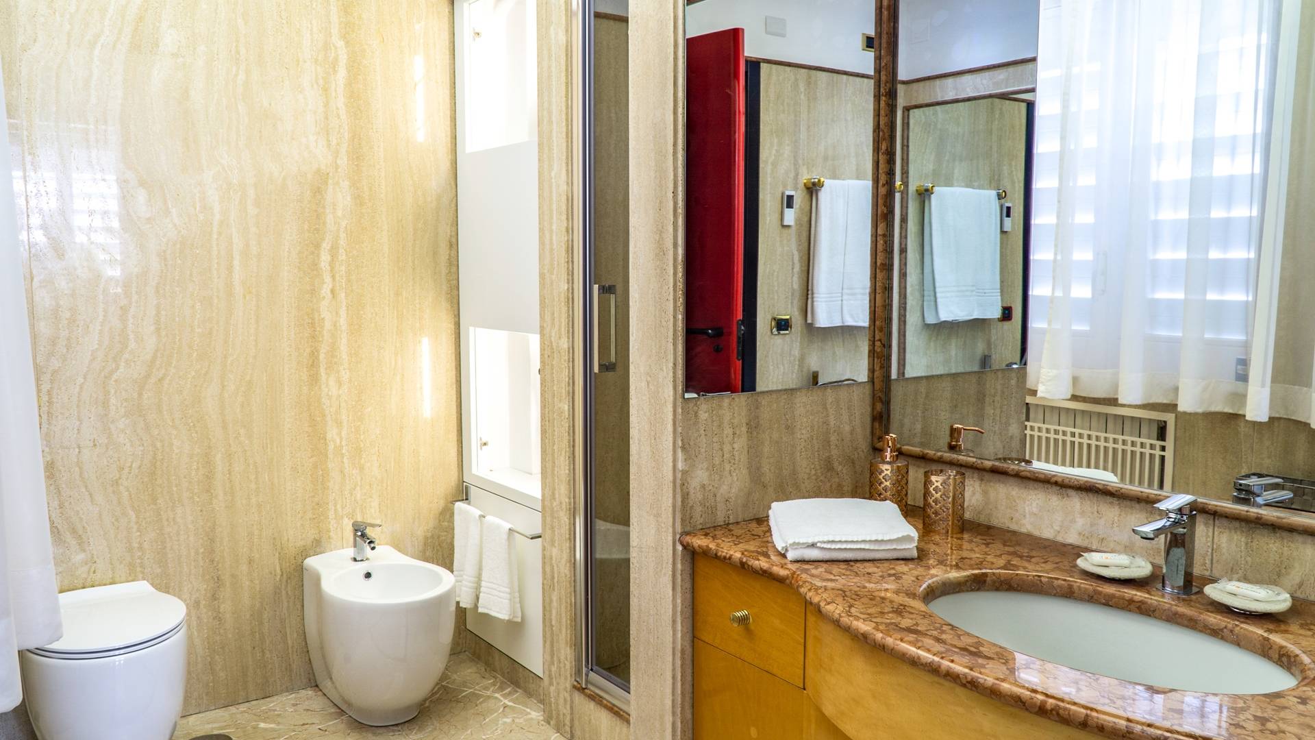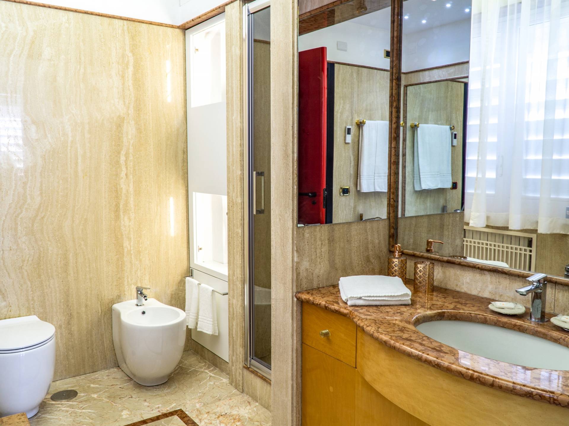 En el área de noche de arriba, en cambio, encontrará 3 habitaciones dobles, cada una con una terraza privada amueblada, cama king-size y un baño muy lujoso, y una suite con bañera de hidromasaje, que es la más grande de las cuatro habitaciones de la Villa. La suite se divide en dos áreas: una sala de estar privada con sofá cama doble y baño privado y el dormitorio principal. Cada habitación tiene una particularidad: trabajos en cobre utilizados como cabecero, paredes decoradas con cuadros que se dirigen a grandes artistas, antiguos jarrones romanos utilizados como mobiliario, baños de mármol travertino y mucho más. Las habitaciones también están equipadas con aire acondicionado para el verano y calefacción para el invierno y TV vía satélite con conexión a Internet.
