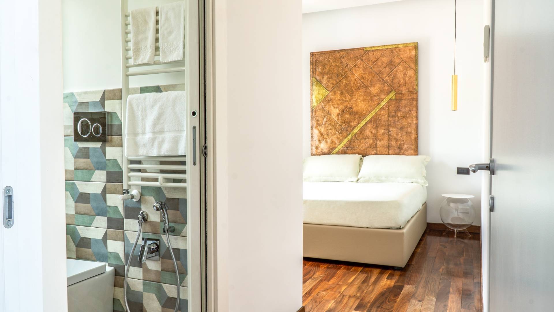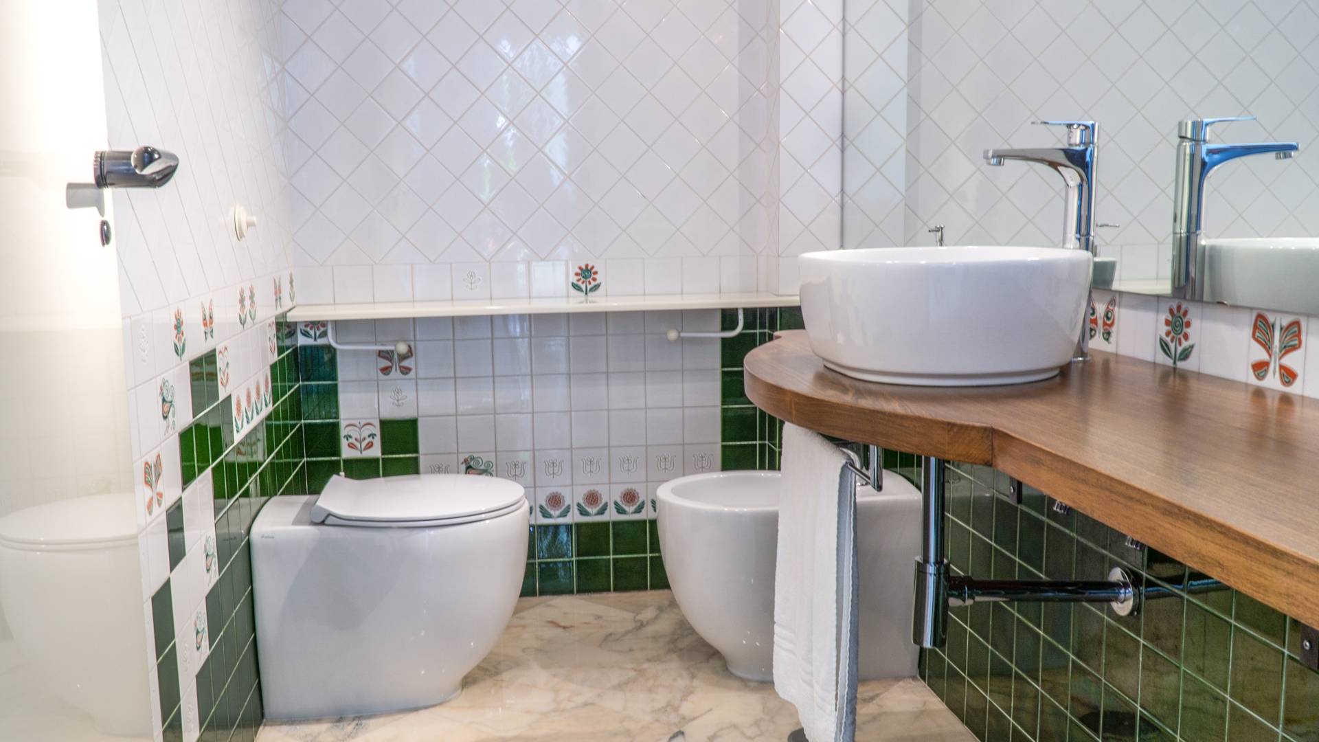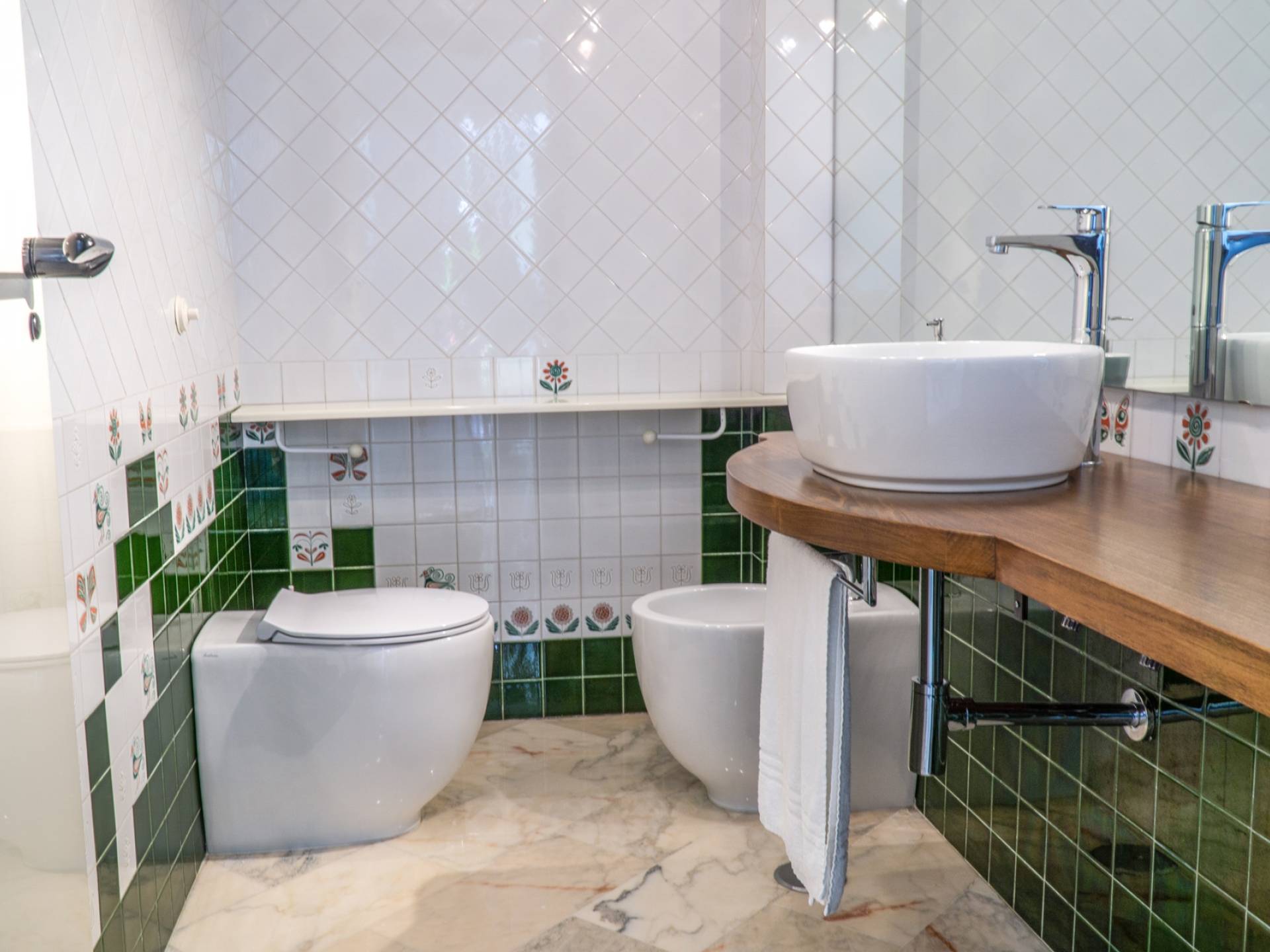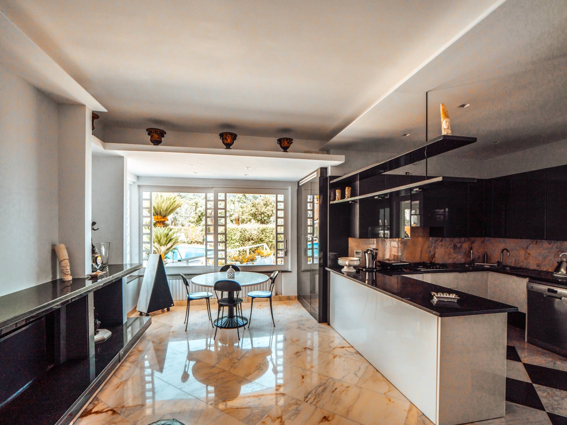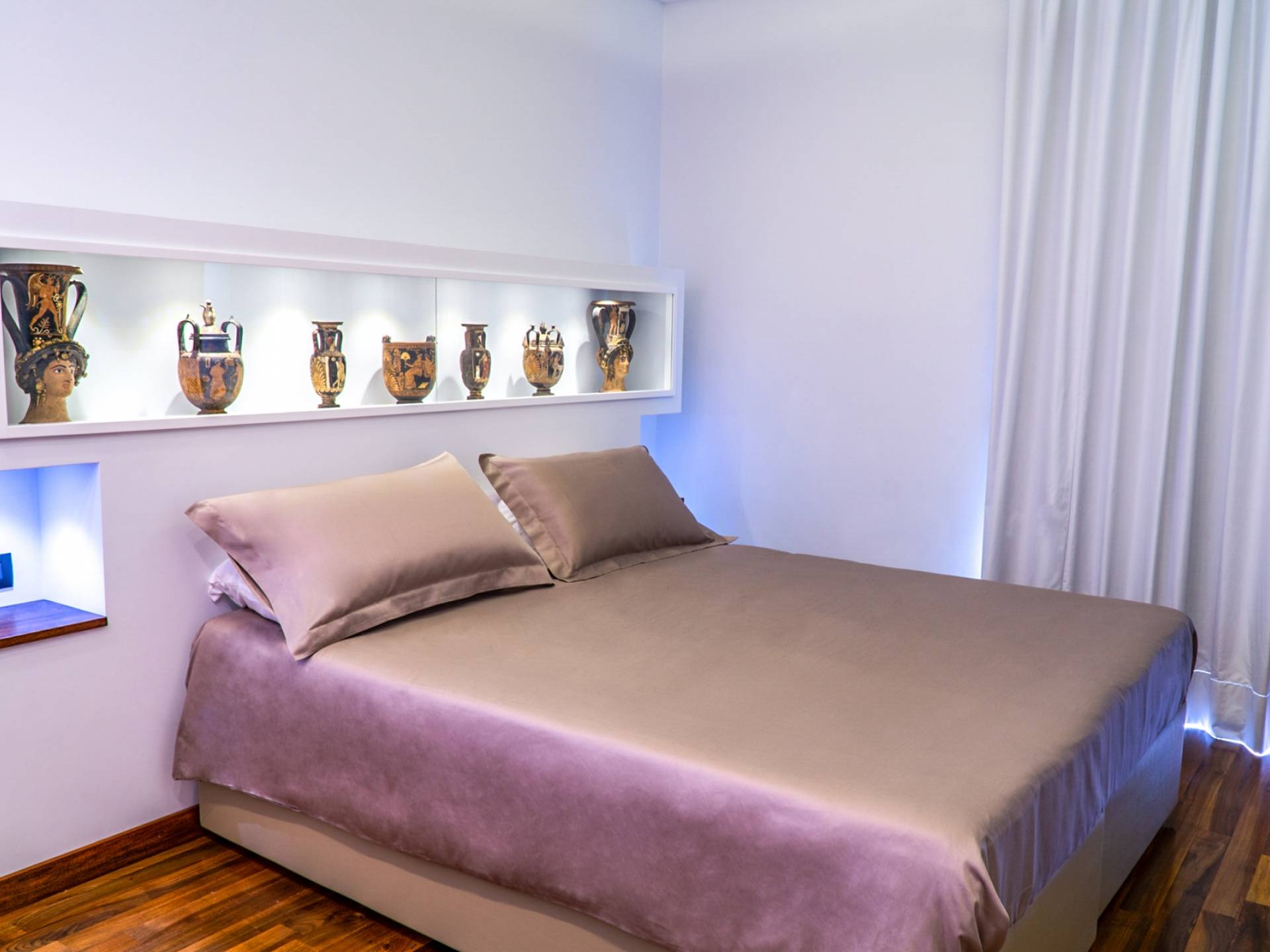 En el área de noche de arriba, en cambio, encontrará 3 habitaciones dobles, cada una con una terraza privada amueblada, cama king-size y un baño muy lujoso, y una suite con bañera de hidromasaje, que es la más grande de las cuatro habitaciones de la Villa. La suite se divide en dos áreas: una sala de estar privada con sofá cama doble y baño privado y el dormitorio principal. Cada habitación tiene una particularidad: trabajos en cobre utilizados como cabecero, paredes decoradas con cuadros que se dirigen a grandes artistas, antiguos jarrones romanos utilizados como mobiliario, baños de mármol travertino y mucho más. Las habitaciones también están equipadas con aire acondicionado para el verano y calefacción para el invierno y TV vía satélite con conexión a Internet.
