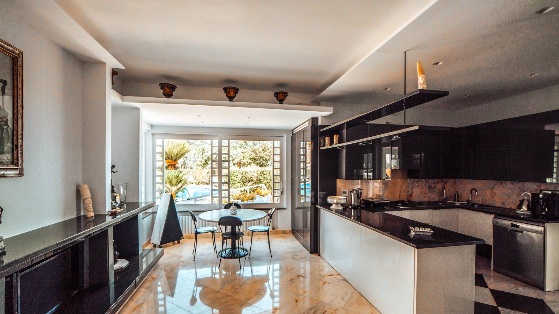 El área está equipada con un horno de leña para pizza y un área de barbacoa con mesas, sillas, un sofá y un sistema de audio Bluetooth. En la sala de estar, también hay una elegante cocina con una encimera de mármol negro brasileño. Además de todo lo necesario para preparar almuerzos y cenas, la cocina está equipada con horno eléctrico, microondas, cafetera, molinillo de café, lavavajillas, vitrocerámica de cinco fuegos, frigorífico y congelador.