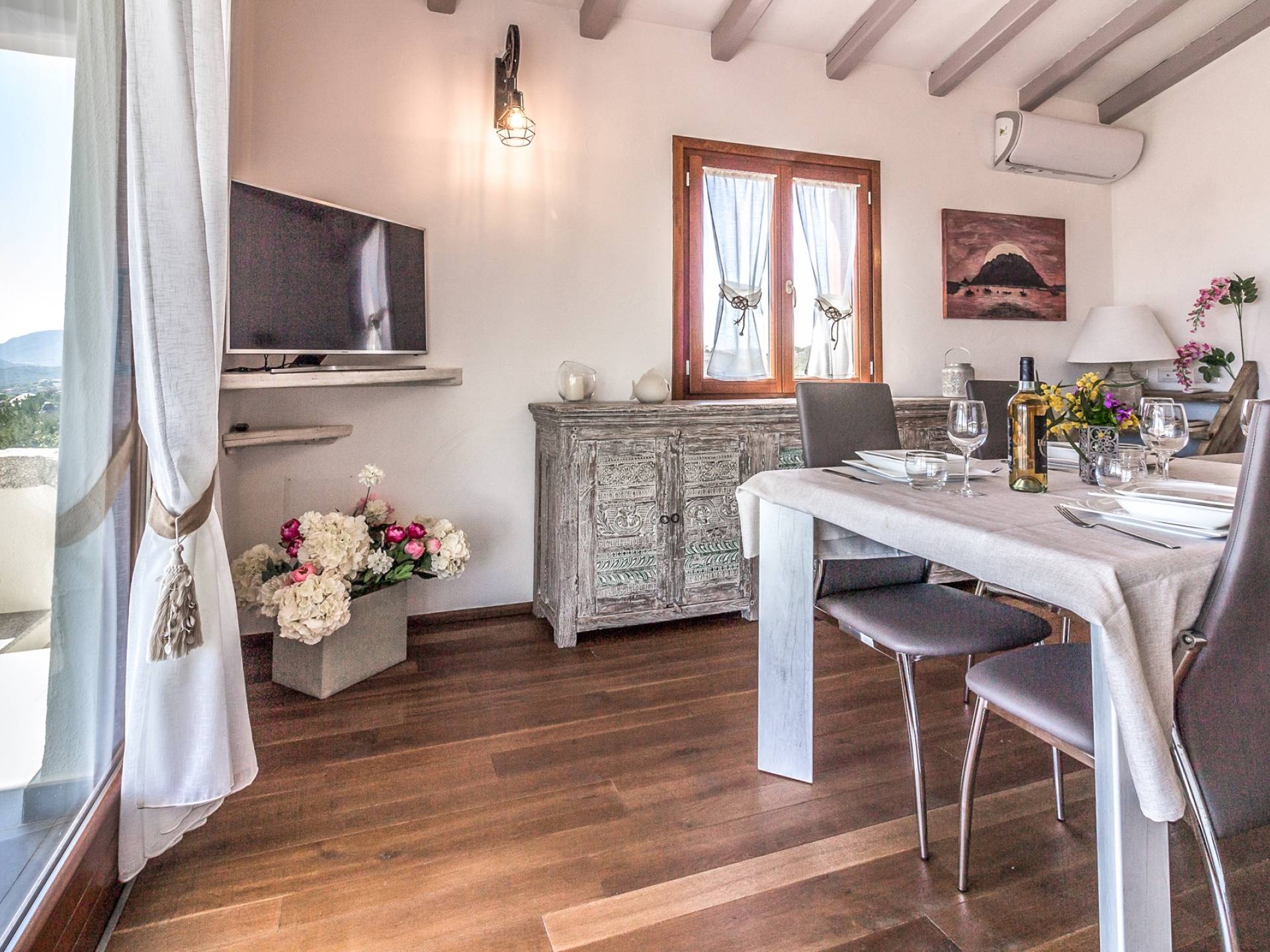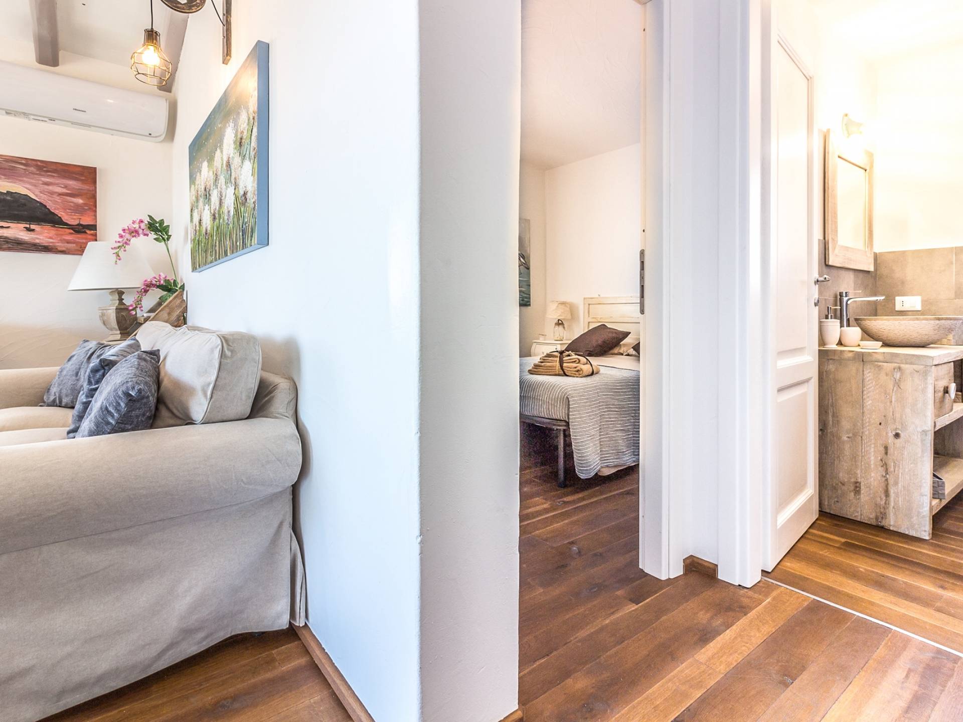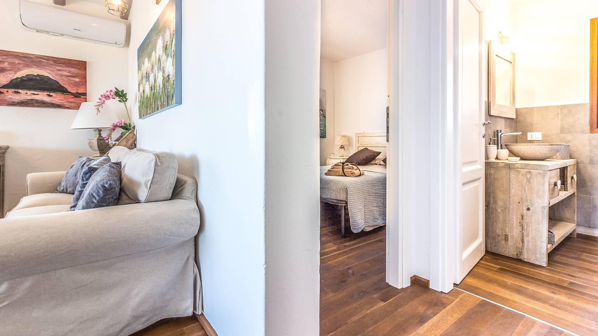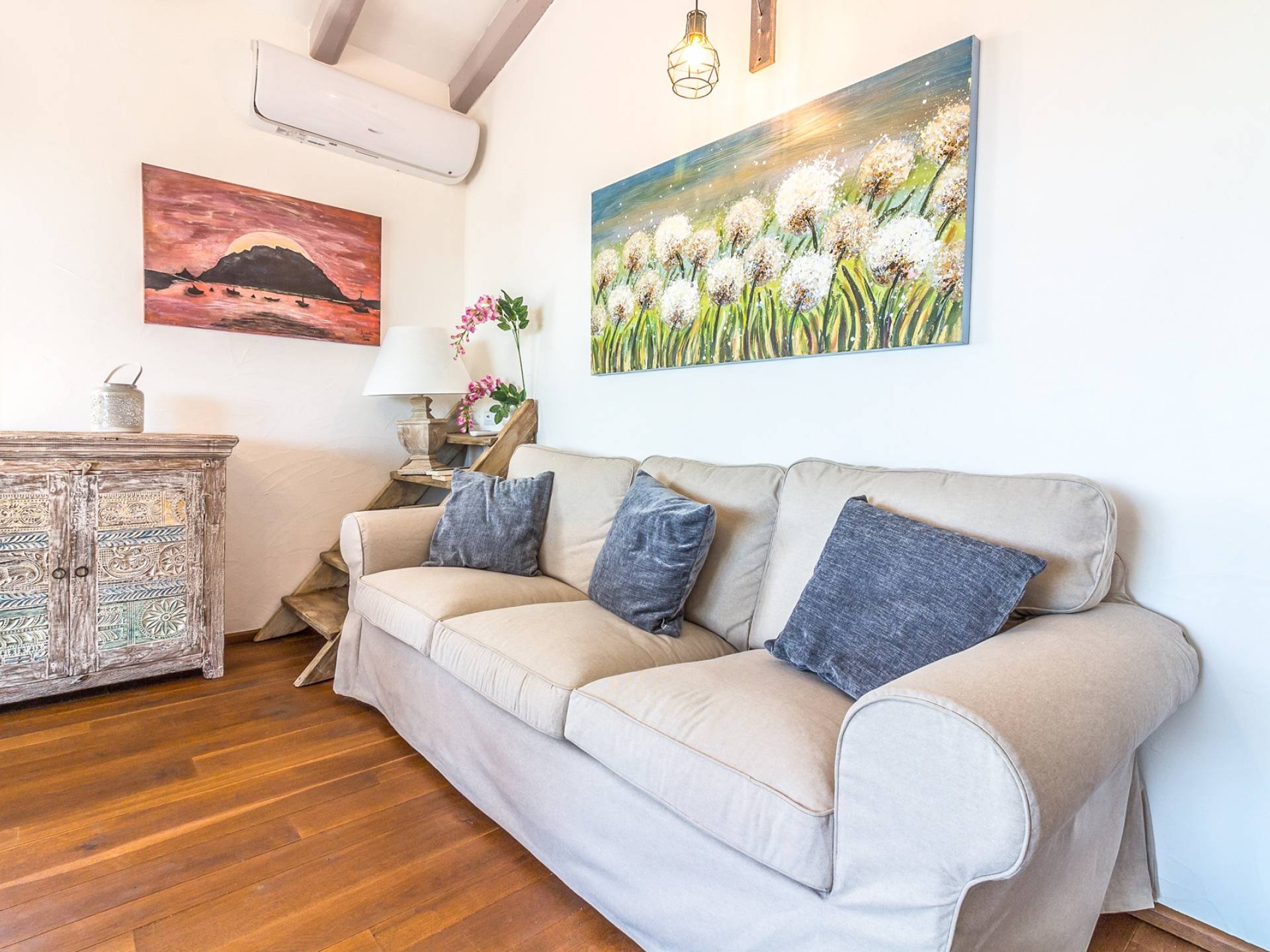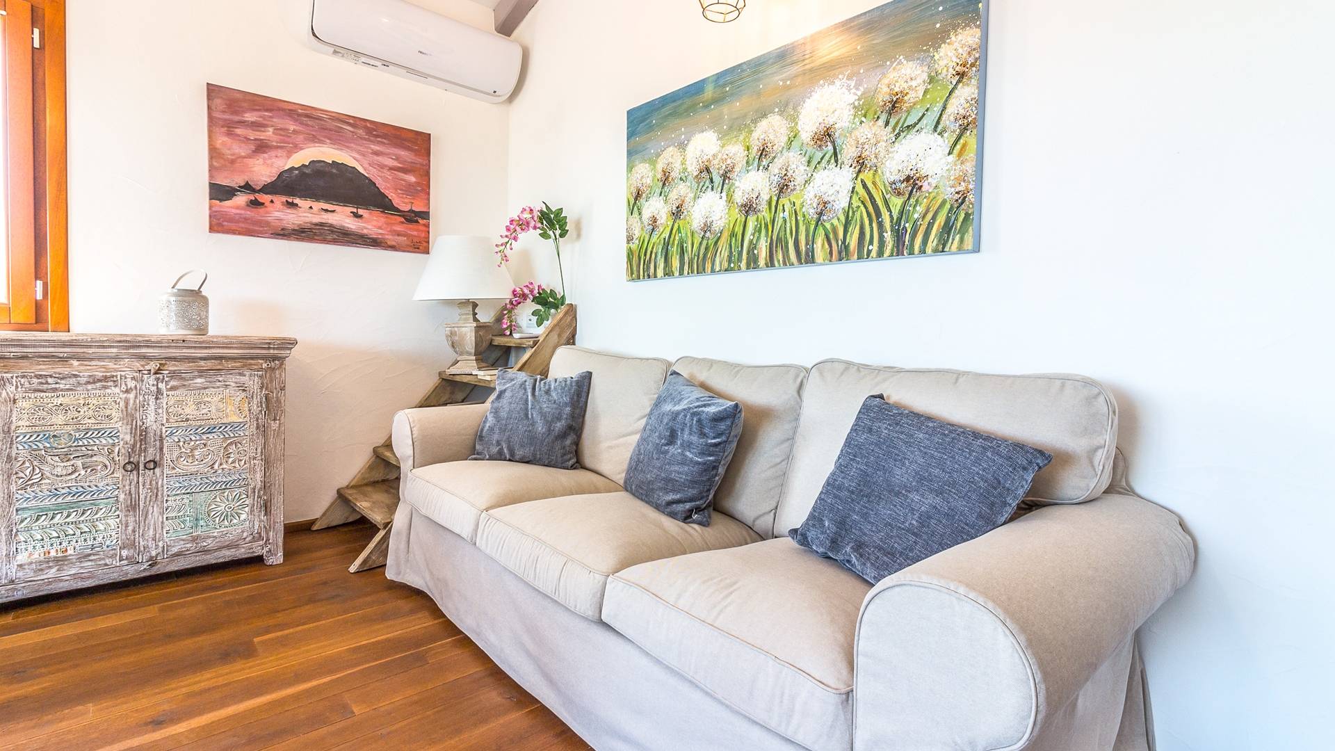 El gran patio exterior de la casa es espacioso y multifuncional con una gran mesa para cenar al aire libre pero también una zona de relax con sofás, sillones y chaise longues. La Villa también es muy acogedora por dentro. La sala de estar en el primer piso, con vigas y cerchas a la vista, es una joya de lujo y encanto. Los suelos de parqué oscuro y las paredes blancas son un matrimonio de elegancia en un espacio confortable adornado con muebles que recuerdan el encanto de la isla. La sala de estar en la planta baja también es particularmente luminosa y acogedora.
