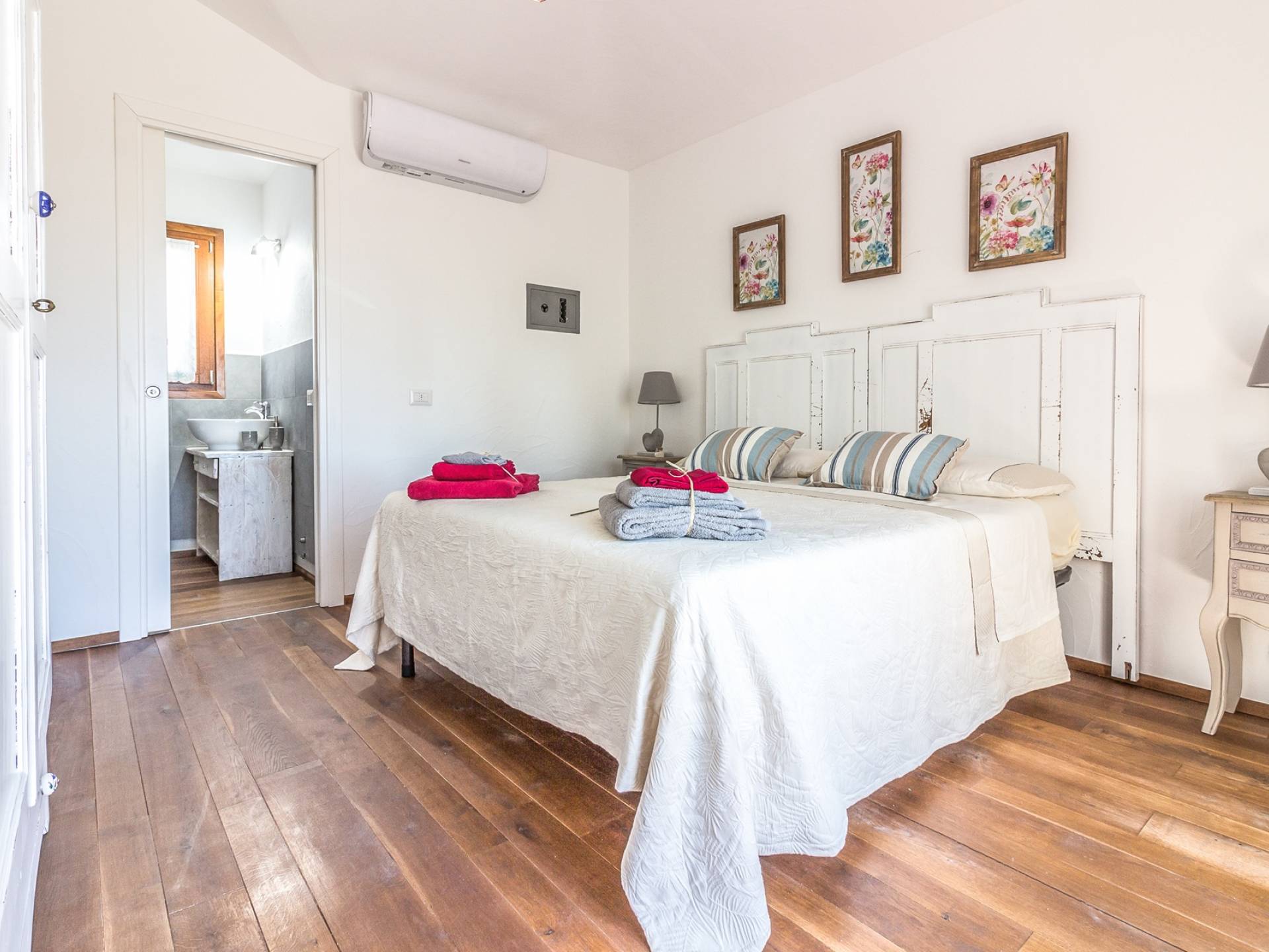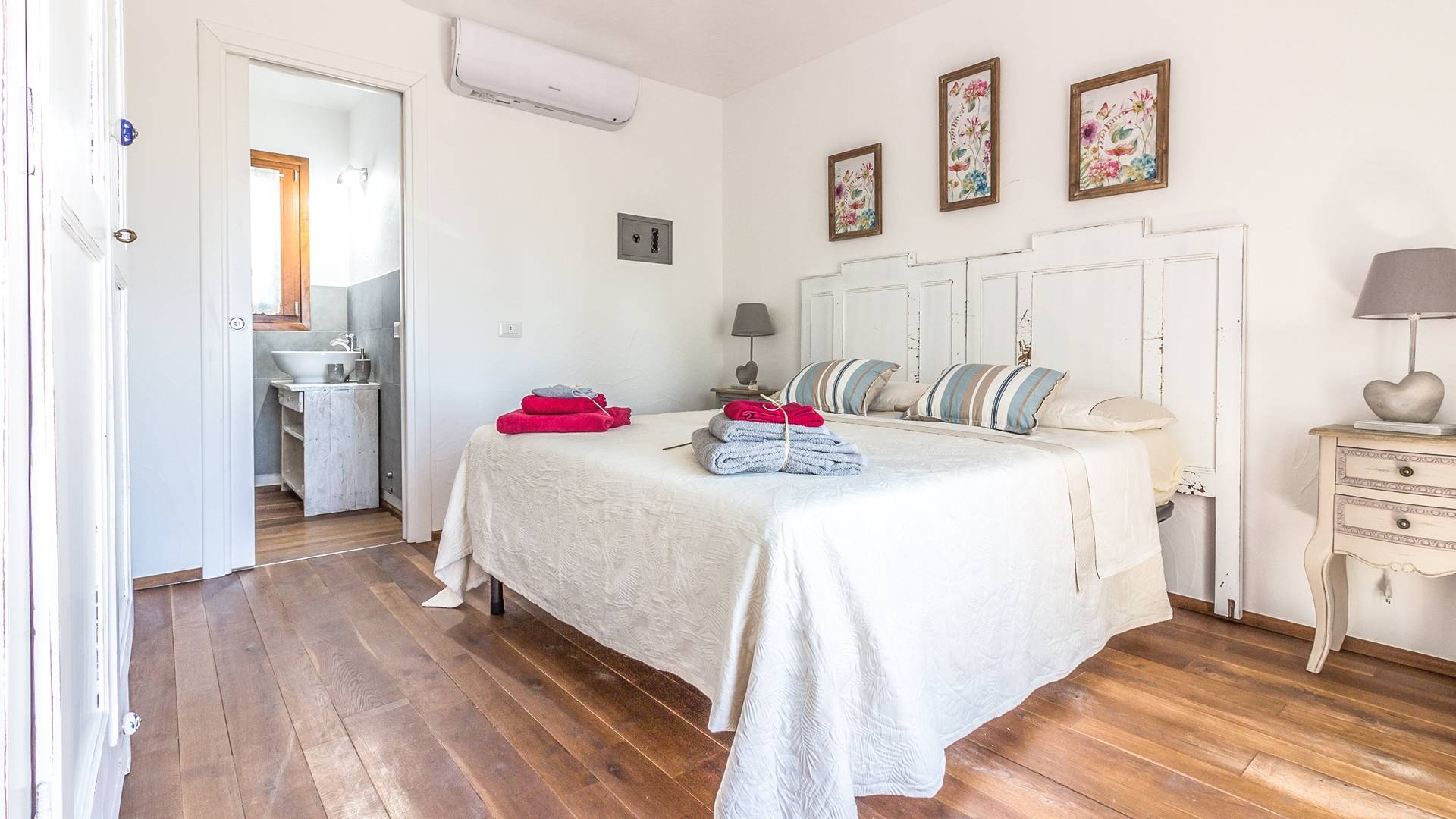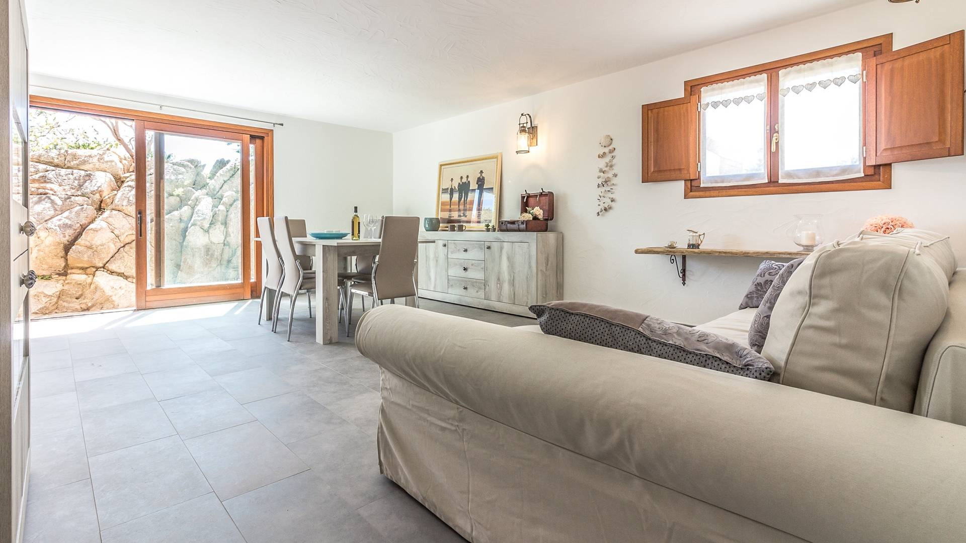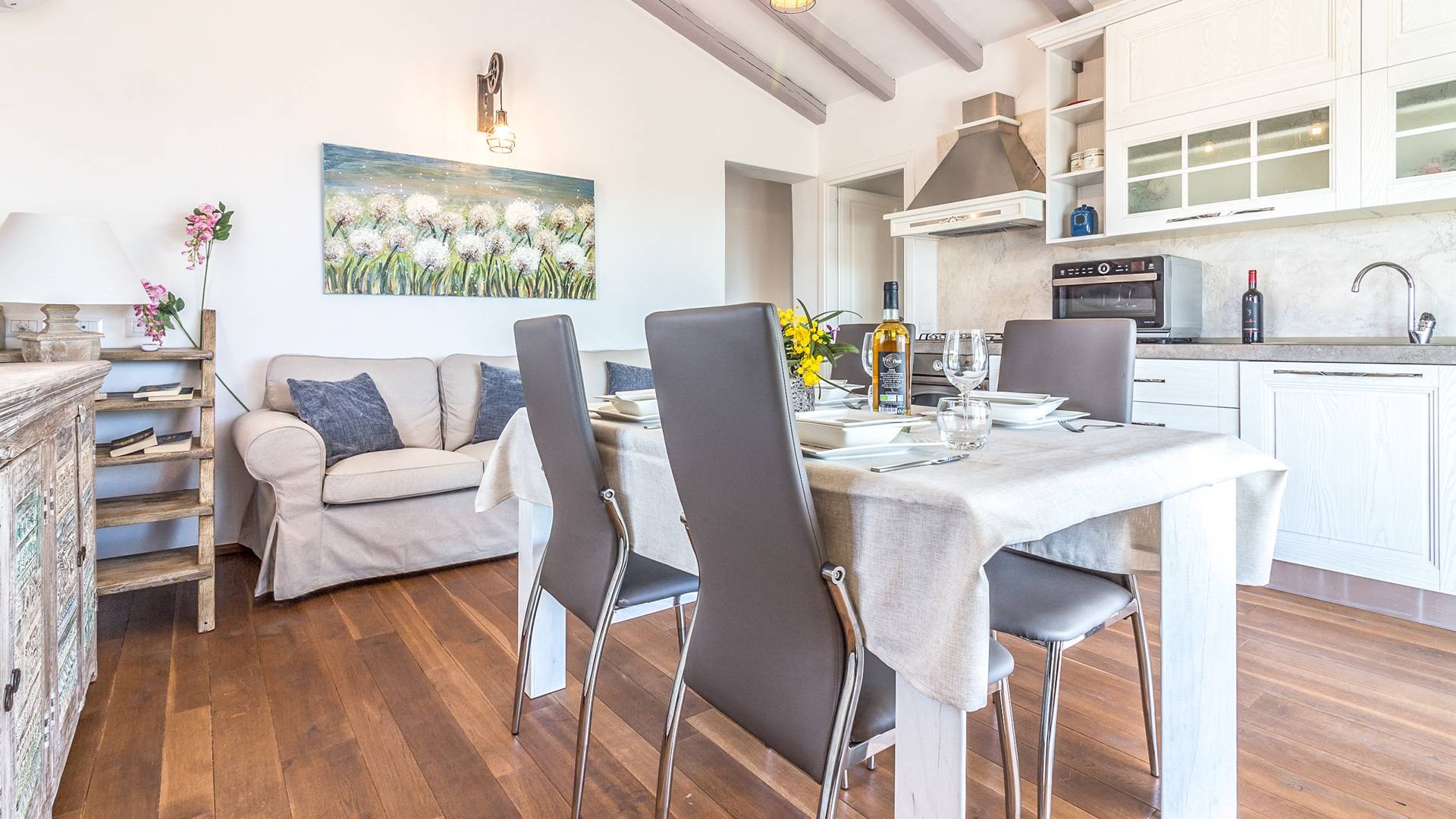 El gran patio exterior de la casa es espacioso y multifuncional con una gran mesa para cenar al aire libre pero también una zona de relax con sofás, sillones y chaise longues. La Villa también es muy acogedora por dentro. La sala de estar en el primer piso, con vigas y cerchas a la vista, es una joya de lujo y encanto. Los suelos de parqué oscuro y las paredes blancas son un matrimonio de elegancia en un espacio confortable adornado con muebles que recuerdan el encanto de la isla. La sala de estar en la planta baja también es particularmente luminosa y acogedora.