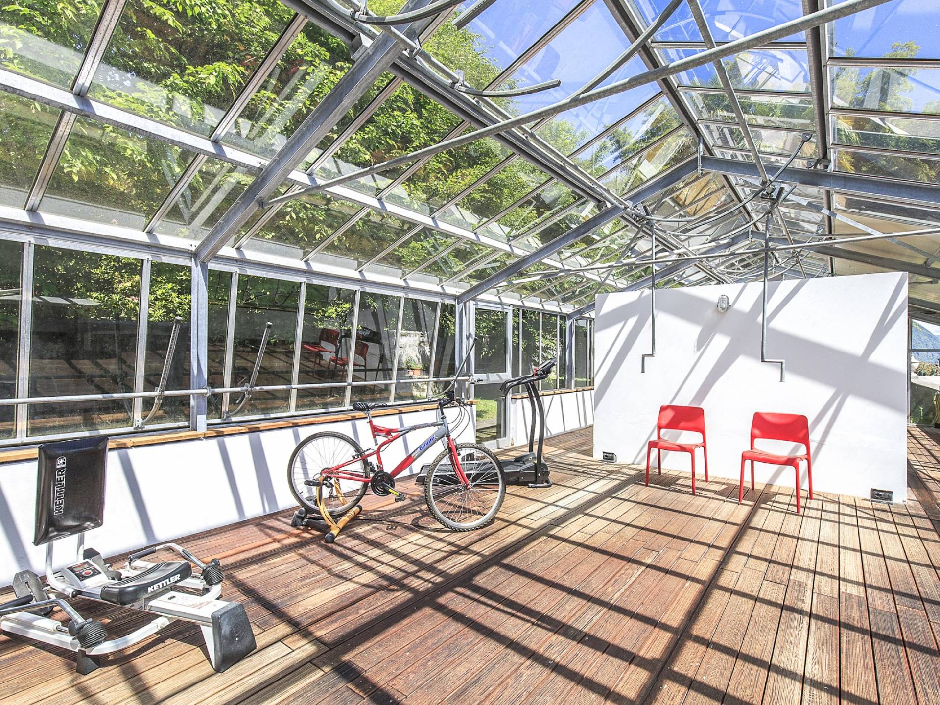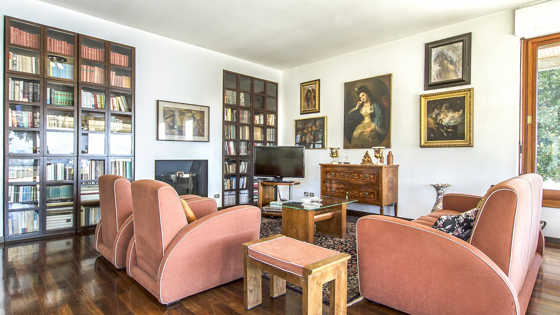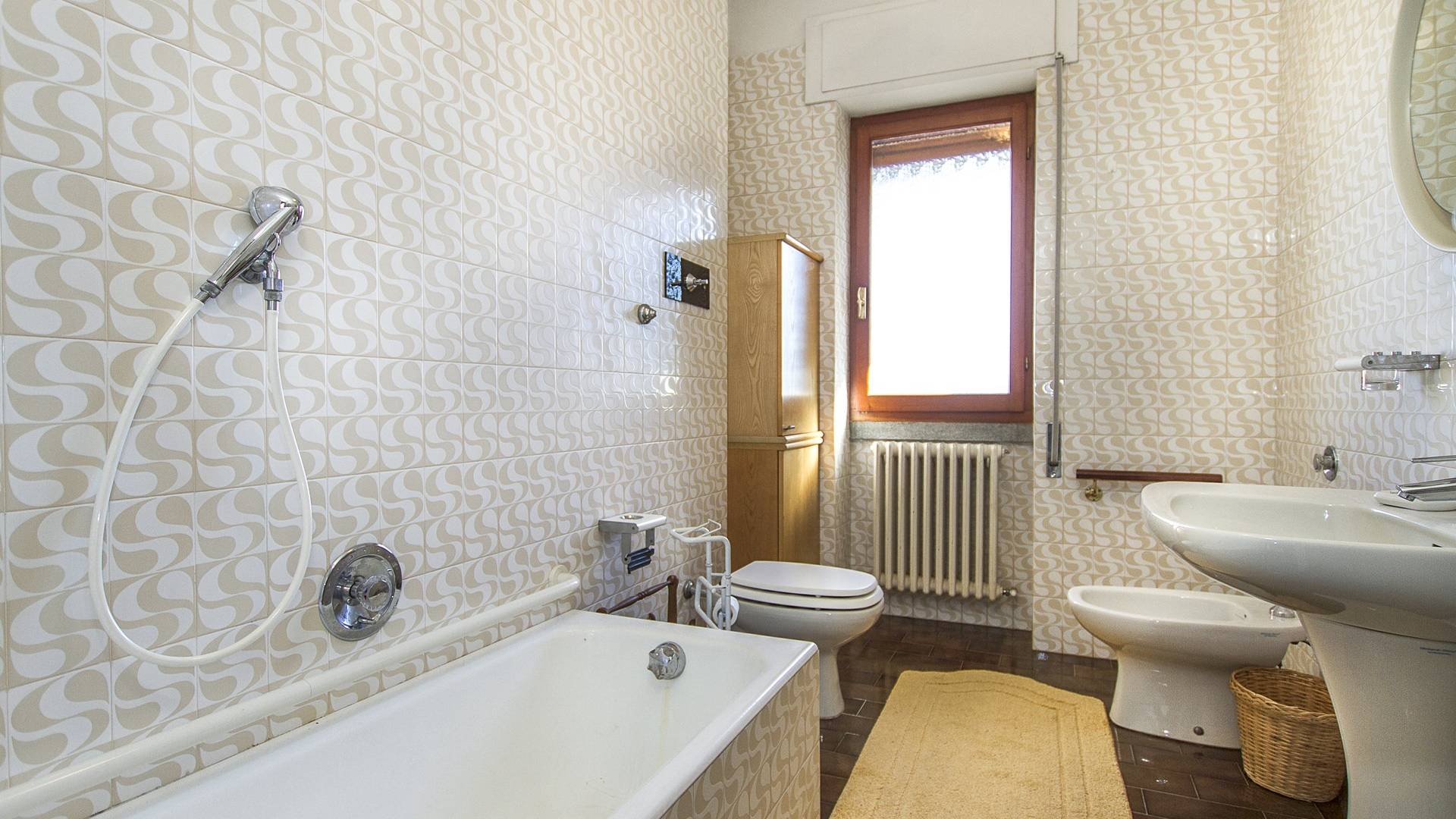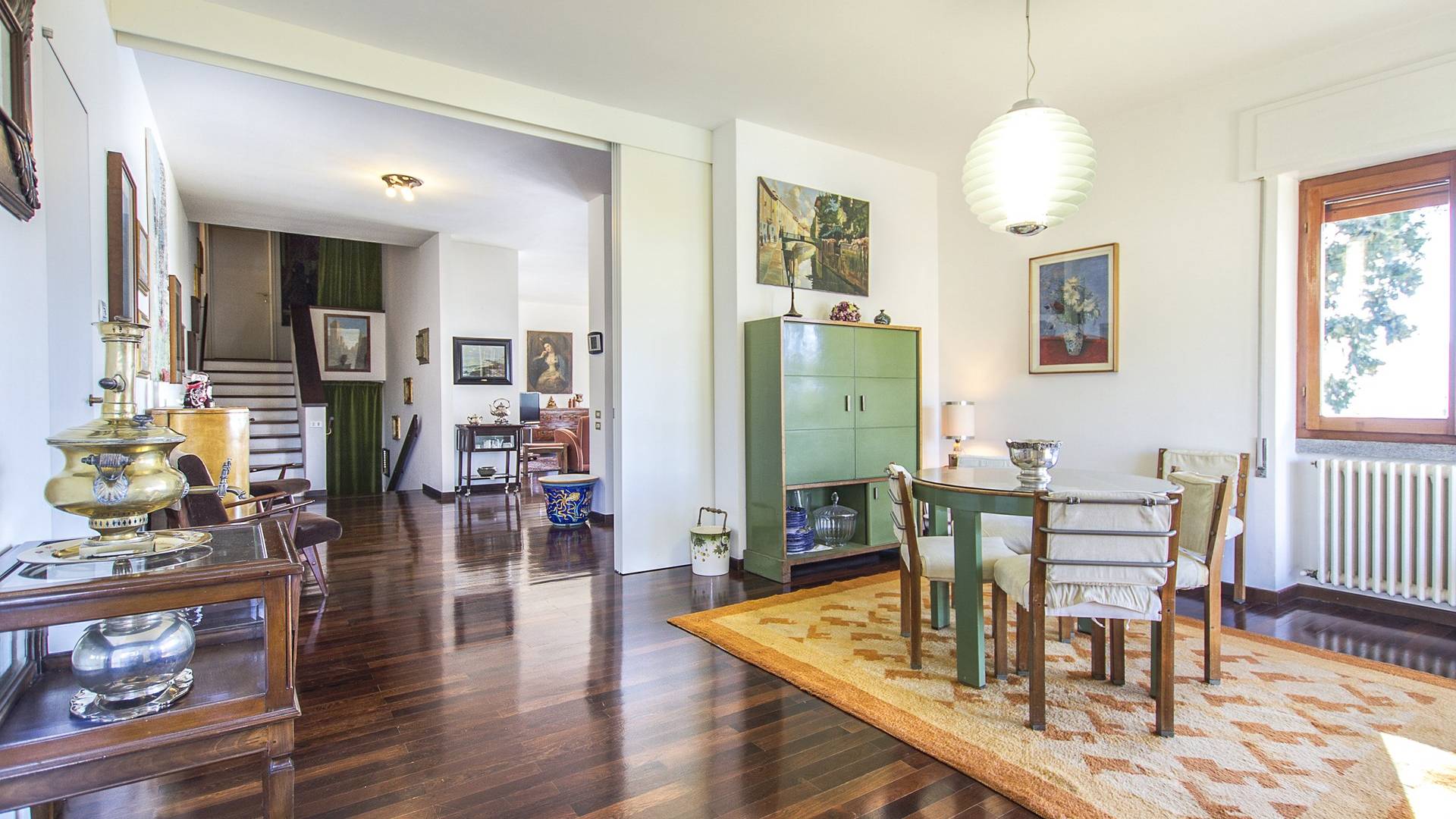 Subiendo 9 escalones se llega a la zona de noche con tres habitaciones dobles y dos baños (uno con bañera y otro con bañera de hidromasaje y mampara de ducha). Se puede añadir una cama supletoria plegable a uno de los dormitorios. Todos los dormitorios tienen acceso a un balcón compartido con vistas al jardín y al lago. La sala de estar se abre a una terraza cubierta que tiene un toldo retráctil y es perfecta para cenar al aire libre, tomar unos cócteles o simplemente charlar y relajarse mientras disfruta de las vistas del lago Maggiore. La villa se encuentra en un gran parque privado (8000 m²) con un césped muy bien cuidado, árboles frondosos, plantas con flores y arbustos.