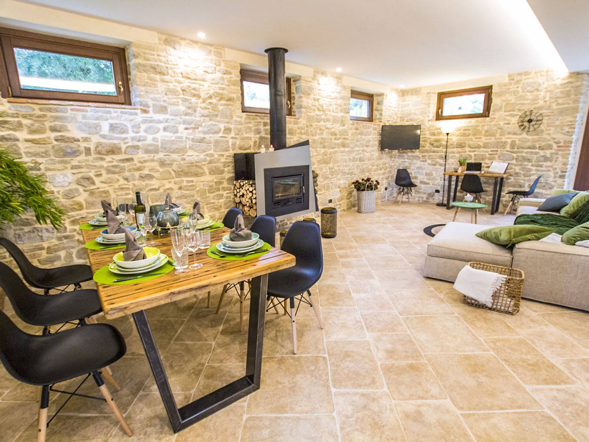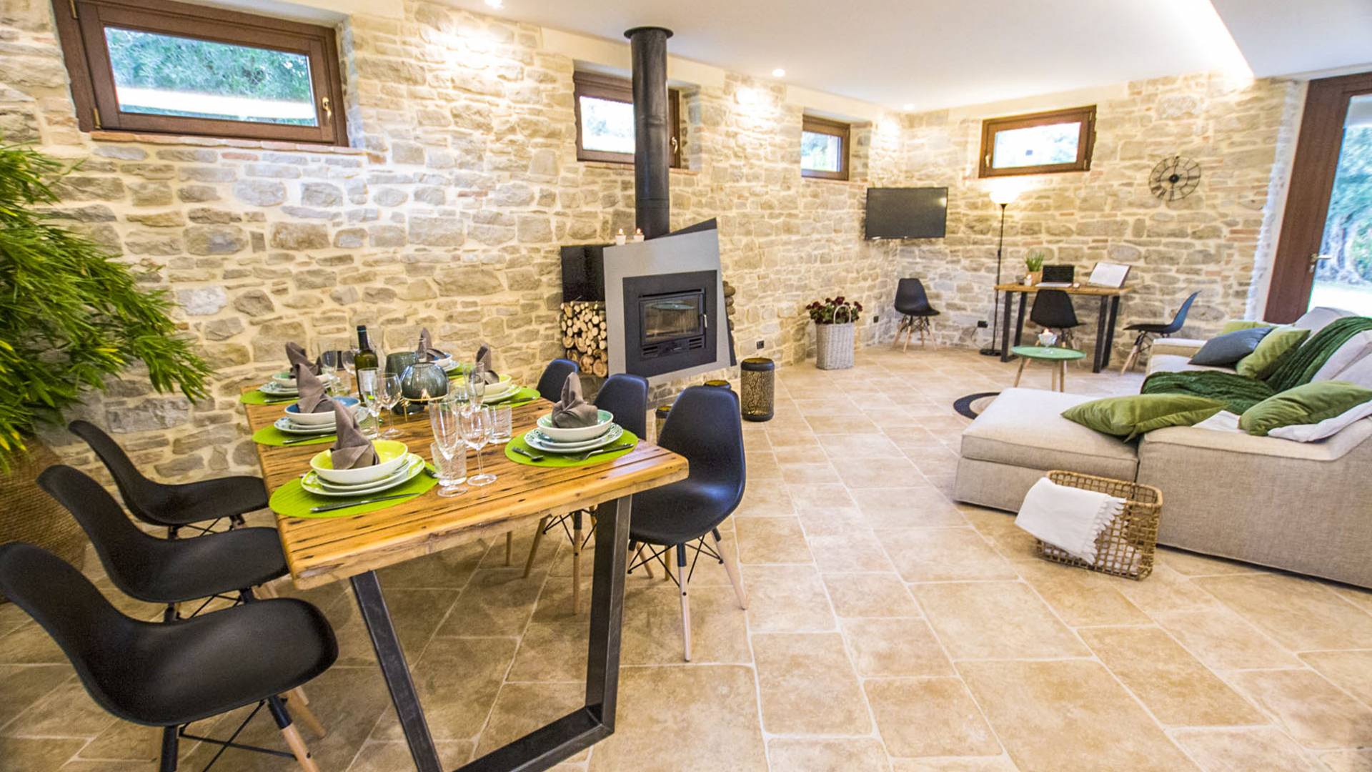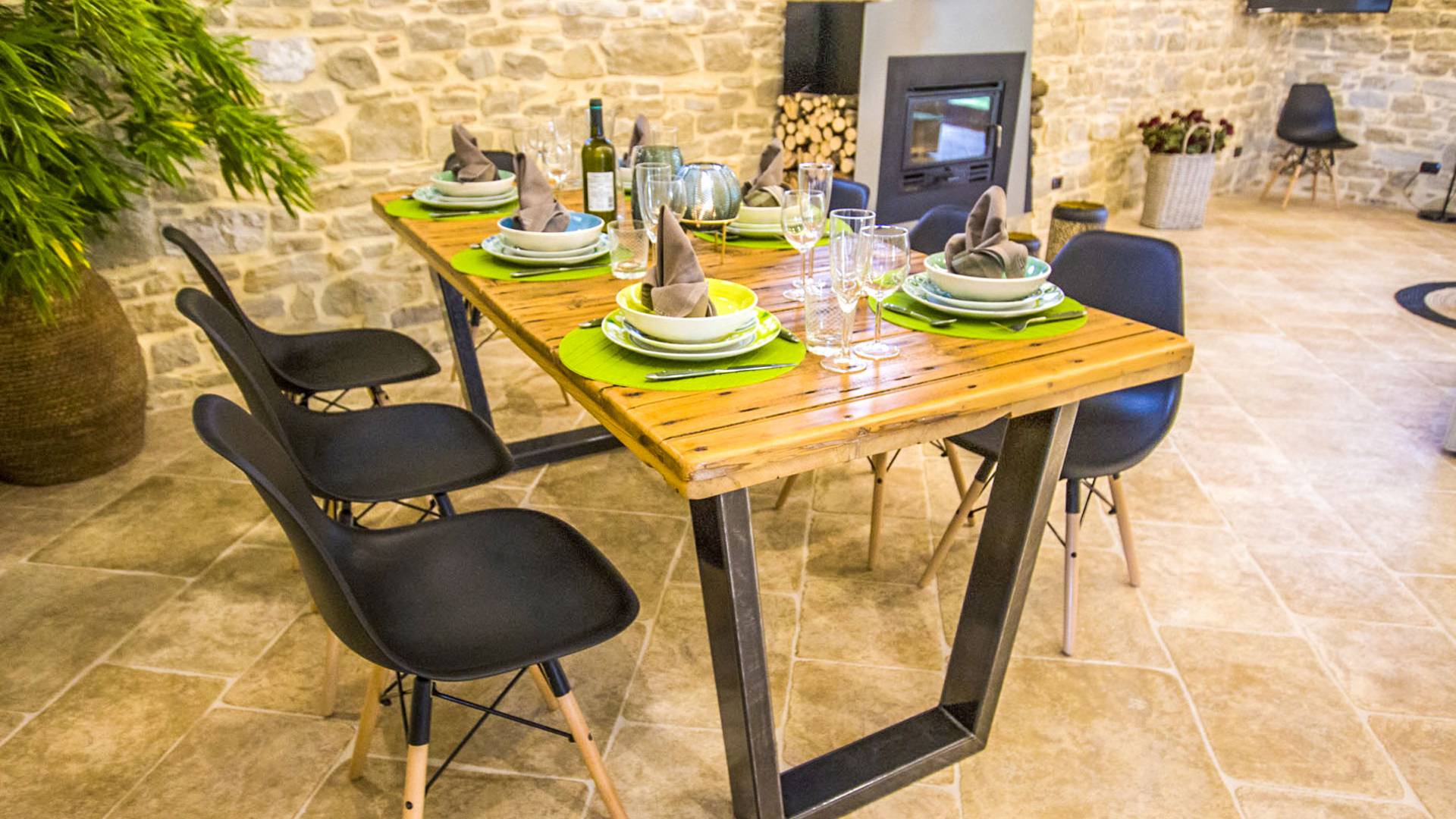 La entrada de este chalet con piscina se abre, en la planta baja, sobre la zona de estar, en donde una armoniosa mezcla de mobiliario contemporáneo y recuperación de la tradición encontramos un gran salón con chimenea y un comedor junto a un totalmente equipado cocina donde poder disfrutar de sus vacaciones con total autonomía y sin limitaciones de tiempo.