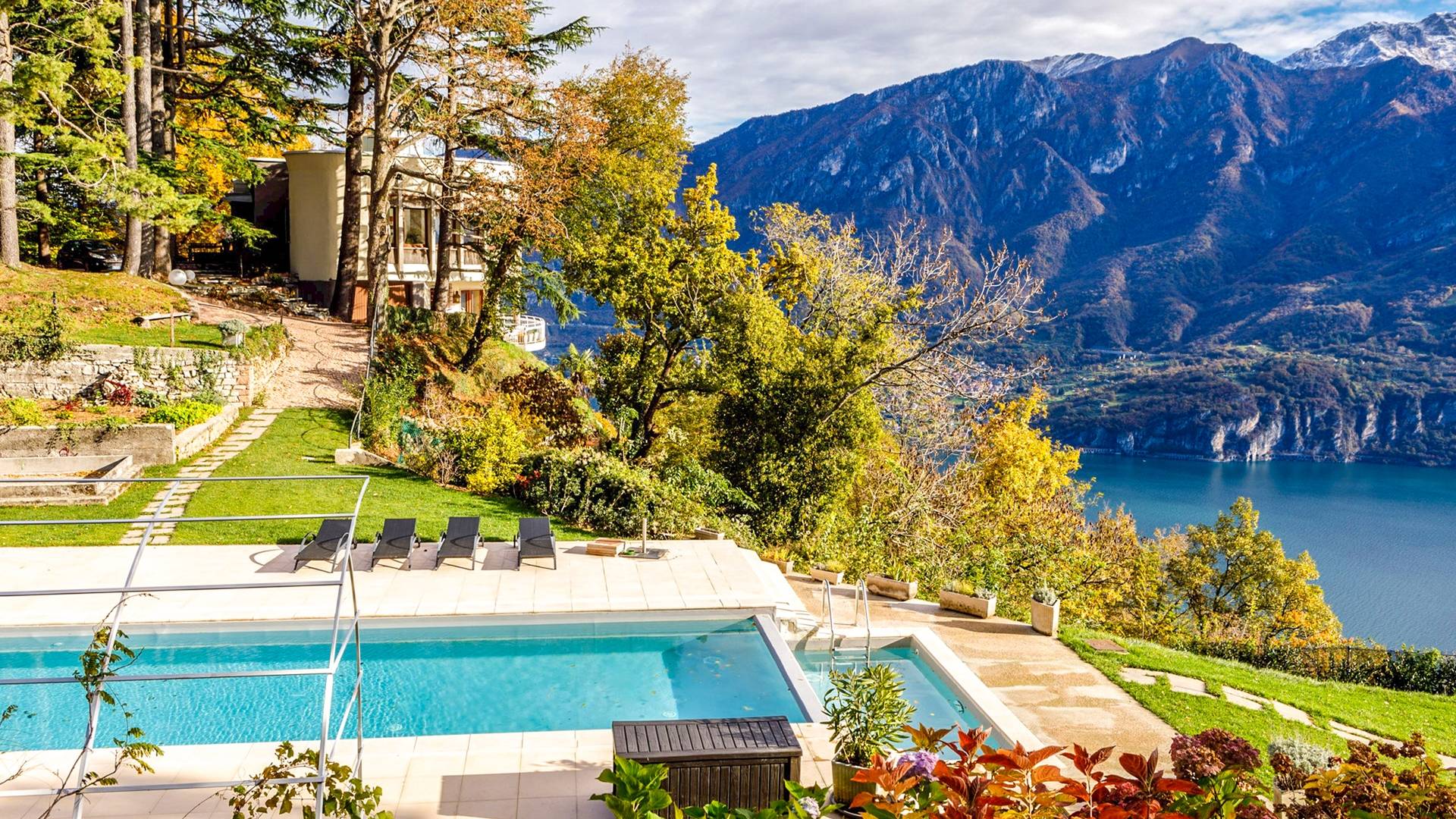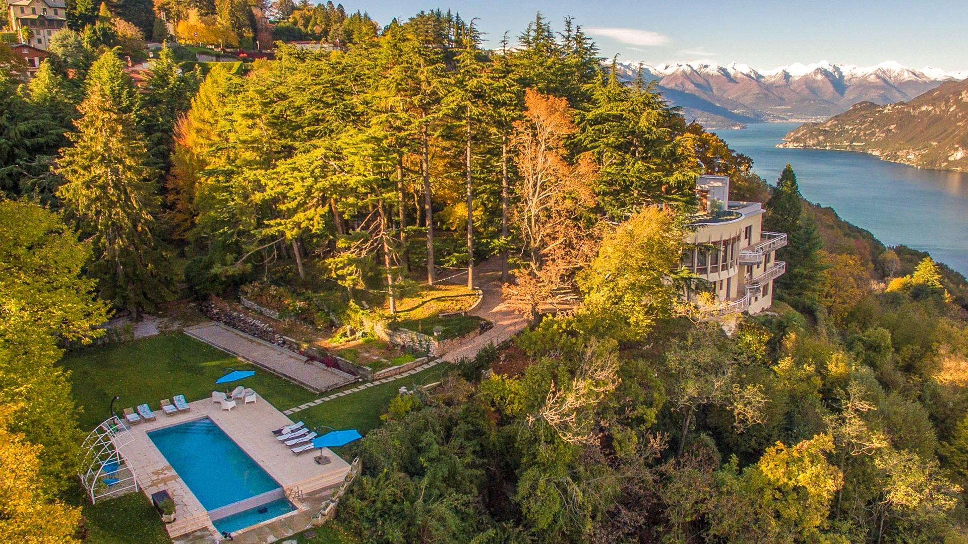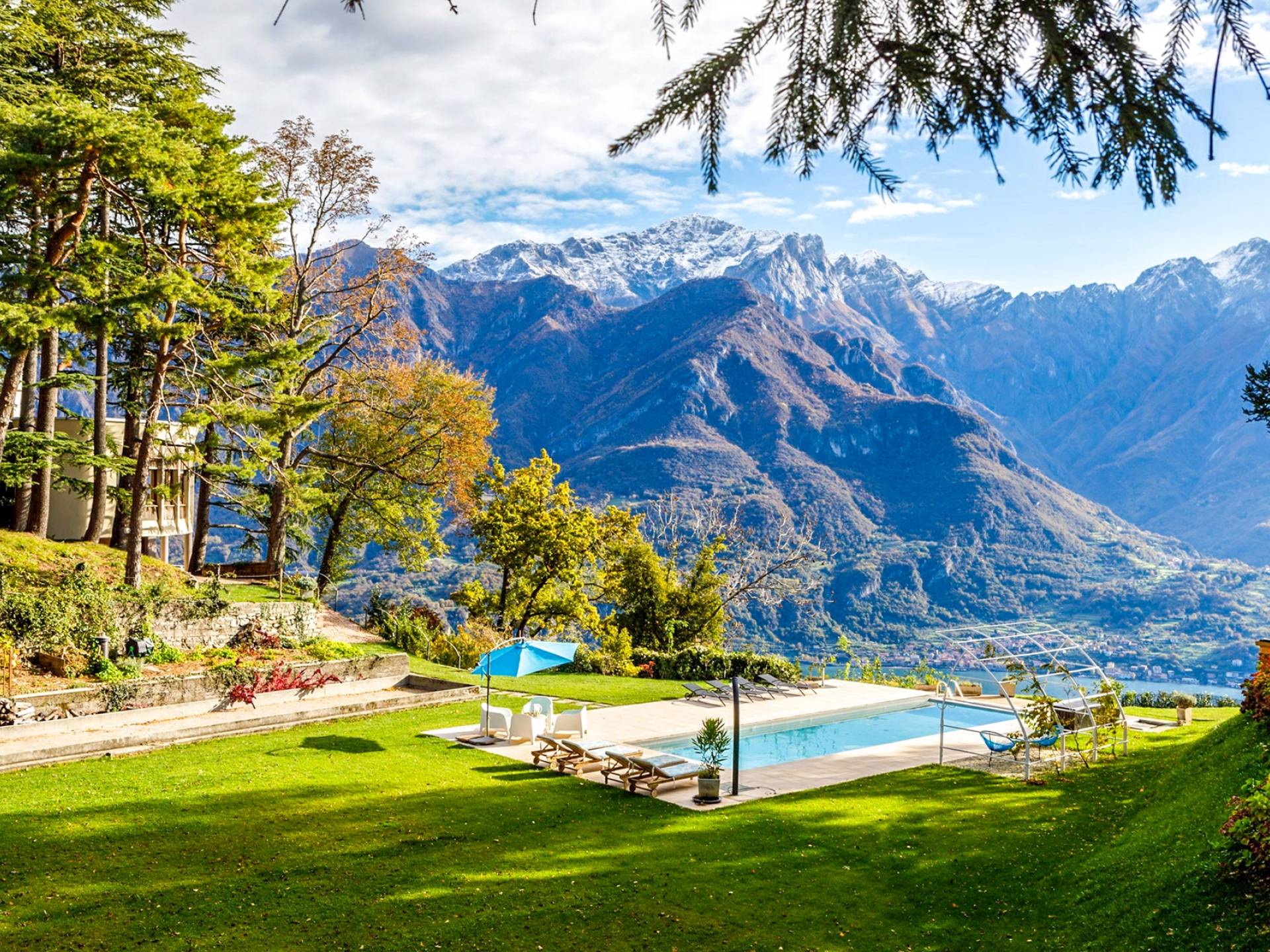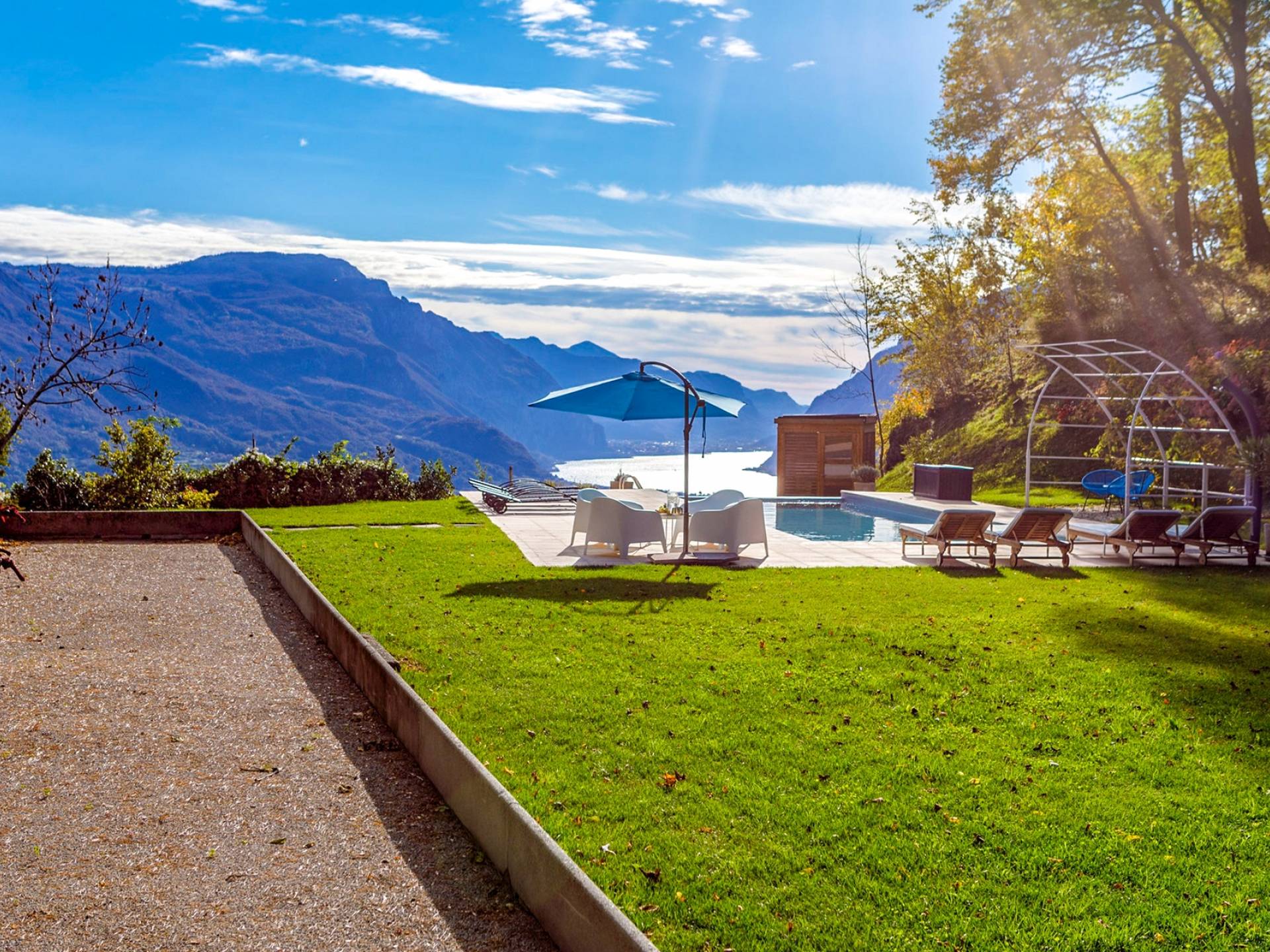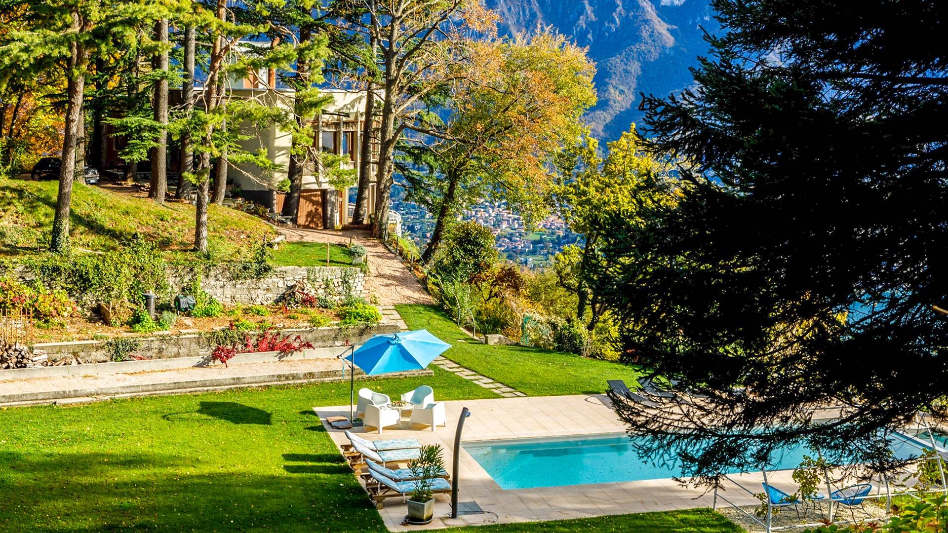 La Villa Barbara se extiende a lo largo de tres acres de hermosos bosques y jardines, e impresionantes vistas de 180 grados del lago de Como y las montañas circundantes. Con una piscina infinita, una piscina para niños, un jacuzzi, una sauna, una cancha de bochas, varias zonas de estar al aire libre y áreas para comer, hay un amplio espacio para trabajar, jugar, descansar, recargar energías y reiniciar.
