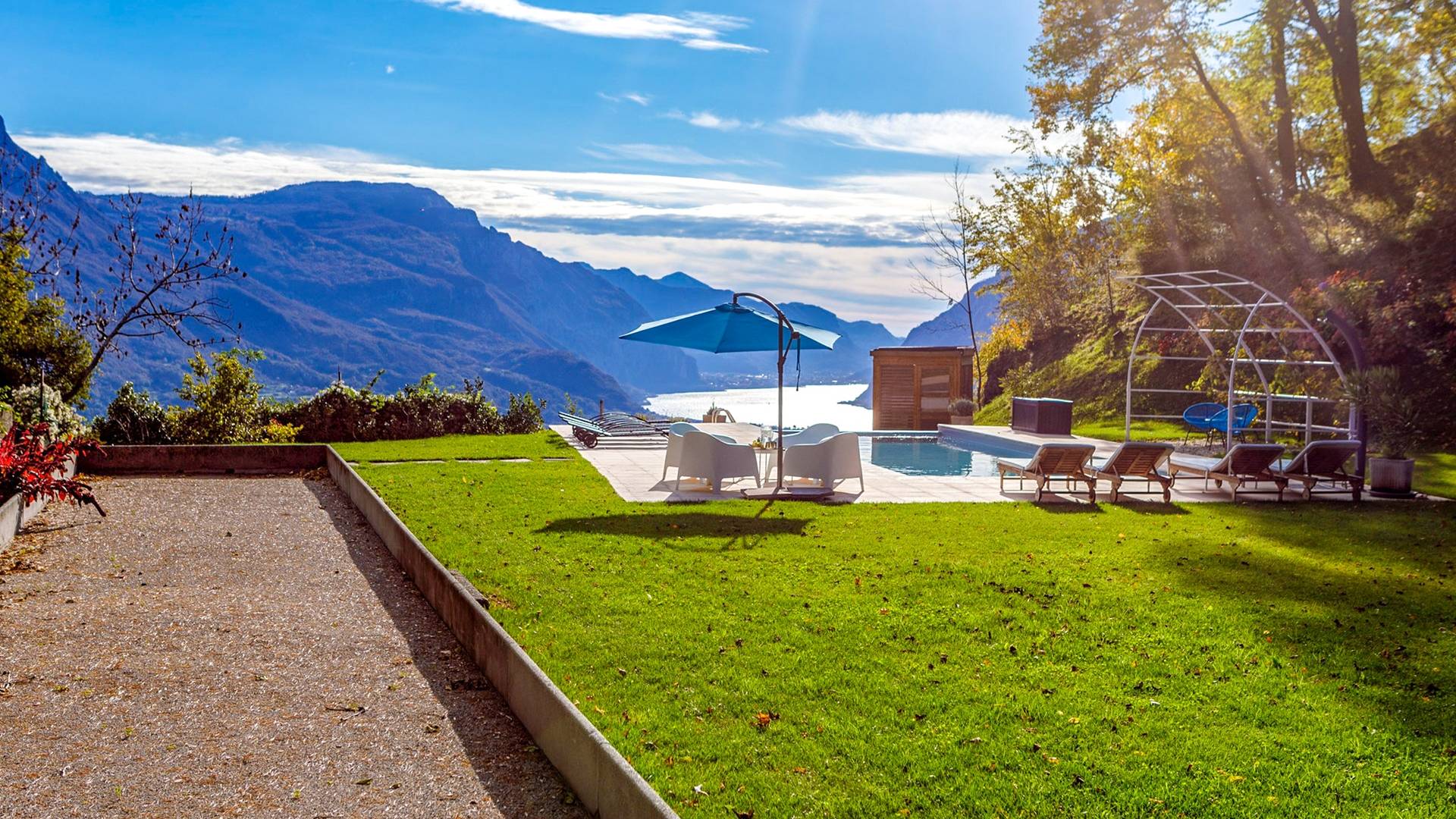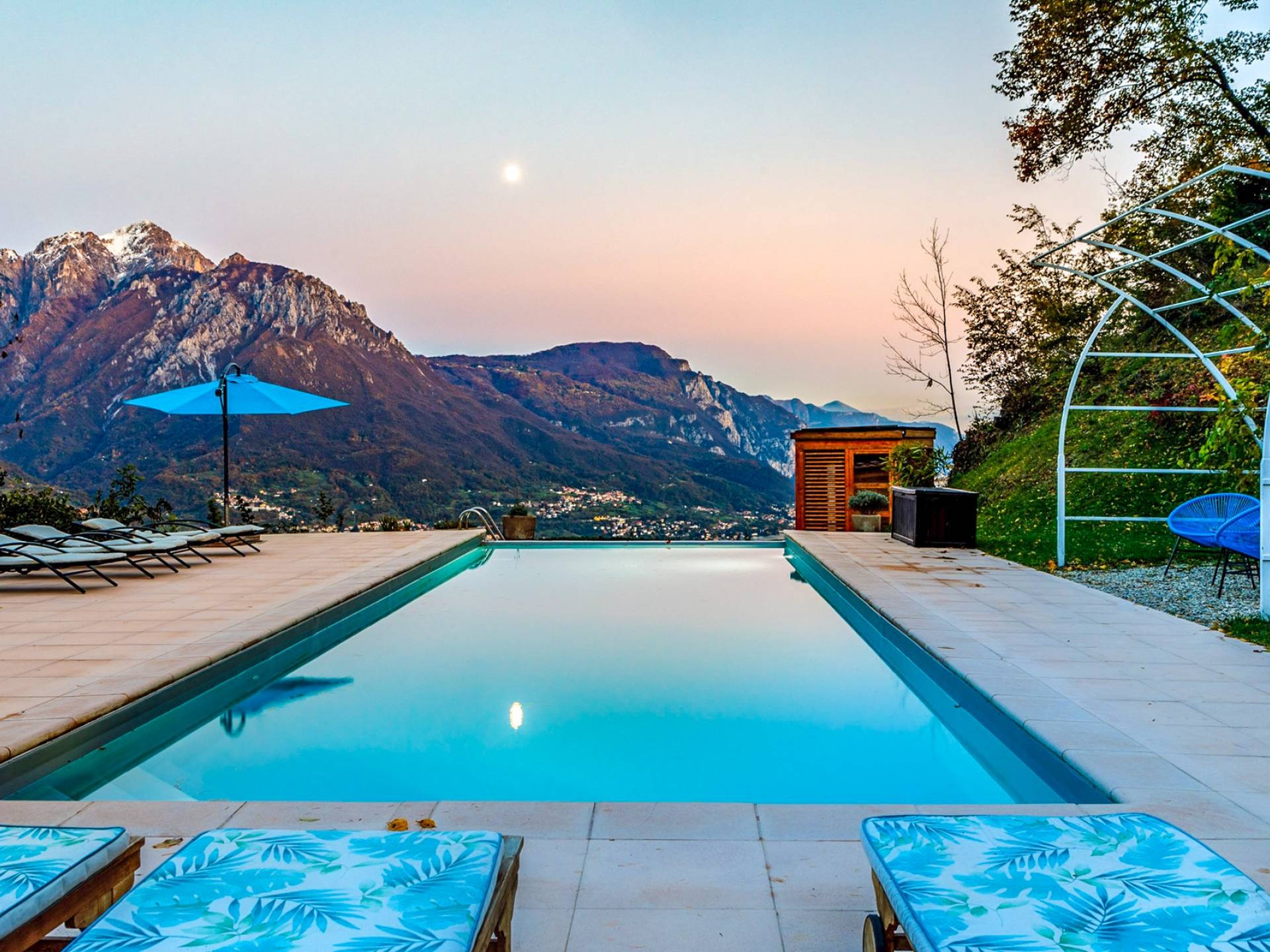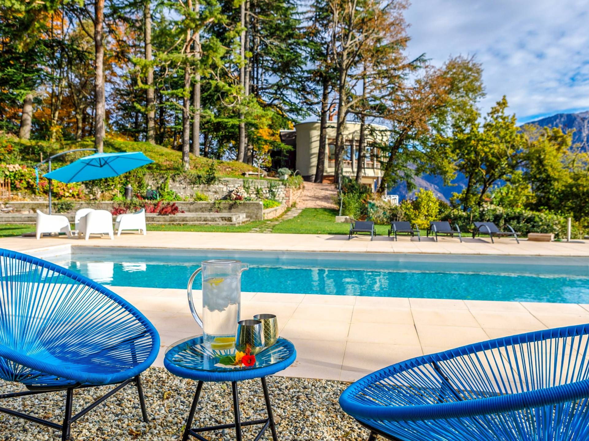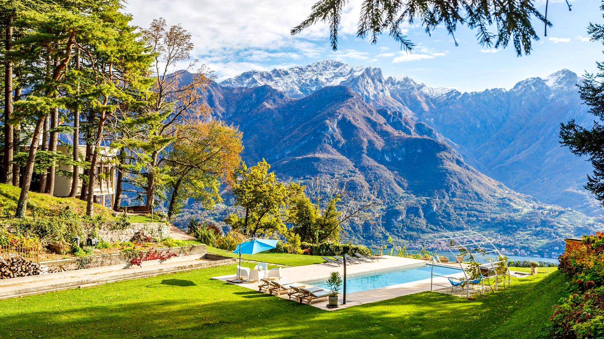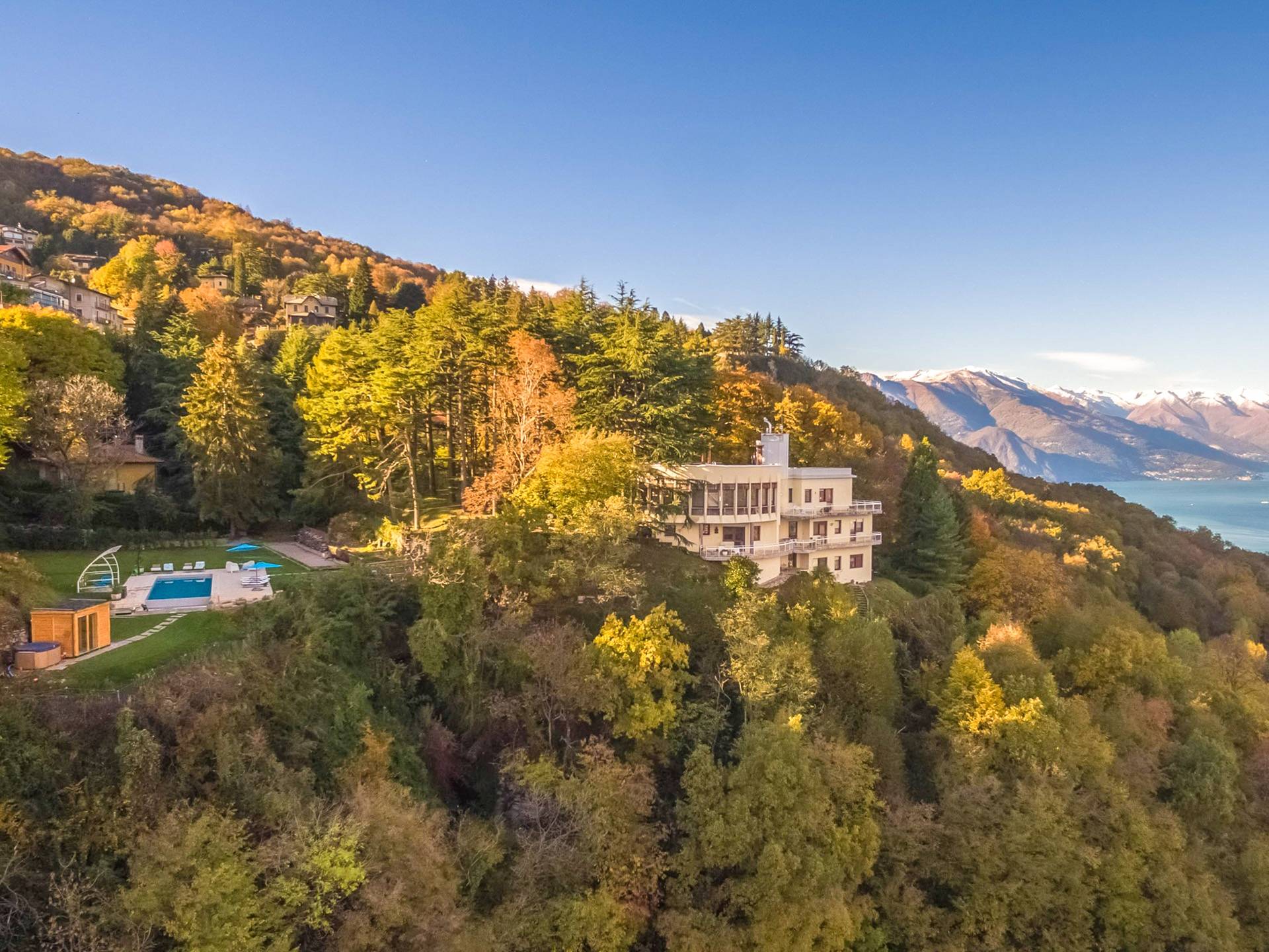 La Villa Barbara se extiende a lo largo de tres acres de hermosos bosques y jardines, e impresionantes vistas de 180 grados del lago de Como y las montañas circundantes. Con una piscina infinita, una piscina para niños, un jacuzzi, una sauna, una cancha de bochas, varias zonas de estar al aire libre y áreas para comer, hay un amplio espacio para trabajar, jugar, descansar, recargar energías y reiniciar.