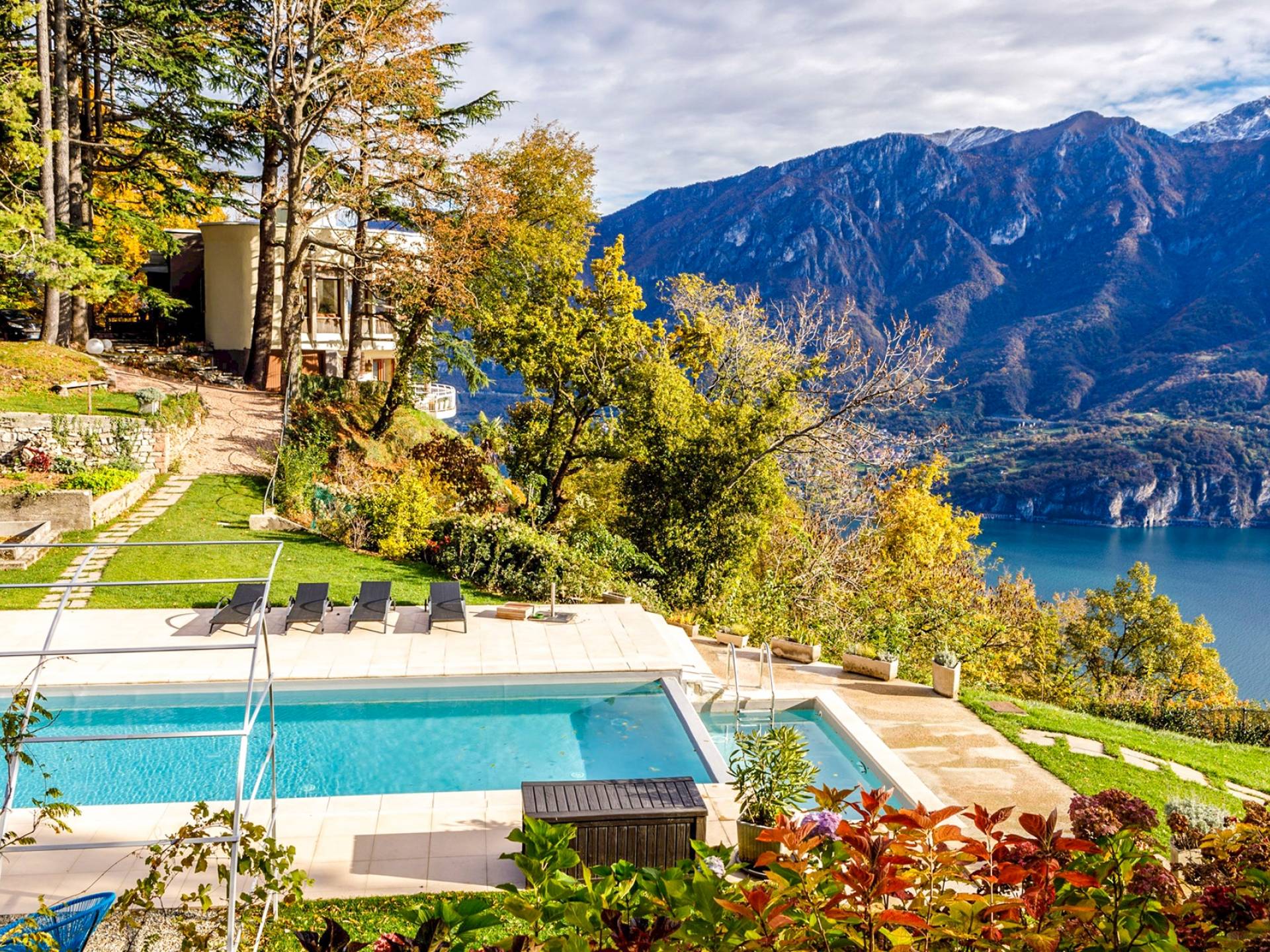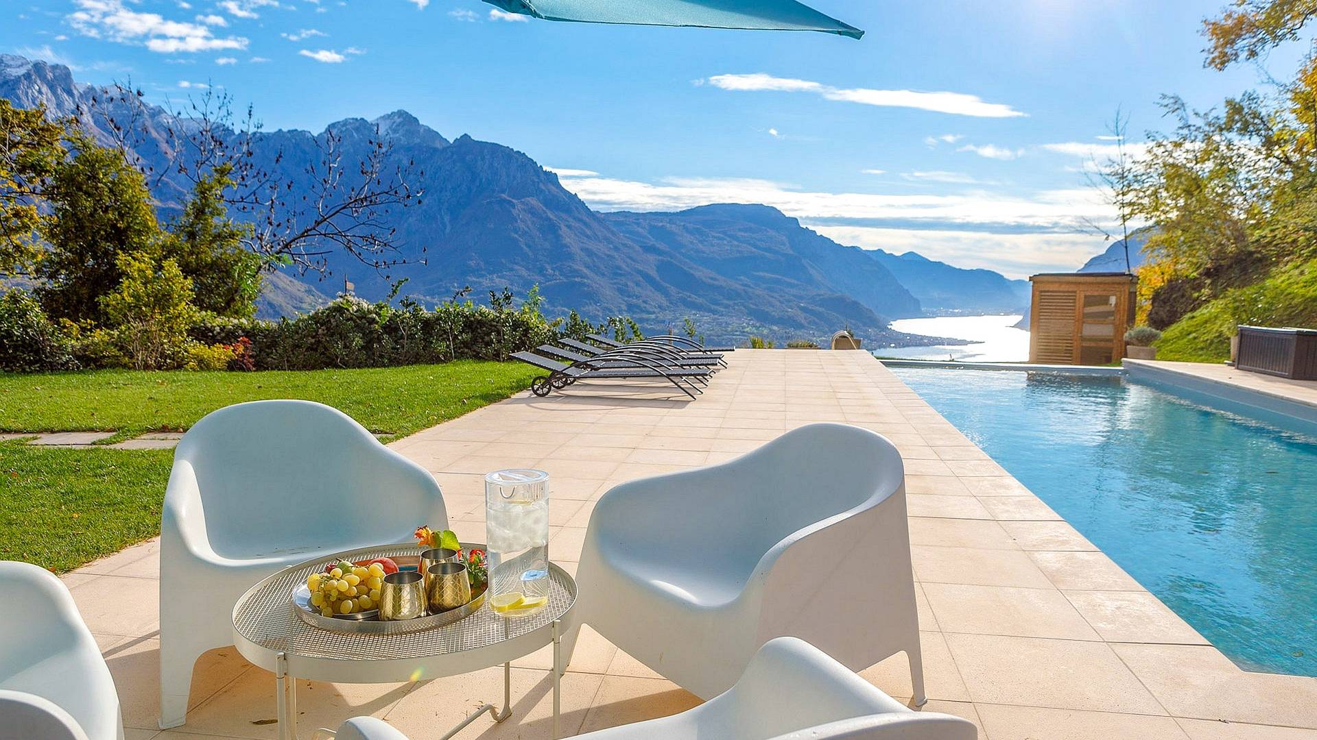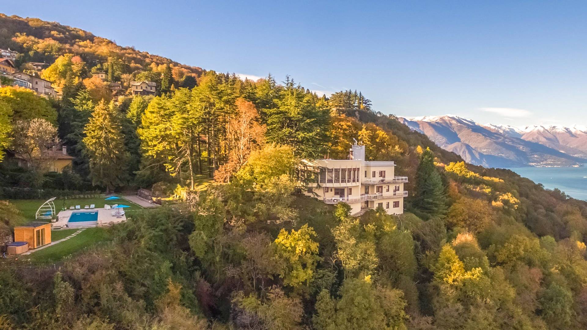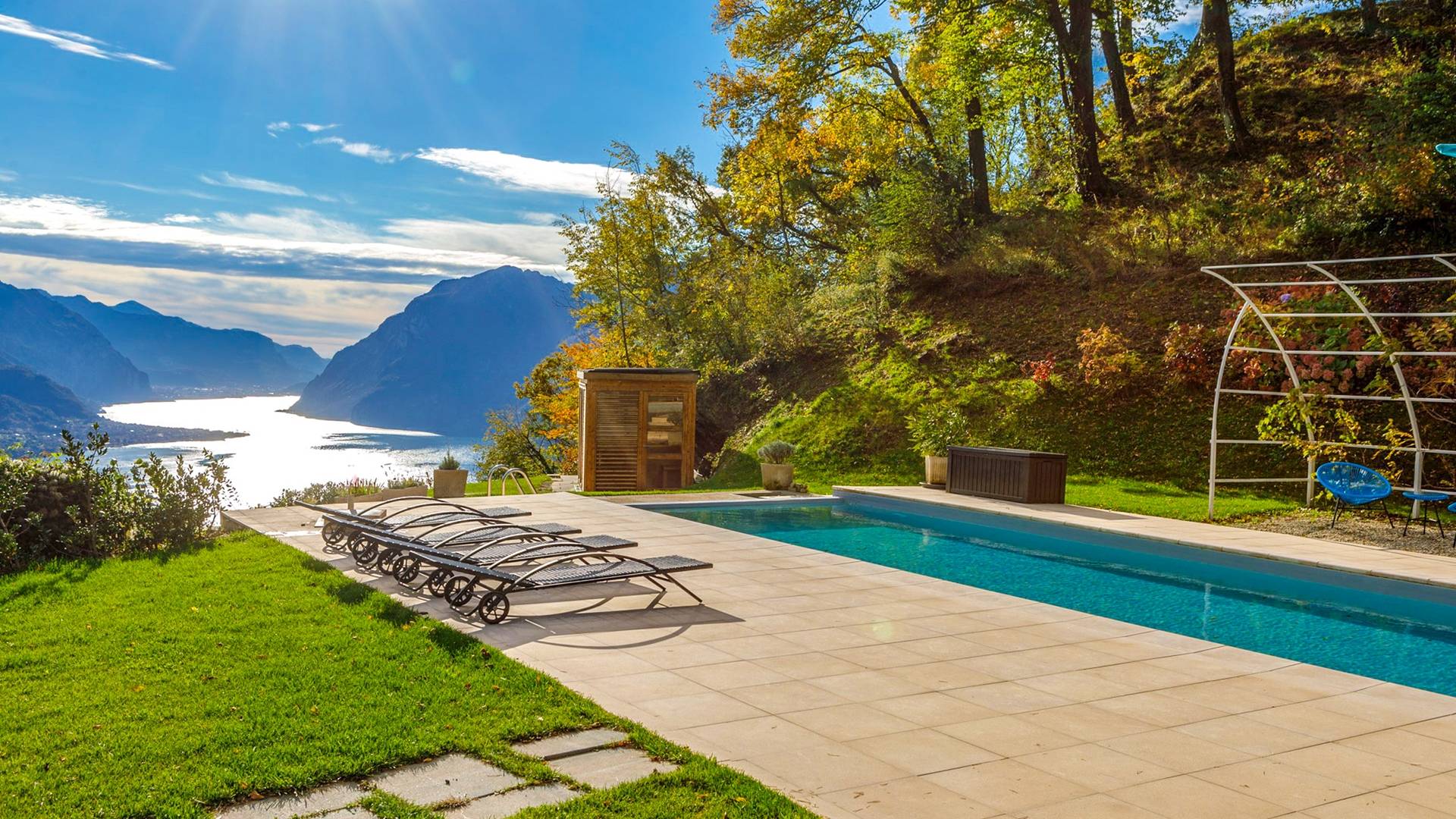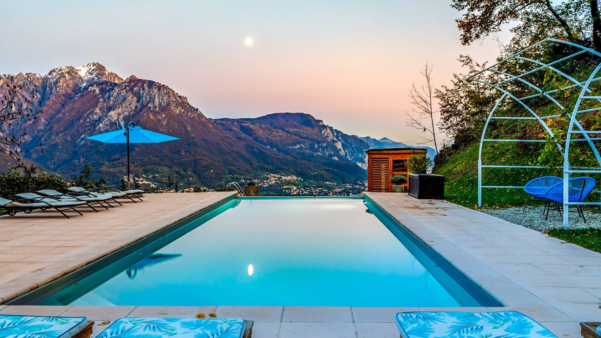 La Villa Barbara se extiende a lo largo de tres acres de hermosos bosques y jardines, e impresionantes vistas de 180 grados del lago de Como y las montañas circundantes. Con una piscina infinita, una piscina para niños, un jacuzzi, una sauna, una cancha de bochas, varias zonas de estar al aire libre y áreas para comer, hay un amplio espacio para trabajar, jugar, descansar, recargar energías y reiniciar.
