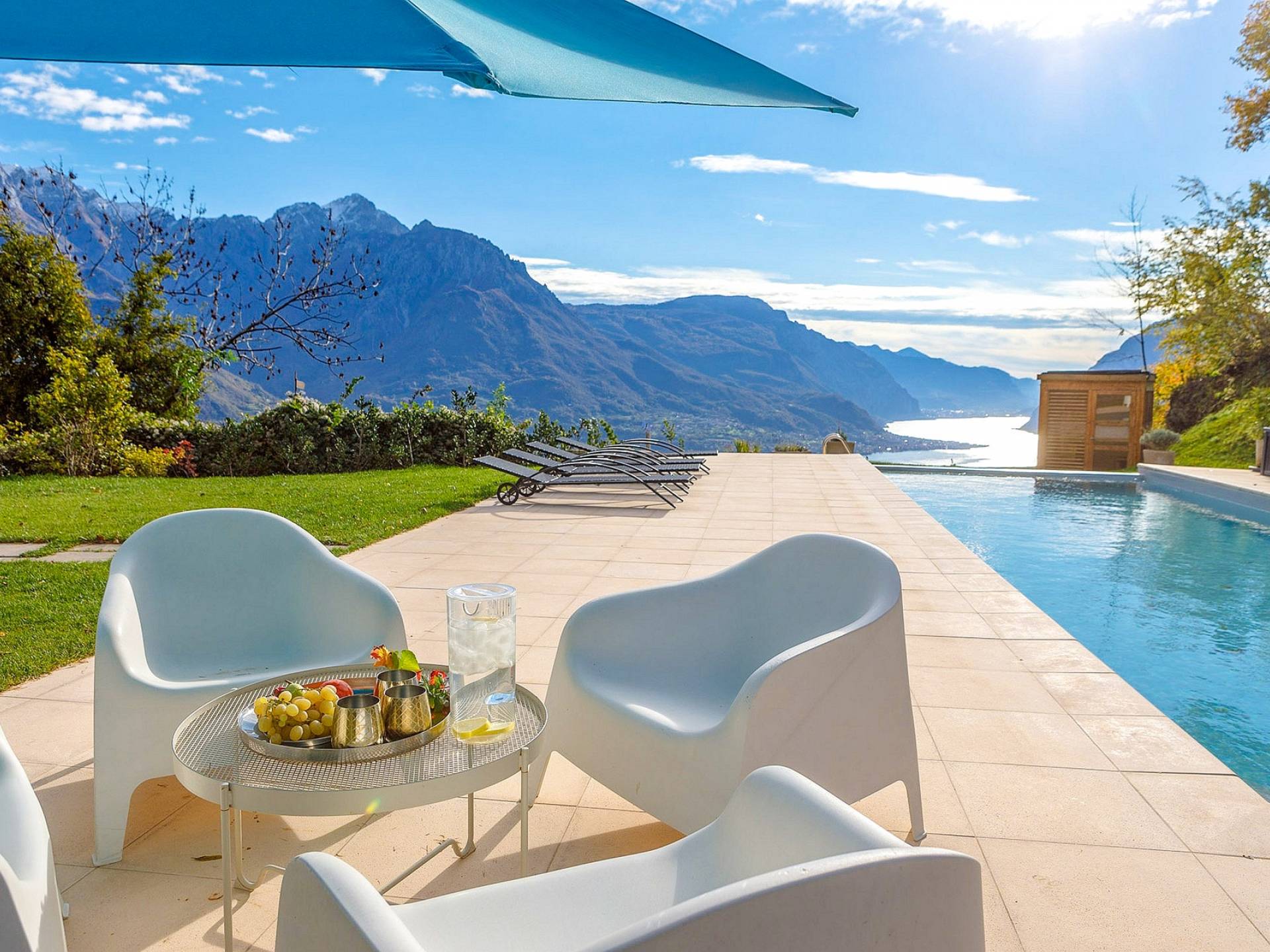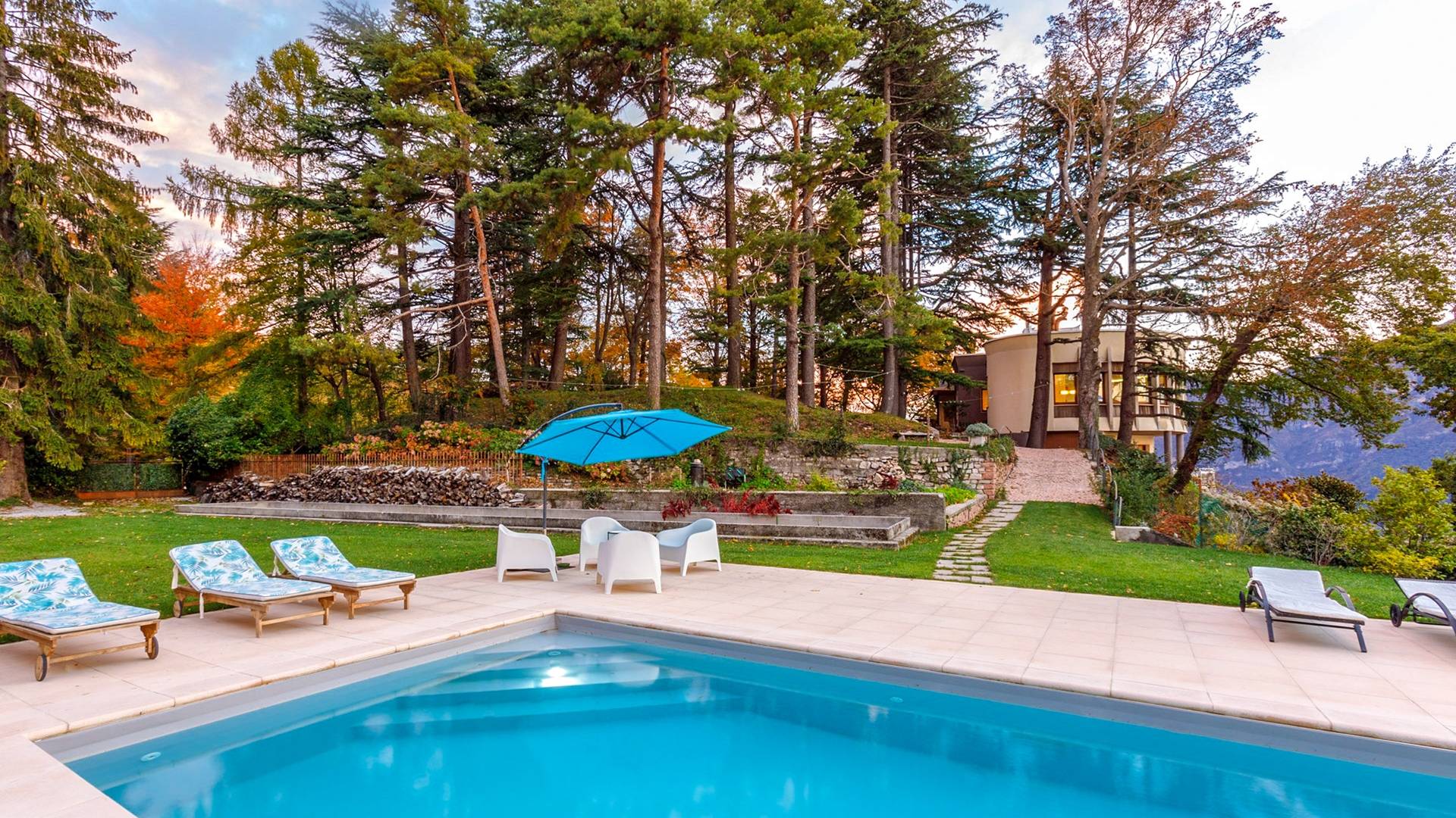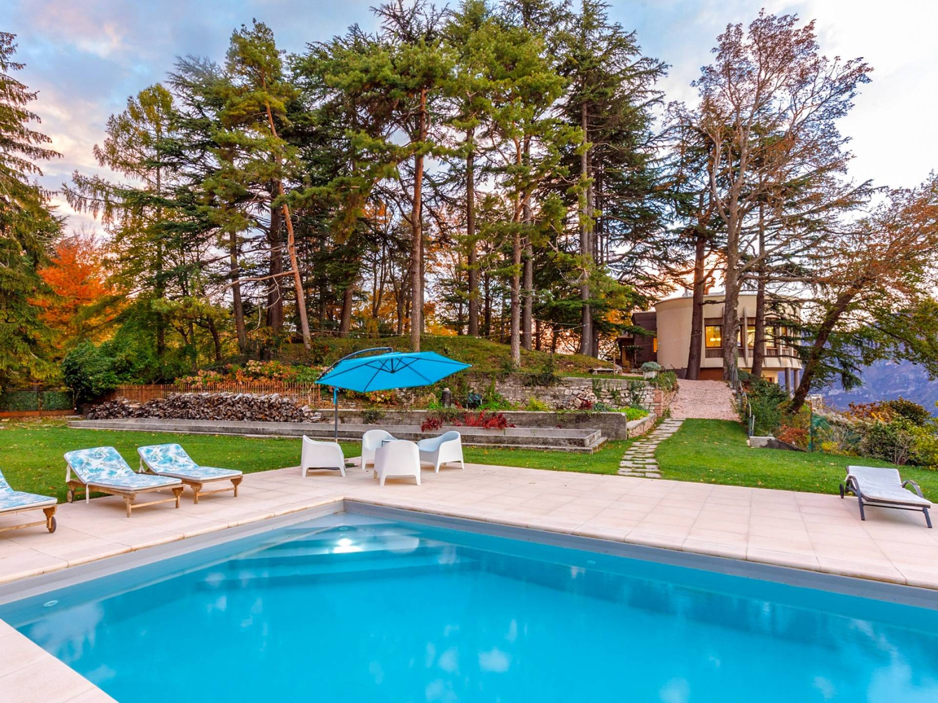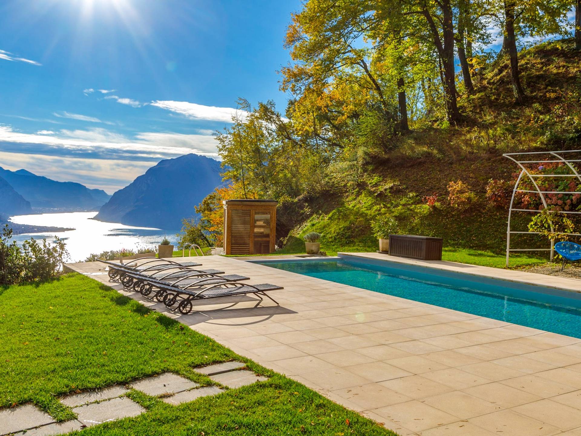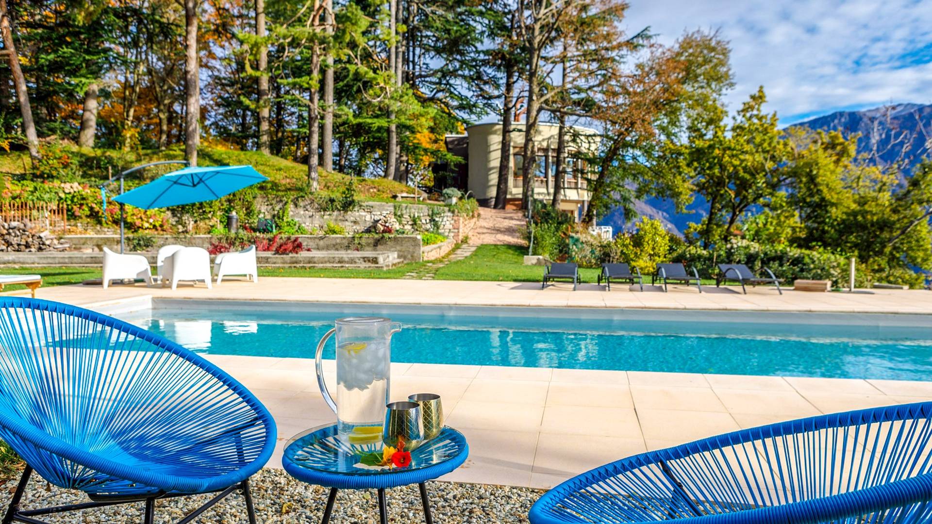 La Villa Barbara se extiende a lo largo de tres acres de hermosos bosques y jardines, e impresionantes vistas de 180 grados del lago de Como y las montañas circundantes. Con una piscina infinita, una piscina para niños, un jacuzzi, una sauna, una cancha de bochas, varias zonas de estar al aire libre y áreas para comer, hay un amplio espacio para trabajar, jugar, descansar, recargar energías y reiniciar.