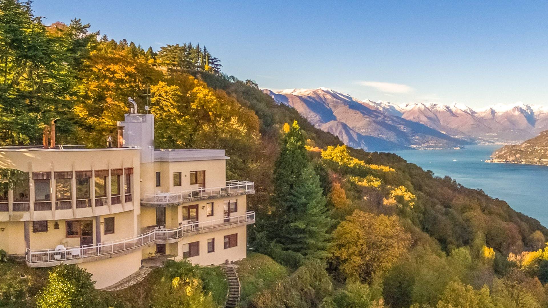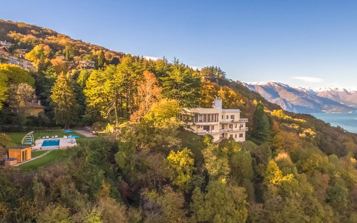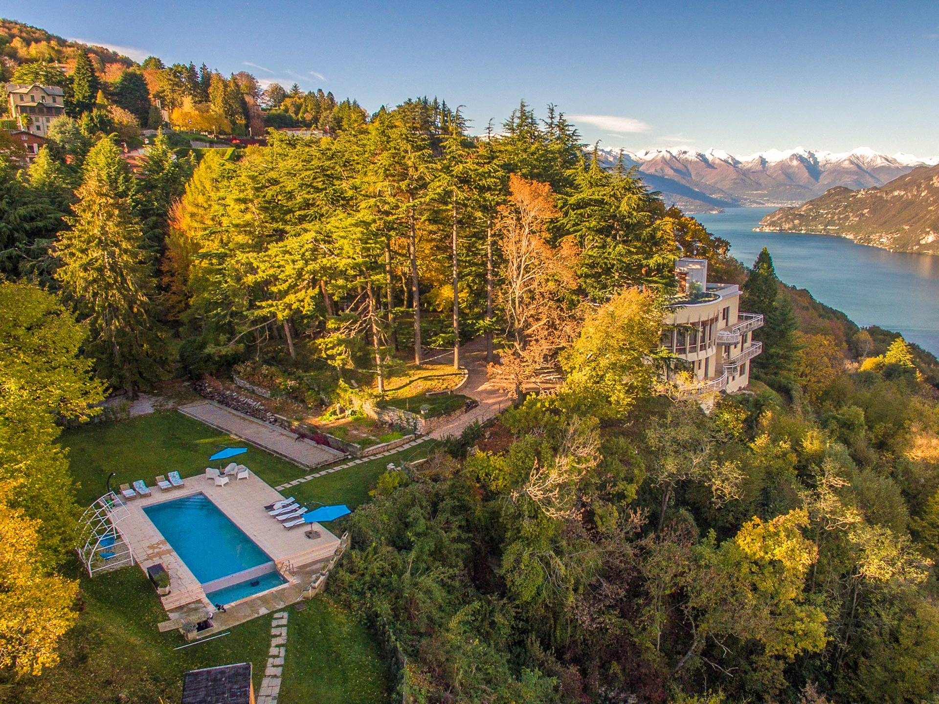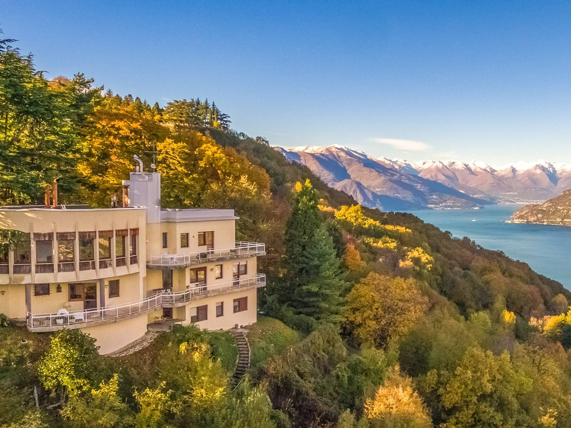 Villa escénica y llamativa con piscina e impresionantes vistas al lago, ubicada en un bosque privado en Civenna en el lago de Como. Villa Barbara es una elegante villa de mediados de siglo, privada y profundamente tranquila, pero muy cerca de Bellagio, el punto turístico del lago de Como. Esta villa (400 m²) presenta una fachada curva única y moderna, inspirada en un famoso arquitecto italiano, y está construida sobre una colina con entrada desde el último piso, con capacidad para 12 personas en 6 habitaciones